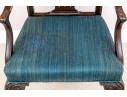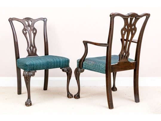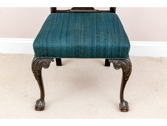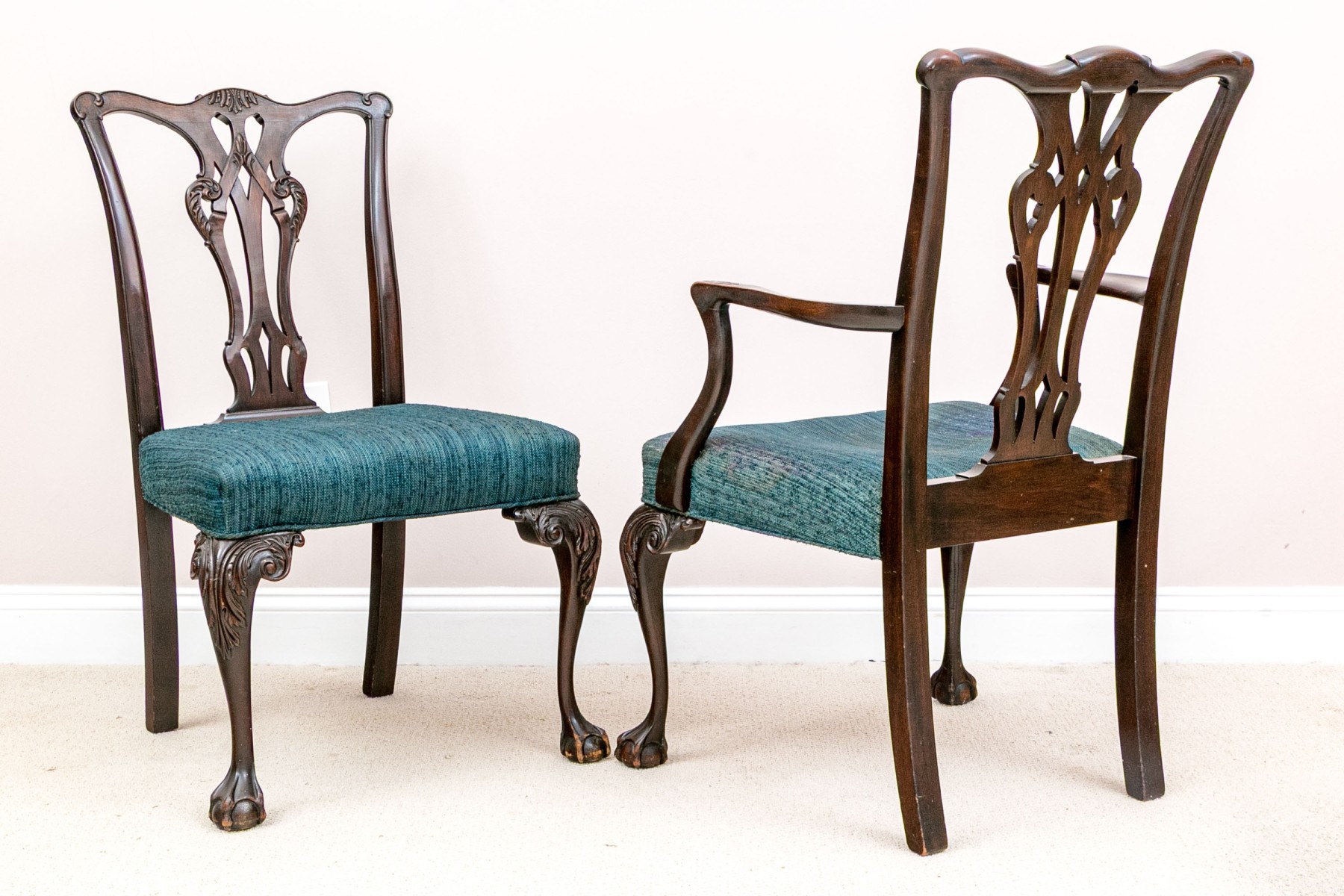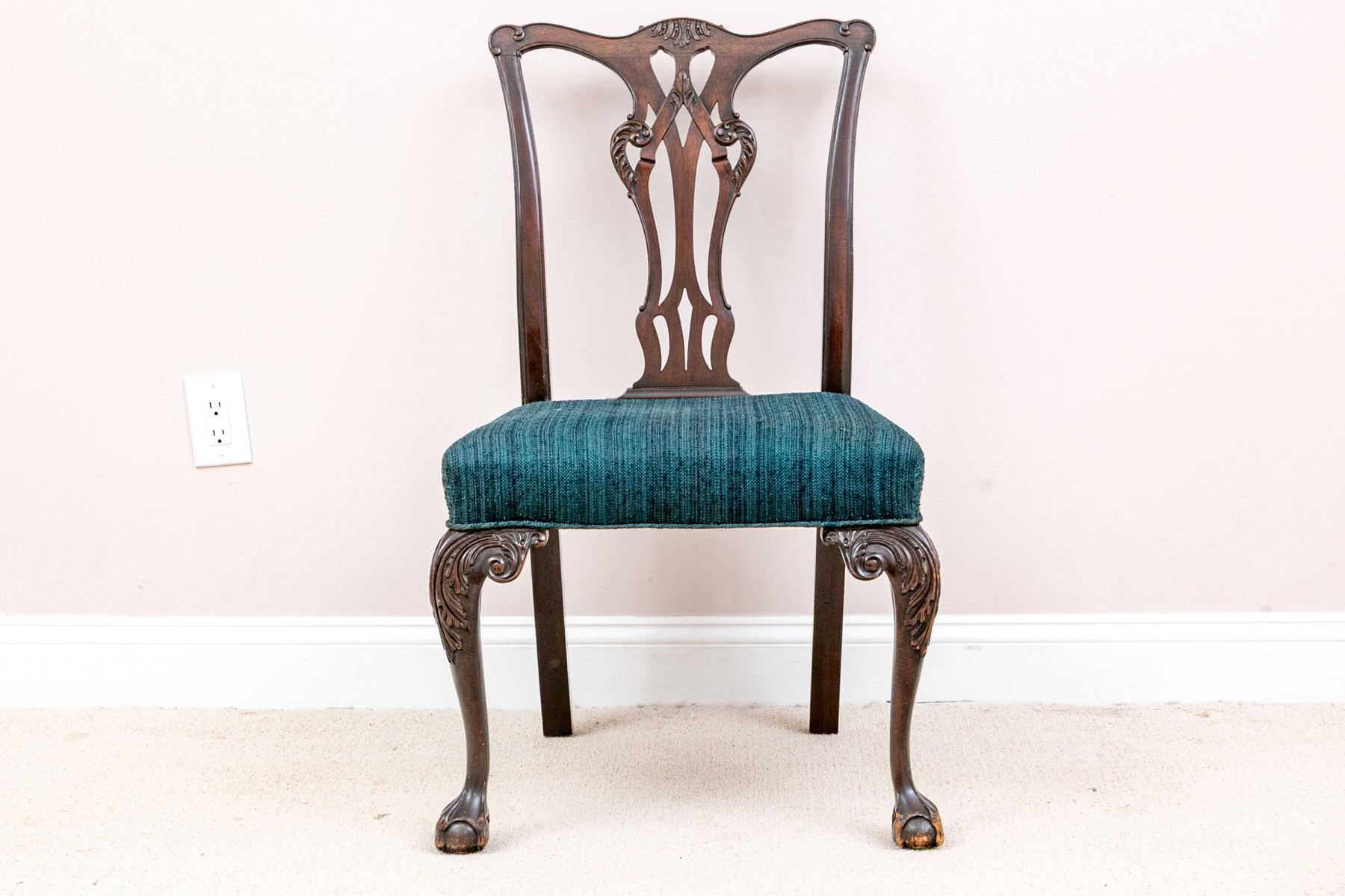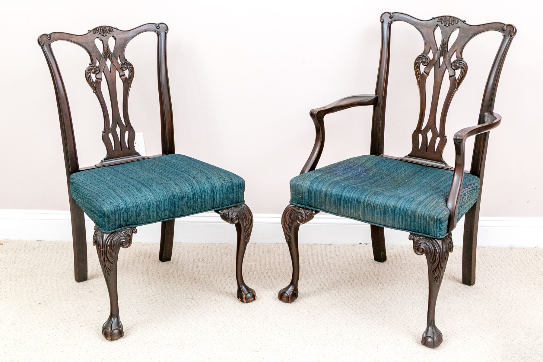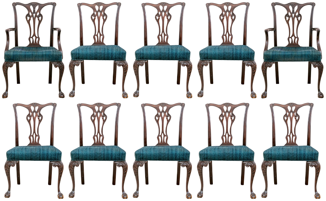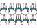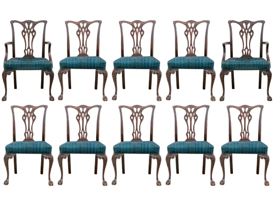 A set of ten Chippendale style dining chairs including eight side chairs and two armchairs. Beautifully crafted with warm-toned, dark brown frames sporting serpentine top rails and shapely openwork fiddle splats. Seats are upholstered in heathered teal blue fabric and raised over heavily carved cabriole front legs over ball and claw feet.