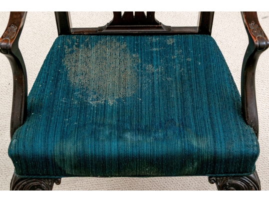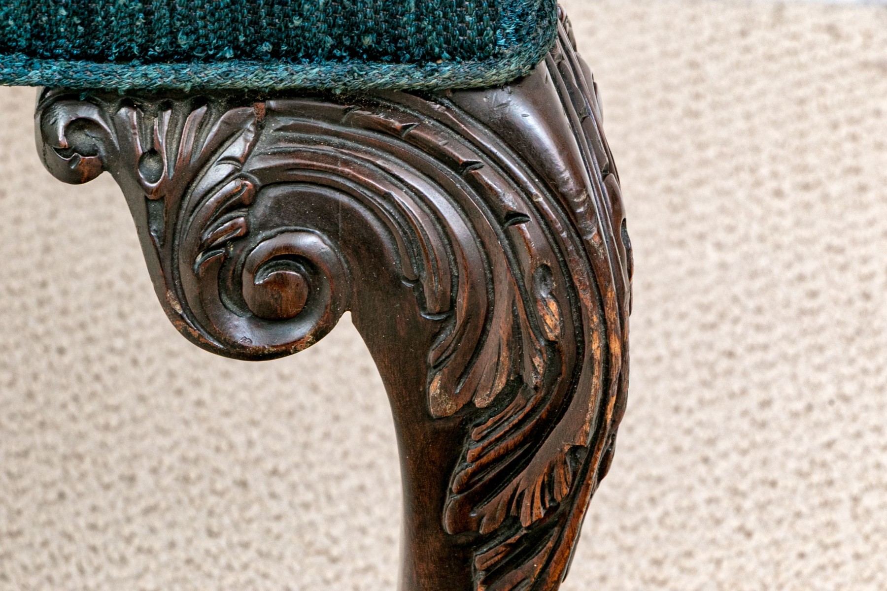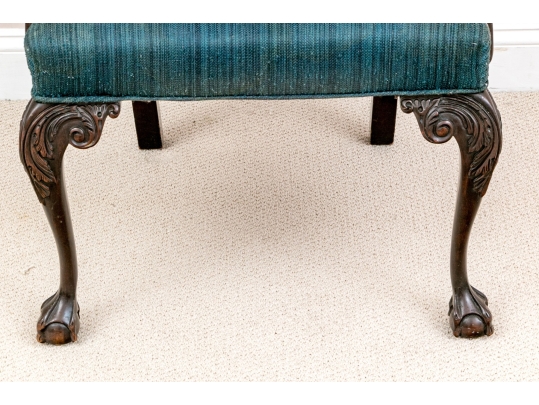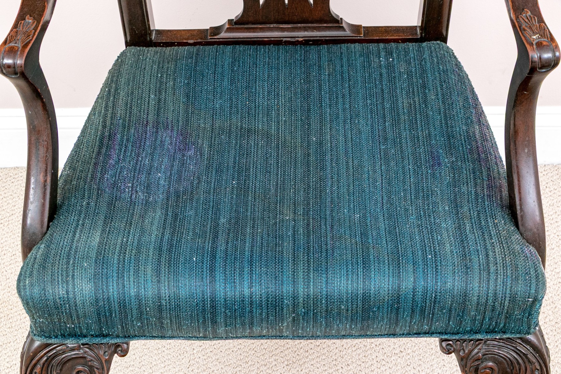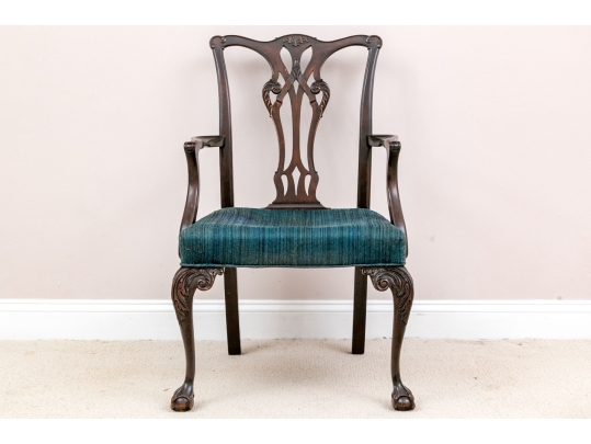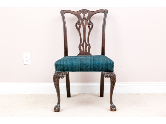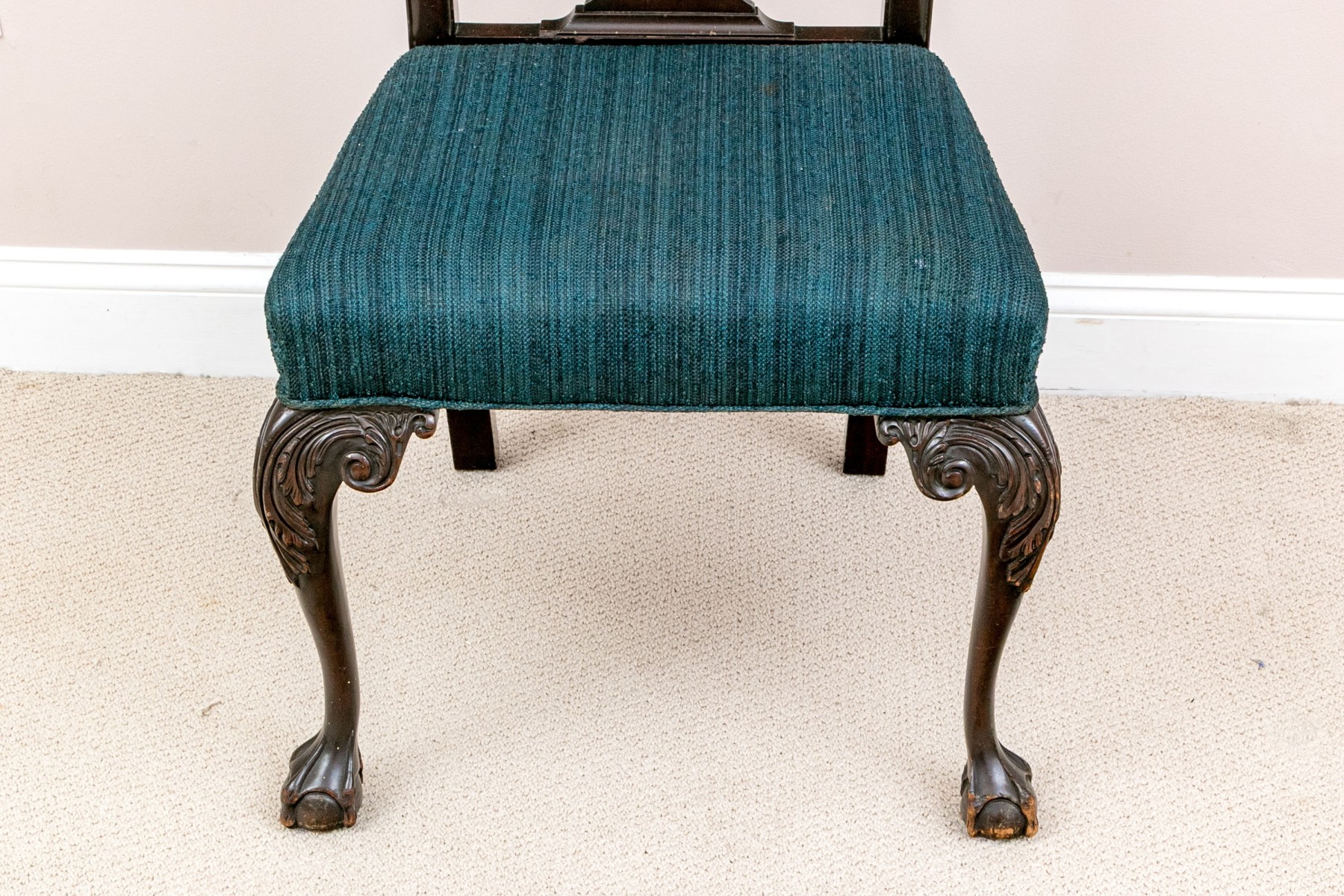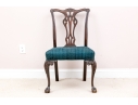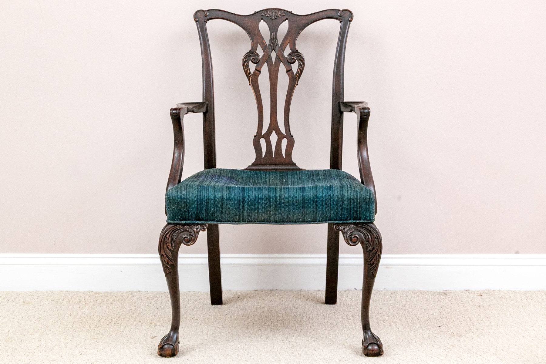 A set of ten Chippendale style dining chairs including eight side chairs and two armchairs. Beautifully crafted with warm-toned, dark brown frames sporting serpentine top rails and shapely openwork fiddle splats. Seats are upholstered in heathered teal blue fabric and raised over heavily carved cabriole front legs over ball and claw feet.