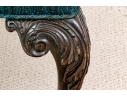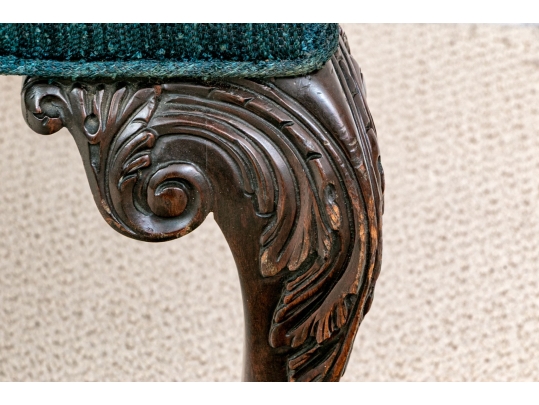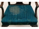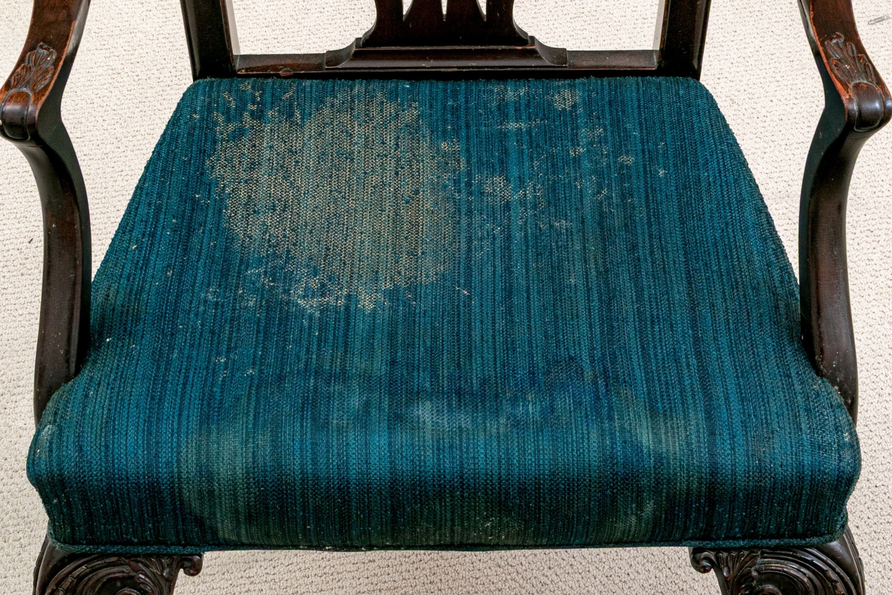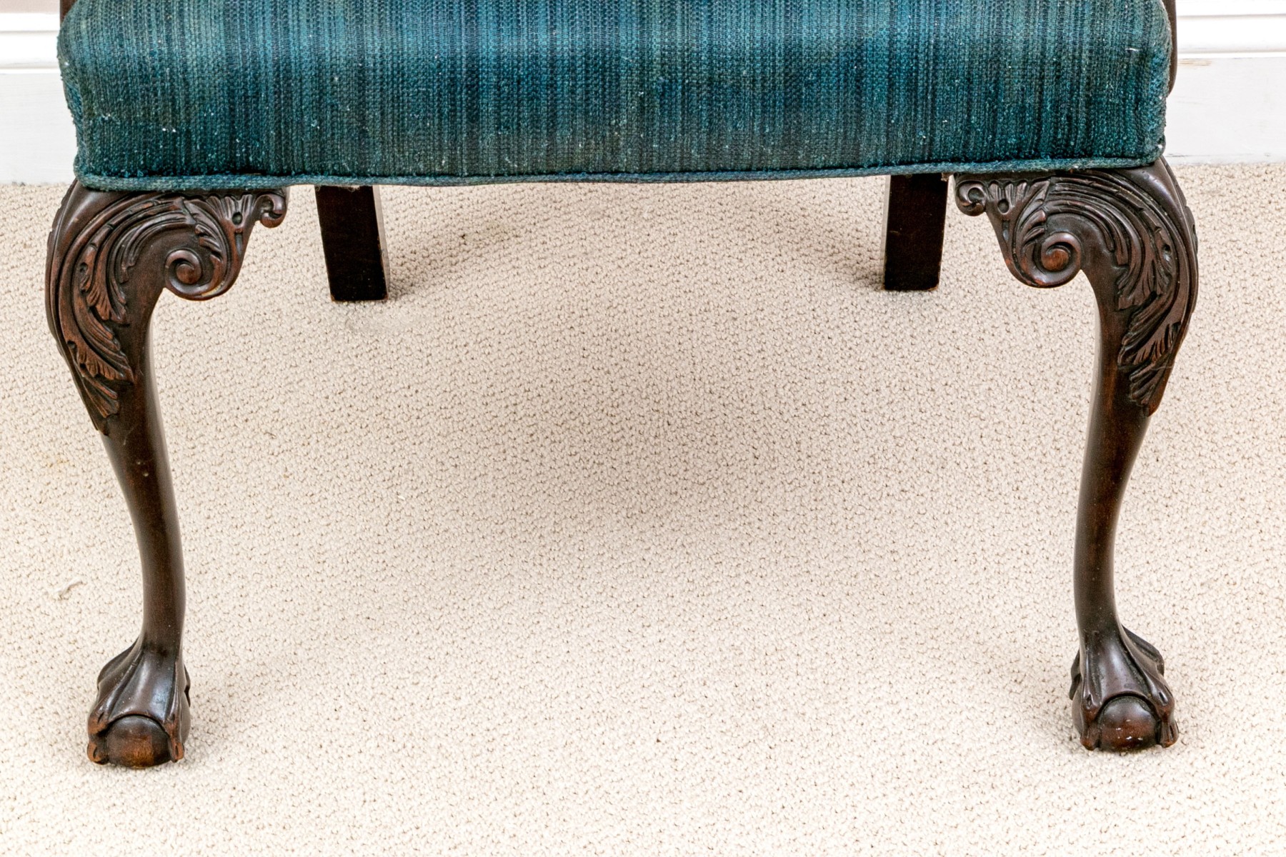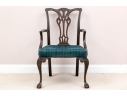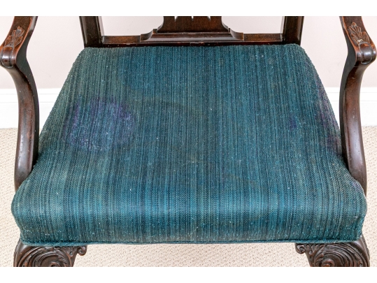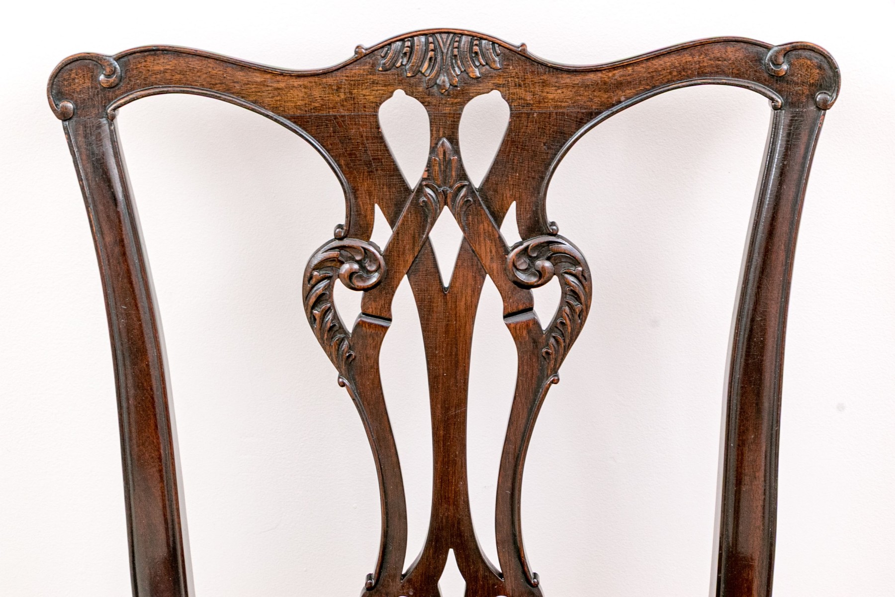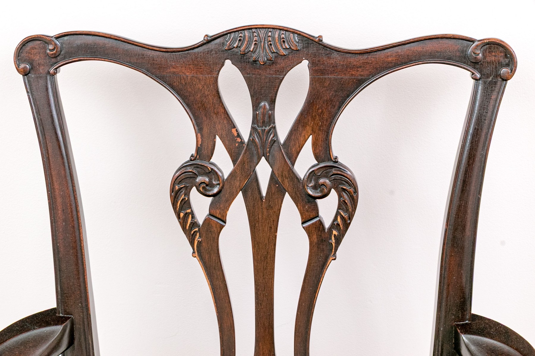 A set of ten Chippendale style dining chairs including eight side chairs and two armchairs. Beautifully crafted with warm-toned, dark brown frames sporting serpentine top rails and shapely openwork fiddle splats. Seats are upholstered in heathered teal blue fabric and raised over heavily carved cabriole front legs over ball and claw feet.