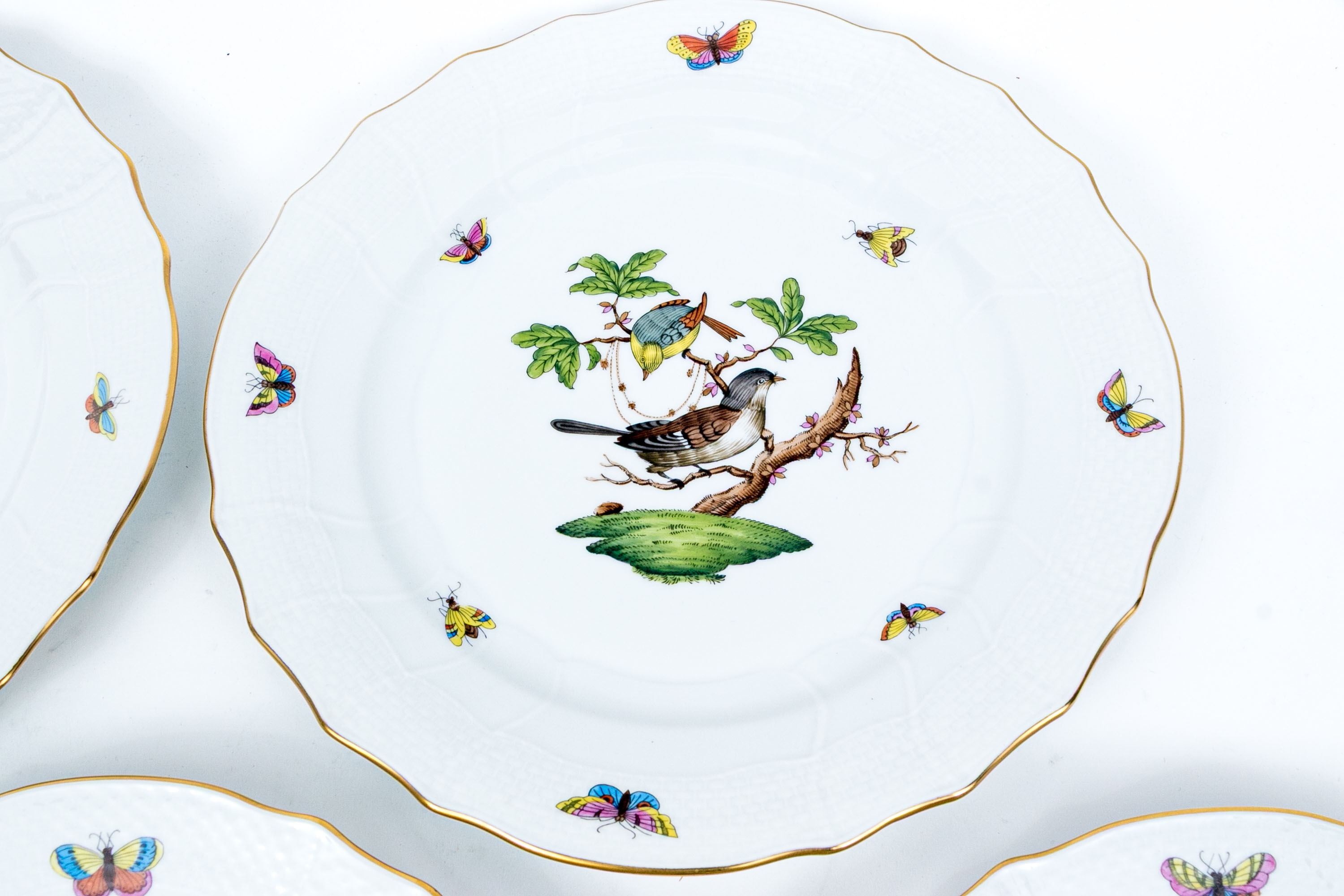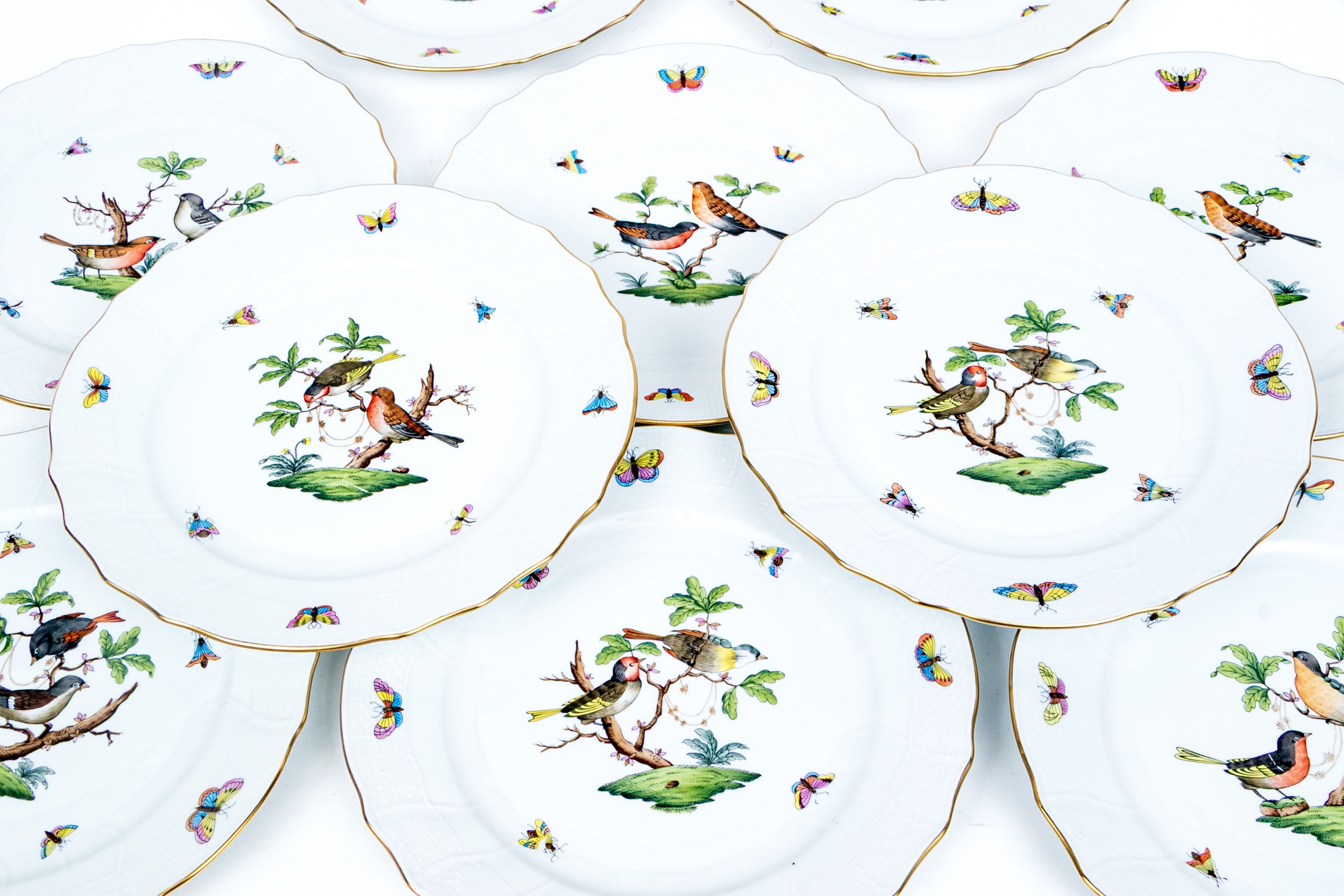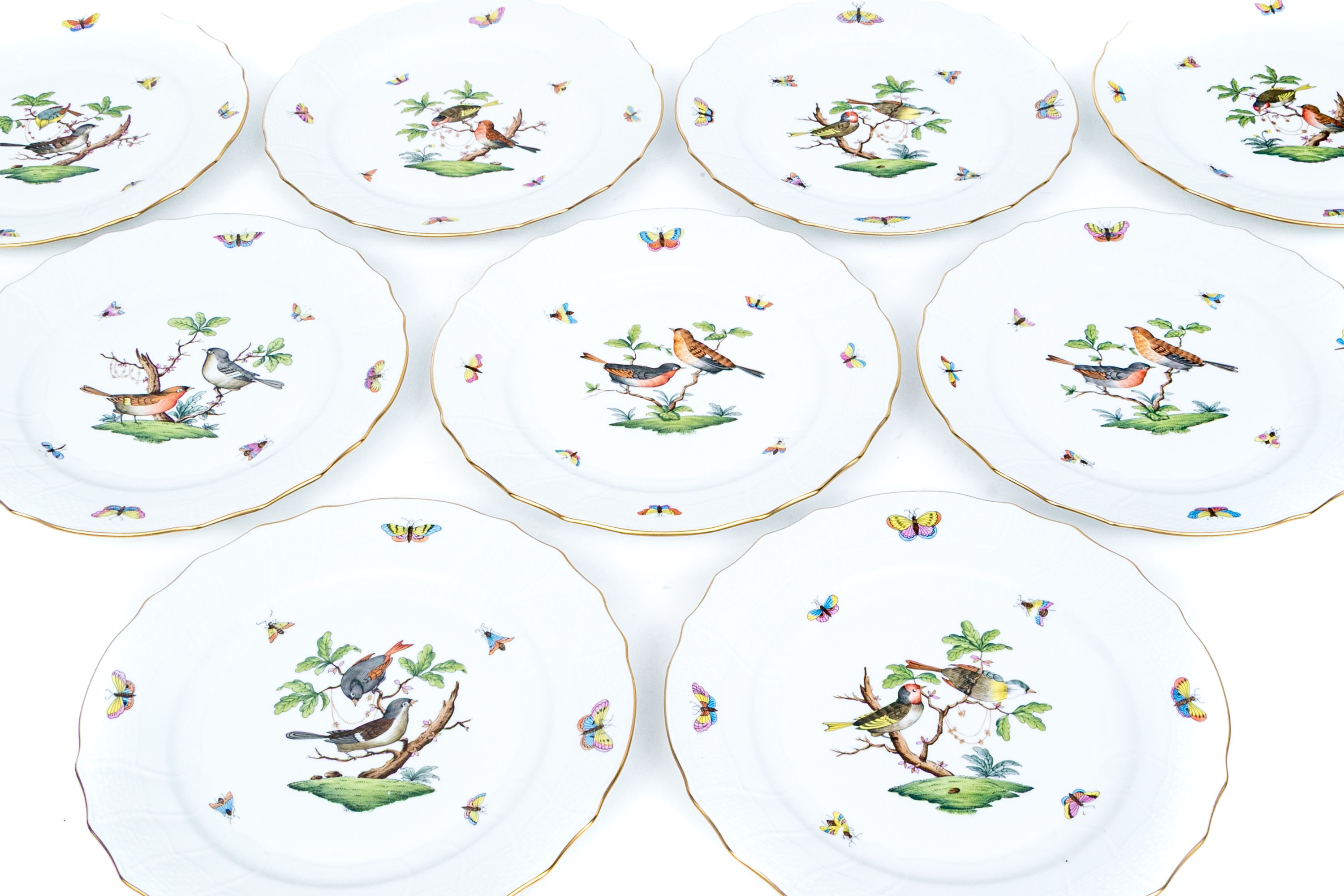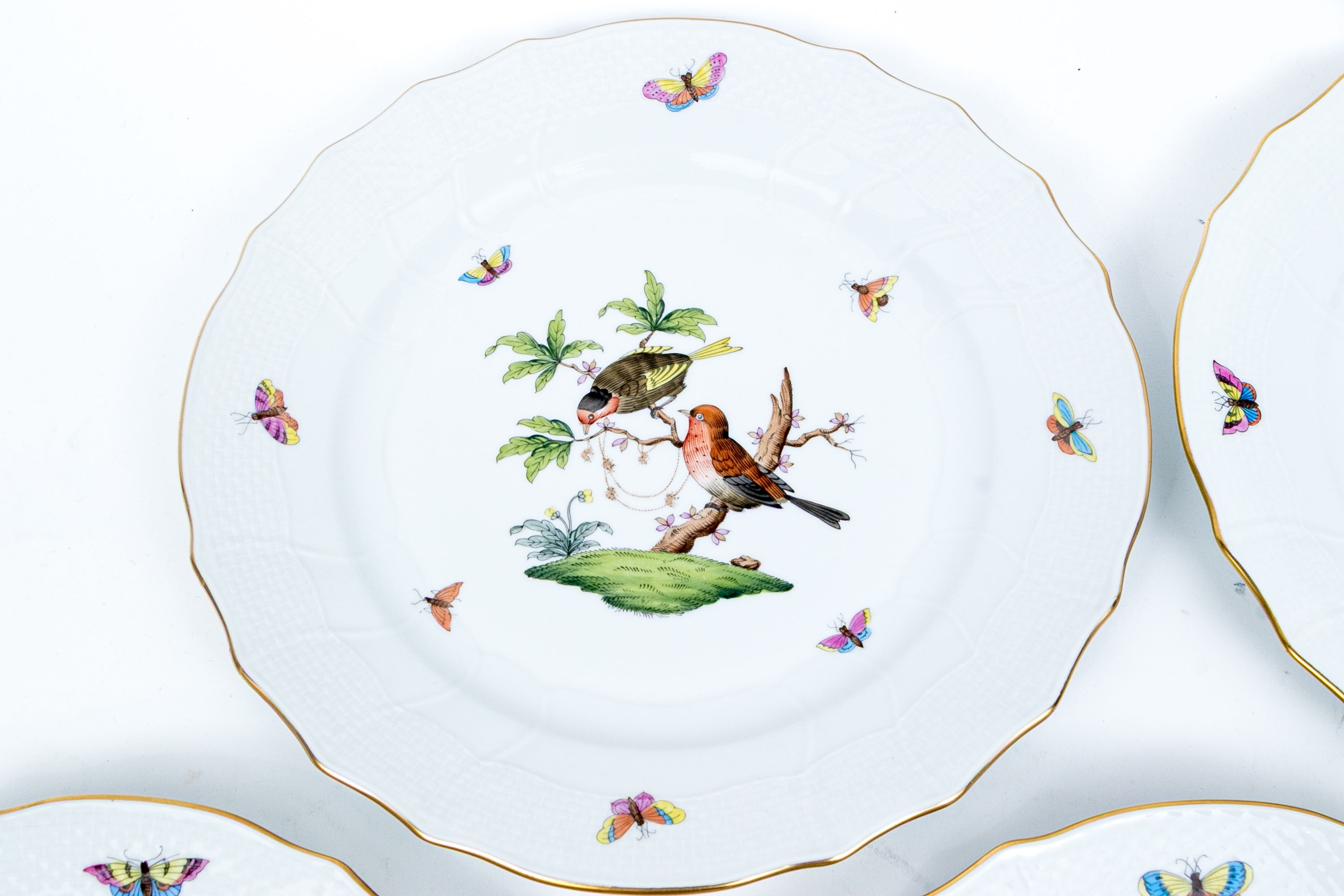 Set of eight Herend Hungary hand-painted porcelain dinner plates, featuring the Rothschild Bird (RO) pattern with elegant 24K gold trim. Each plate displays Herend’s signature basketweave (osier) molded border and gently scalloped edge, meticulously accented with a fine gold rim. The centers are decorated with unique bird and insect compositions, each distinct from the others—a hallmark of the Rothschild Bird series. Each piece bears the Herend Hungary blue shield hallmark with crossed paintbrushes, HANDPAINTED, and the pattern number 1524/RO.