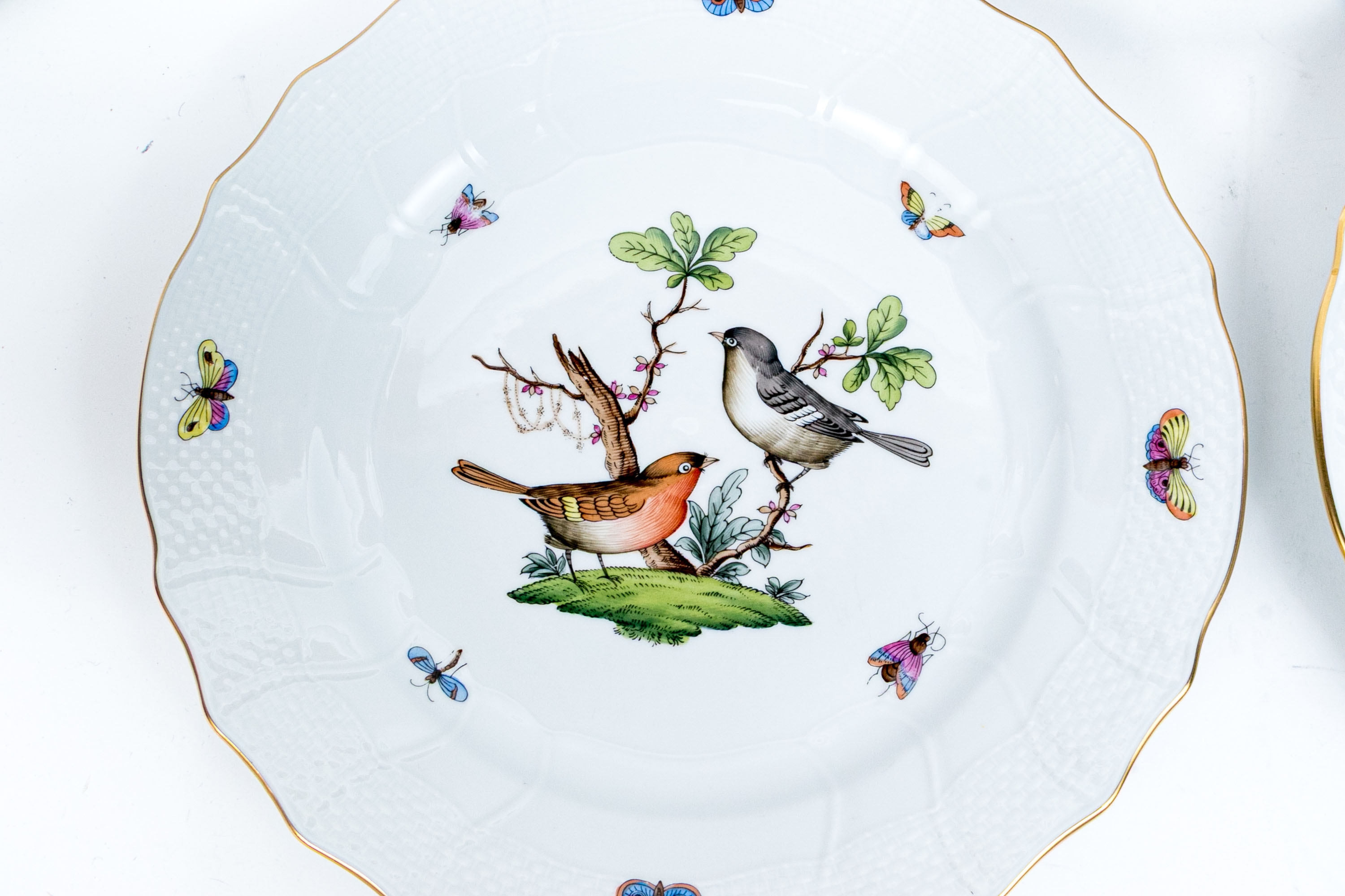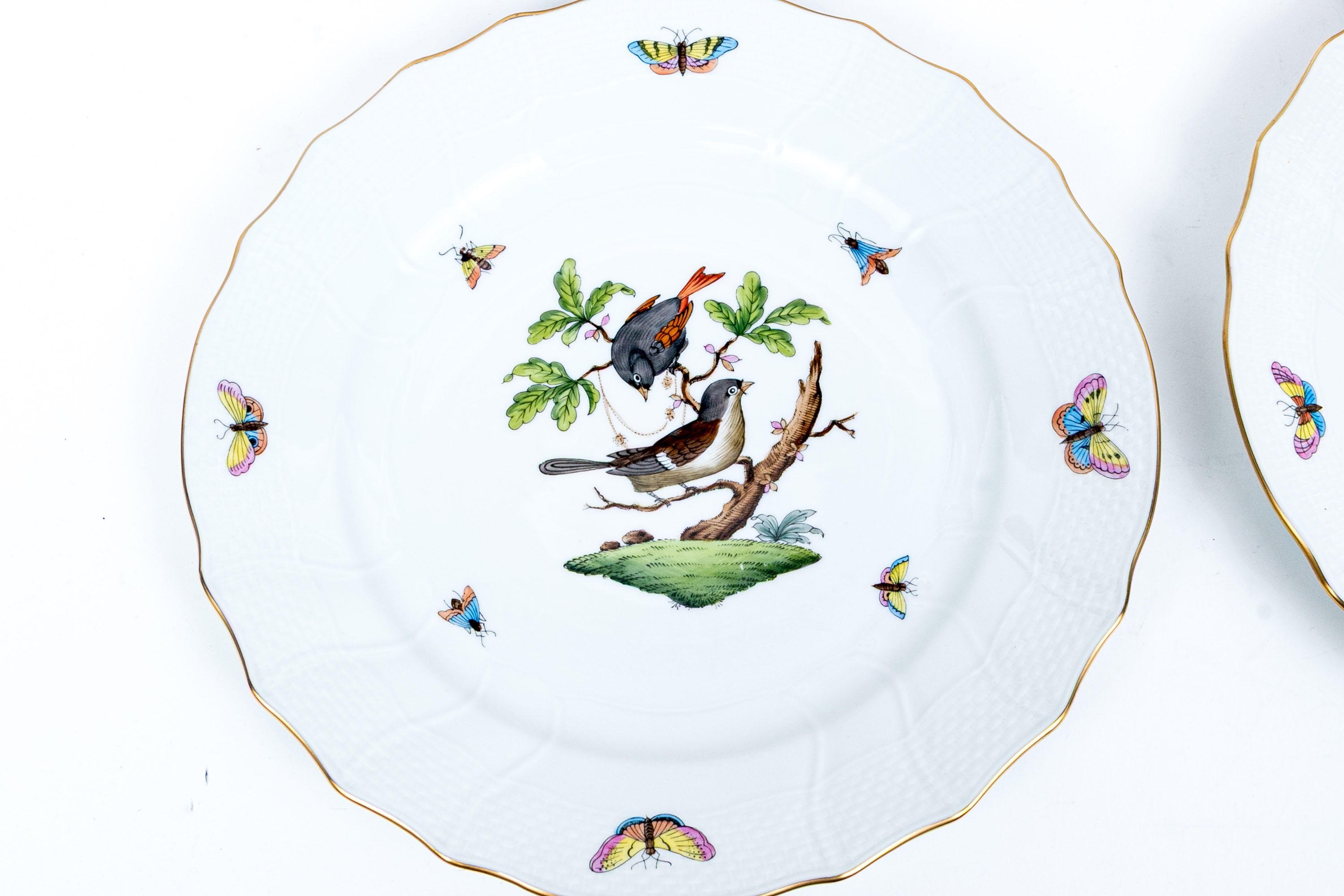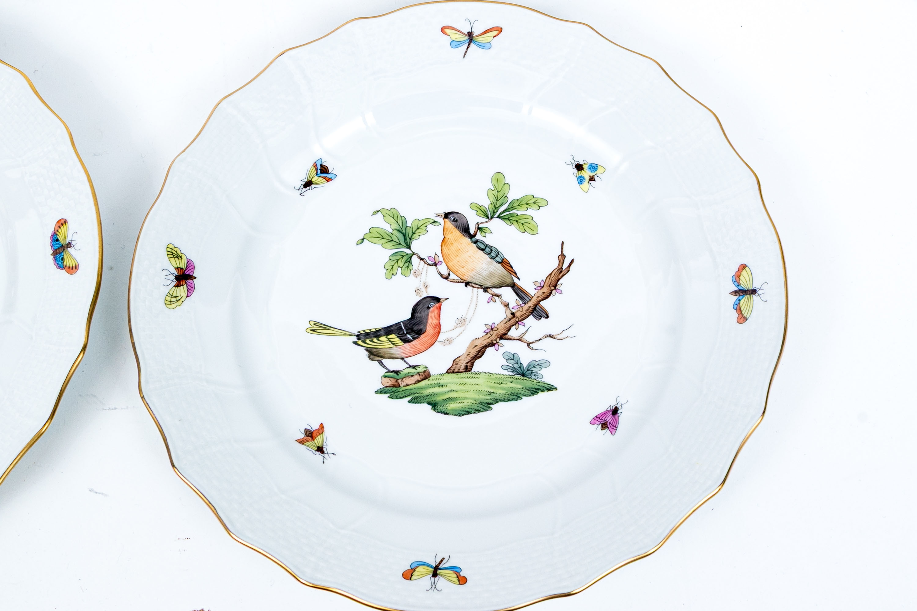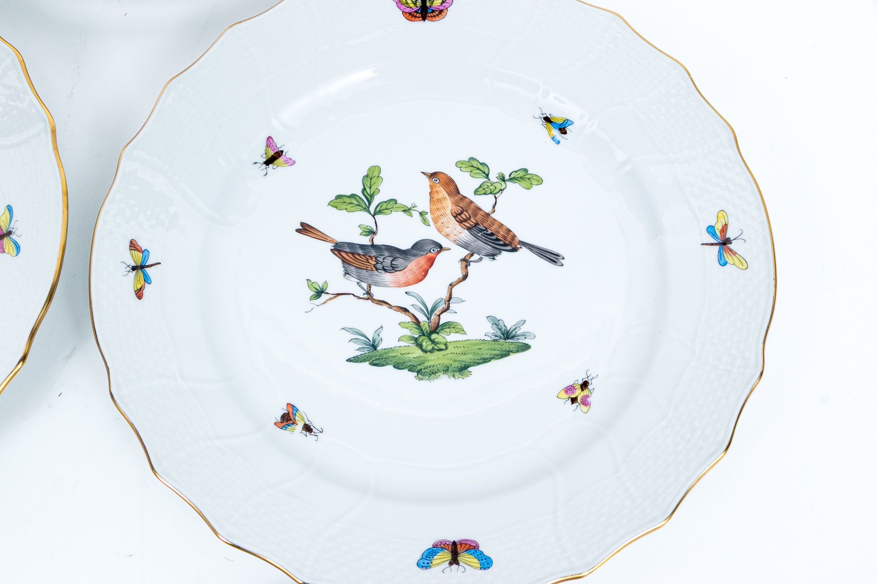 Set of eight Herend Hungary hand-painted porcelain dinner plates, featuring the Rothschild Bird (RO) pattern with elegant 24K gold trim. Each plate displays Herend’s signature basketweave (osier) molded border and gently scalloped edge, meticulously accented with a fine gold rim. The centers are decorated with unique bird and insect compositions, each distinct from the others—a hallmark of the Rothschild Bird series. Each piece bears the Herend Hungary blue shield hallmark with crossed paintbrushes, HANDPAINTED, and the pattern number 1524/RO.