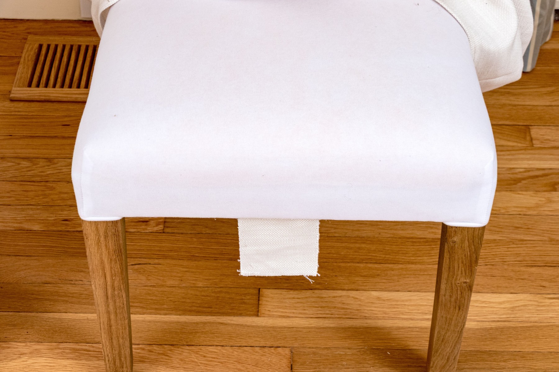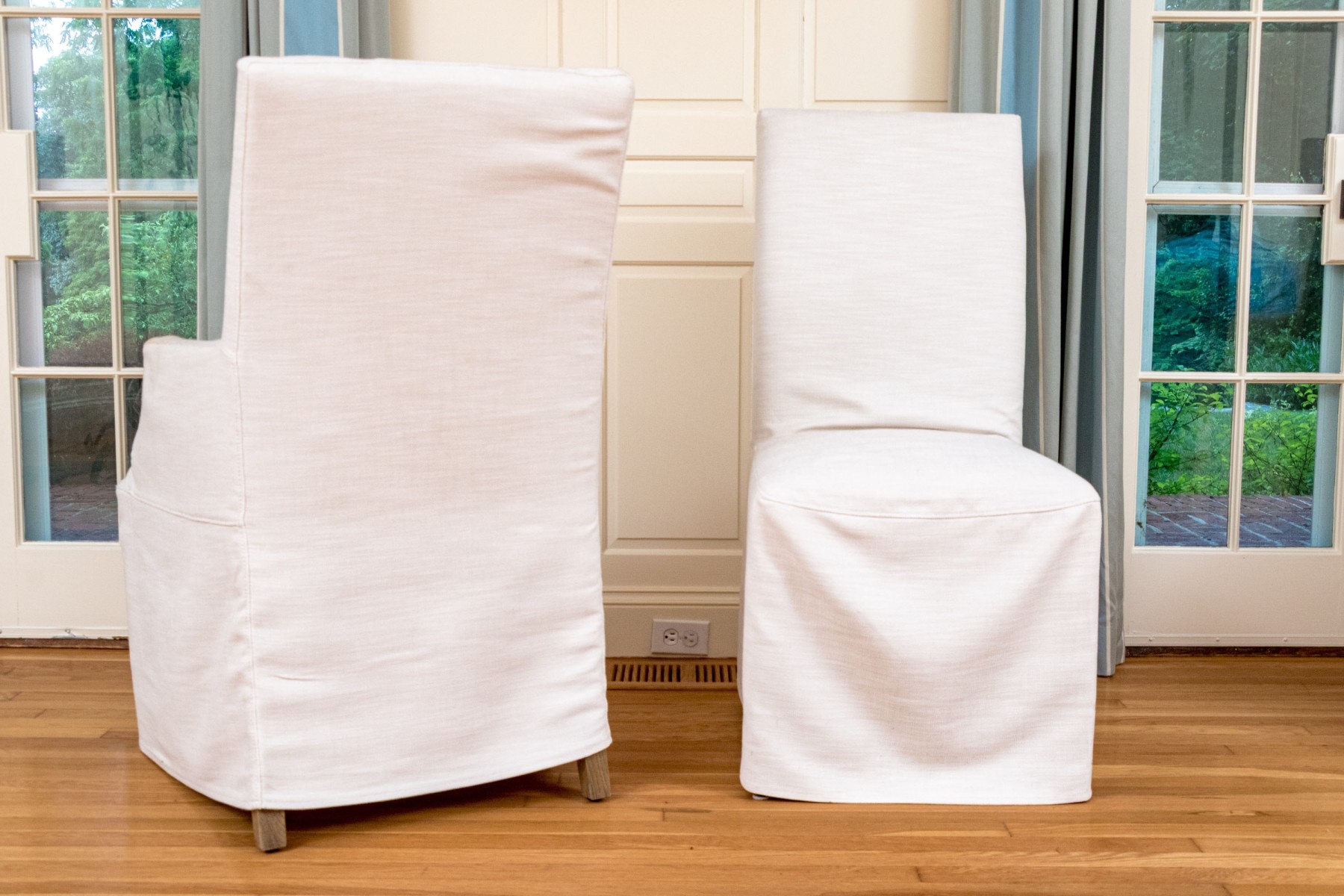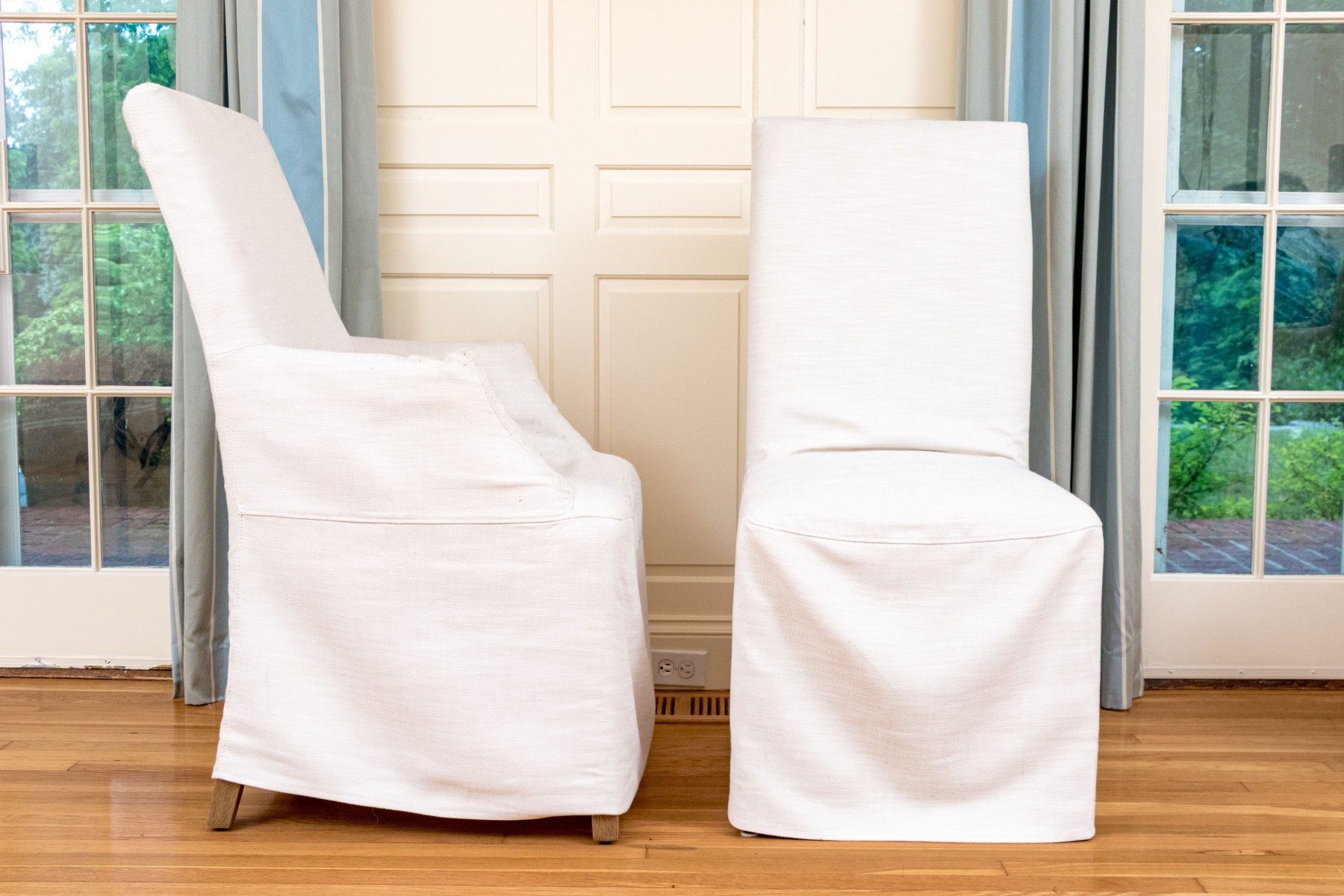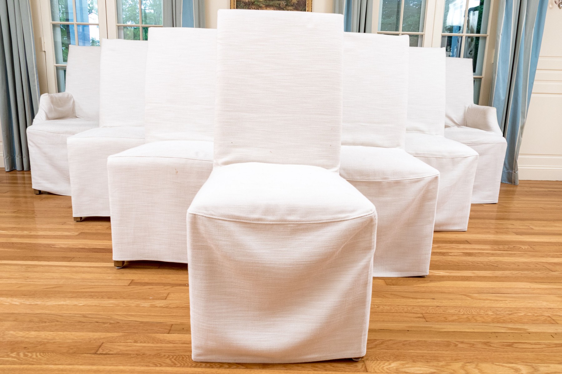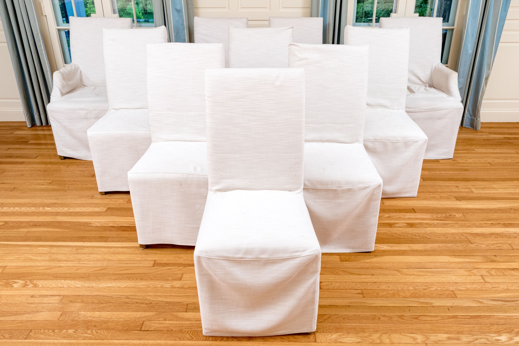 An excellent set of ten Restoration Hardware "Hudson Parsons" dining chairs including eight side chairs and two armchairs, all with classy white slipcovers for a timelessly elegant touch. The chairs feature tall, rectangular backs, with armchairs sporting narrow arms and curved arm fronts. The slipcovers are subtly heathered for a touch of visual texture, and conceal light brown legs beneath.