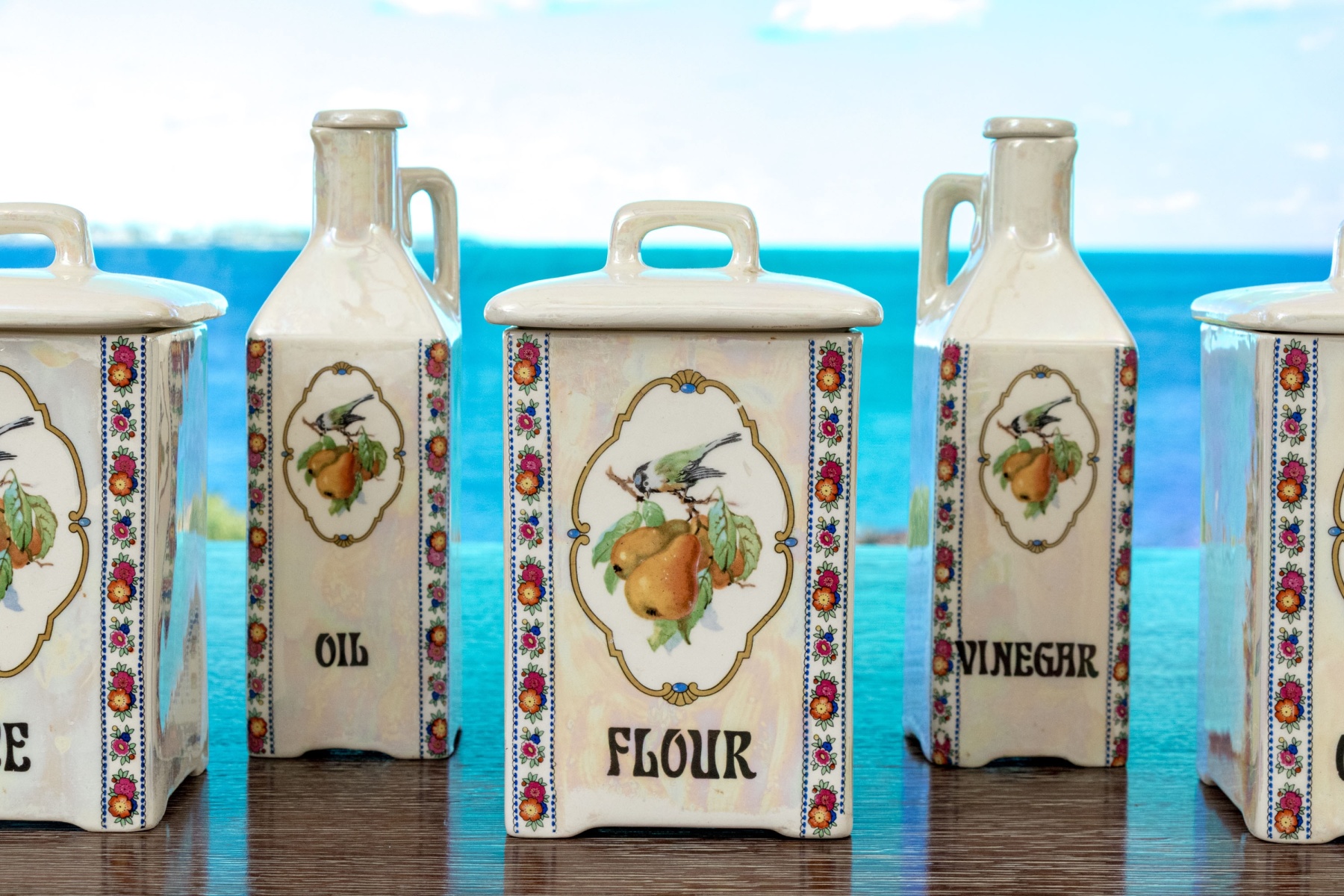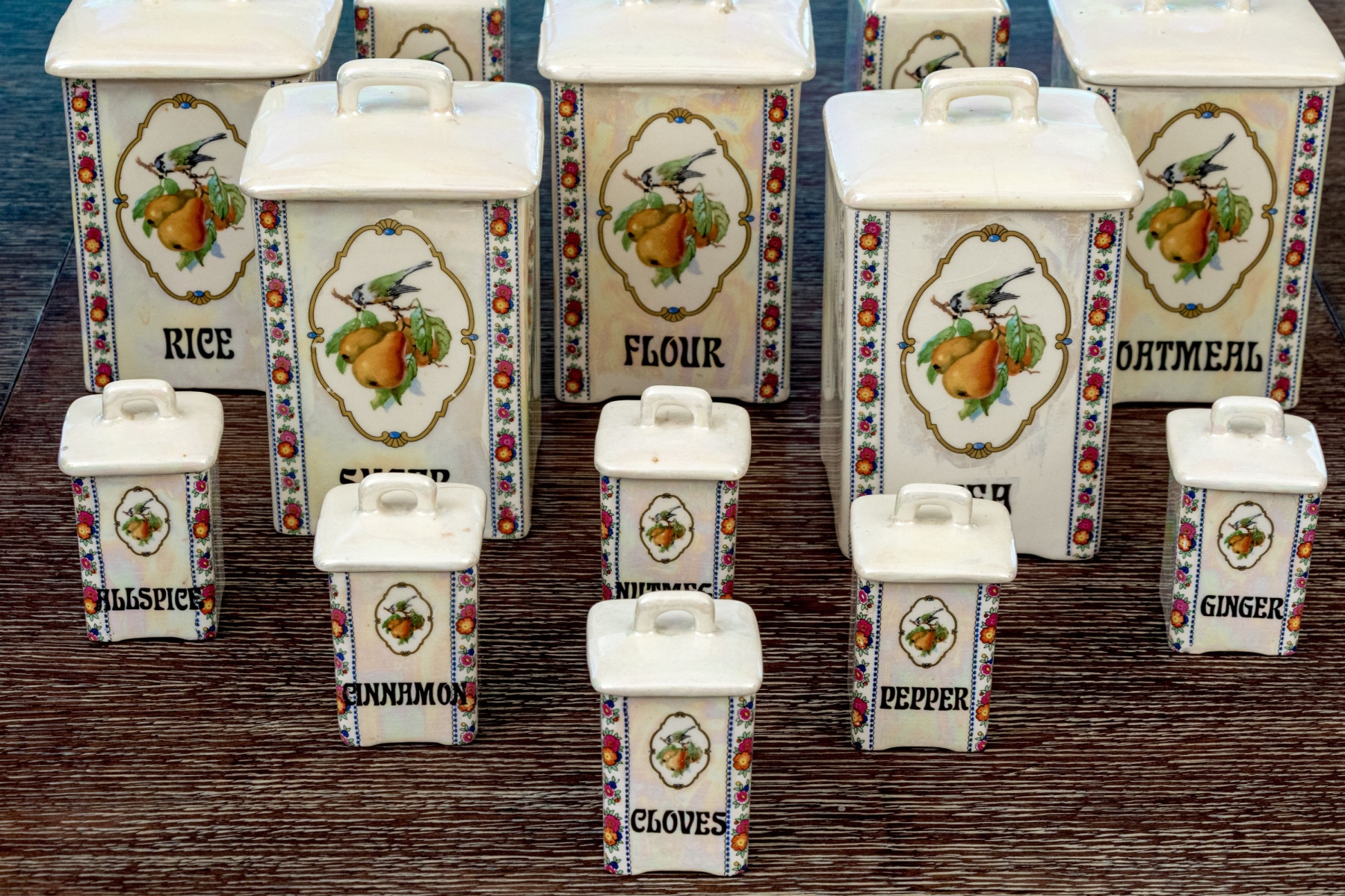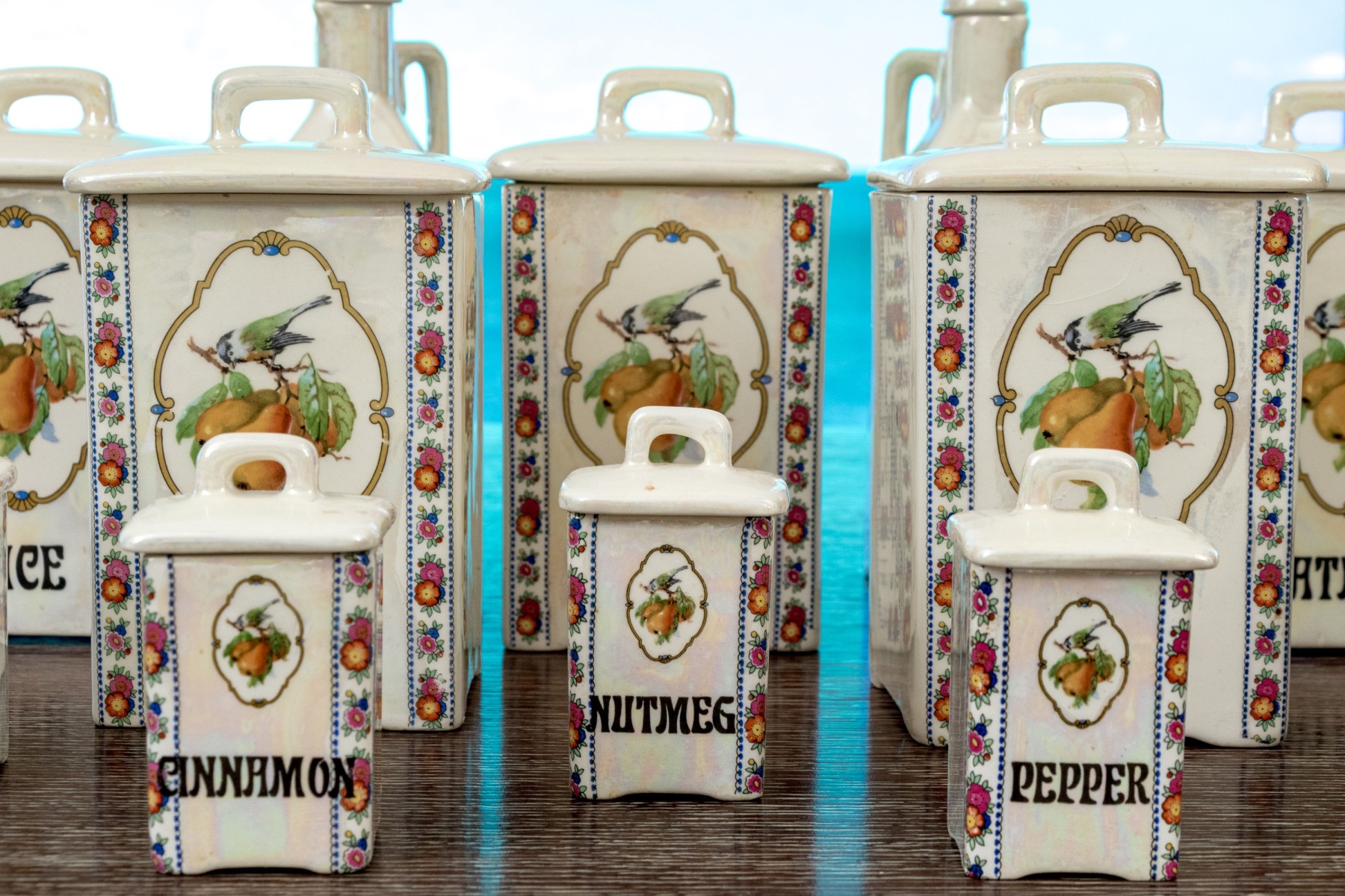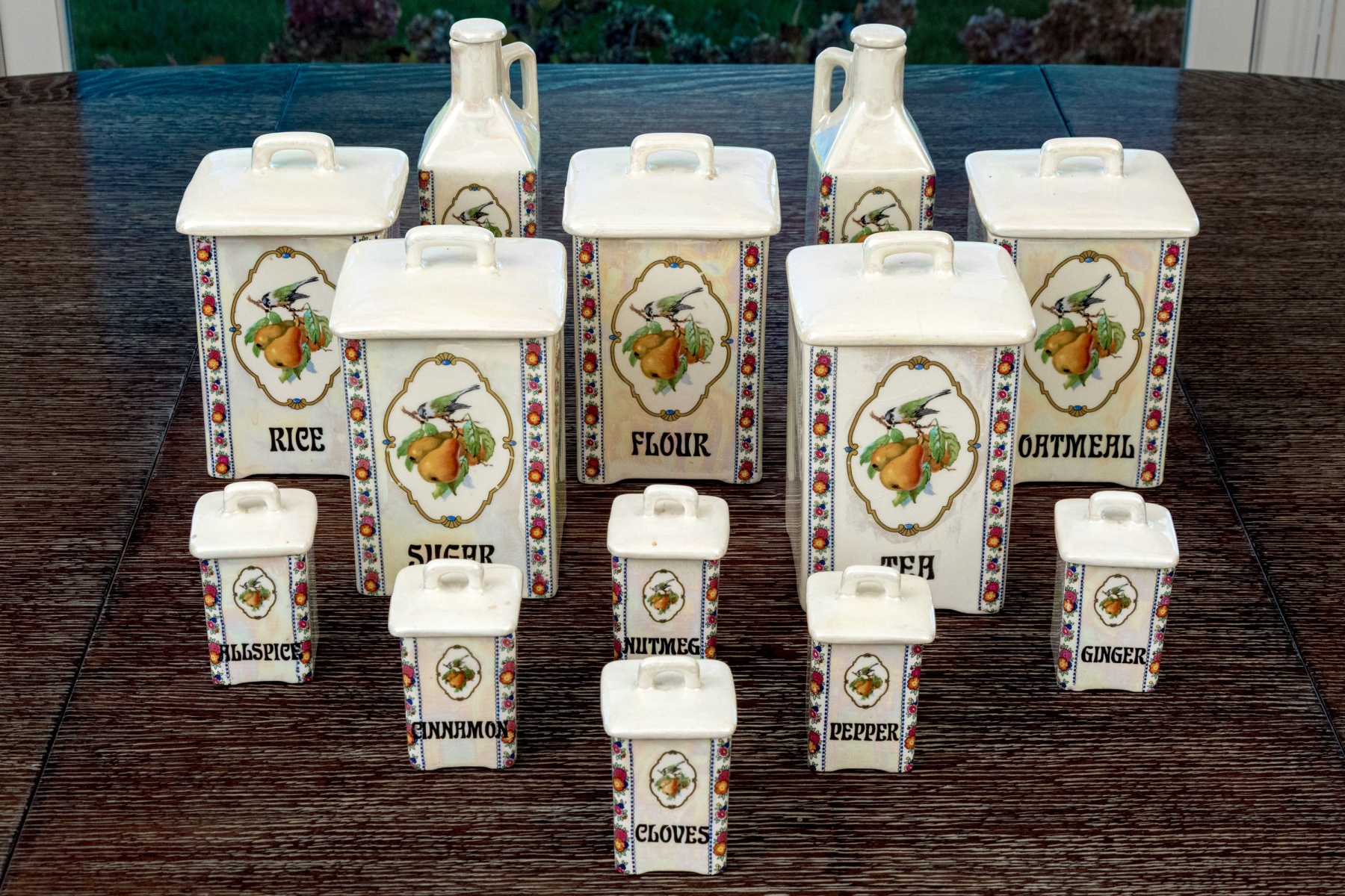 A delightful set of thirteen Czechoslovakian ceramic kitchen vessels, all wonderfully glazed with beautiful lustre hues and decorated with scenes of pears. Includes two bottles, five larger lidded canisters, and six smaller.
