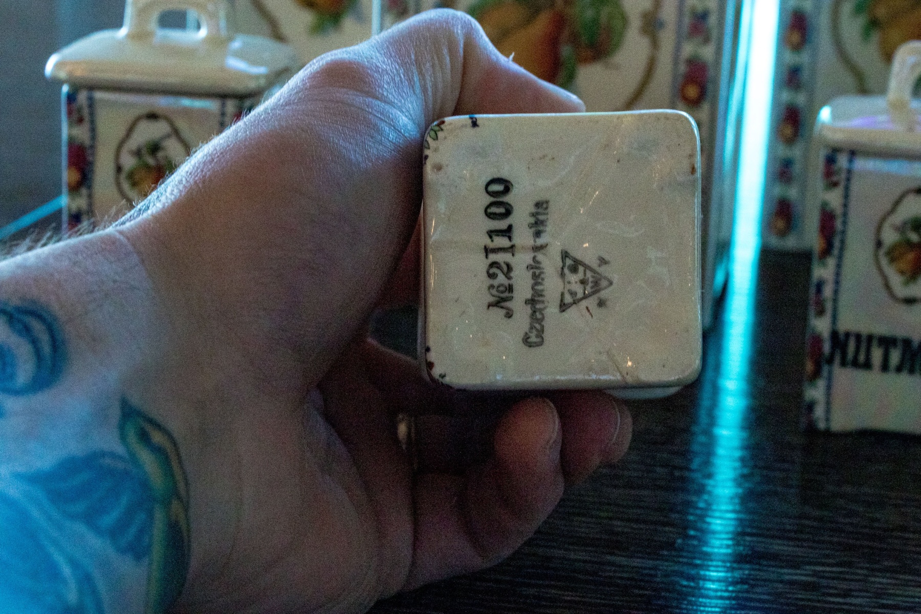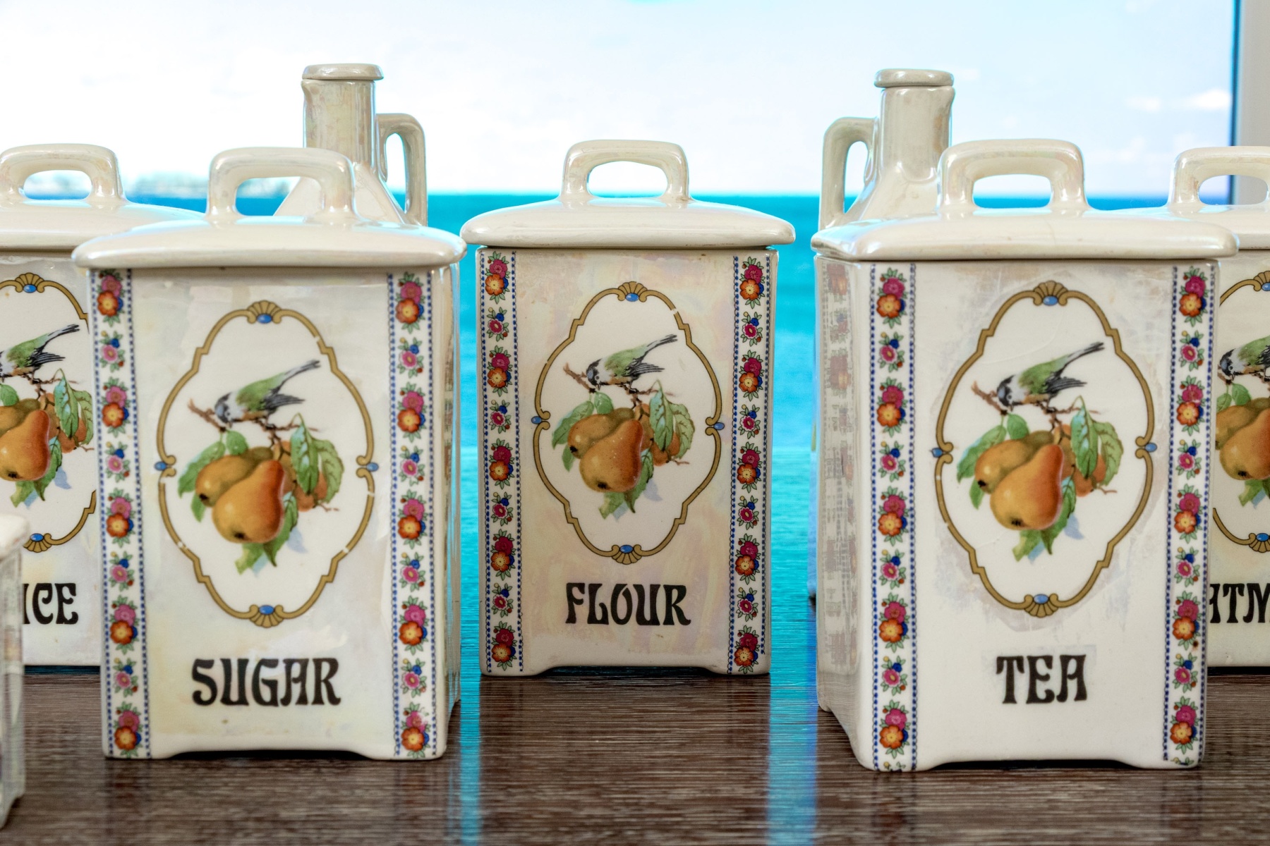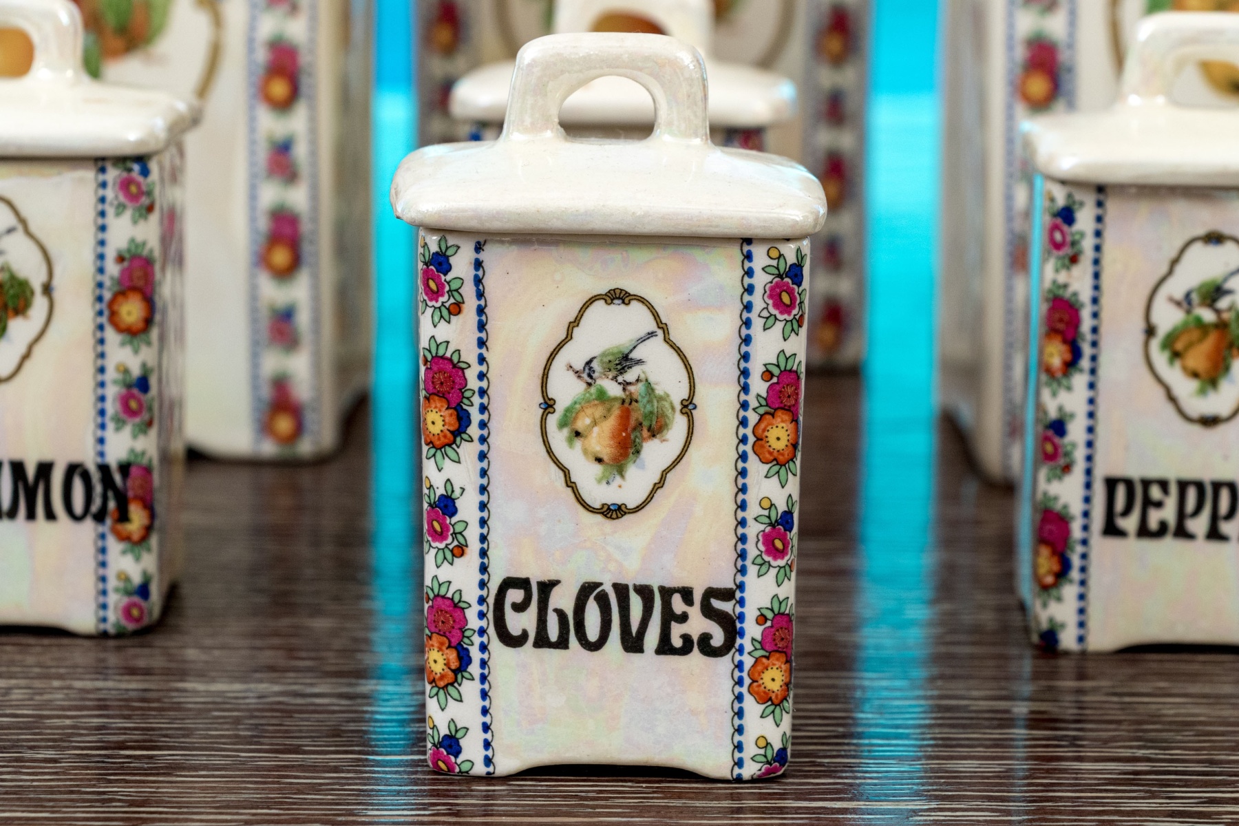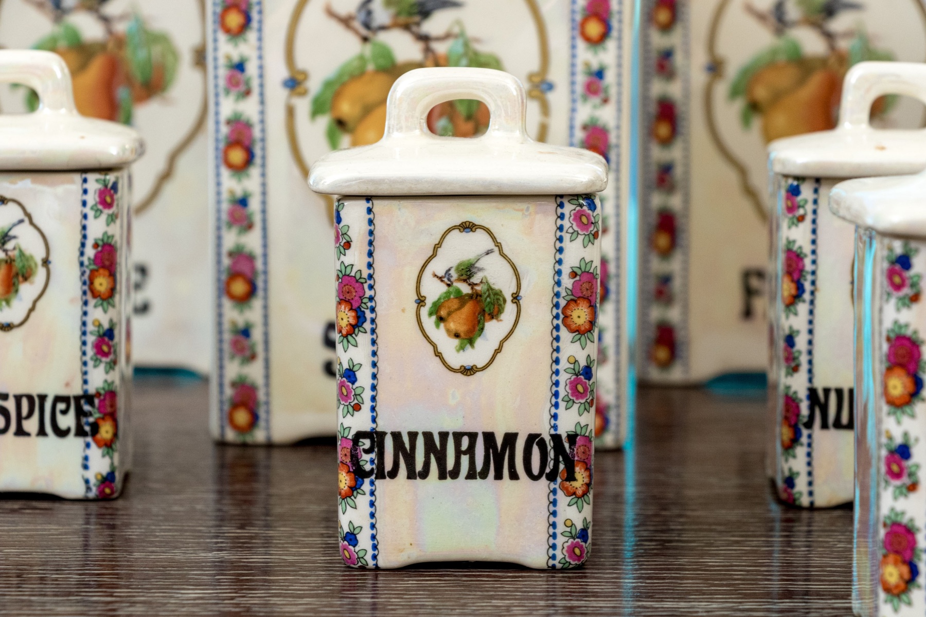 A delightful set of thirteen Czechoslovakian ceramic kitchen vessels, all wonderfully glazed with beautiful lustre hues and decorated with scenes of pears. Includes two bottles, five larger lidded canisters, and six smaller.