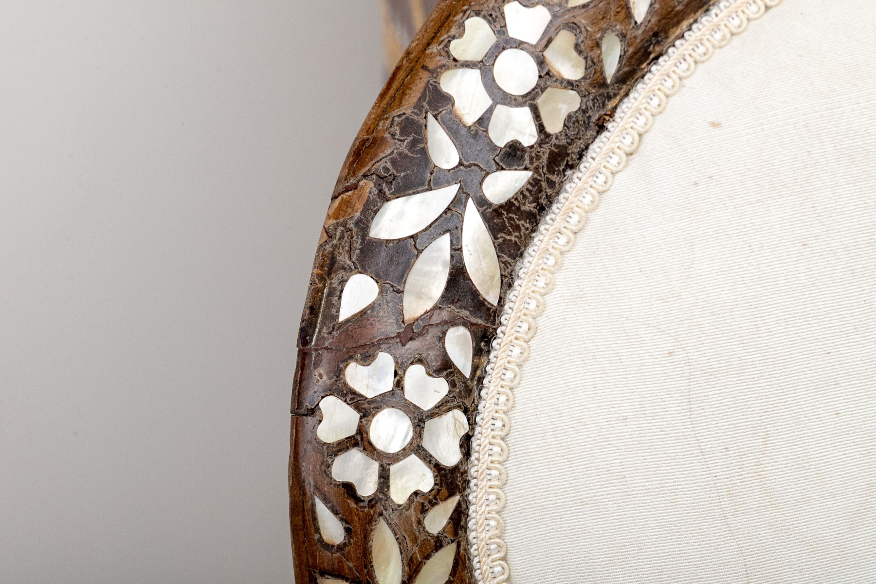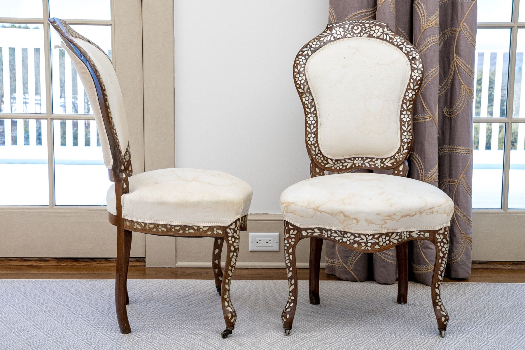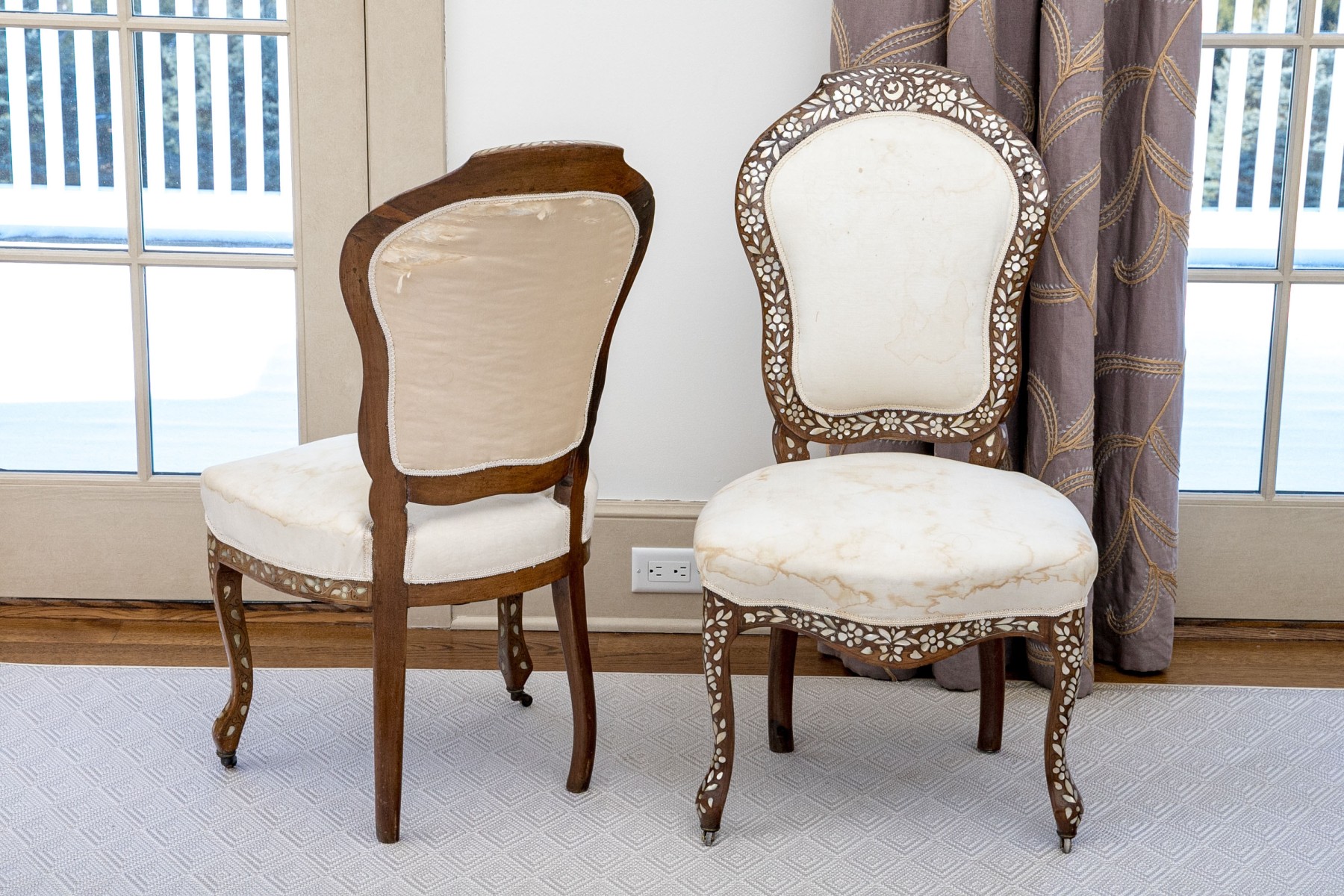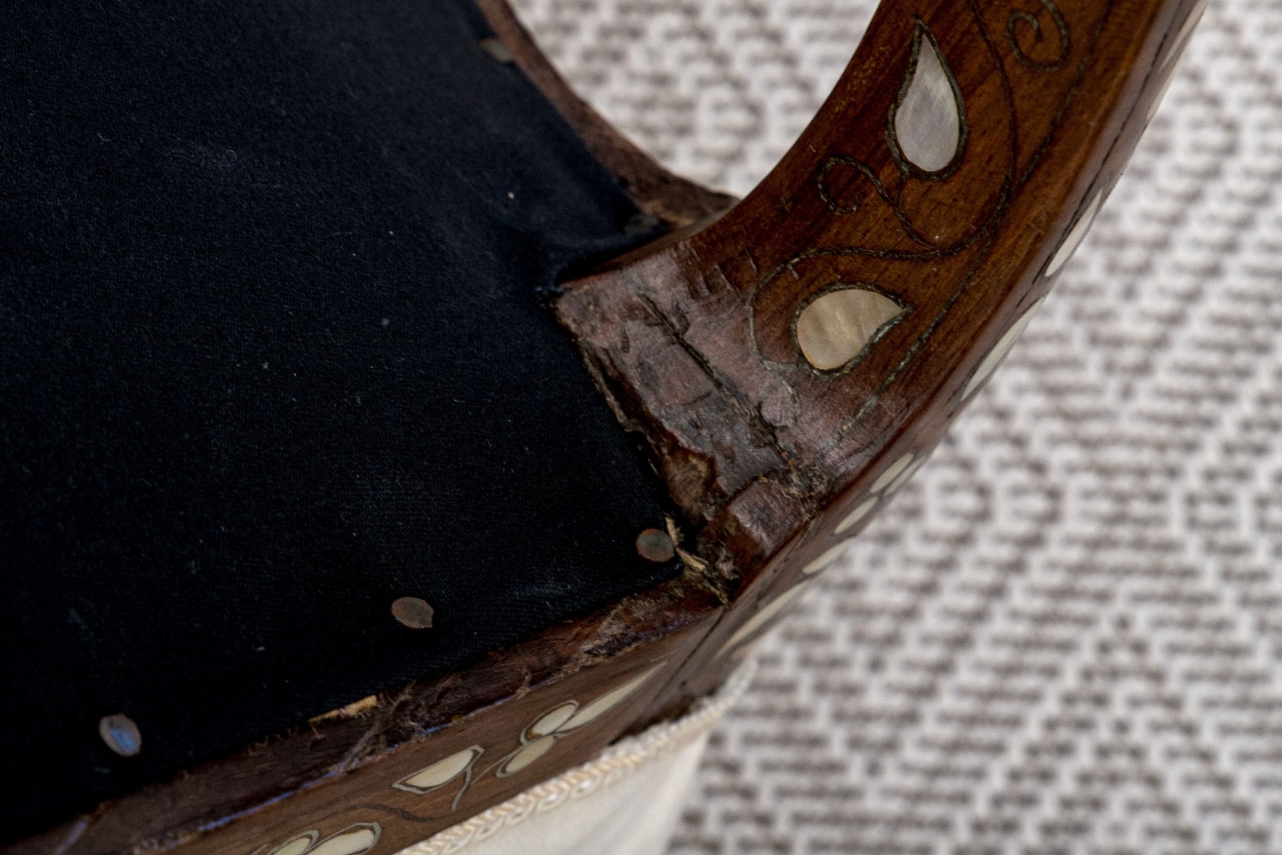 Losses to inlay on each. Muslin upholstery heavily stain and torn - great frames.