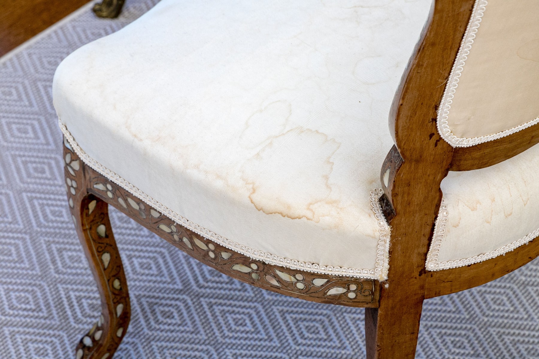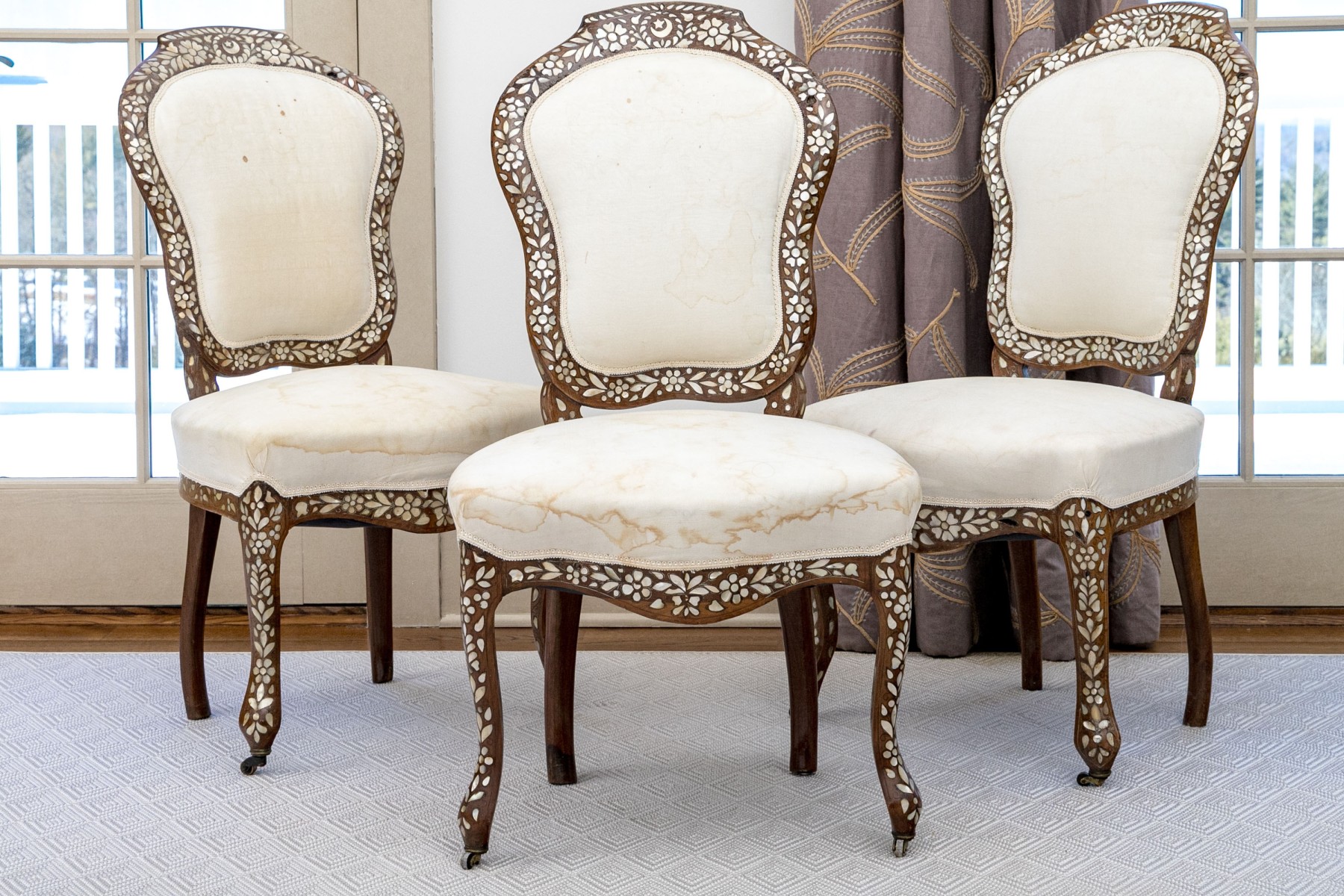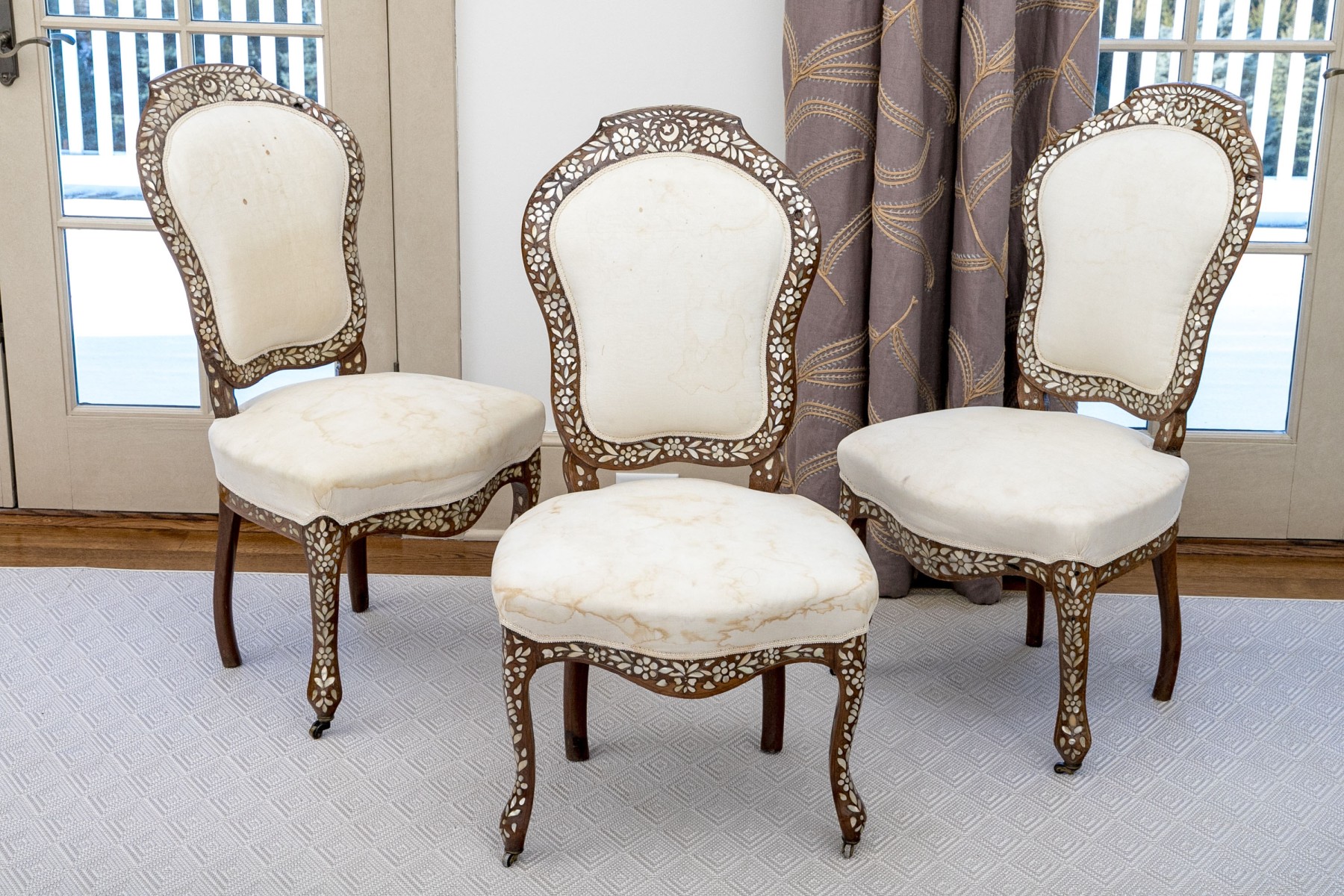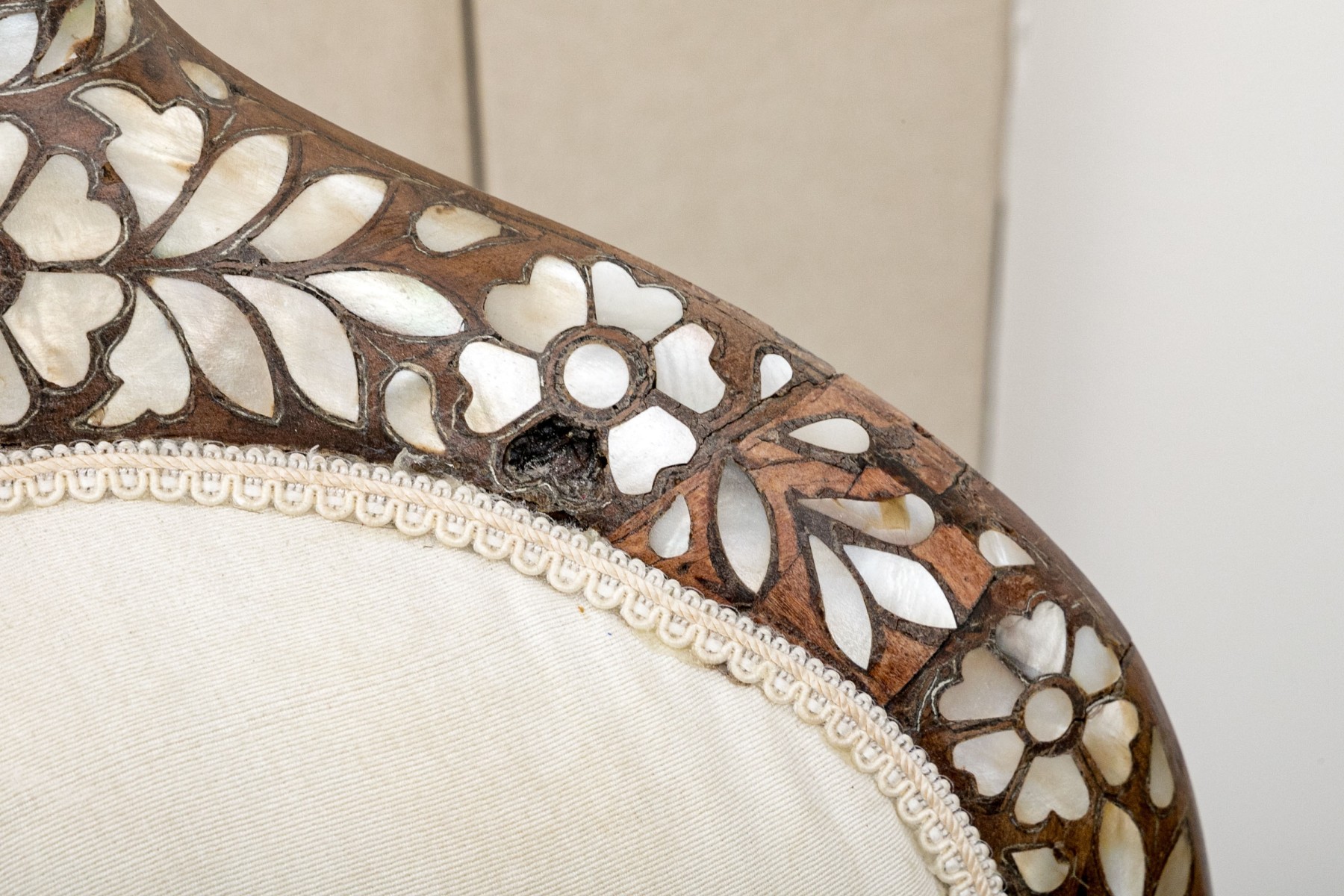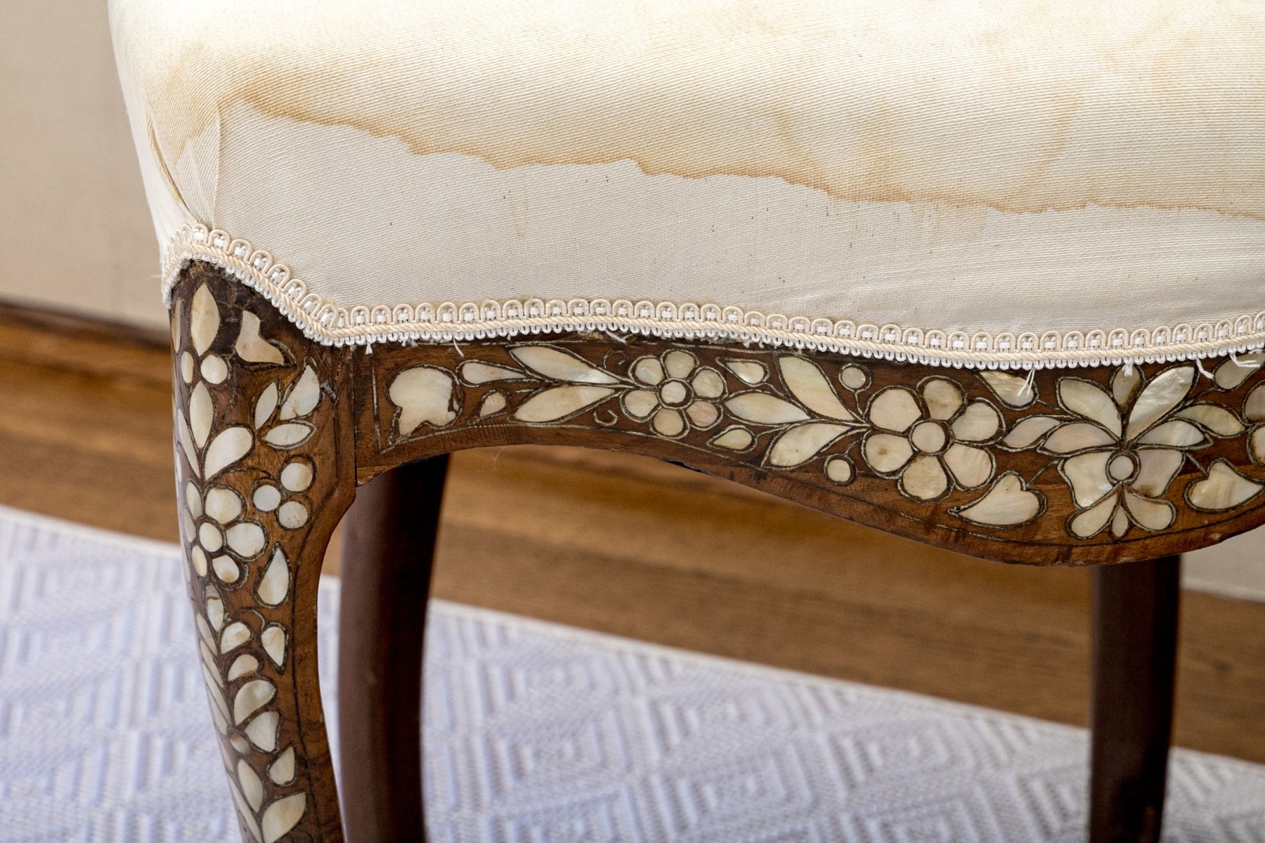 Losses to inlay on each. Muslin upholstery heavily stain and torn - great frames.