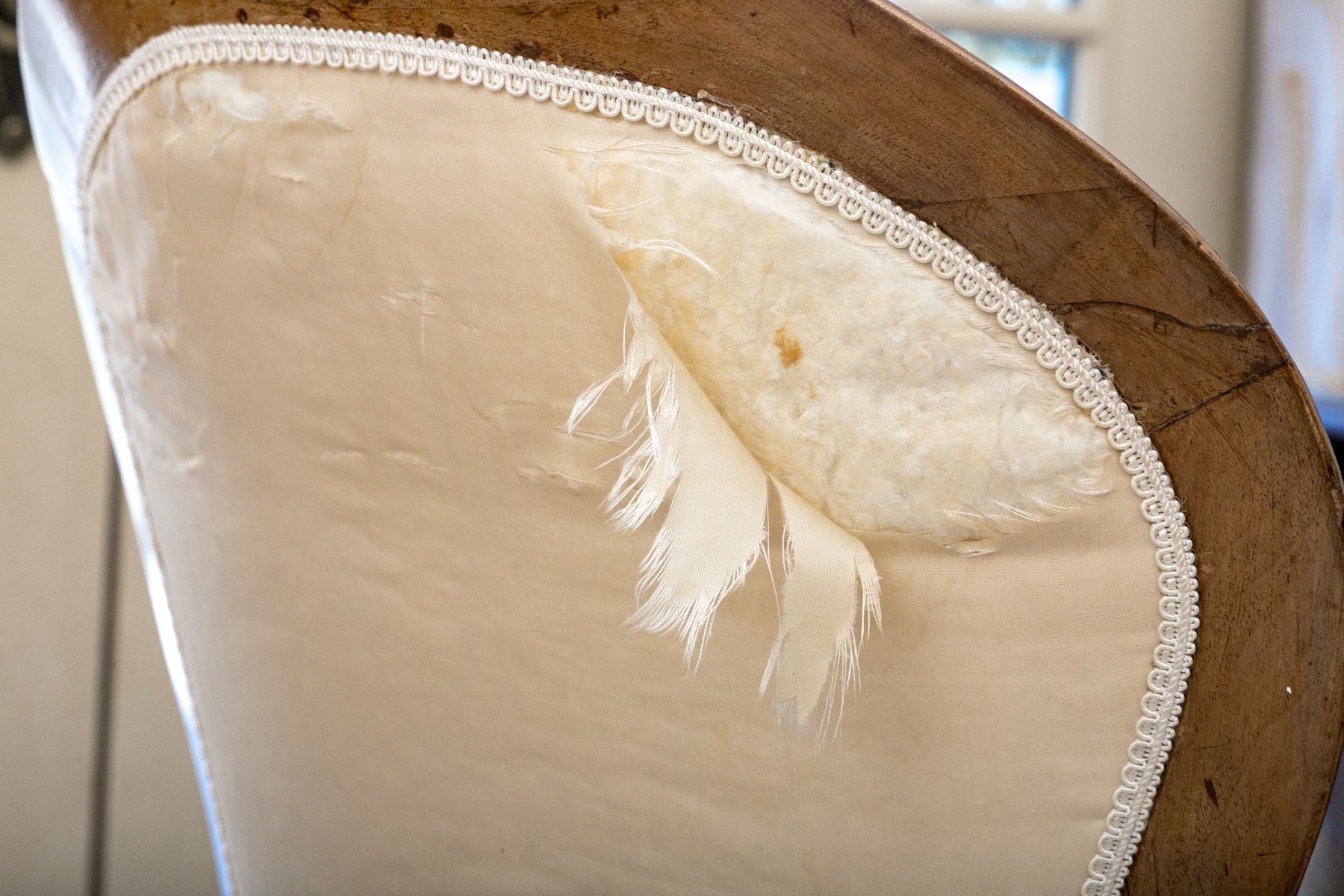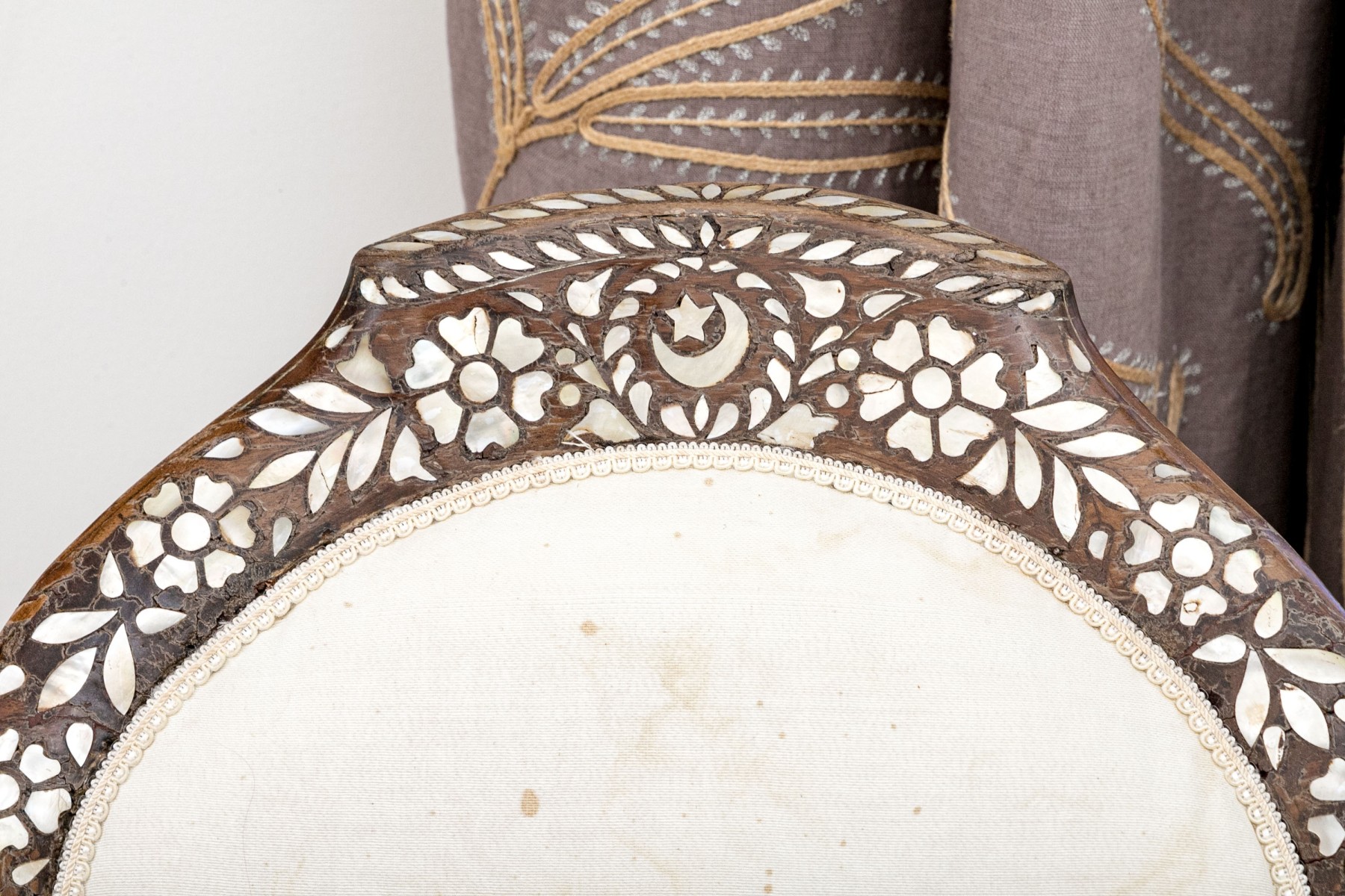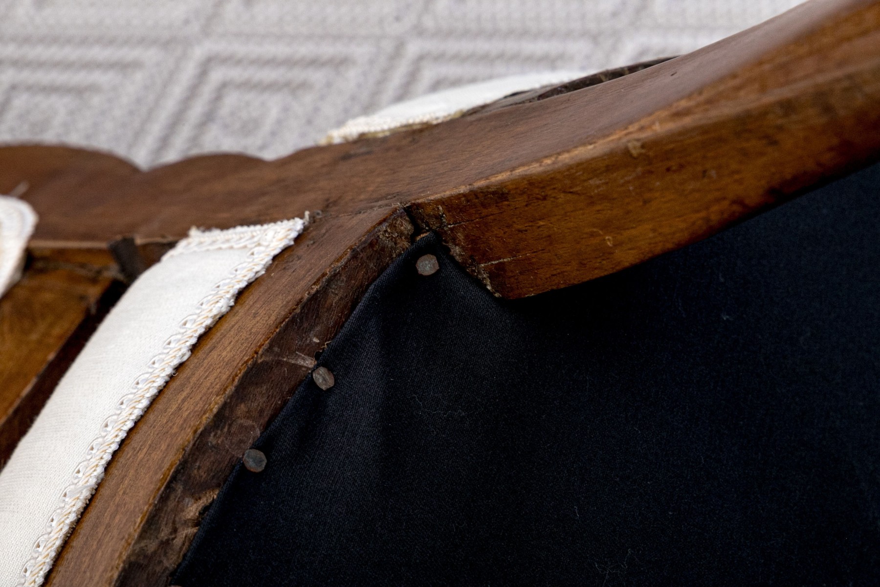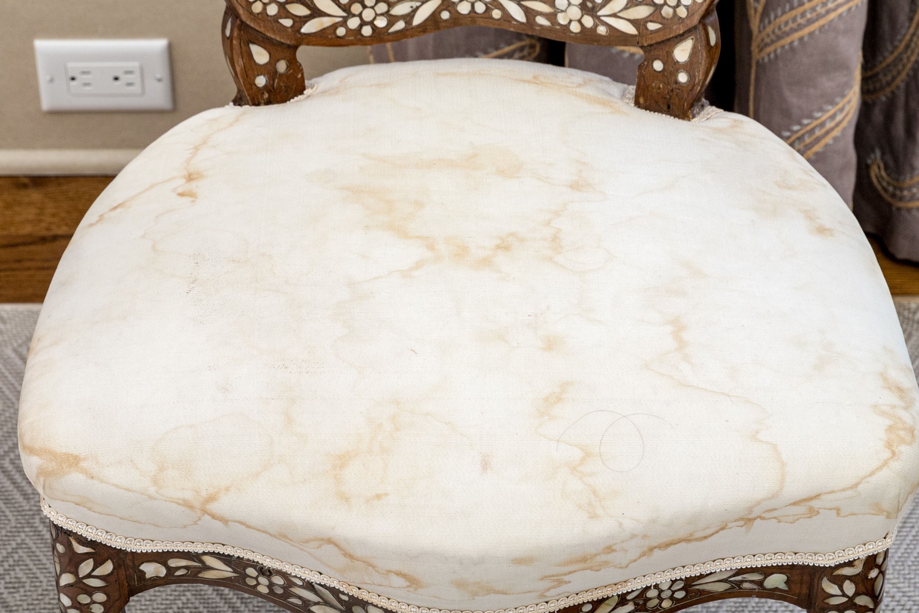 Losses to inlay on each. Muslin upholstery heavily stain and torn - great frames.
