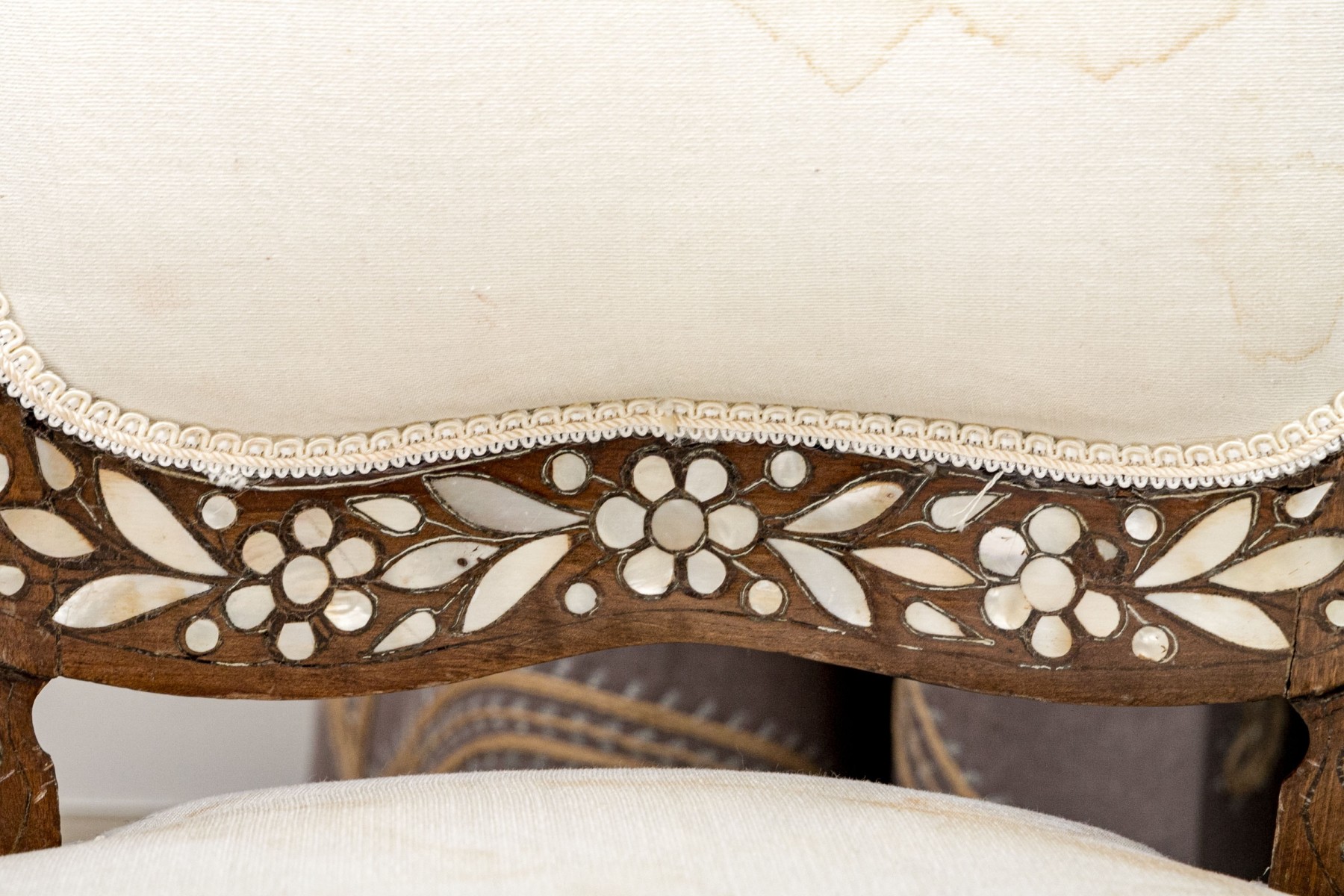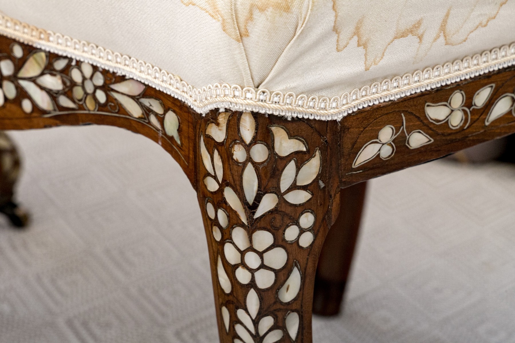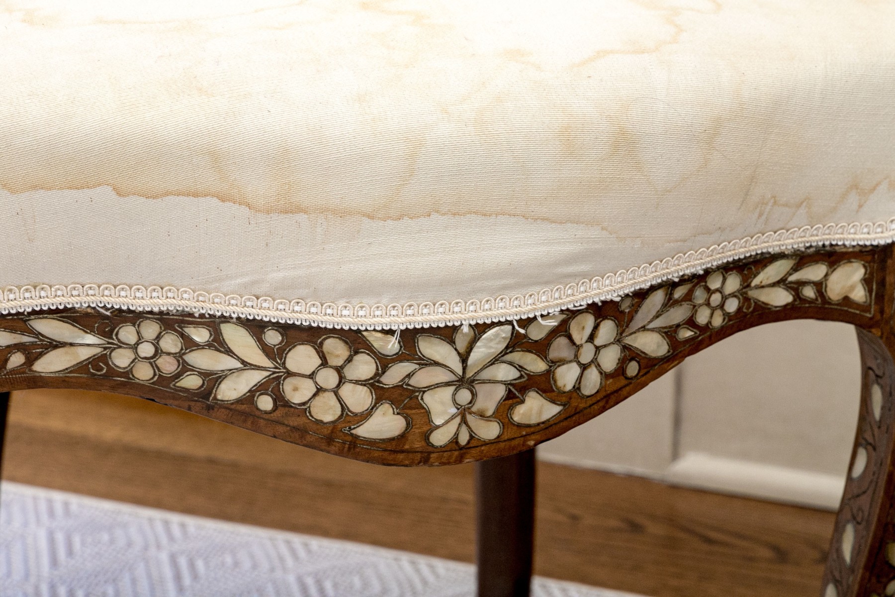 Balloon back serpentine seats, caster feet. Heavily decorated with mother of pearl inlay.