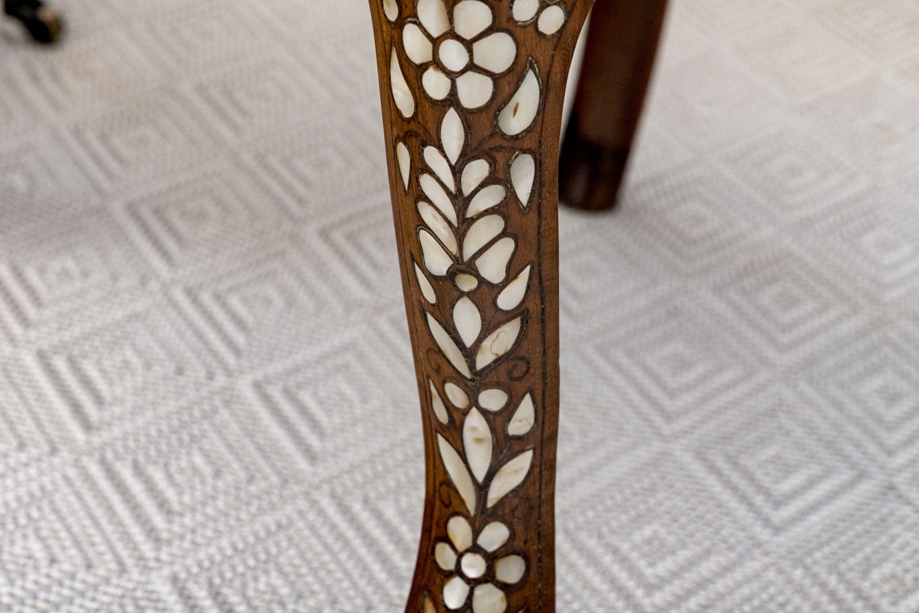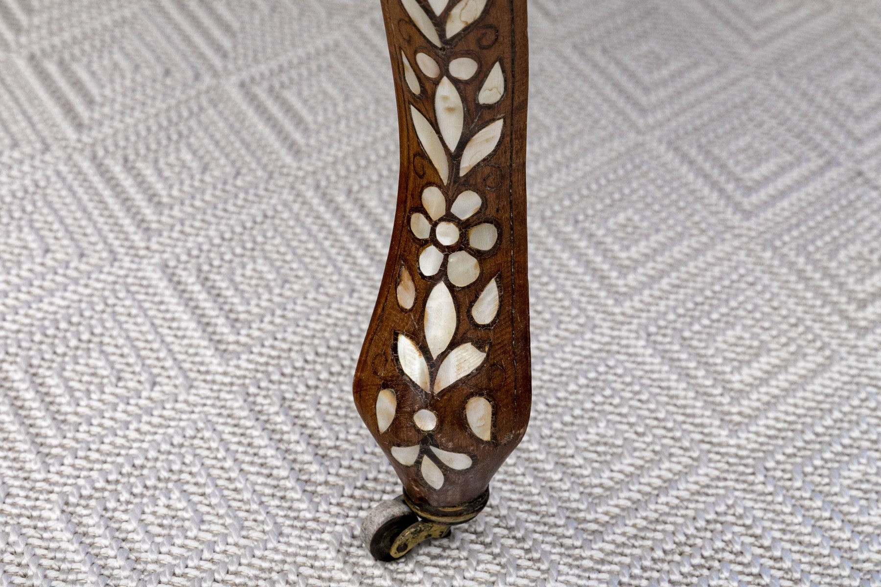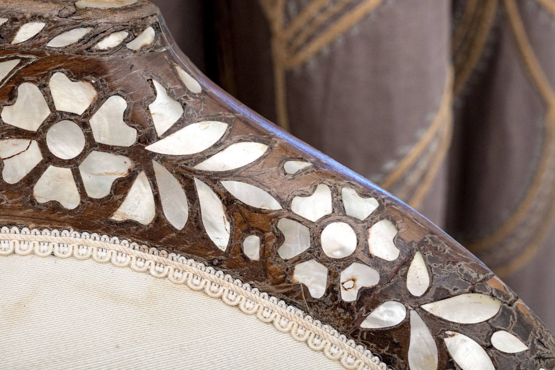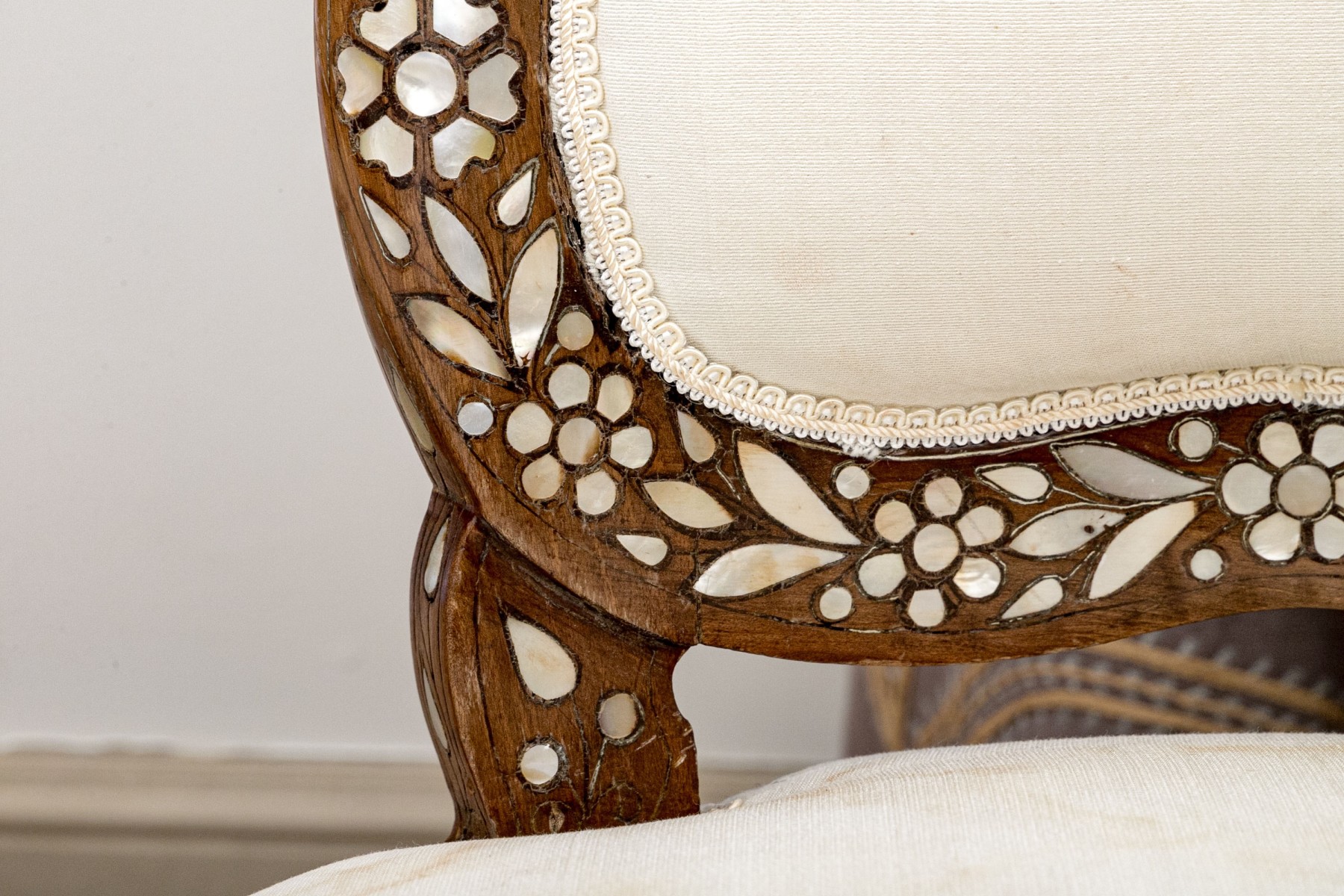 Balloon back serpentine seats, caster feet. Heavily decorated with mother of pearl inlay.