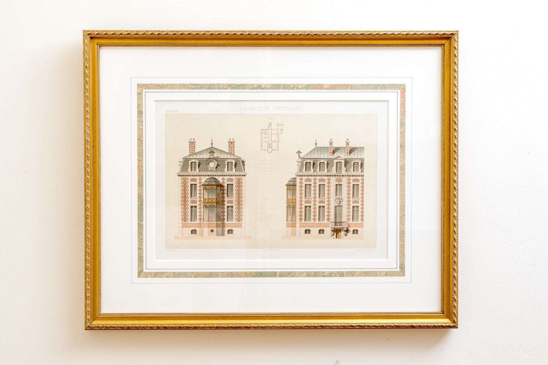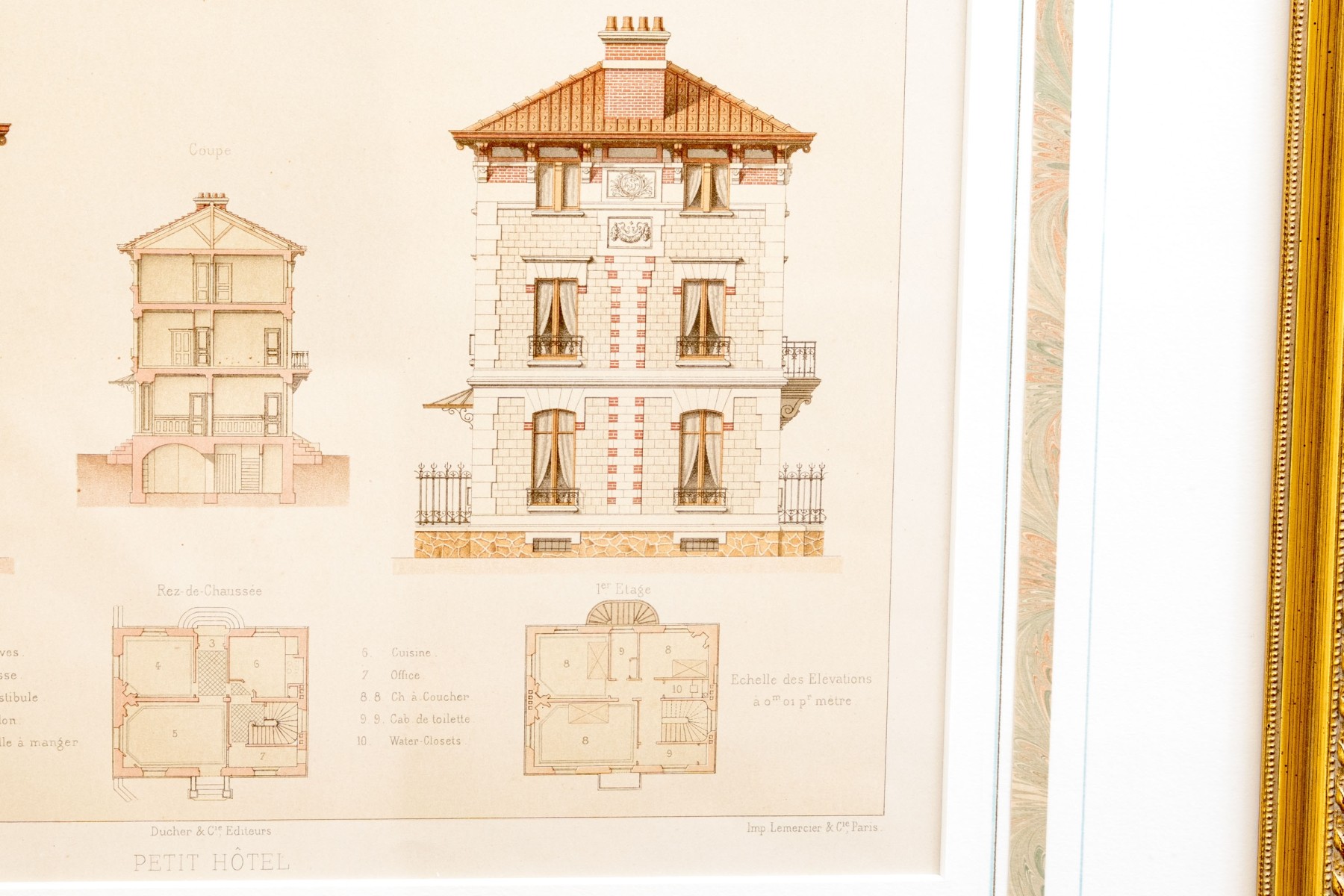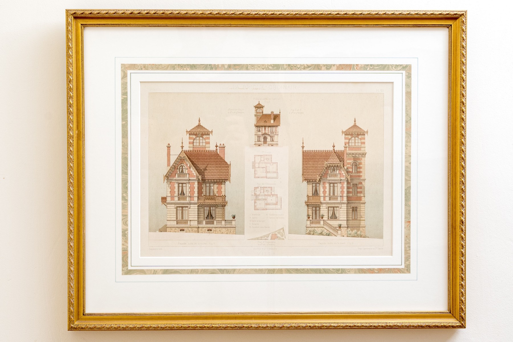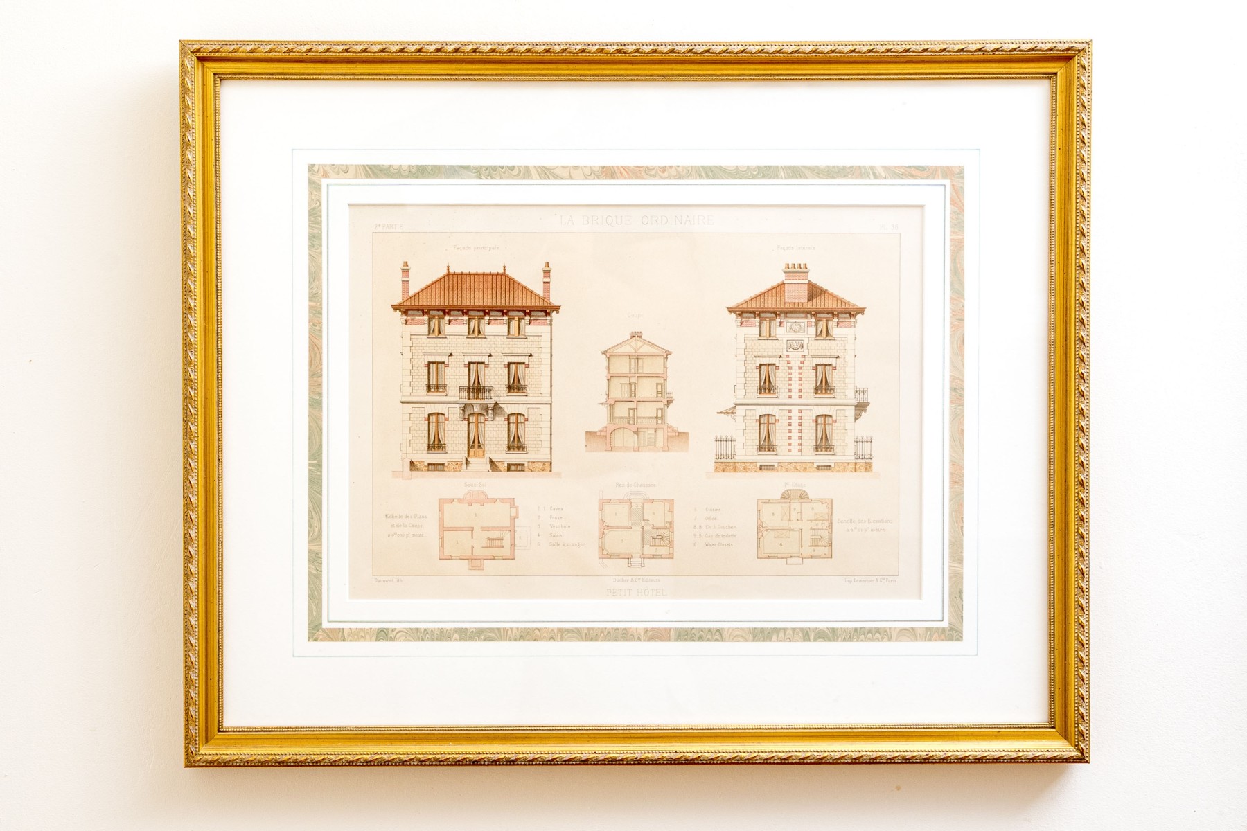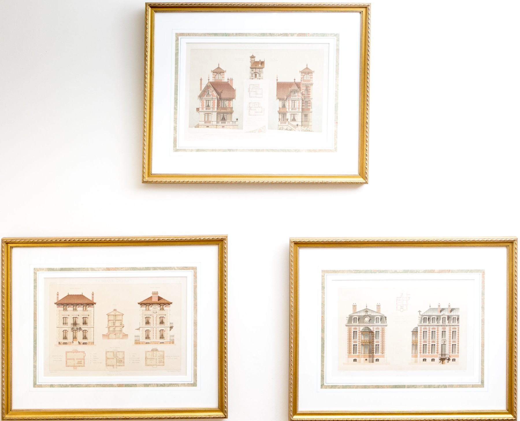 A delightful trio of lithographs in color depicting 19th century French maisons with house facades and floor plans. All displayed nicely matted in gilt frames with relief outer trims.