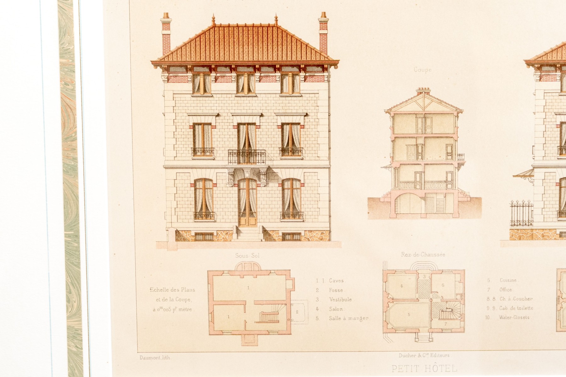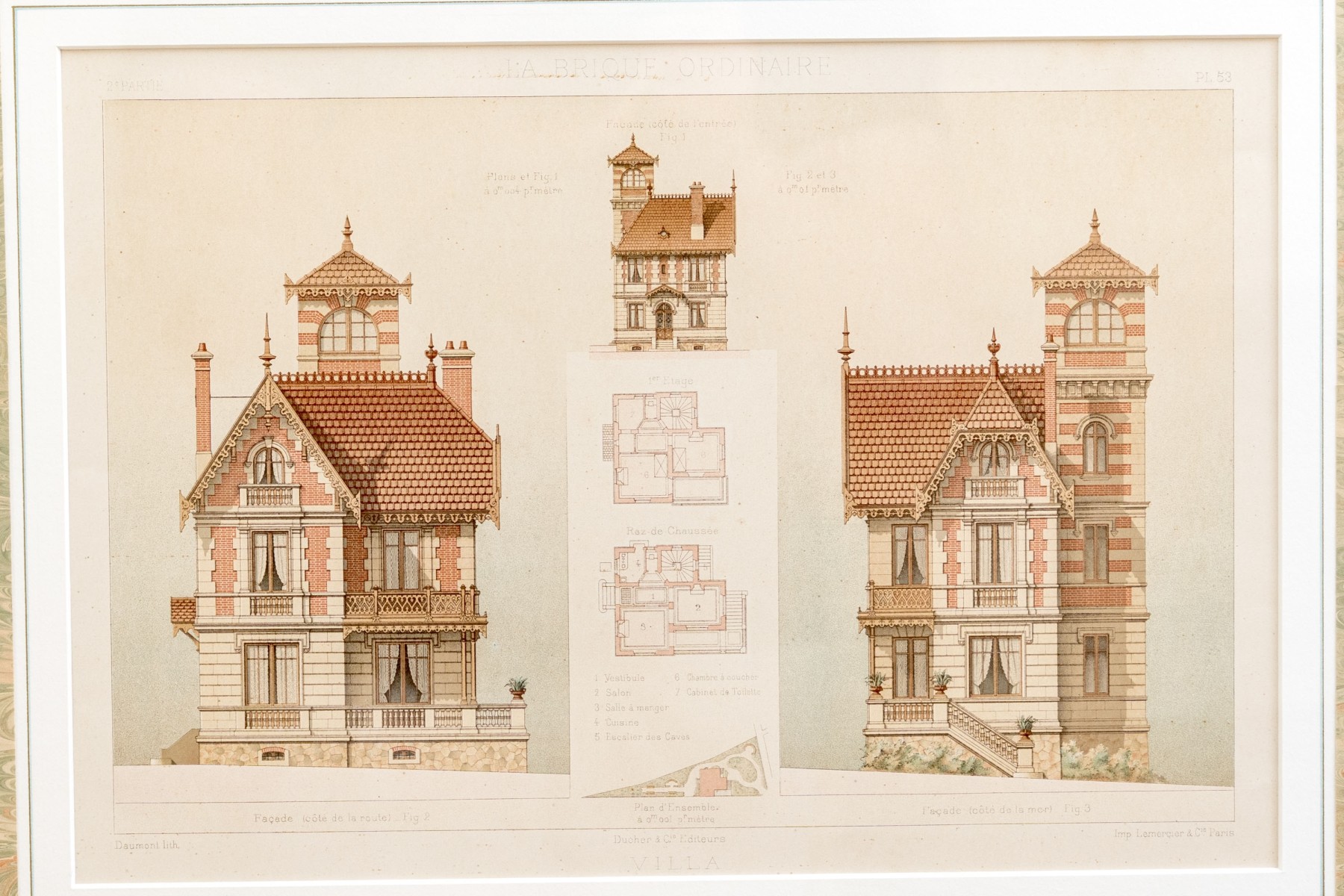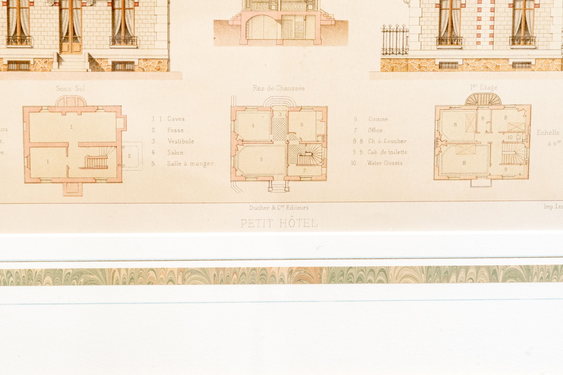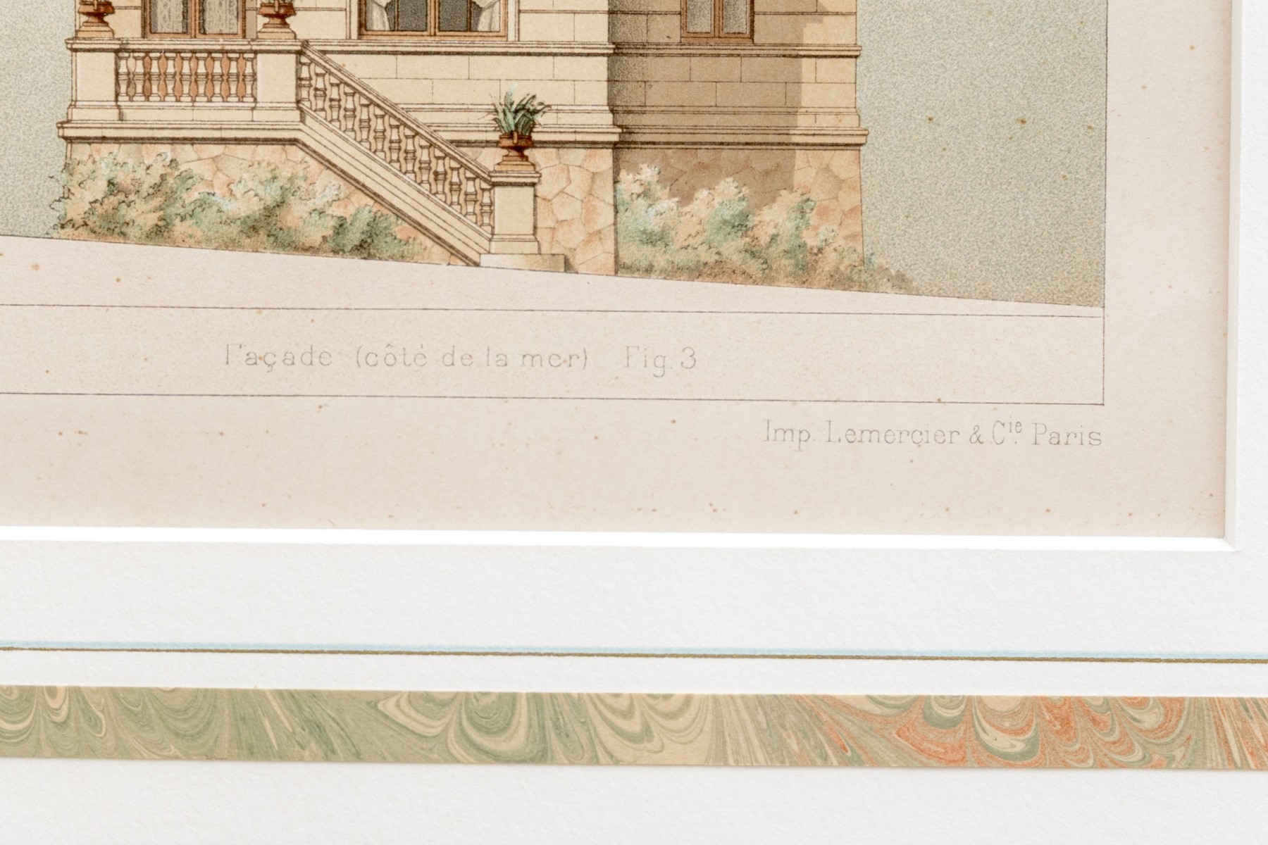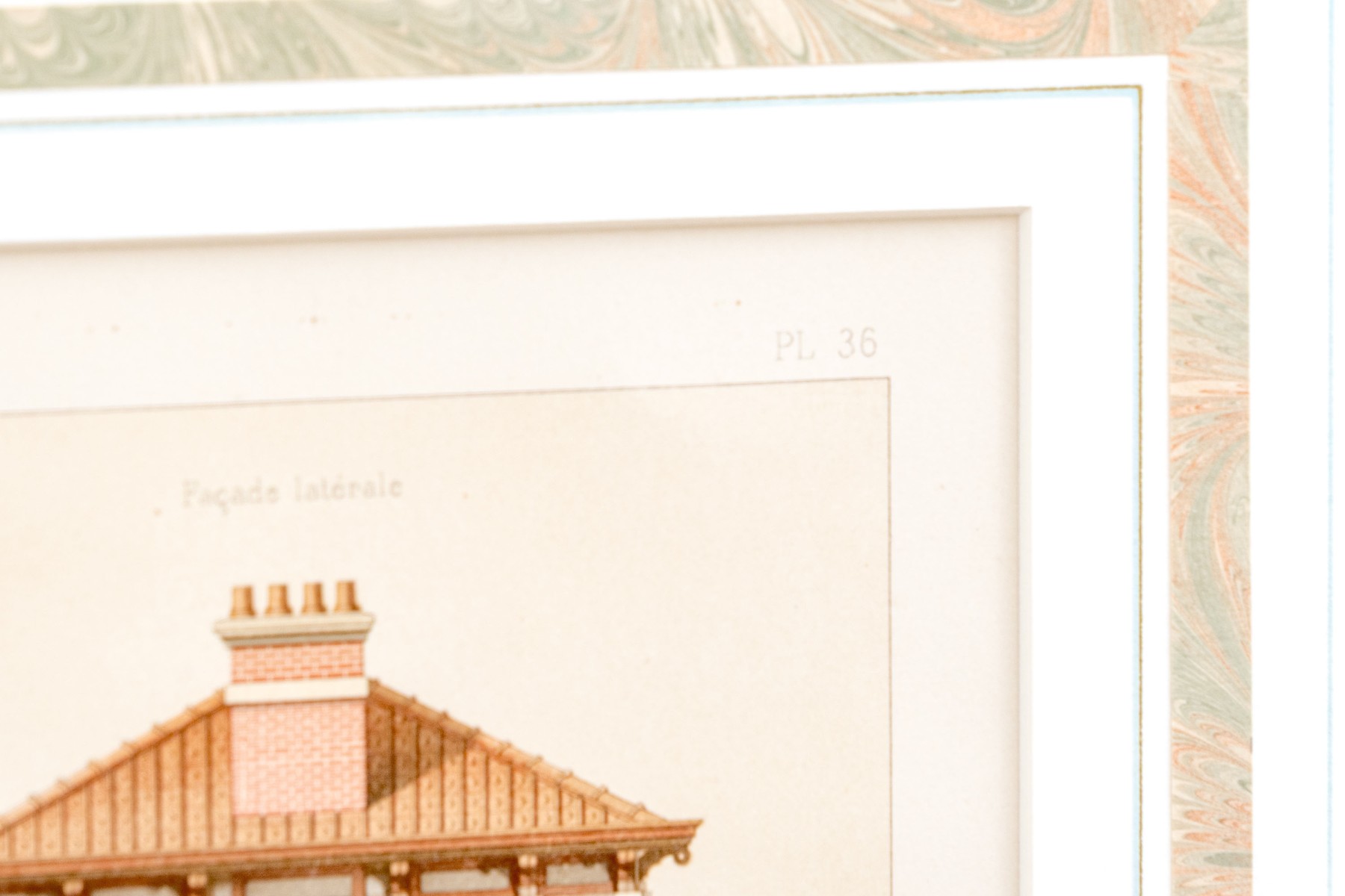 A delightful trio of lithographs in color depicting 19th century French maisons with house facades and floor plans. All displayed nicely matted in gilt frames with relief outer trims.