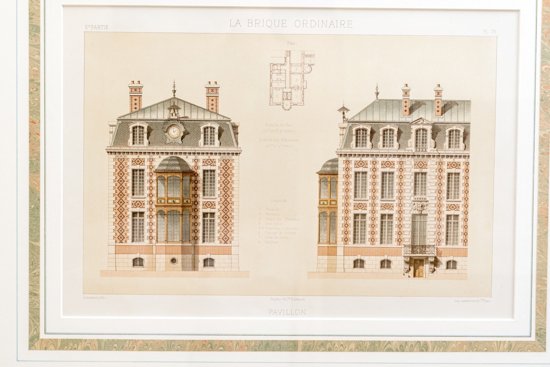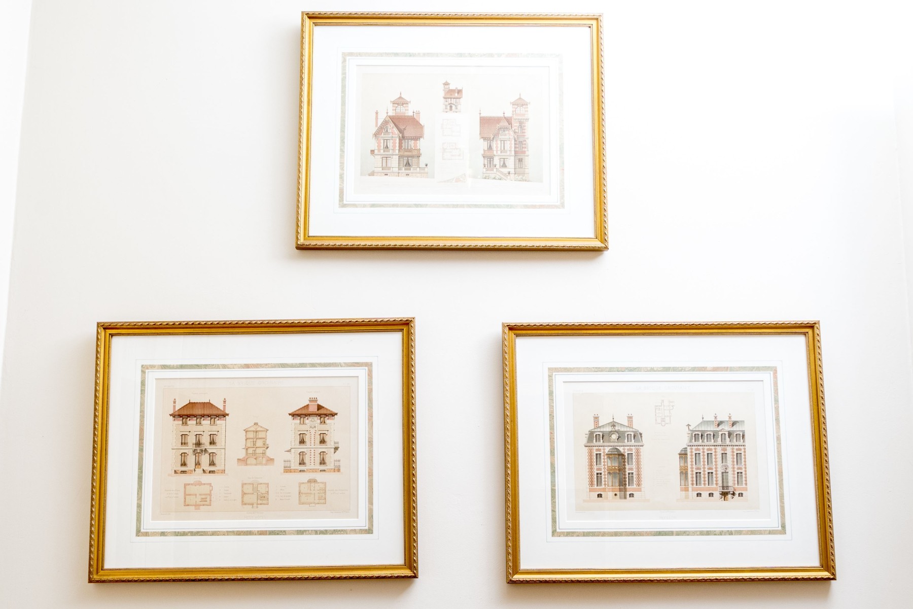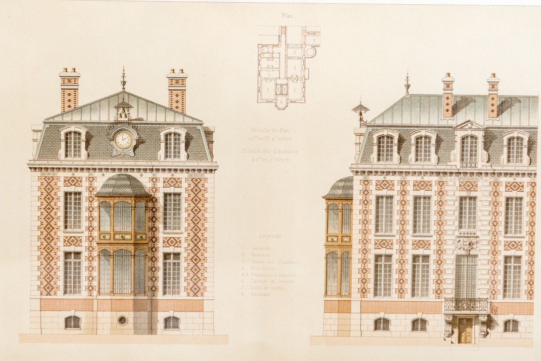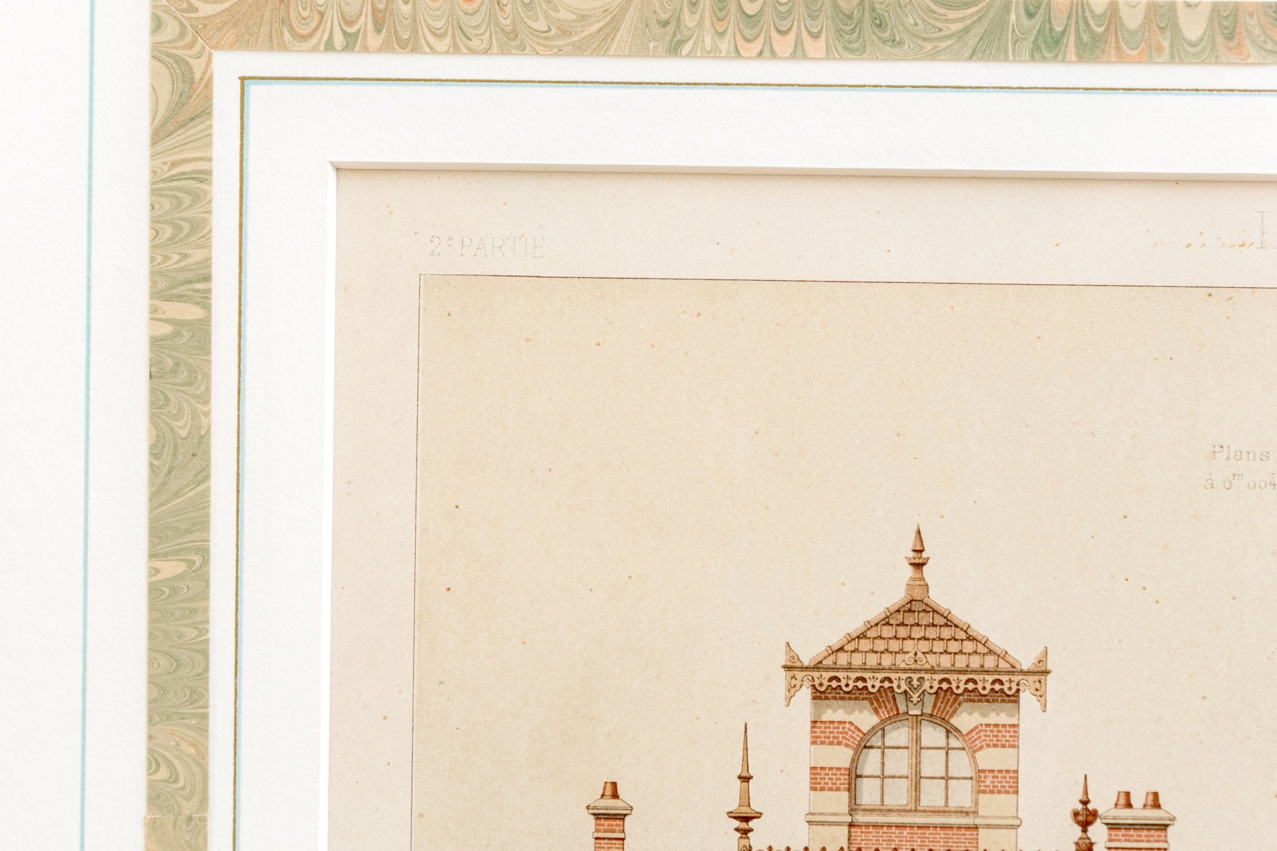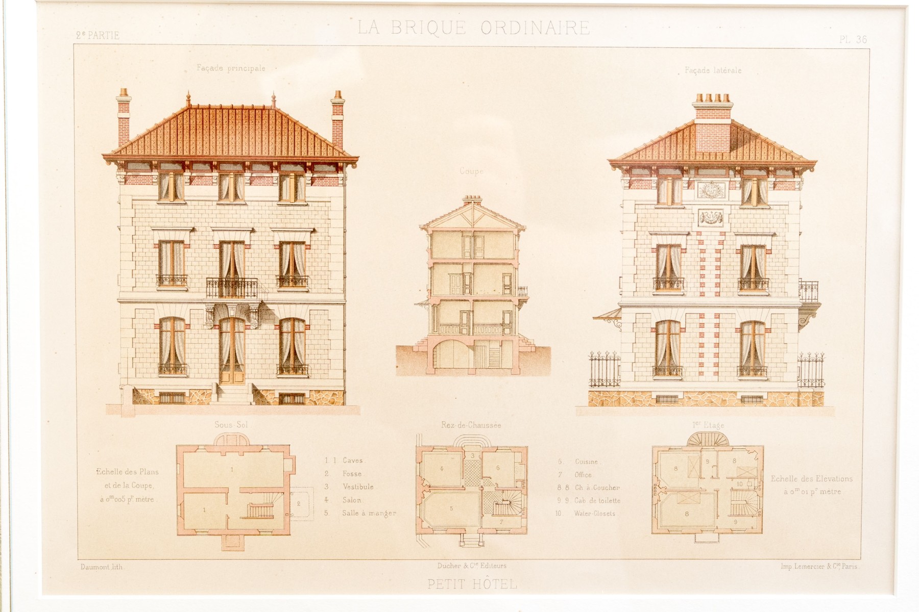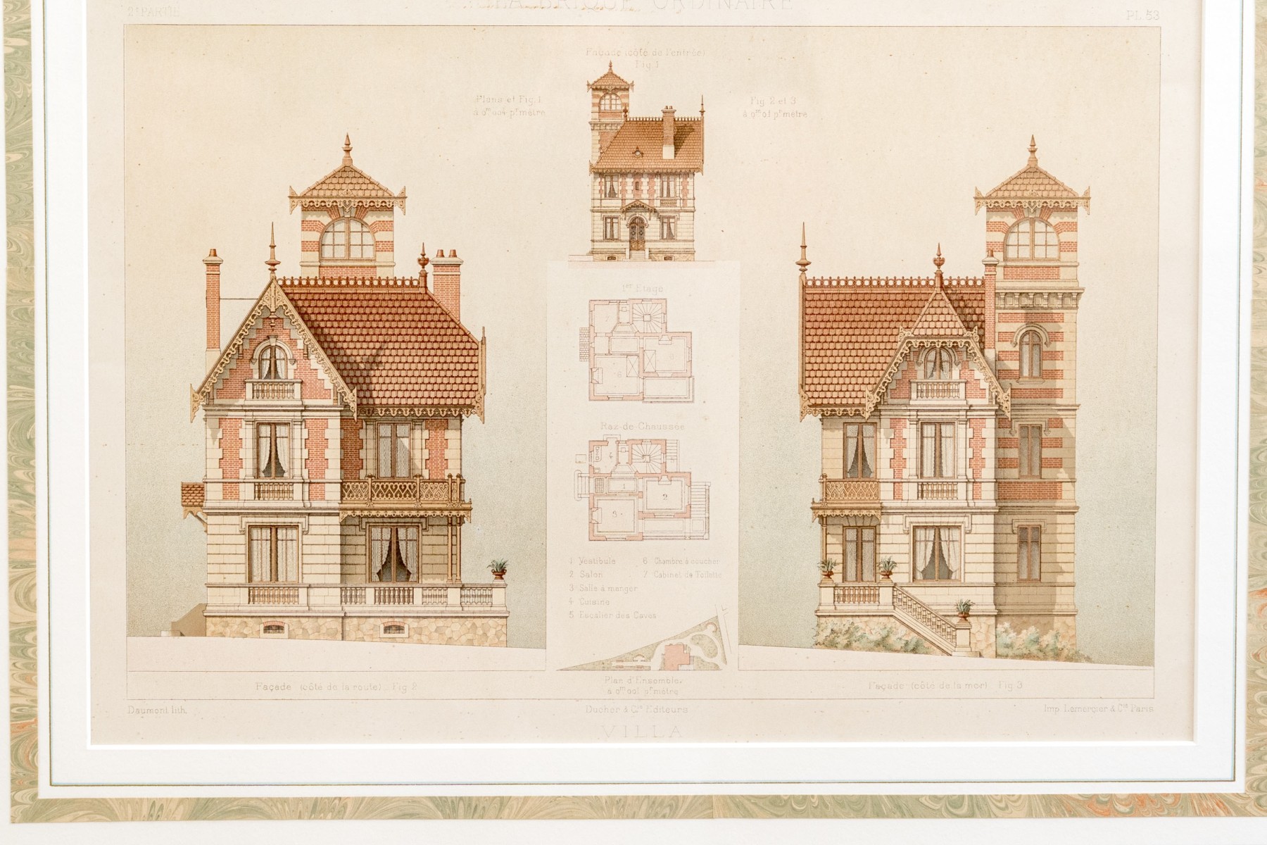 A delightful trio of lithographs in color depicting 19th century French maisons with house facades and floor plans. All displayed nicely matted in gilt frames with relief outer trims.