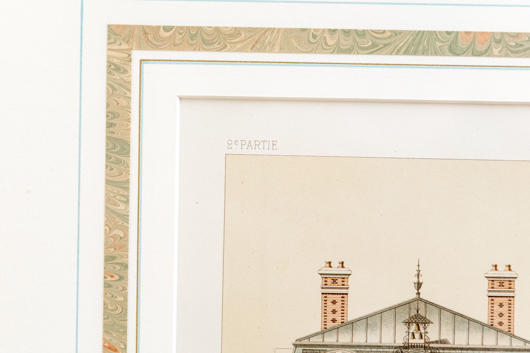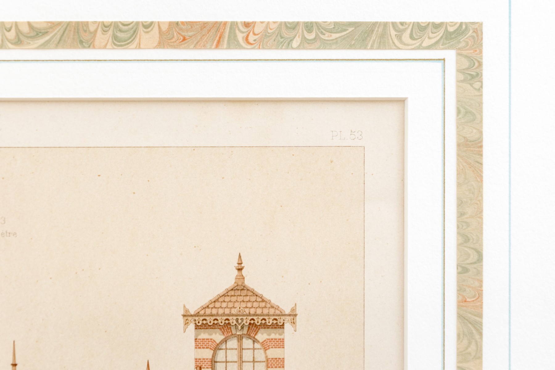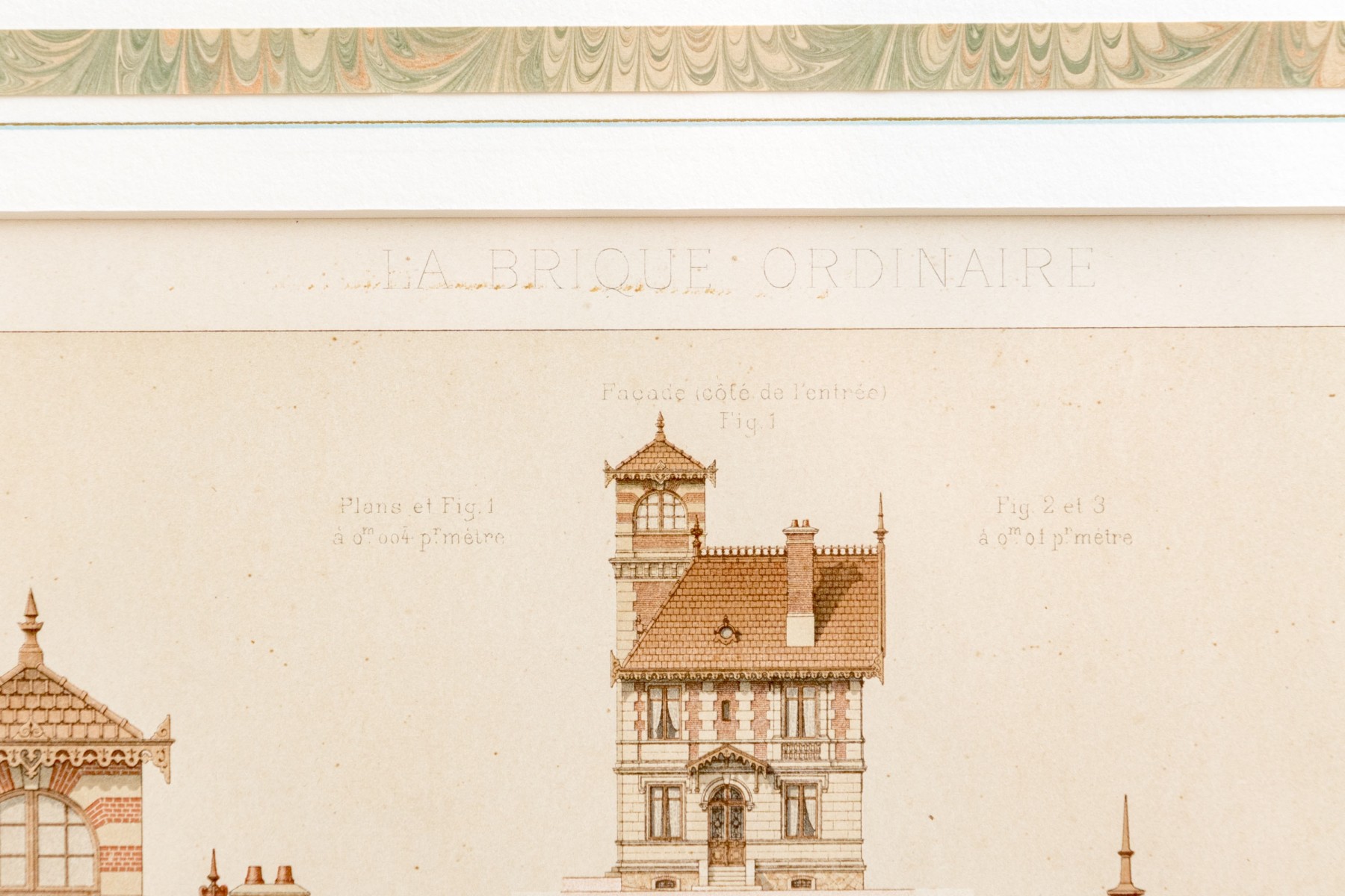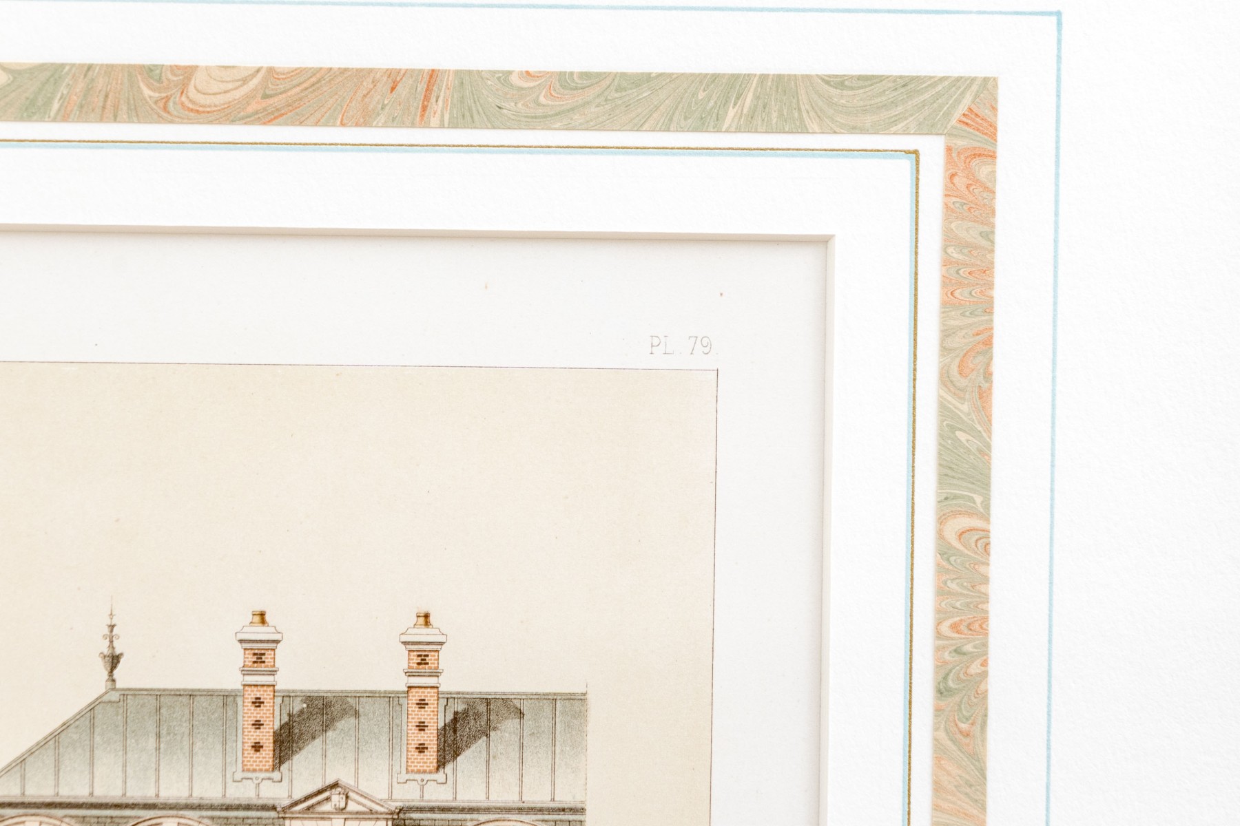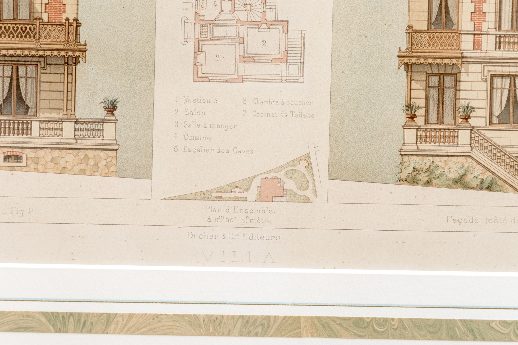 A delightful trio of lithographs in color depicting 19th century French maisons with house facades and floor plans. All displayed nicely matted in gilt frames with relief outer trims.