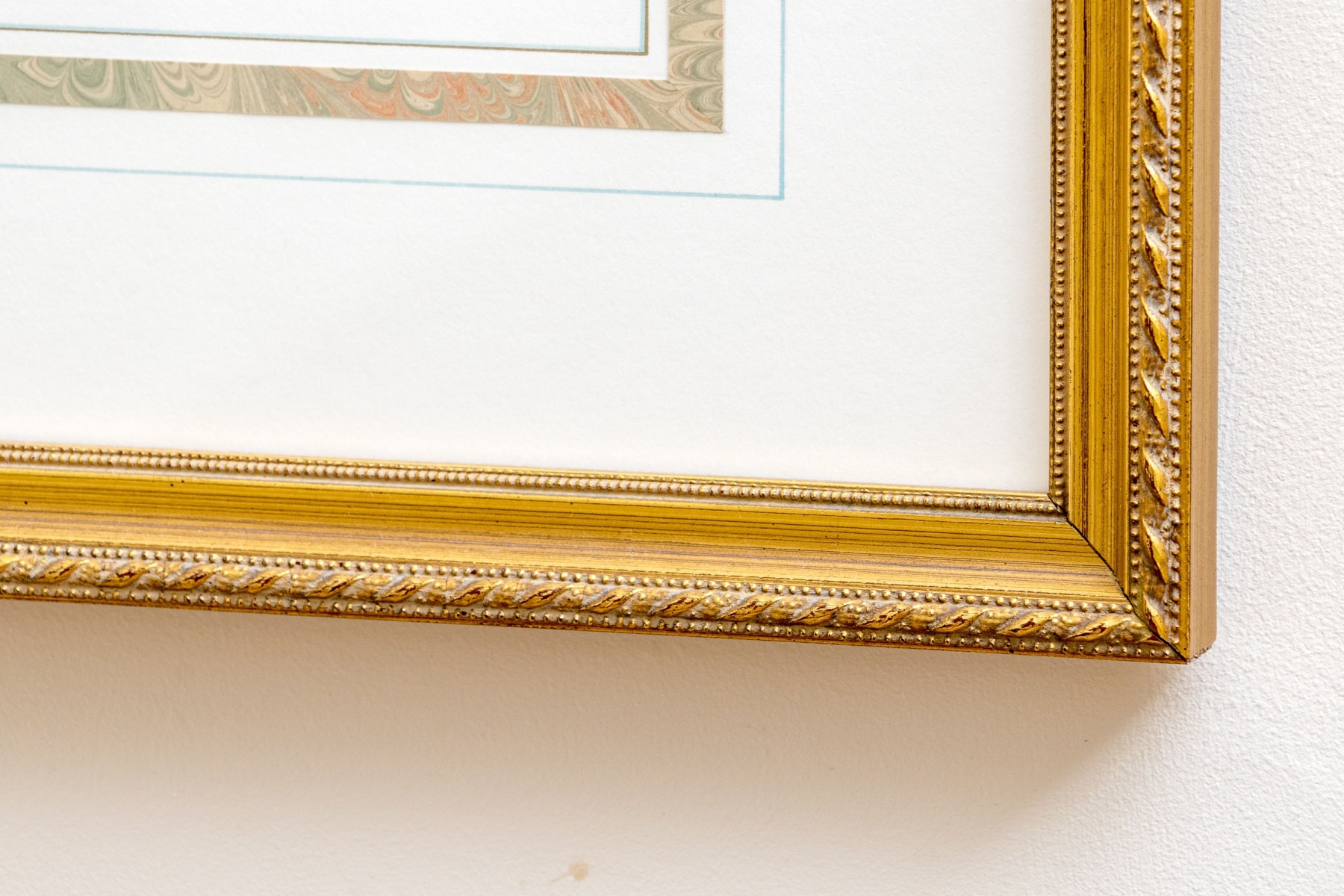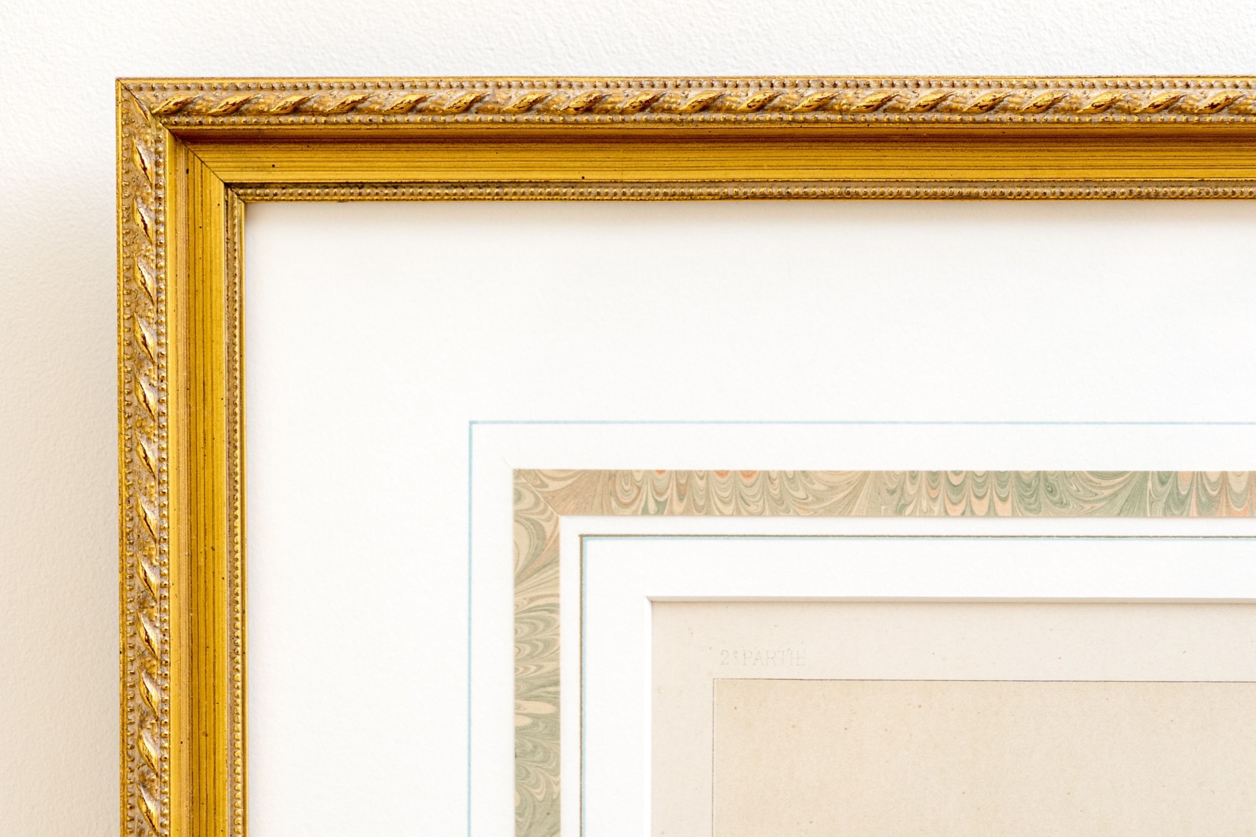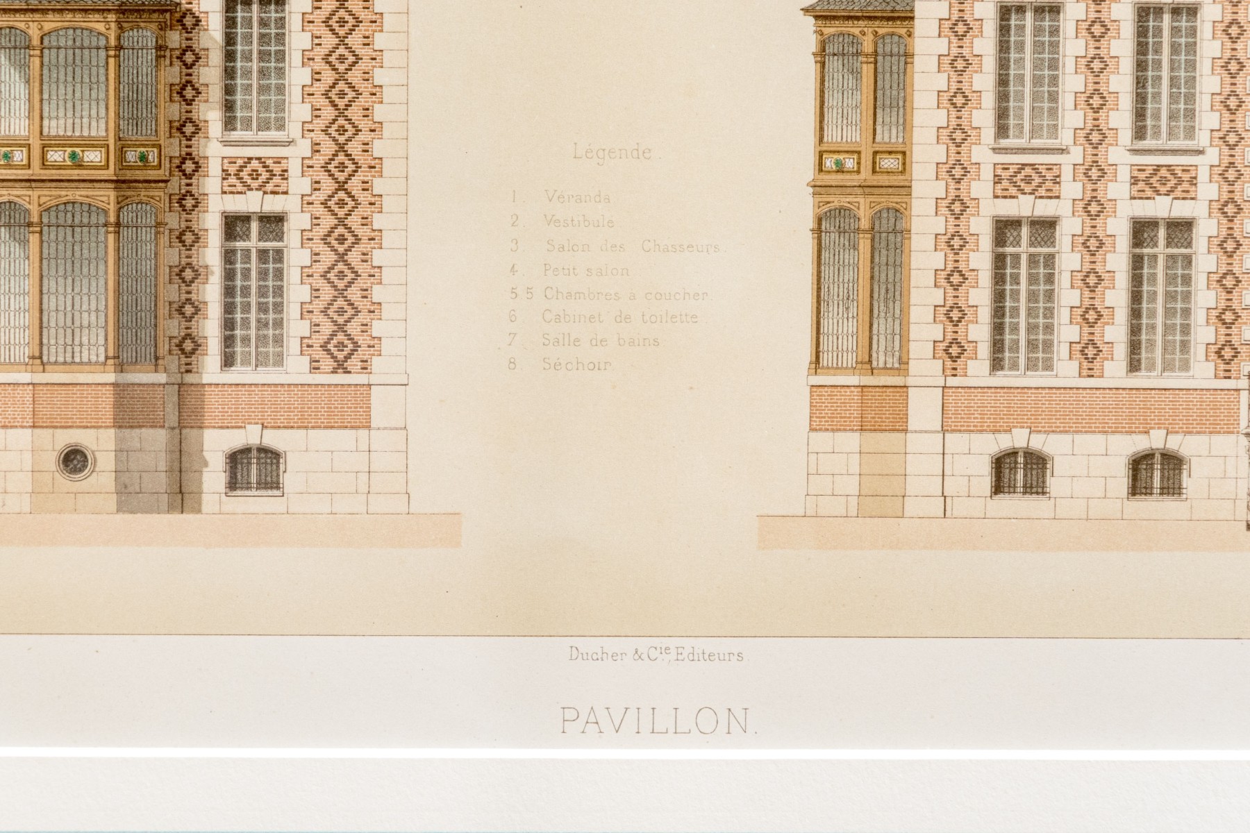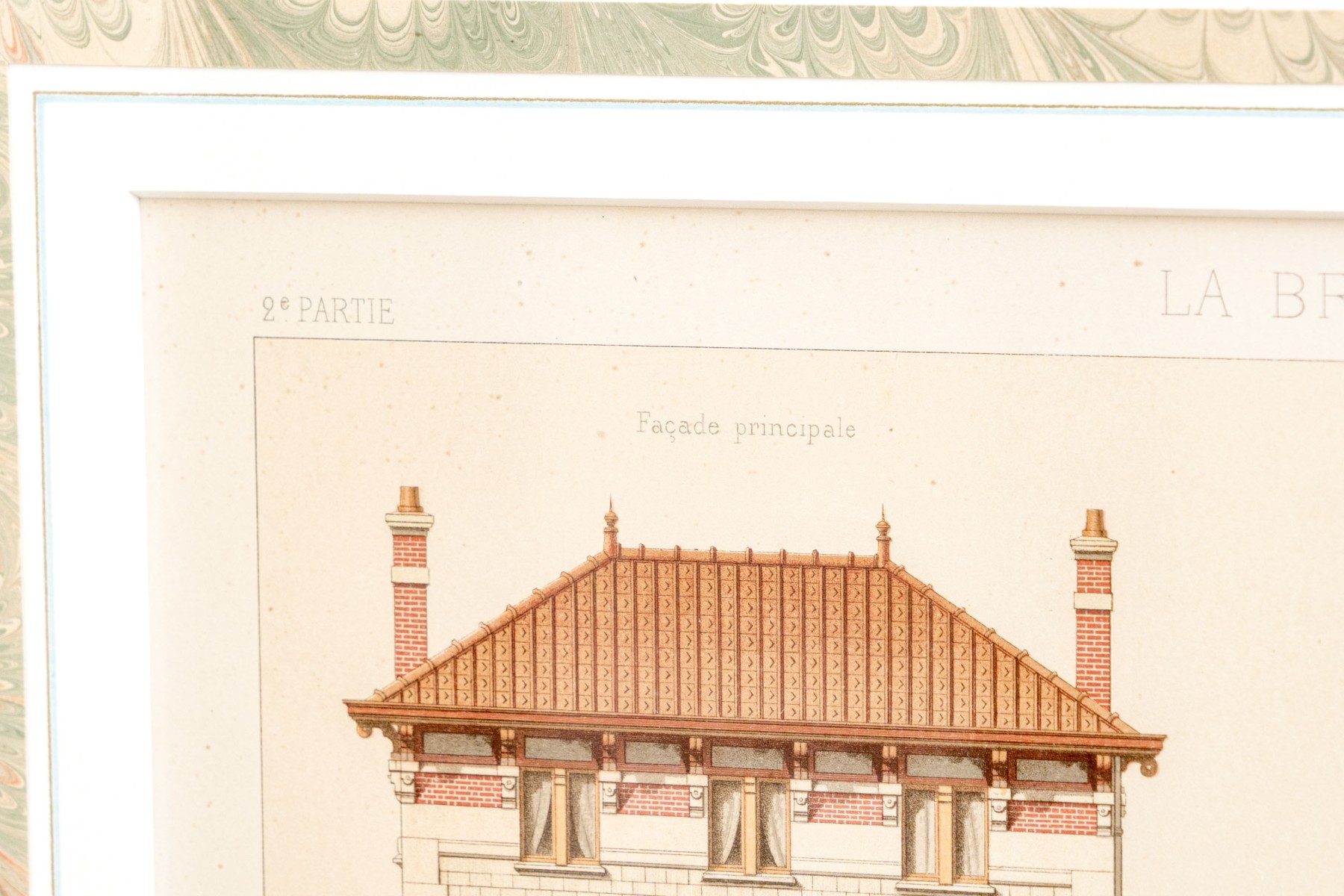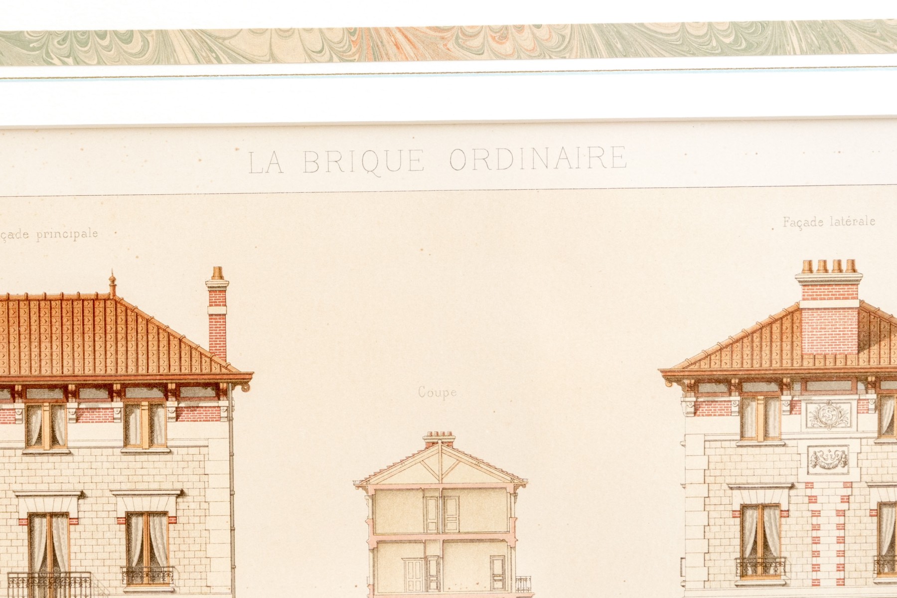 A delightful trio of lithographs in color depicting 19th century French maisons with house facades and floor plans. All displayed nicely matted in gilt frames with relief outer trims.