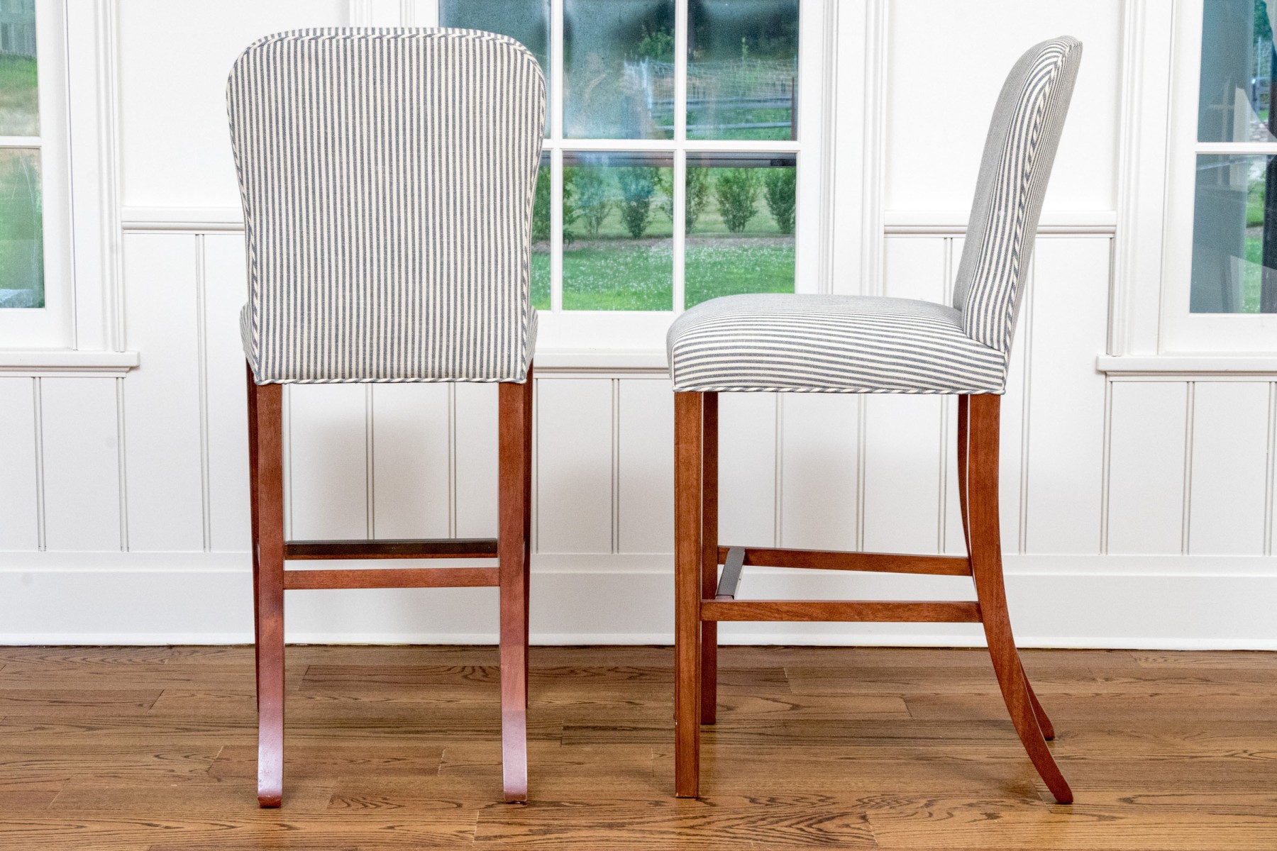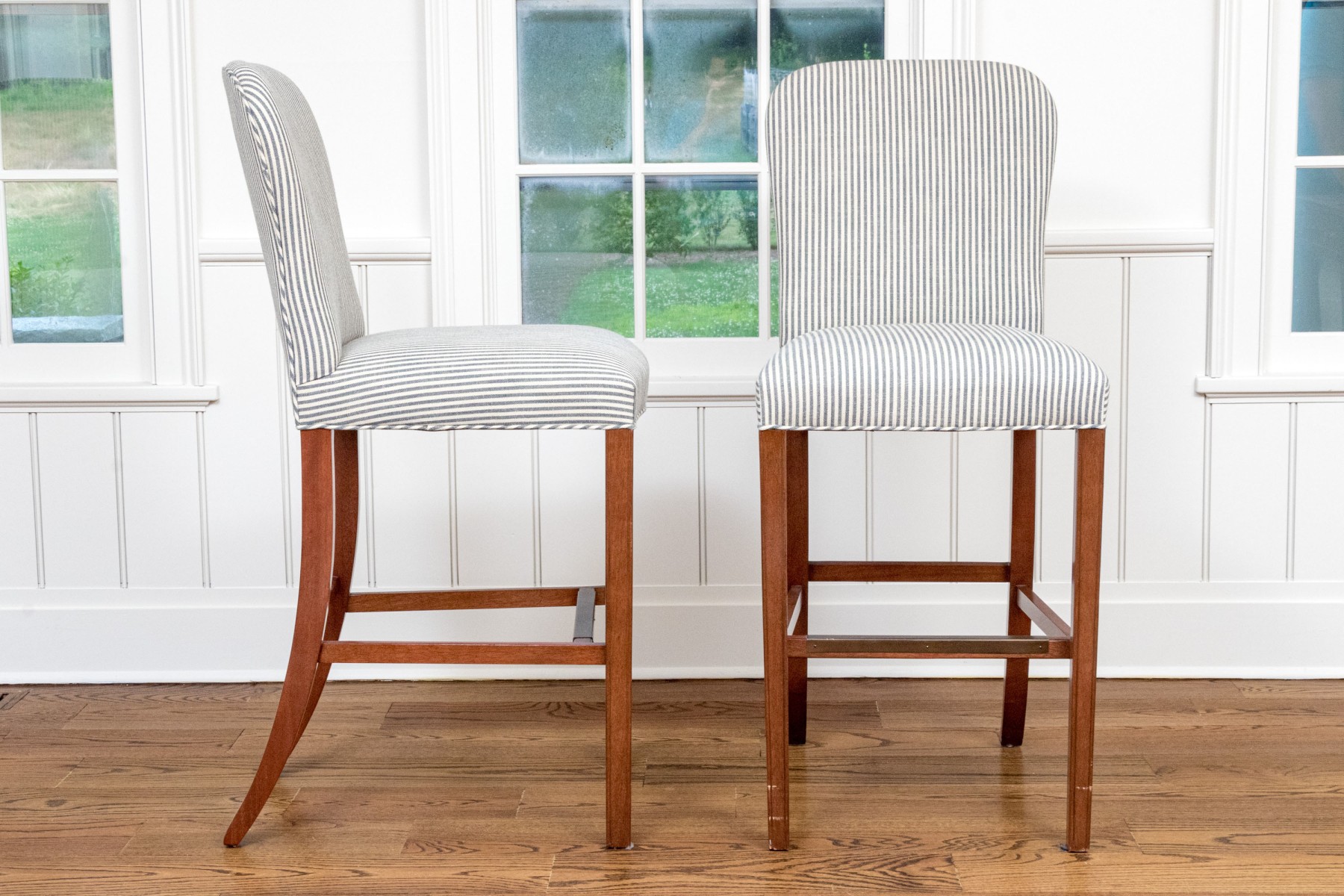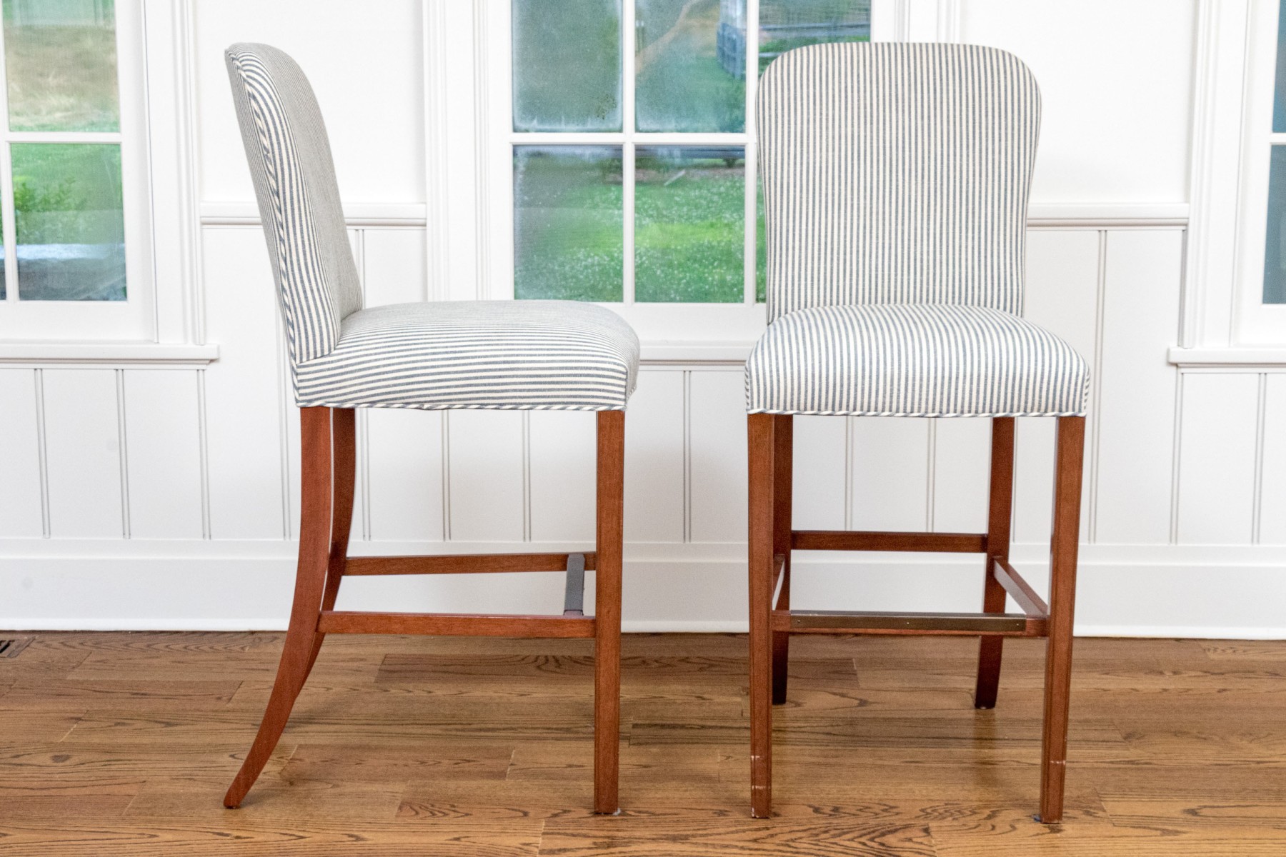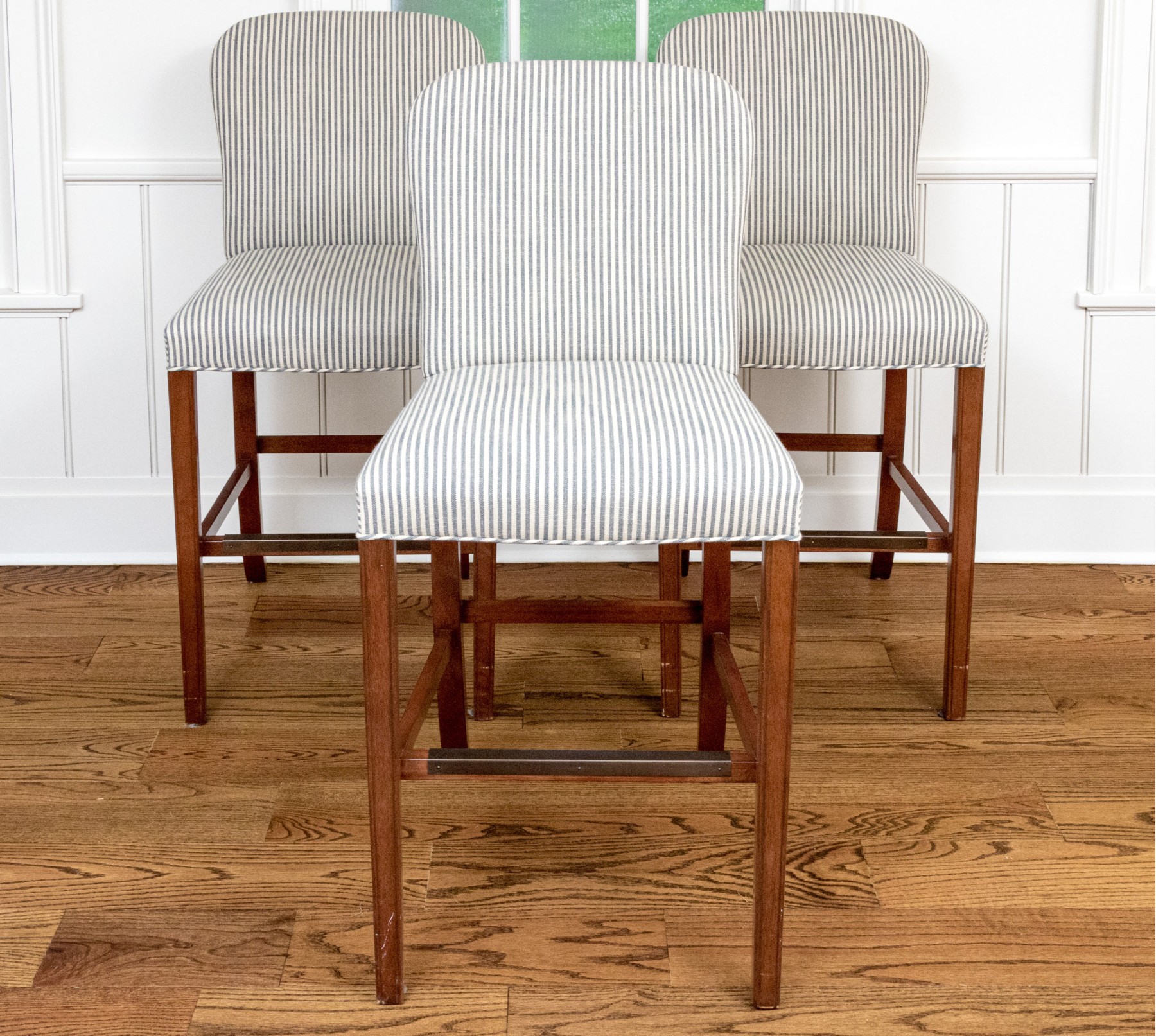 Striped upholstery on well carved wood frames with stretcher supports with brass mounts for footing.