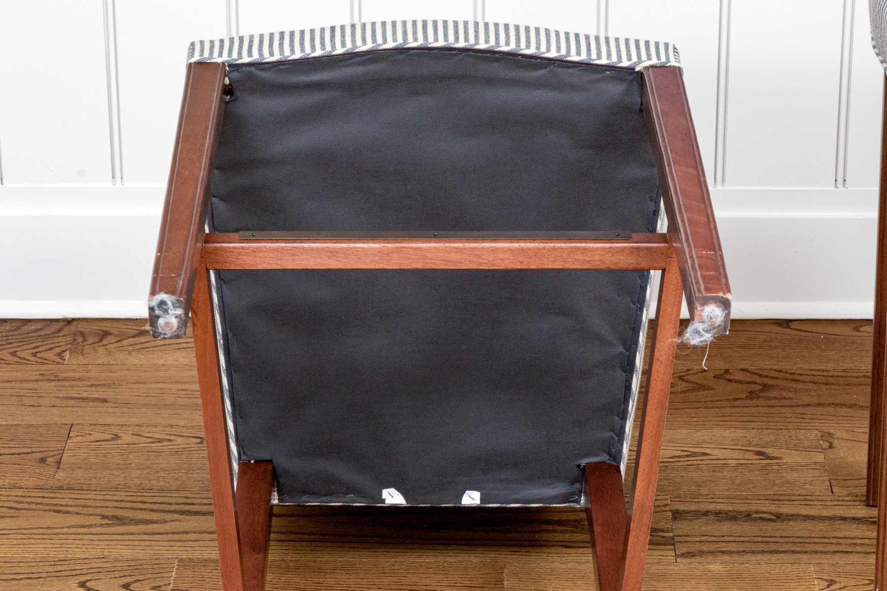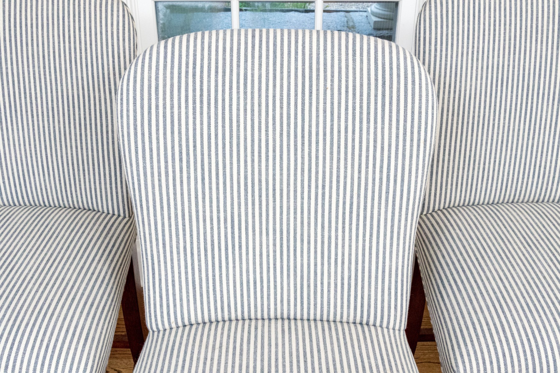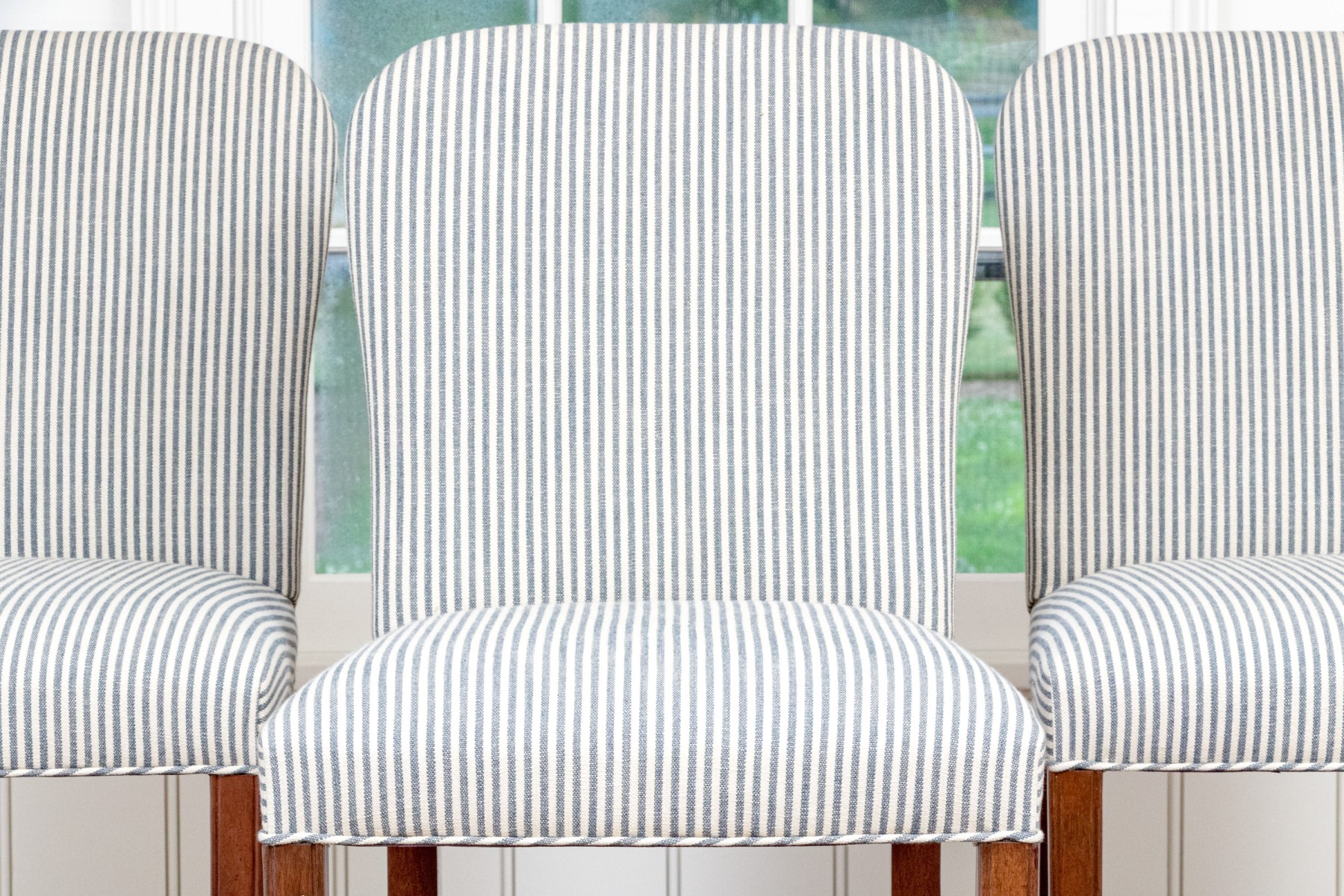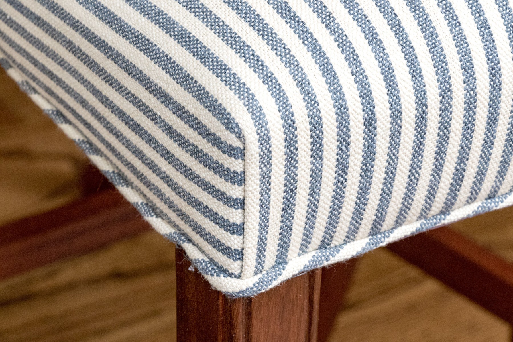 Striped upholstery on well carved wood frames with stretcher supports with brass mounts for footing.
