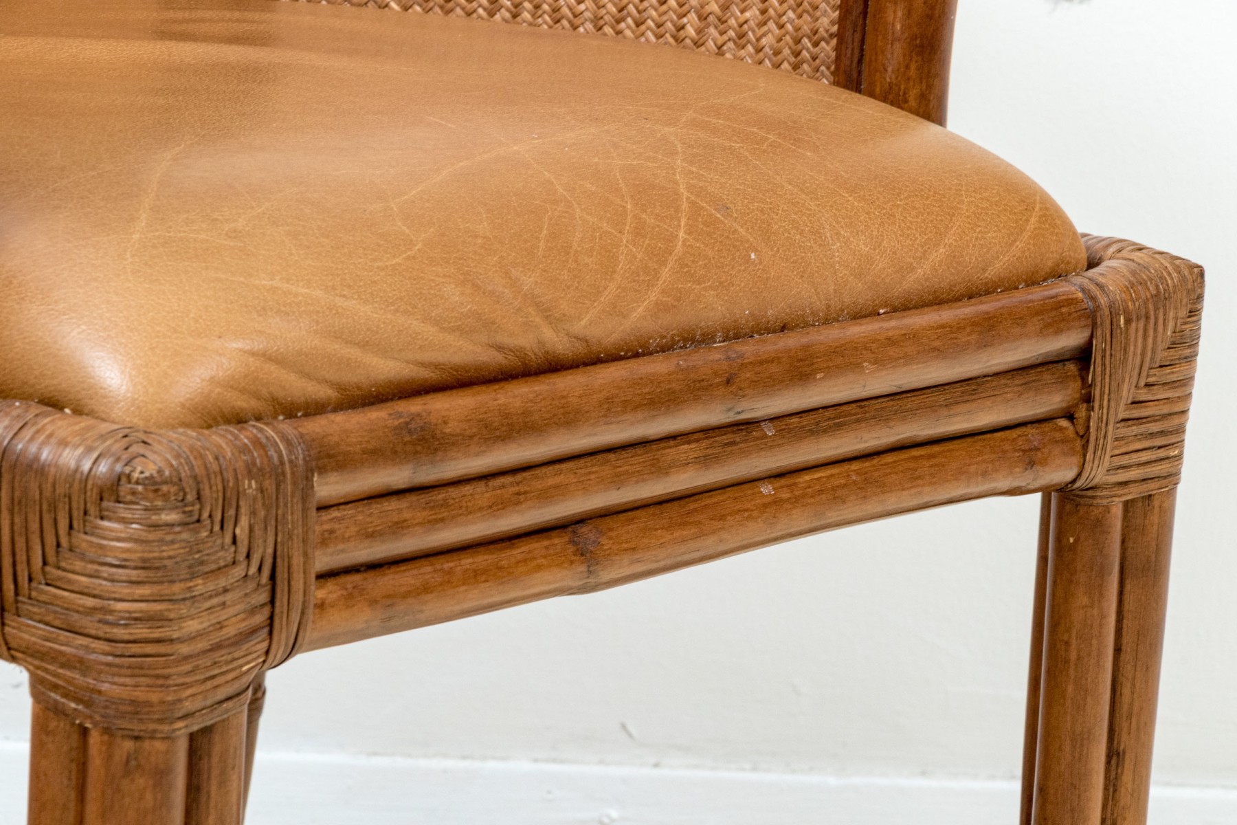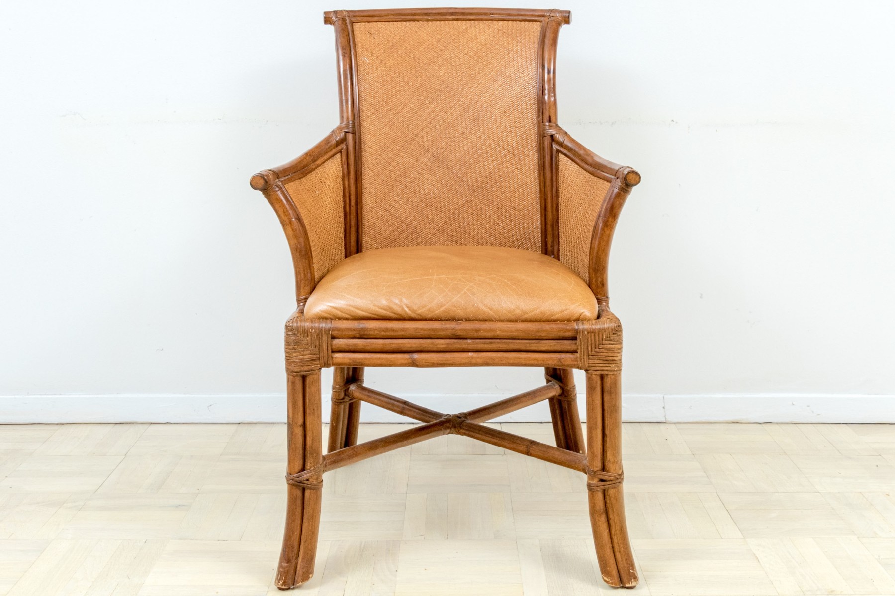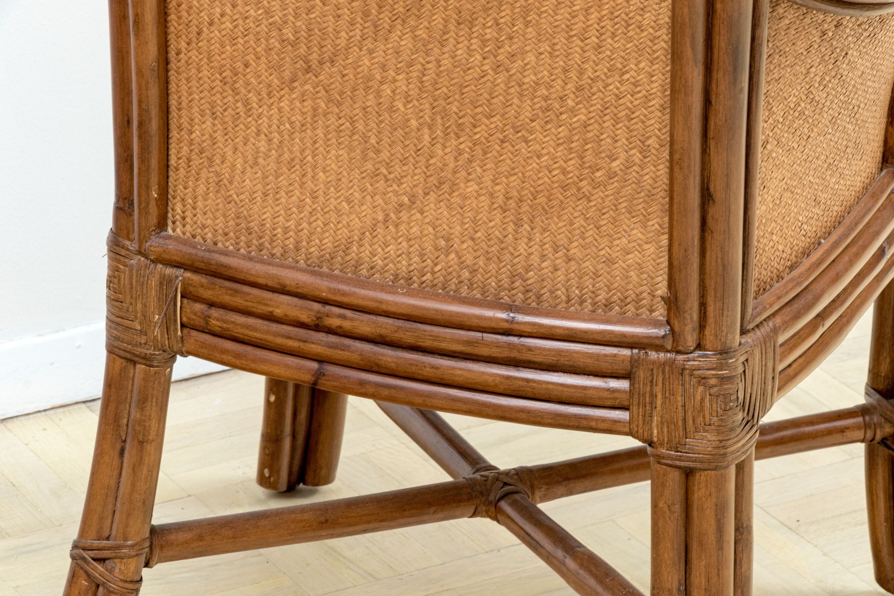 Each on carved wood faux bamboo and rattan woven framed armchairs with upholstered seats and rattan woven seat backs