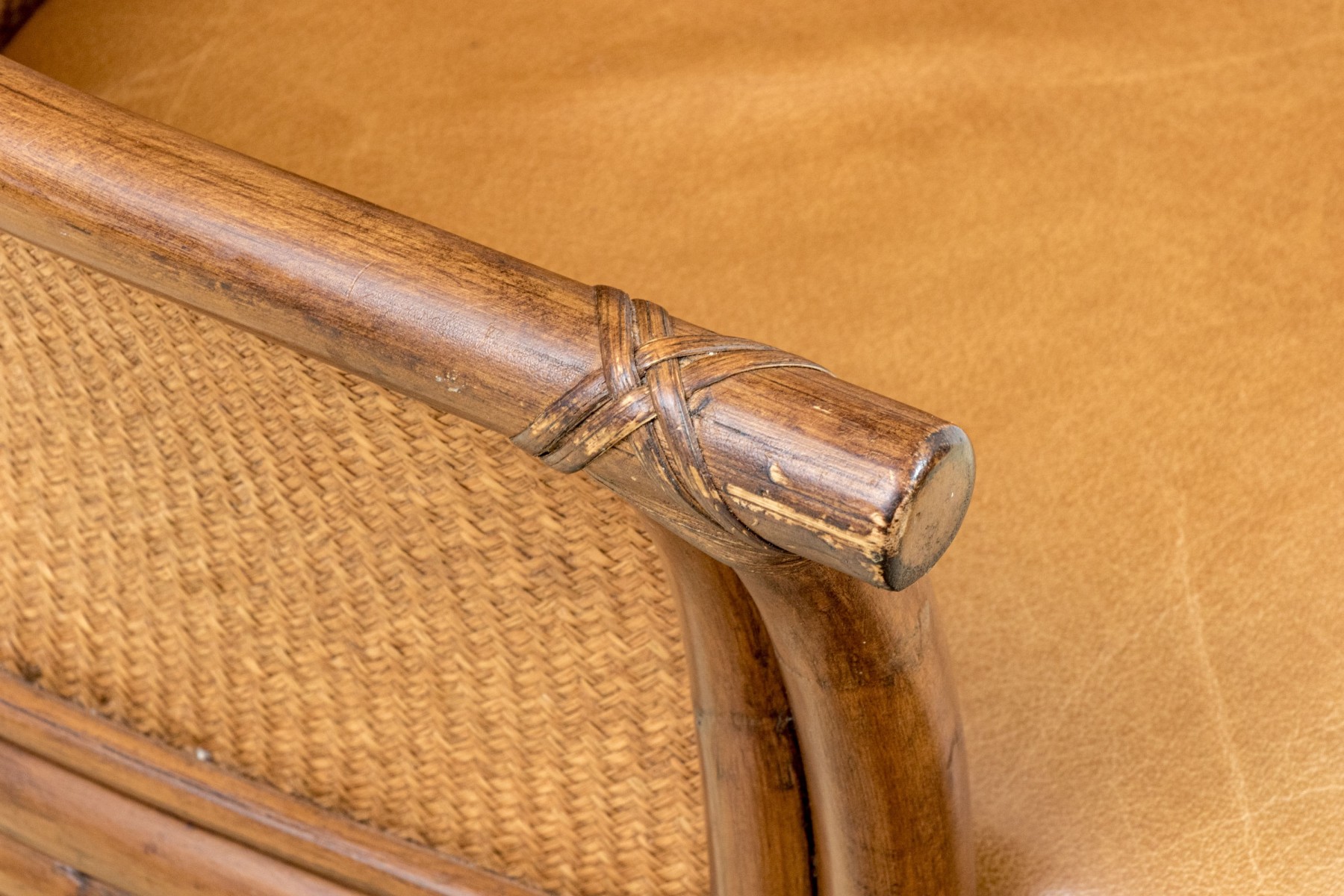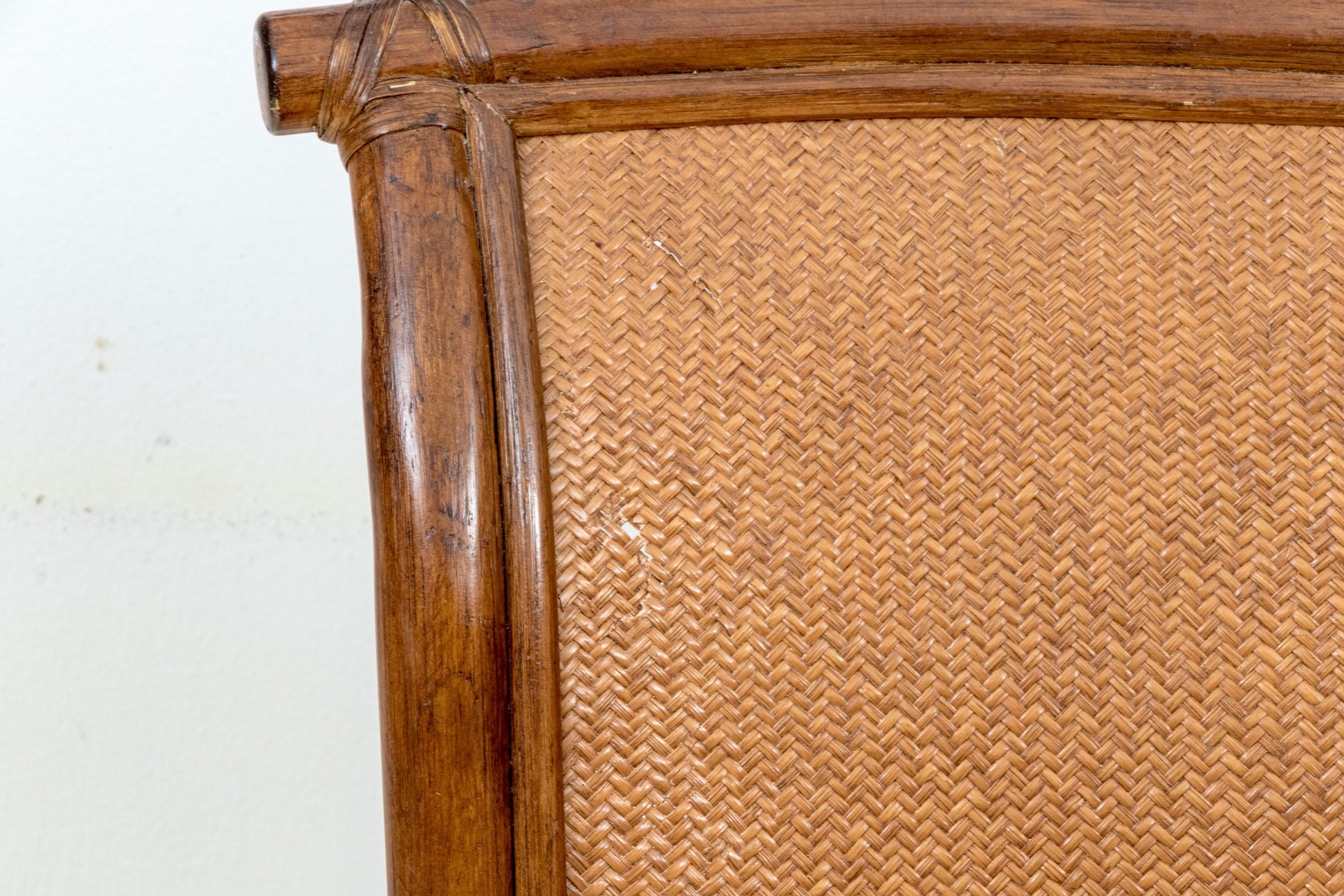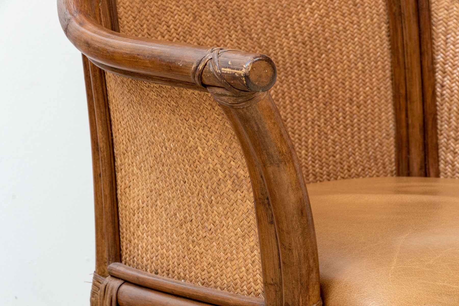 Each on carved wood faux bamboo and rattan woven framed armchairs with upholstered seats and rattan woven seat backs
