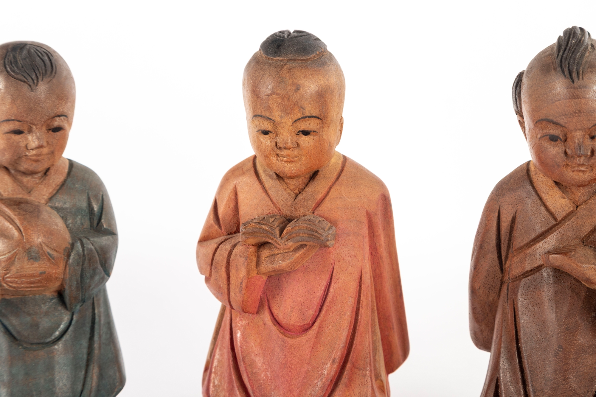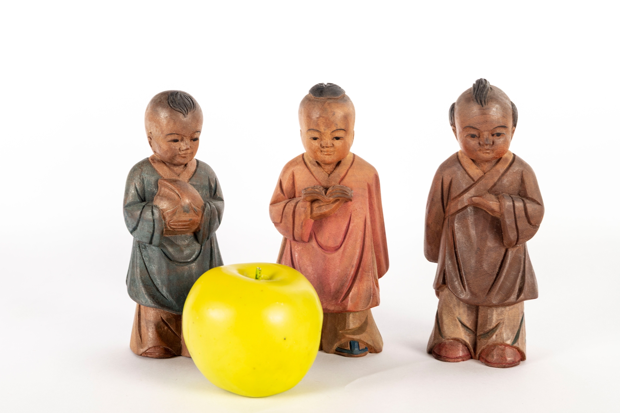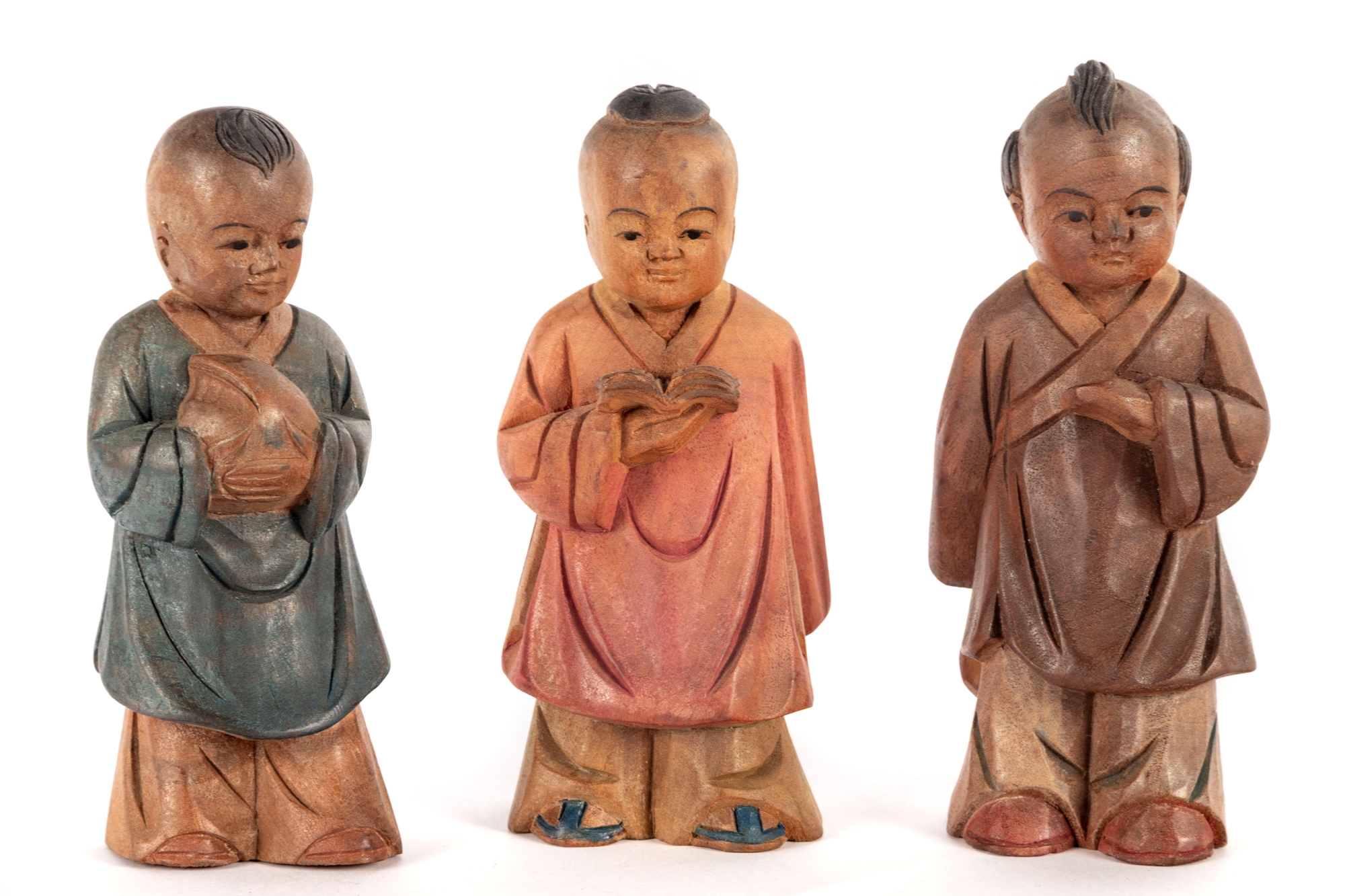 A charming trio of hand-carved and hand-painted wooden figures depicting young monks or scholars, each adorned in traditional robes in shades of blue, red, and brown. Each figure is uniquely posed including one holding a scroll, another a book, and the third with hands clasped in gesture.