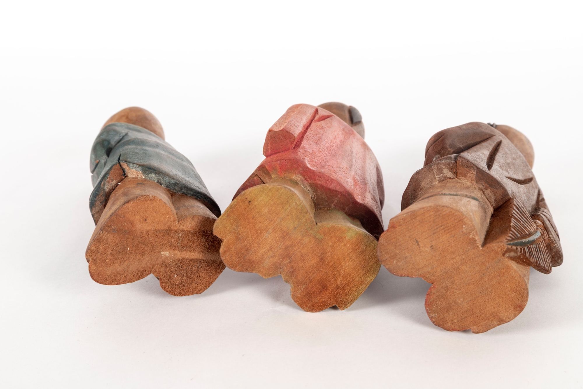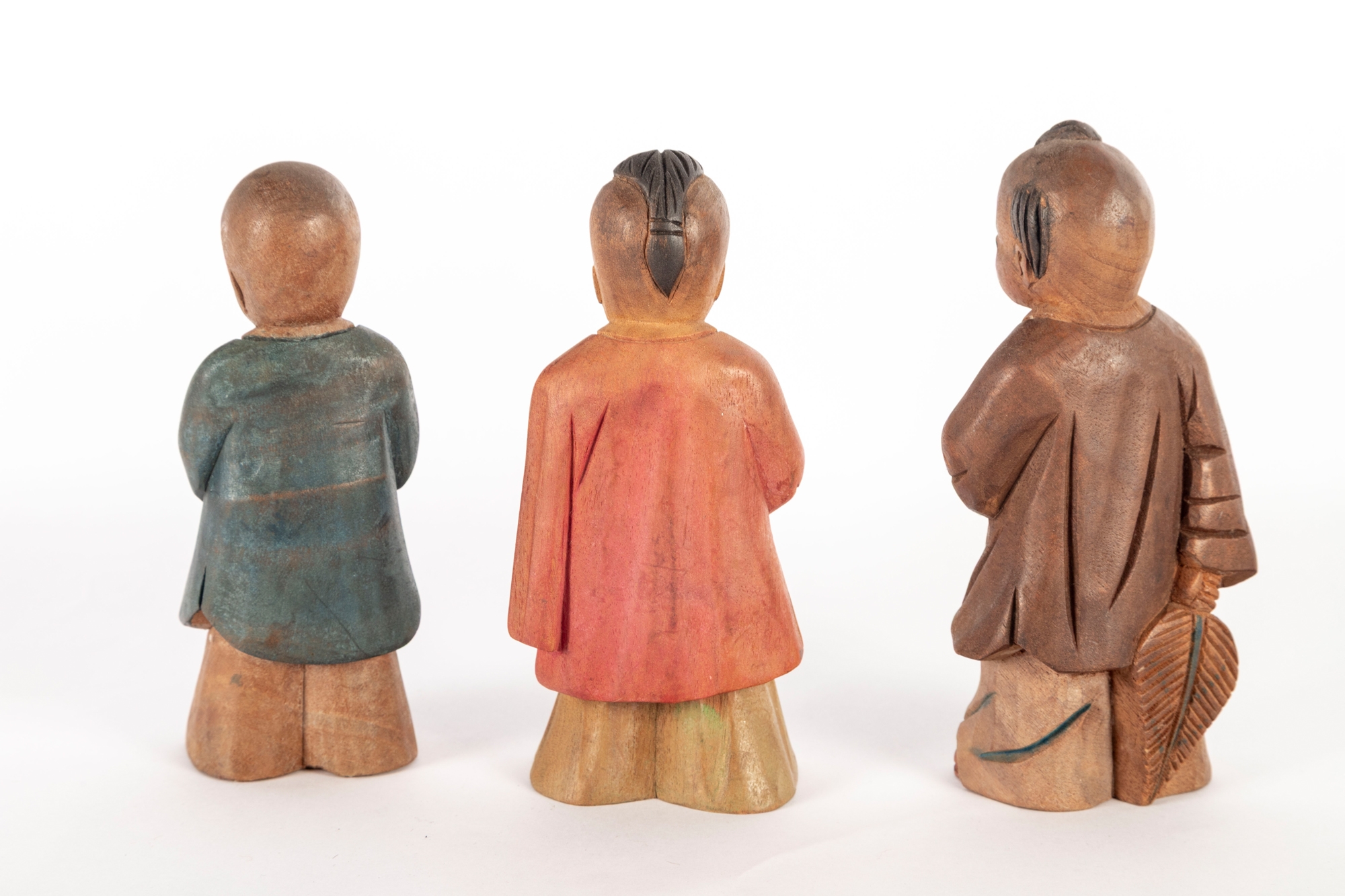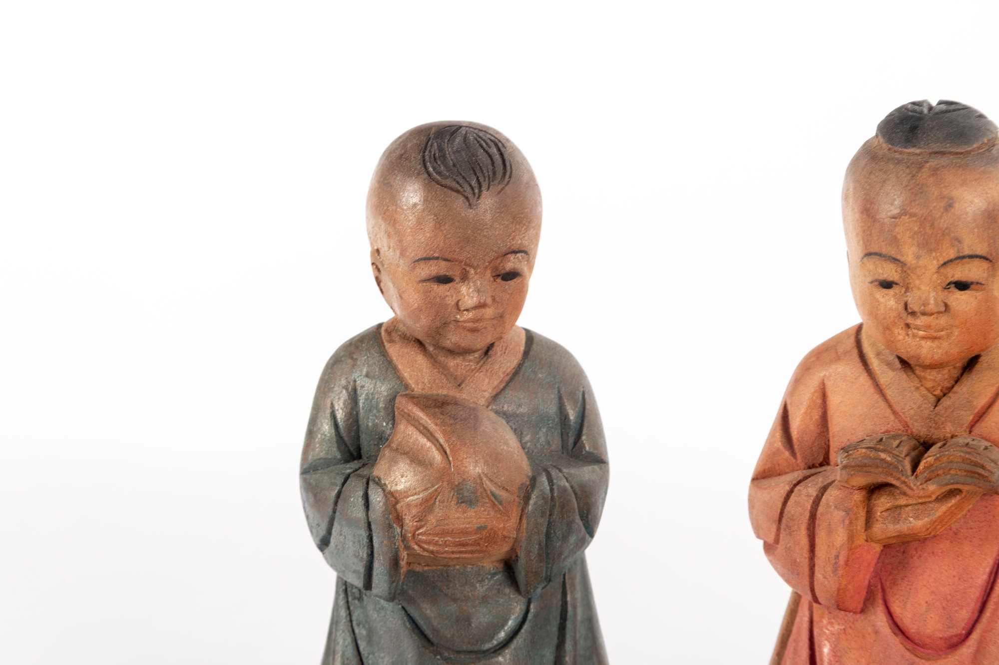 A charming trio of hand-carved and hand-painted wooden figures depicting young monks or scholars, each adorned in traditional robes in shades of blue, red, and brown. Each figure is uniquely posed including one holding a scroll, another a book, and the third with hands clasped in gesture.