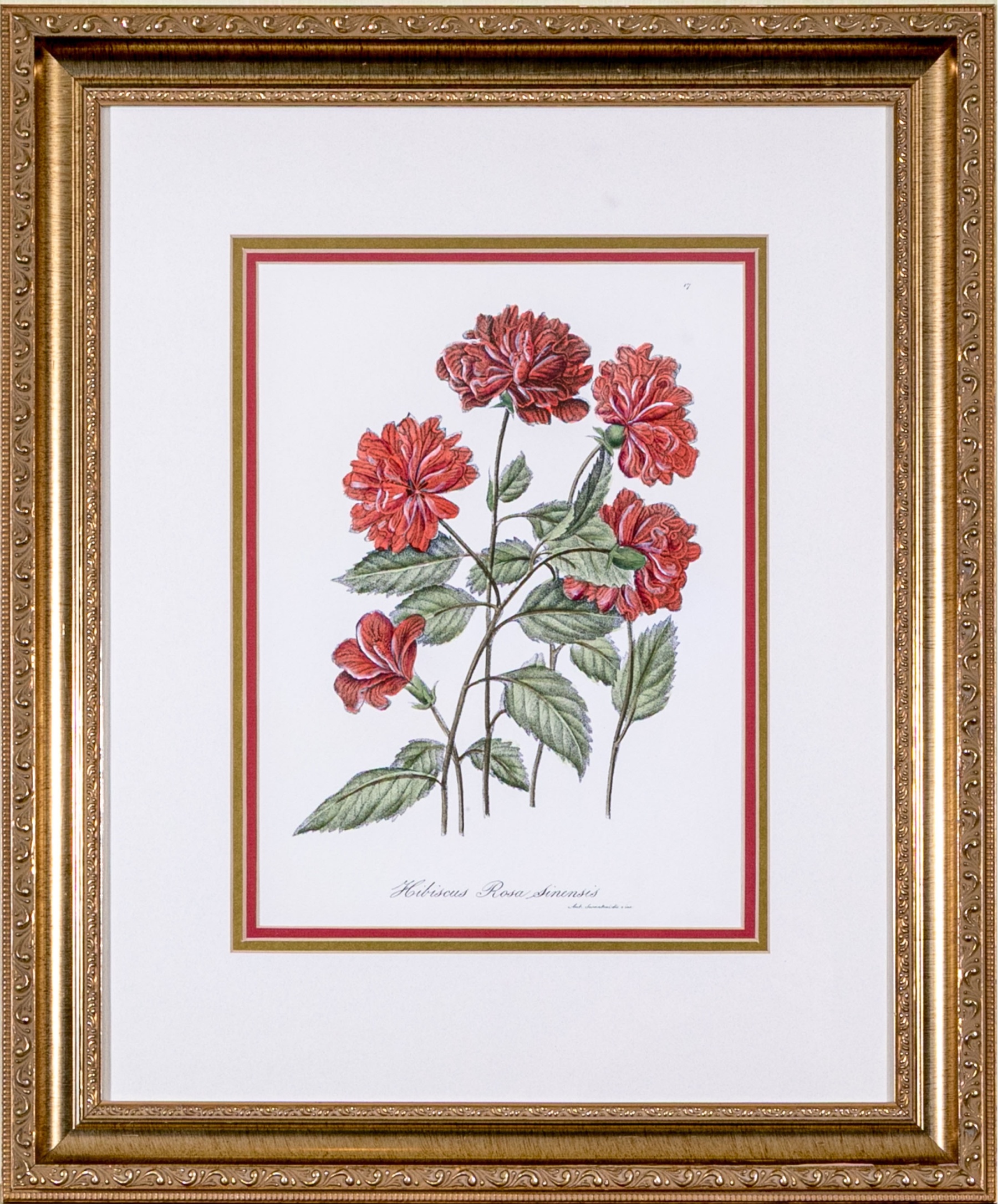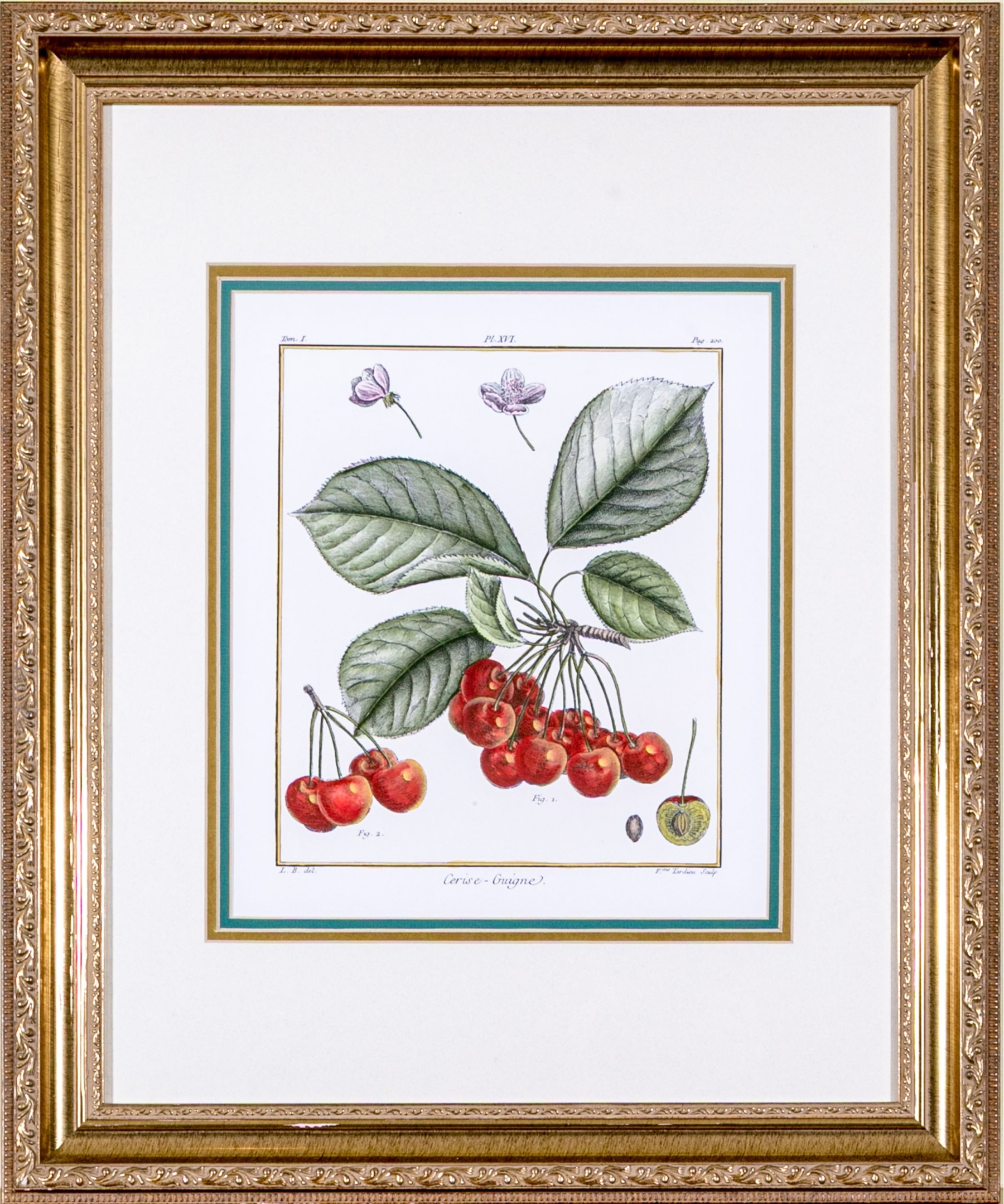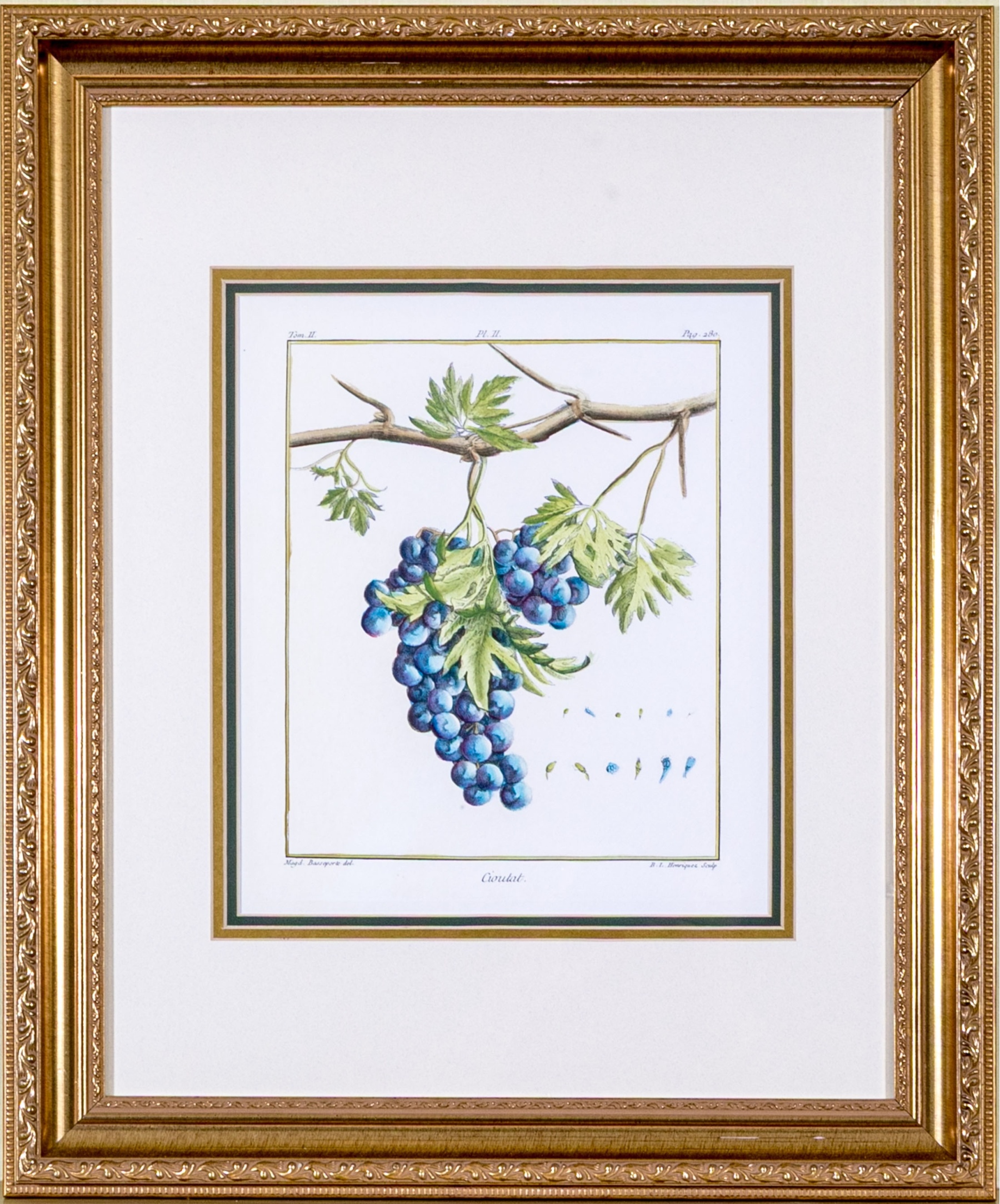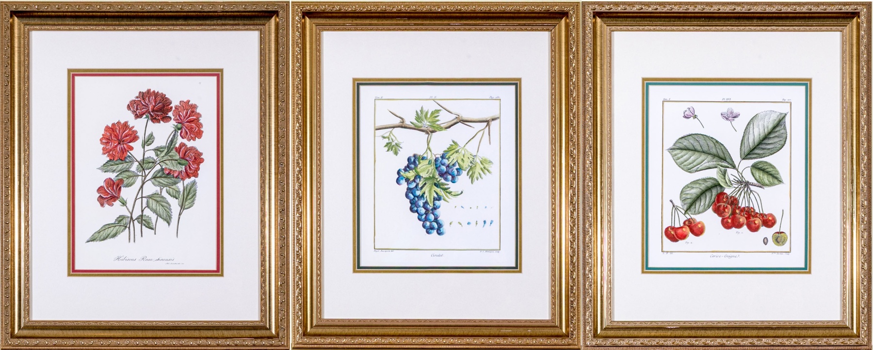 A fabulous trio of hand-colored botanical prints entitled Cioutat, Hibiscus Rosa Sinensis, and Cerise-Guigne. The prints depicting red flowers, blue grapes, and cherries in vibrant color and rich detail. Each displayed glazed and nicely matted in handsome gilt frames with fine borders of relief.