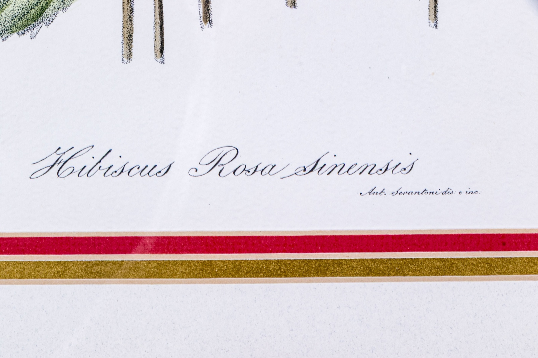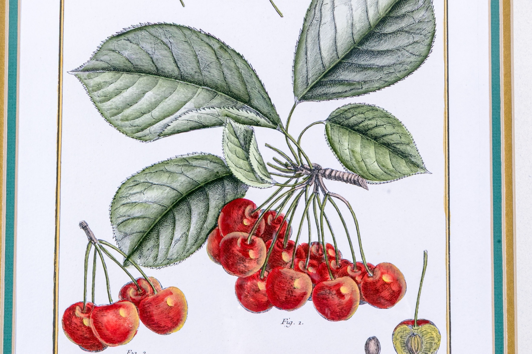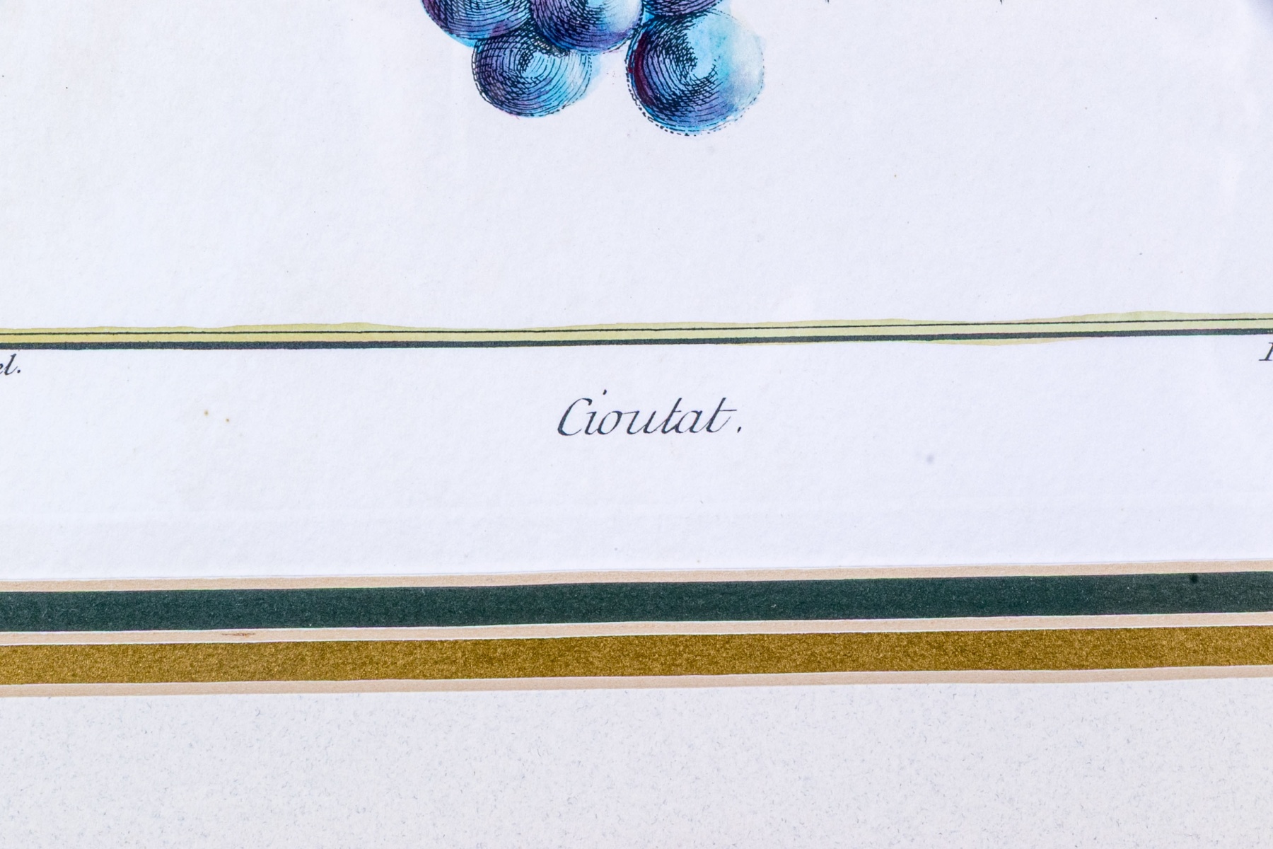 A fabulous trio of hand-colored botanical prints entitled Cioutat, Hibiscus Rosa Sinensis, and Cerise-Guigne. The prints depicting red flowers, blue grapes, and cherries in vibrant color and rich detail. Each displayed glazed and nicely matted in handsome gilt frames with fine borders of relief.