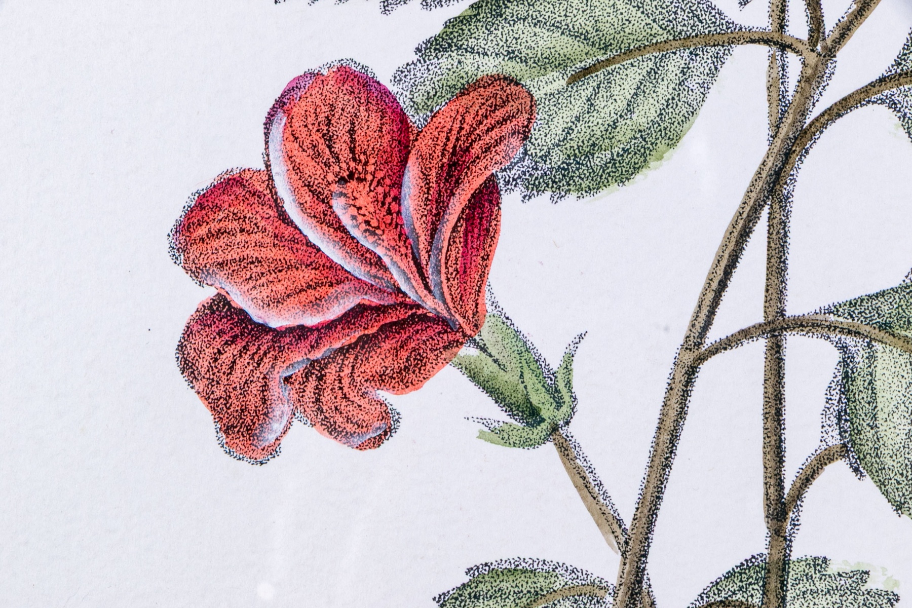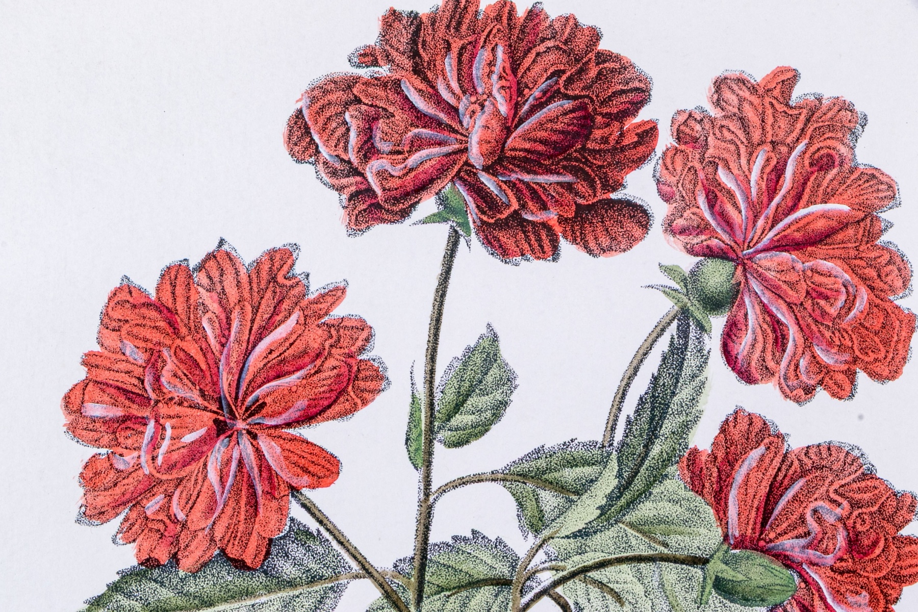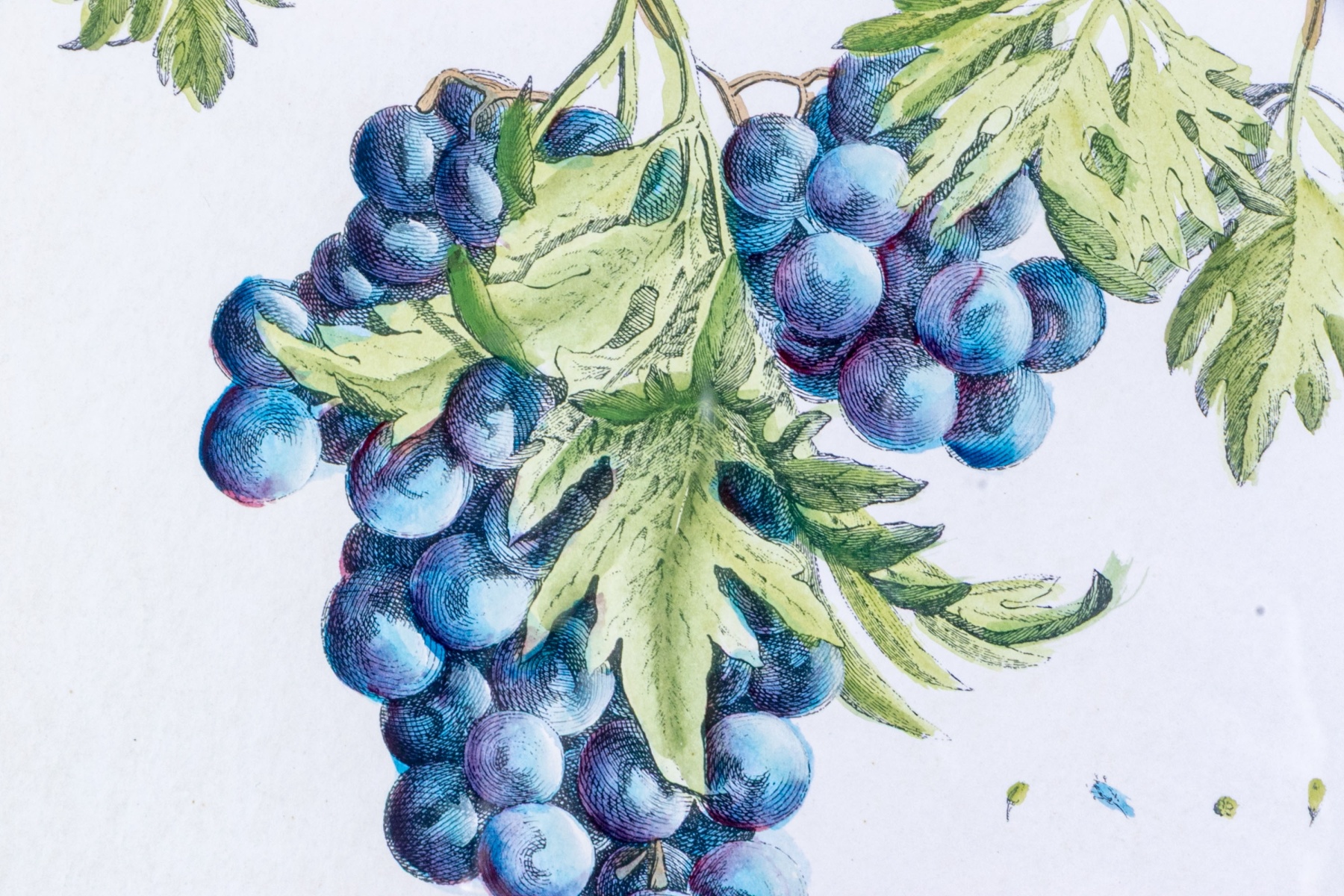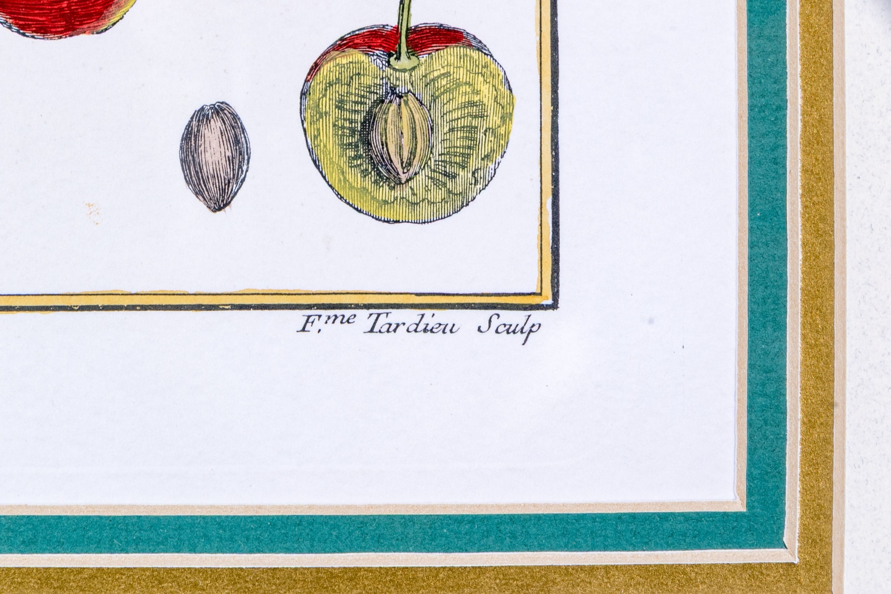 A fabulous trio of hand-colored botanical prints entitled Cioutat, Hibiscus Rosa Sinensis, and Cerise-Guigne. The prints depicting red flowers, blue grapes, and cherries in vibrant color and rich detail. Each displayed glazed and nicely matted in handsome gilt frames with fine borders of relief.