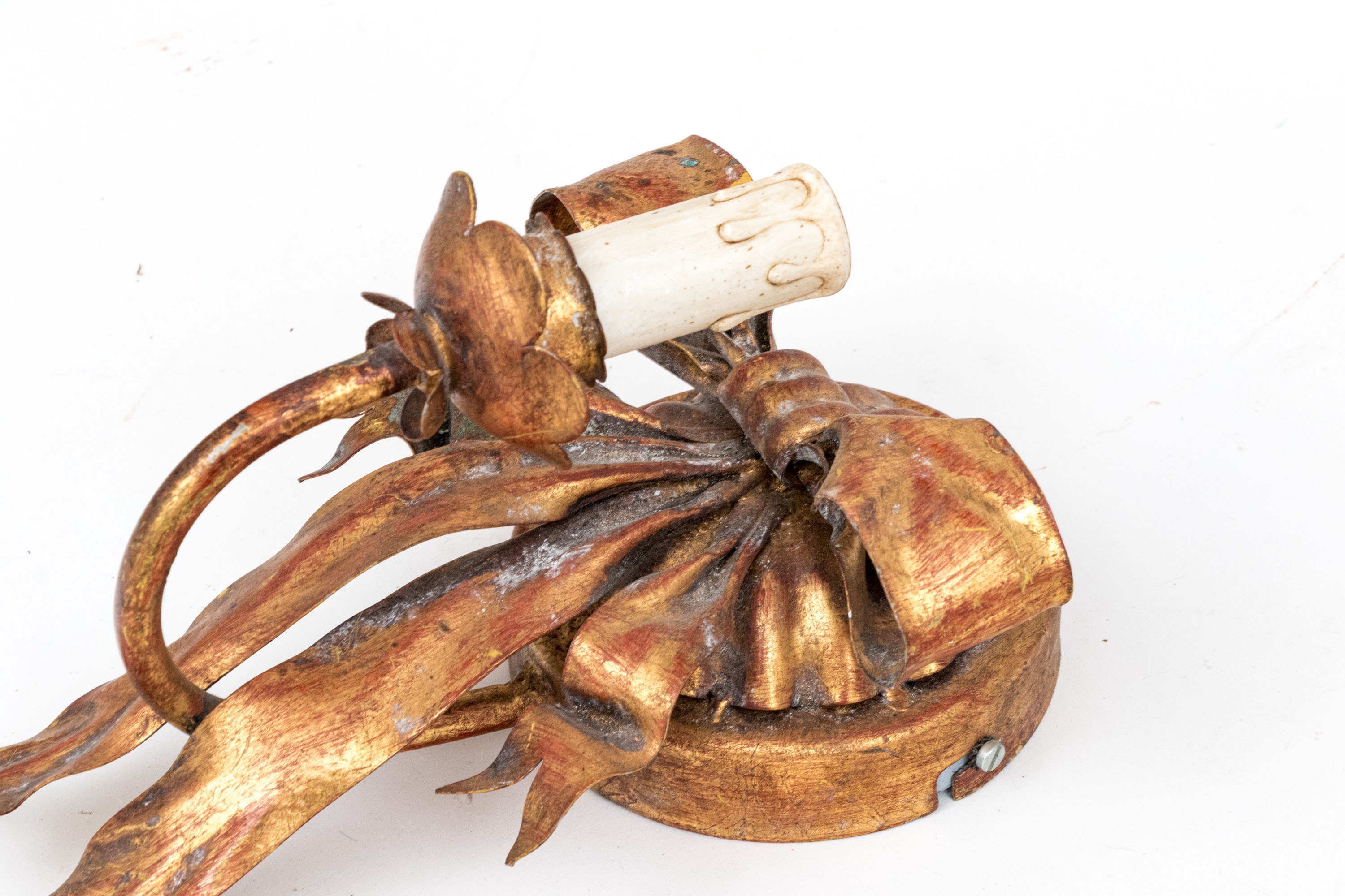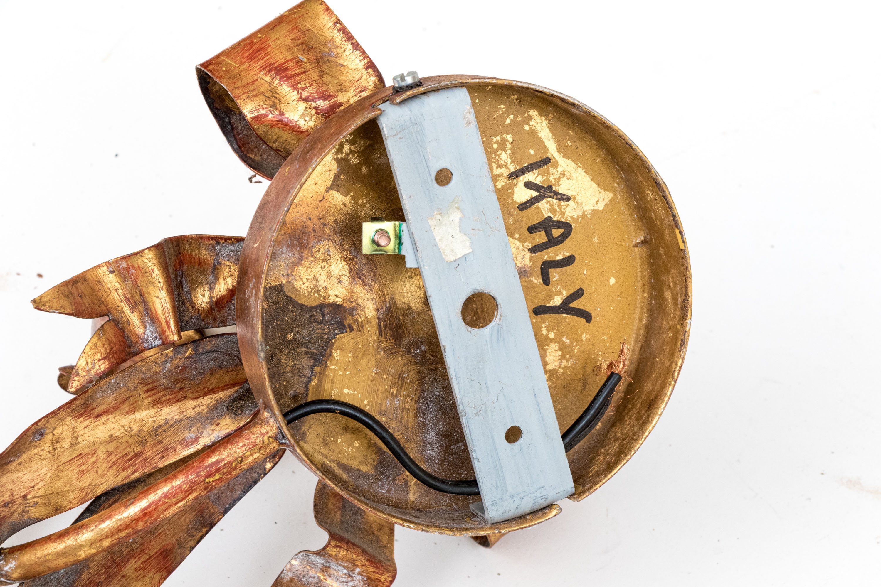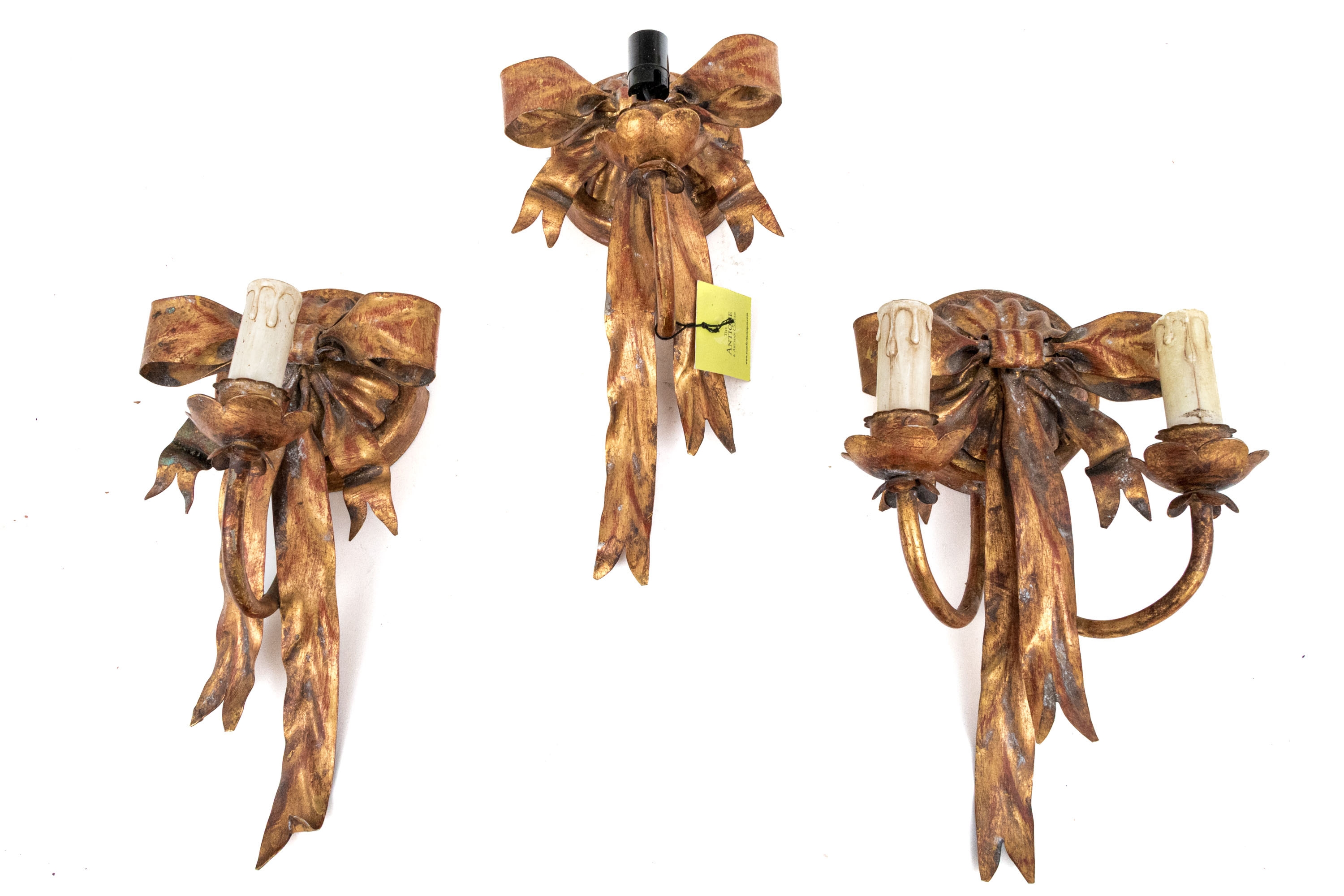 A charming trio of compatible Italian electric wall sconces. Two feature single lights while the third one presents with dual lights. All feature copper tone finish over brick red undertones in the form of ribbon motifs.