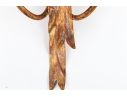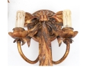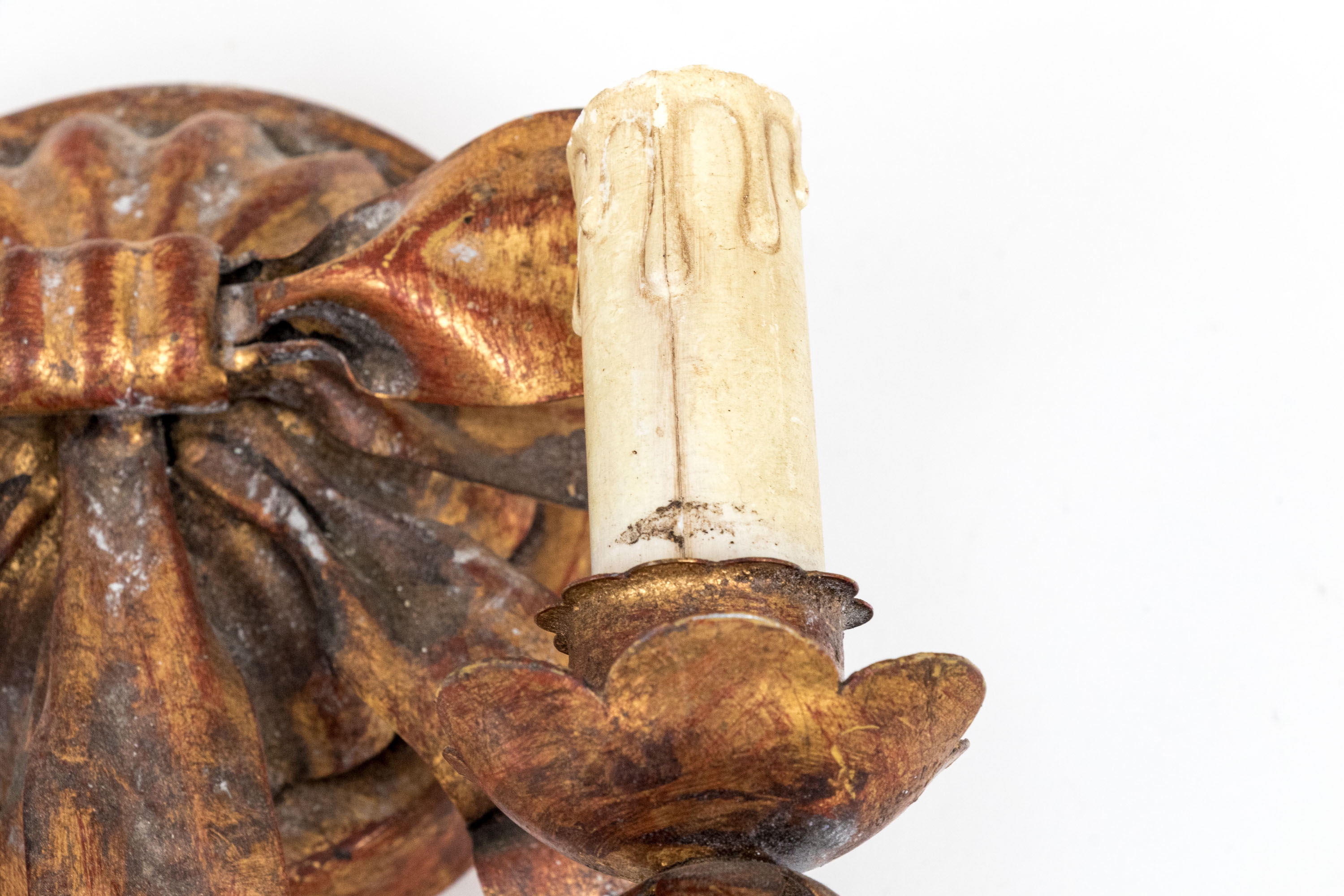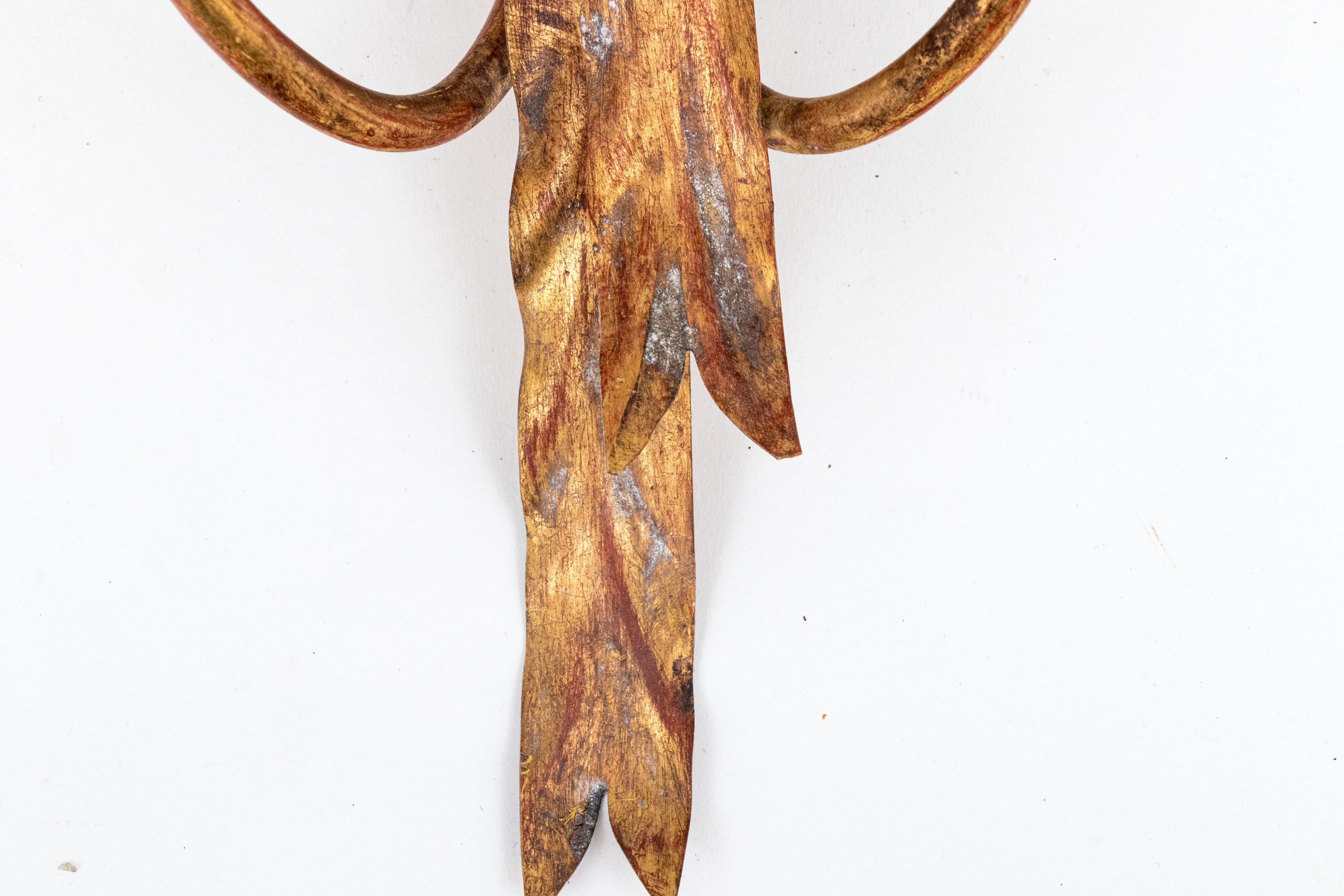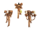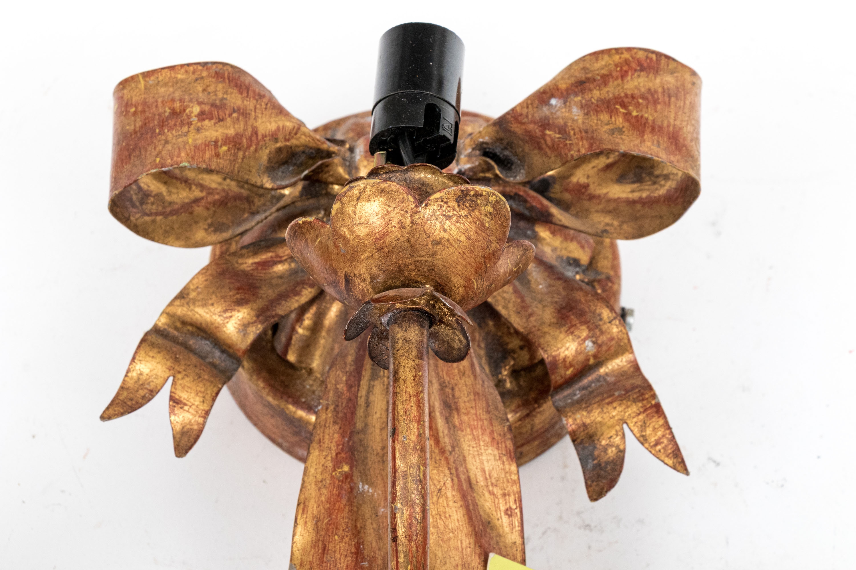 A charming trio of compatible Italian electric wall sconces. Two feature single lights while the third one presents with dual lights. All feature copper tone finish over brick red undertones in the form of ribbon motifs.
