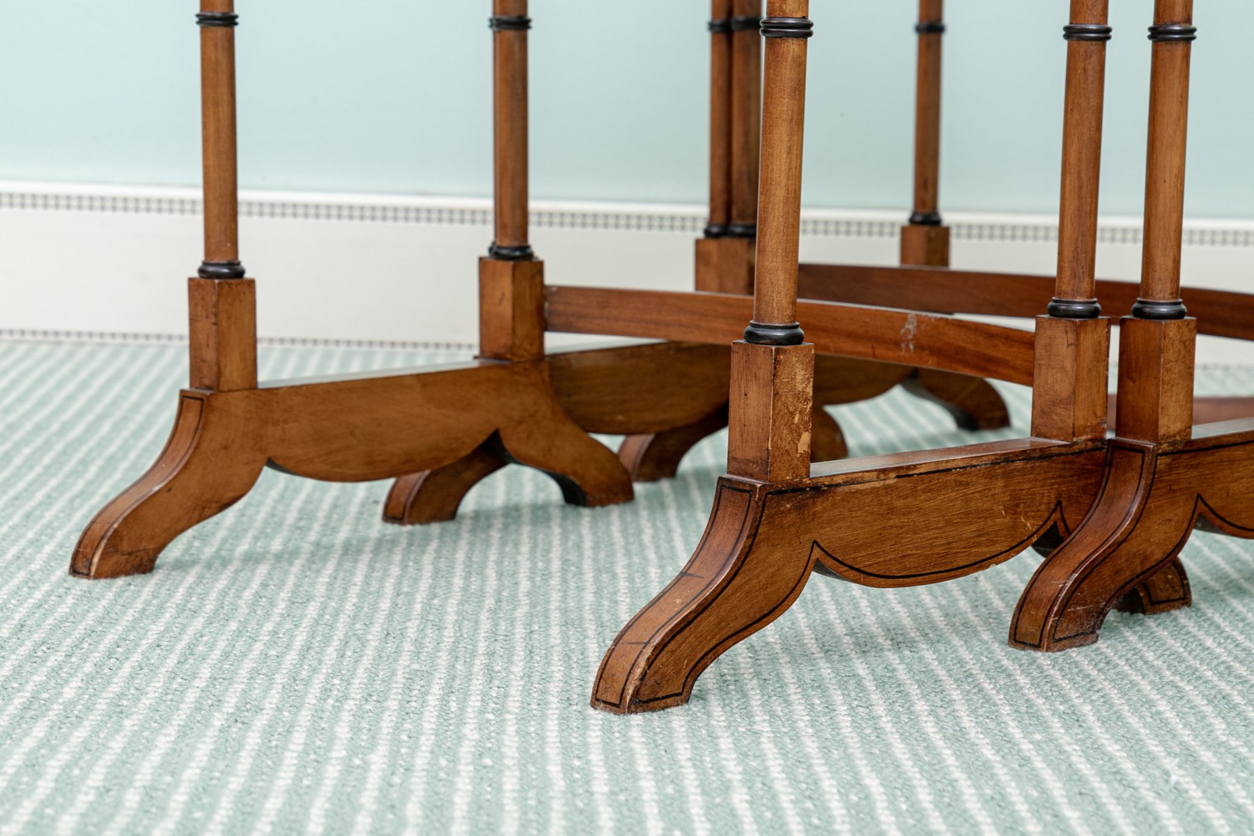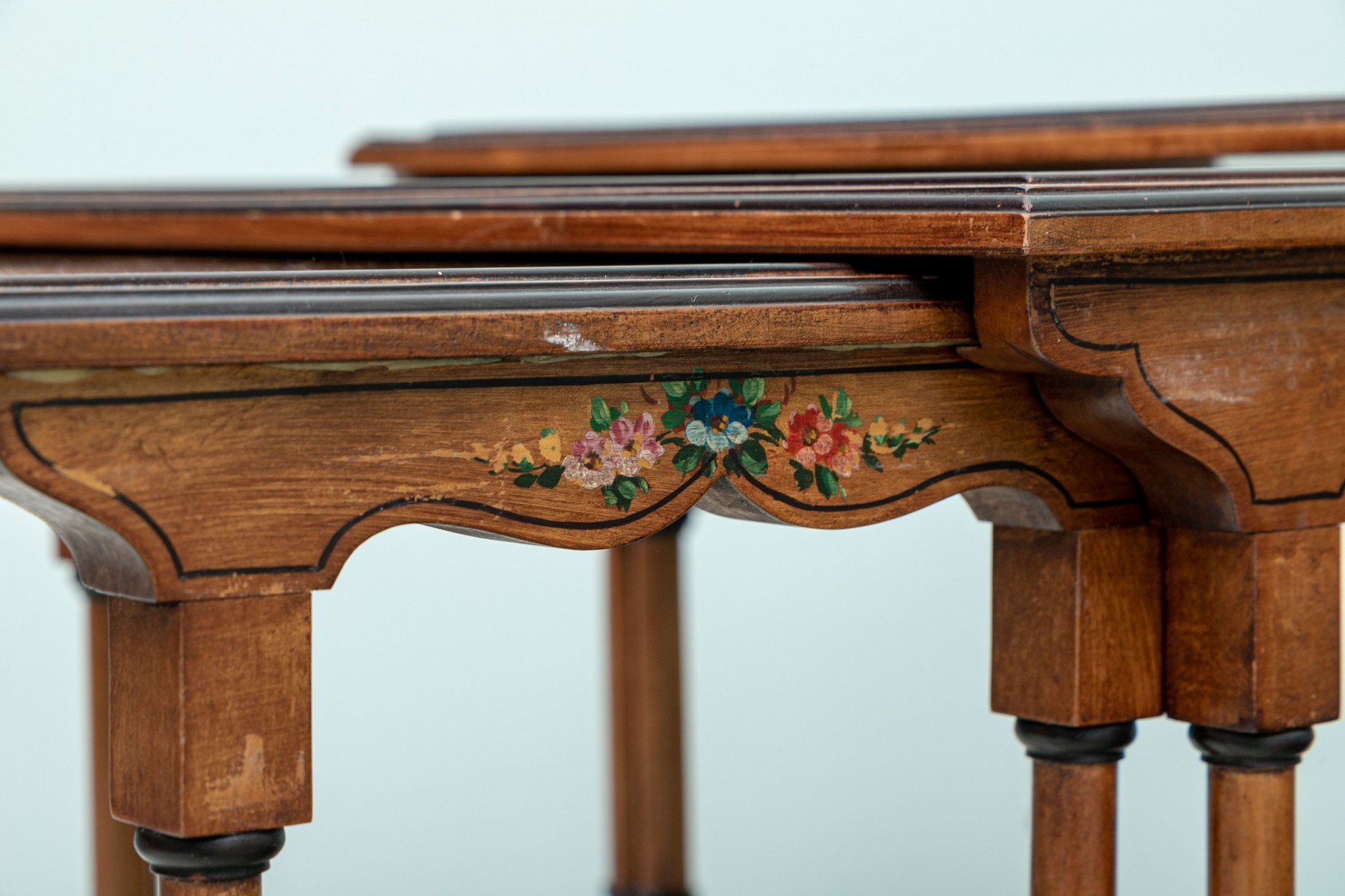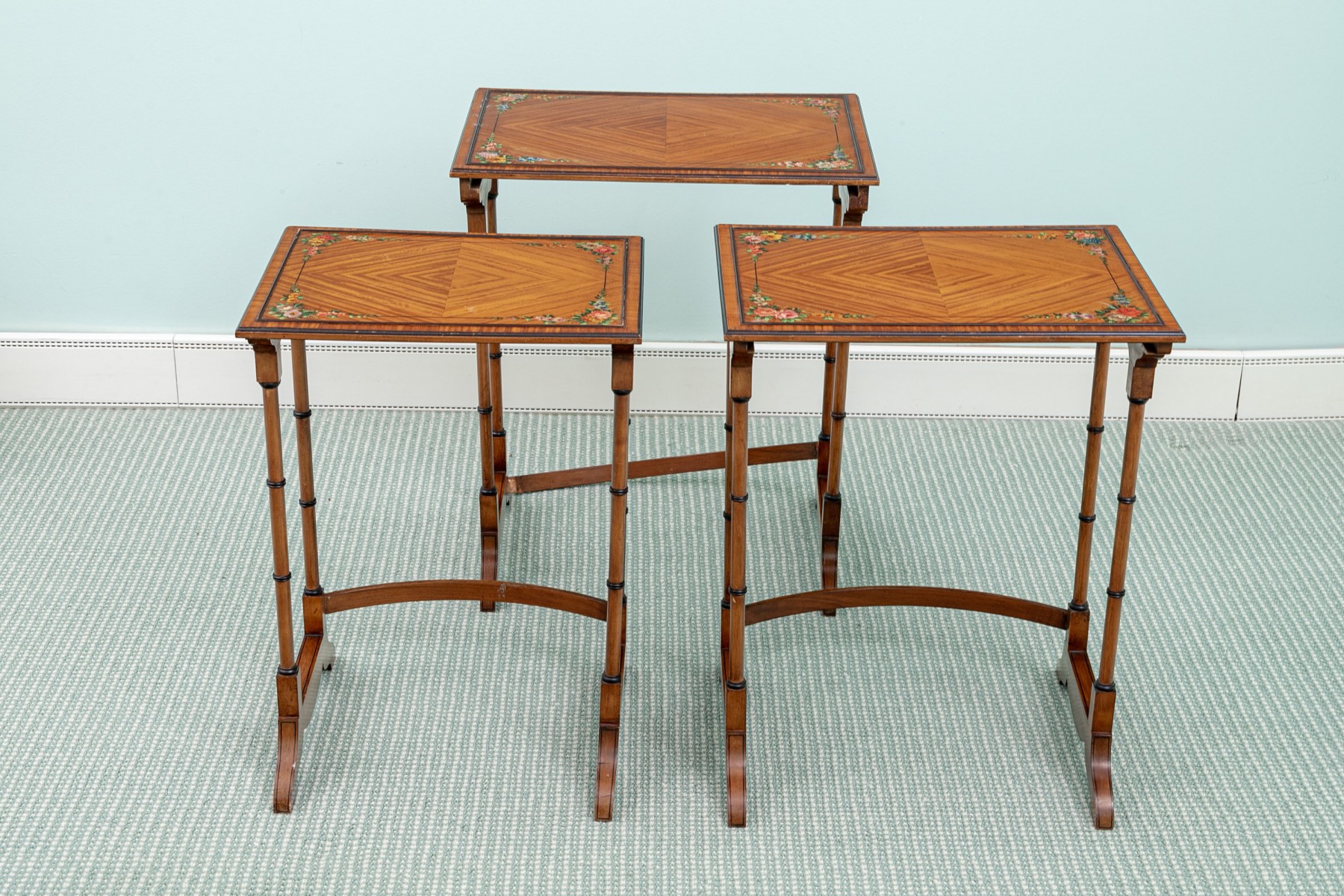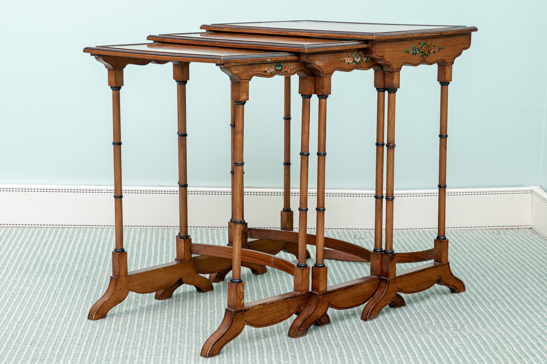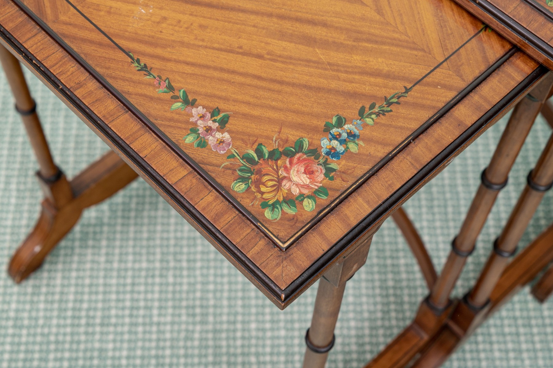 Delightful set of three faux bamboo, carved and paint finished nesting tables with veneer finishes.