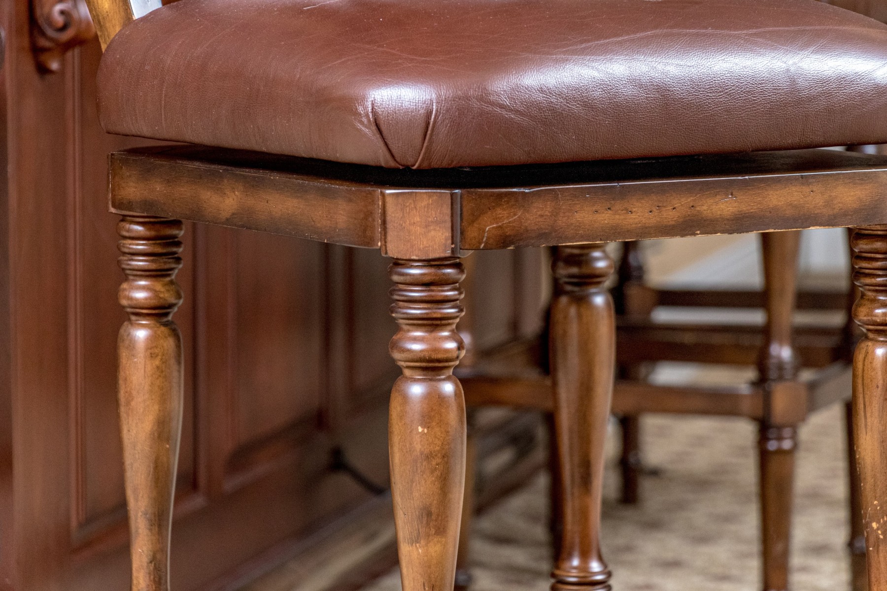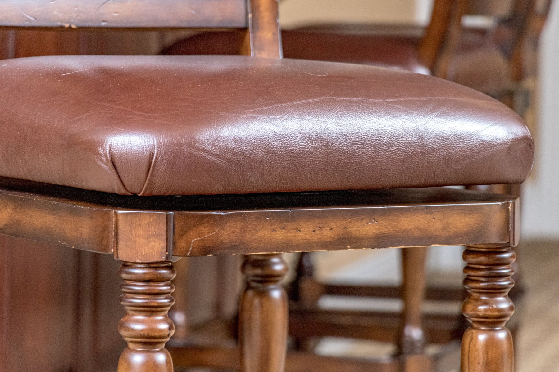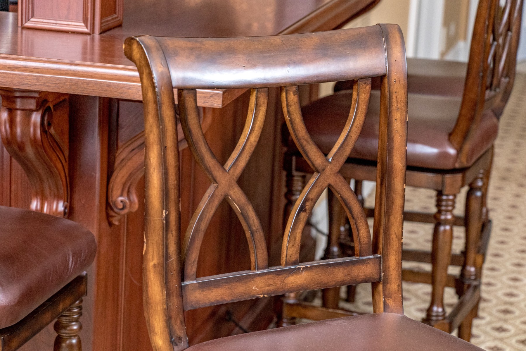 A fine set of three high quality Hillsdale Furniture traditional style barstools featuring antiqued warm-toned brown frames with rolled top rails and double-X motif splats, upholstered in brown vegan leather and supported by nicely turned legs with box stretchers and bobbin accents.