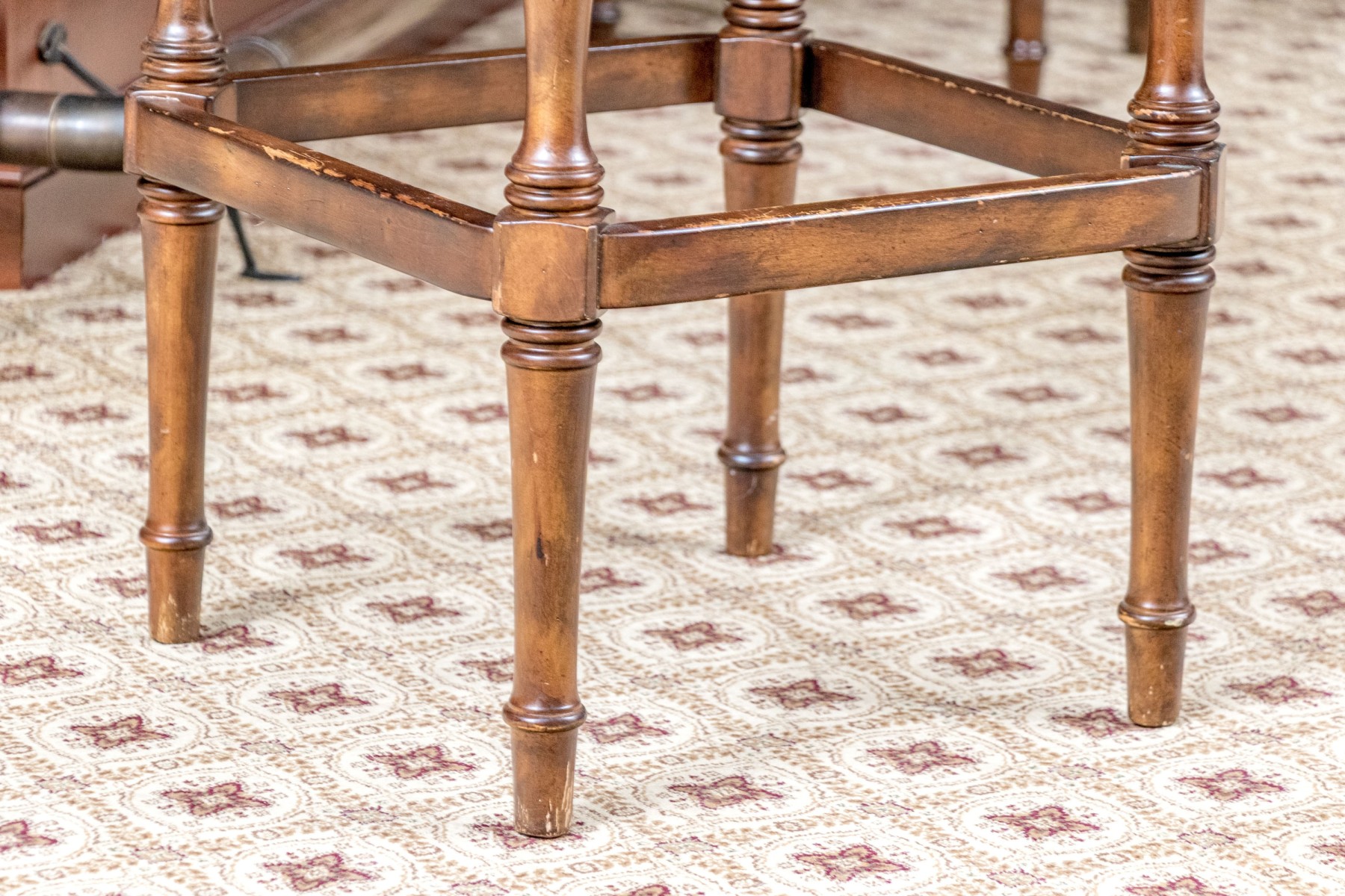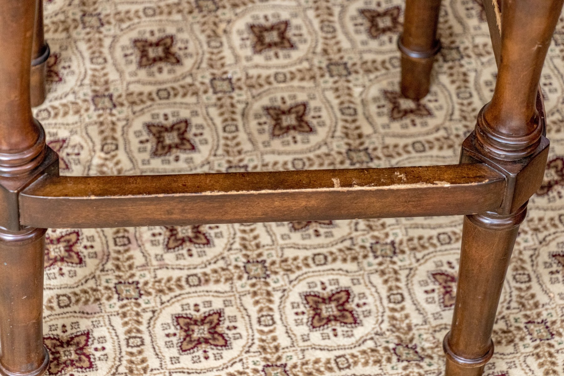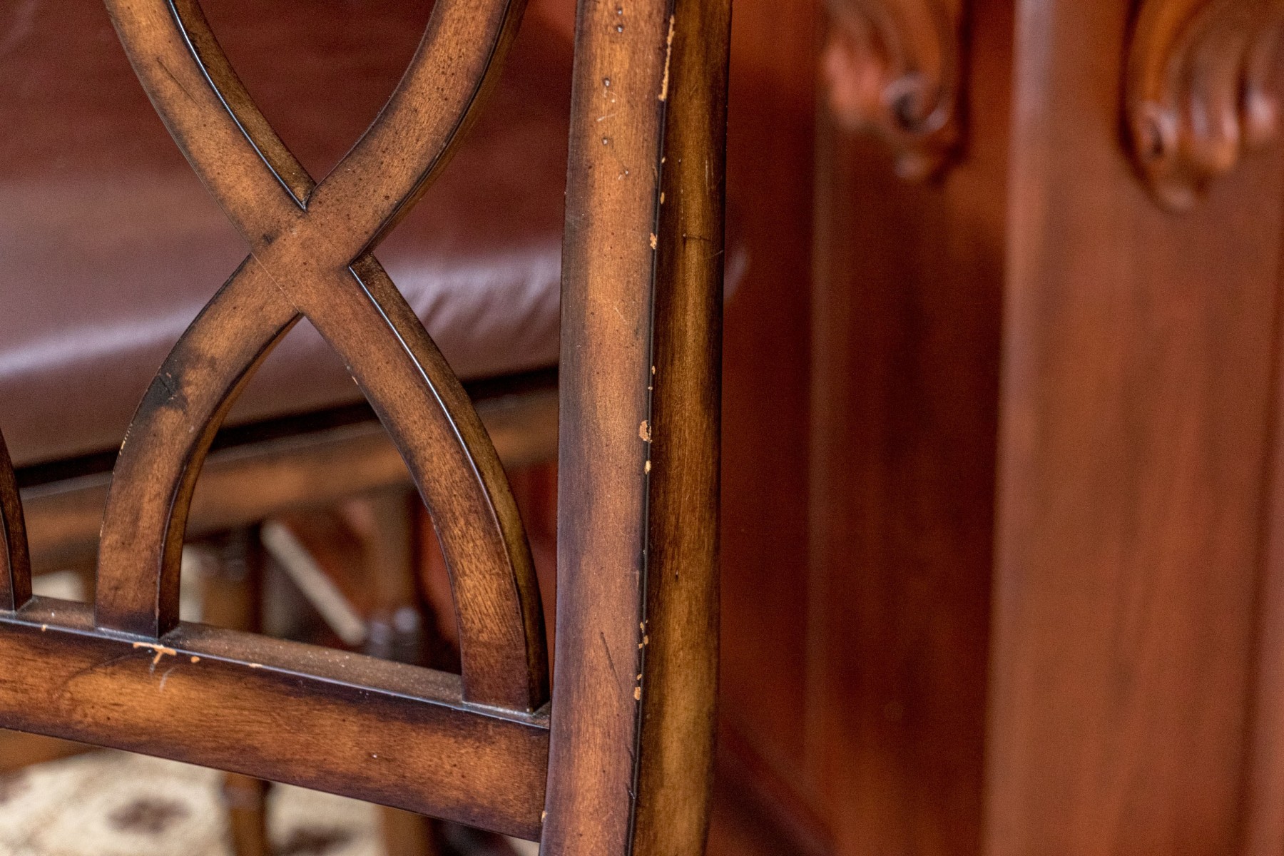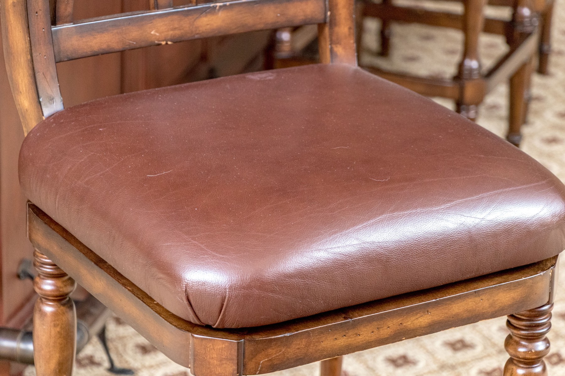 A fine set of three high quality Hillsdale Furniture traditional style barstools featuring antiqued warm-toned brown frames with rolled top rails and double-X motif splats, upholstered in brown vegan leather and supported by nicely turned legs with box stretchers and bobbin accents.