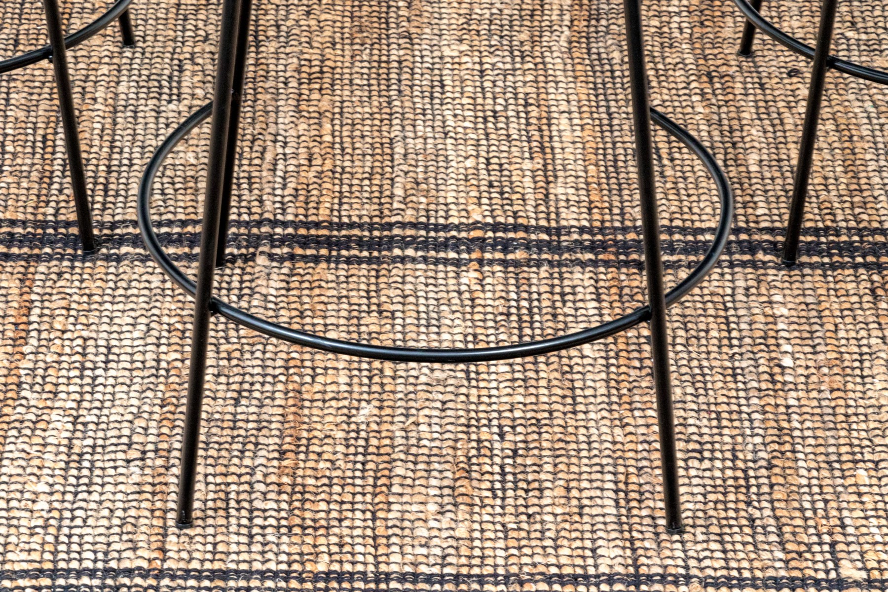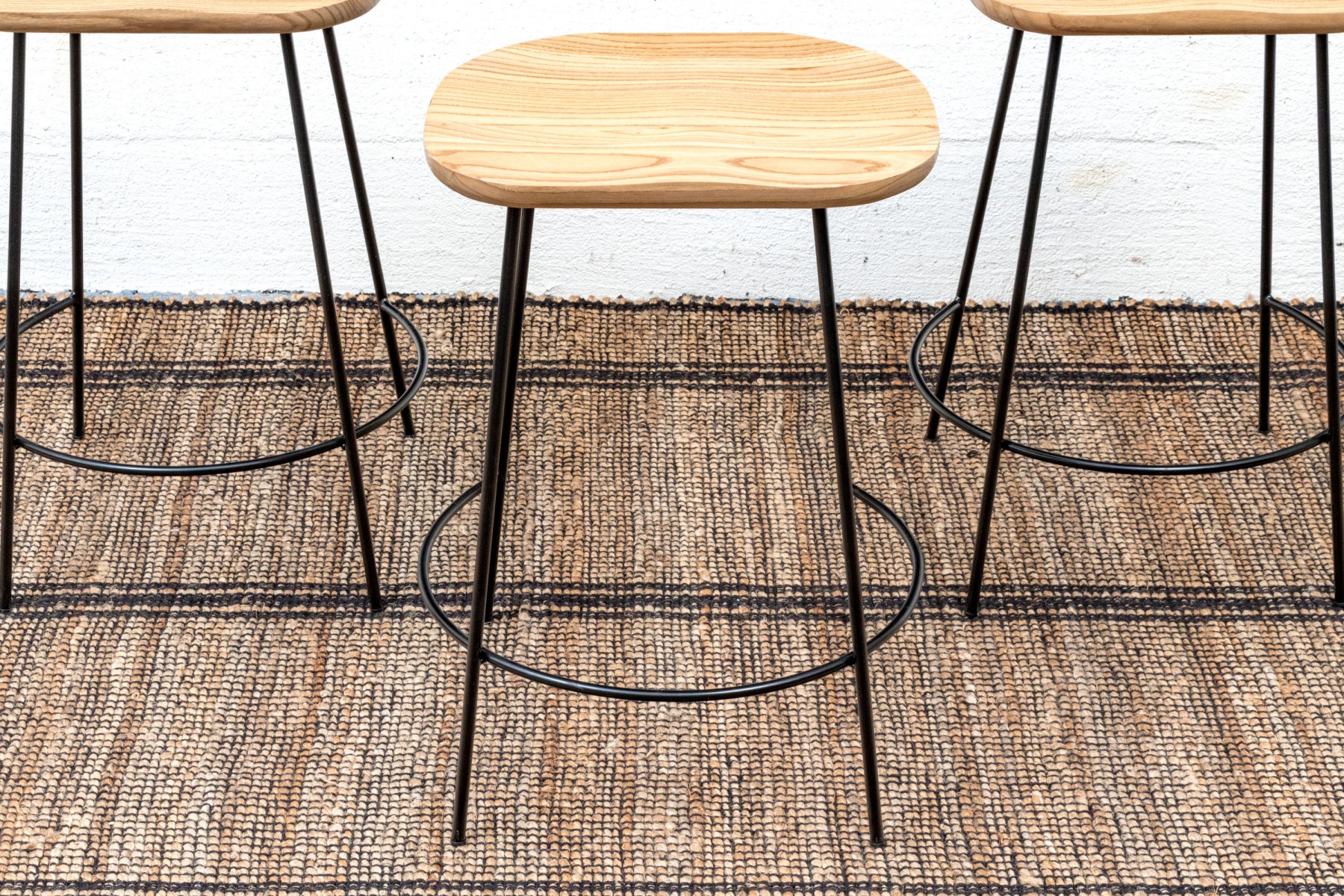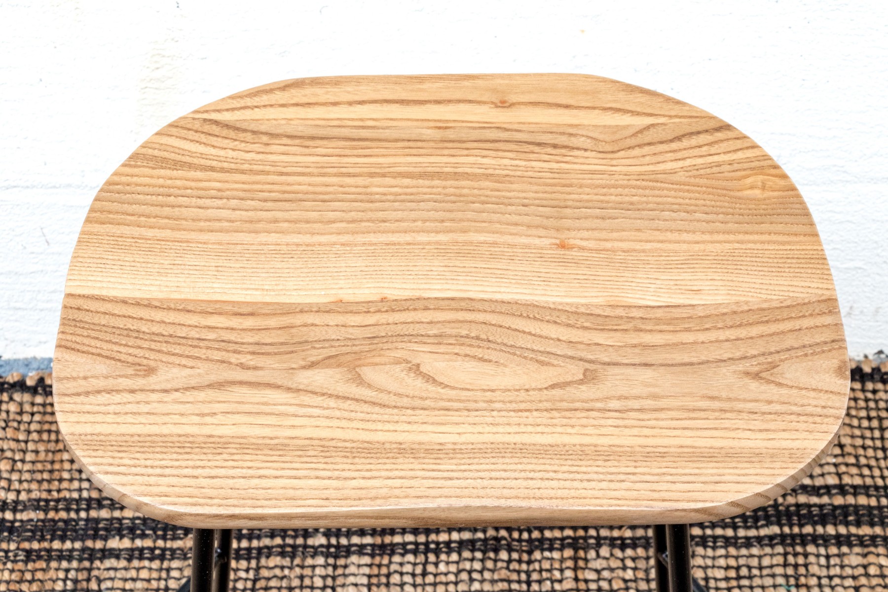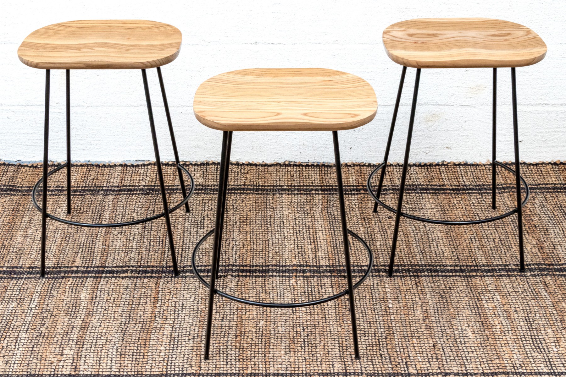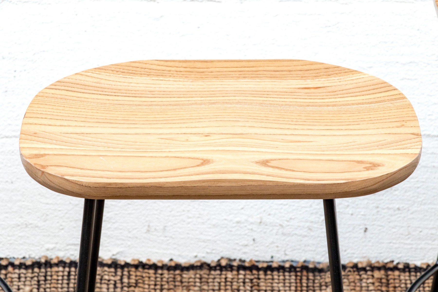 A wonderful trio of Studio McGee and Threshold counter barstools with just the right touch of naturalistic appeal. Features attractive honeyed medium brown saddle seats with subtle kidney forms and comfortably contoured designs, raised on dainty black metal angled legs with semi-circle foot rests maintaining an airy, simple aesthetic.