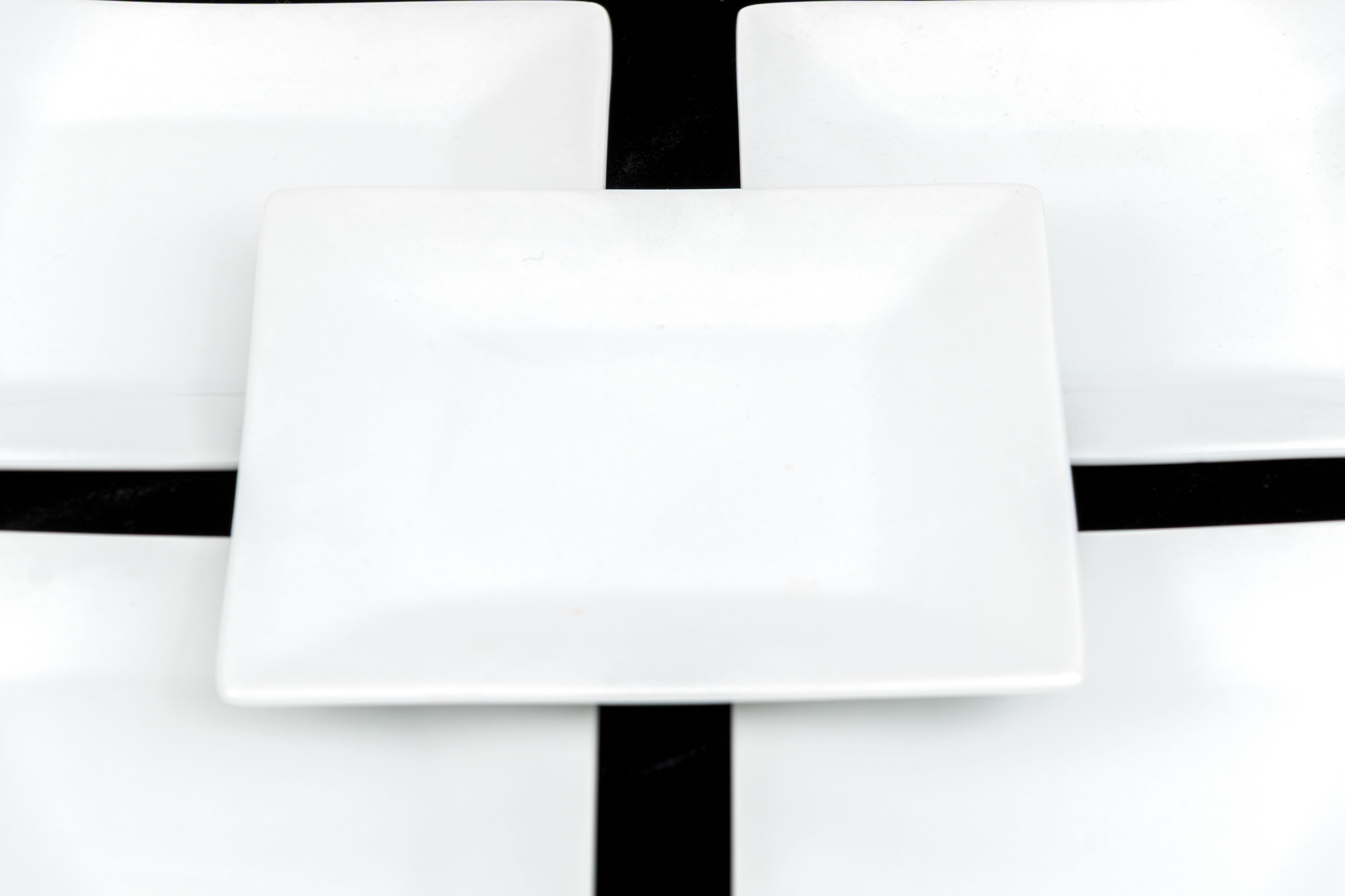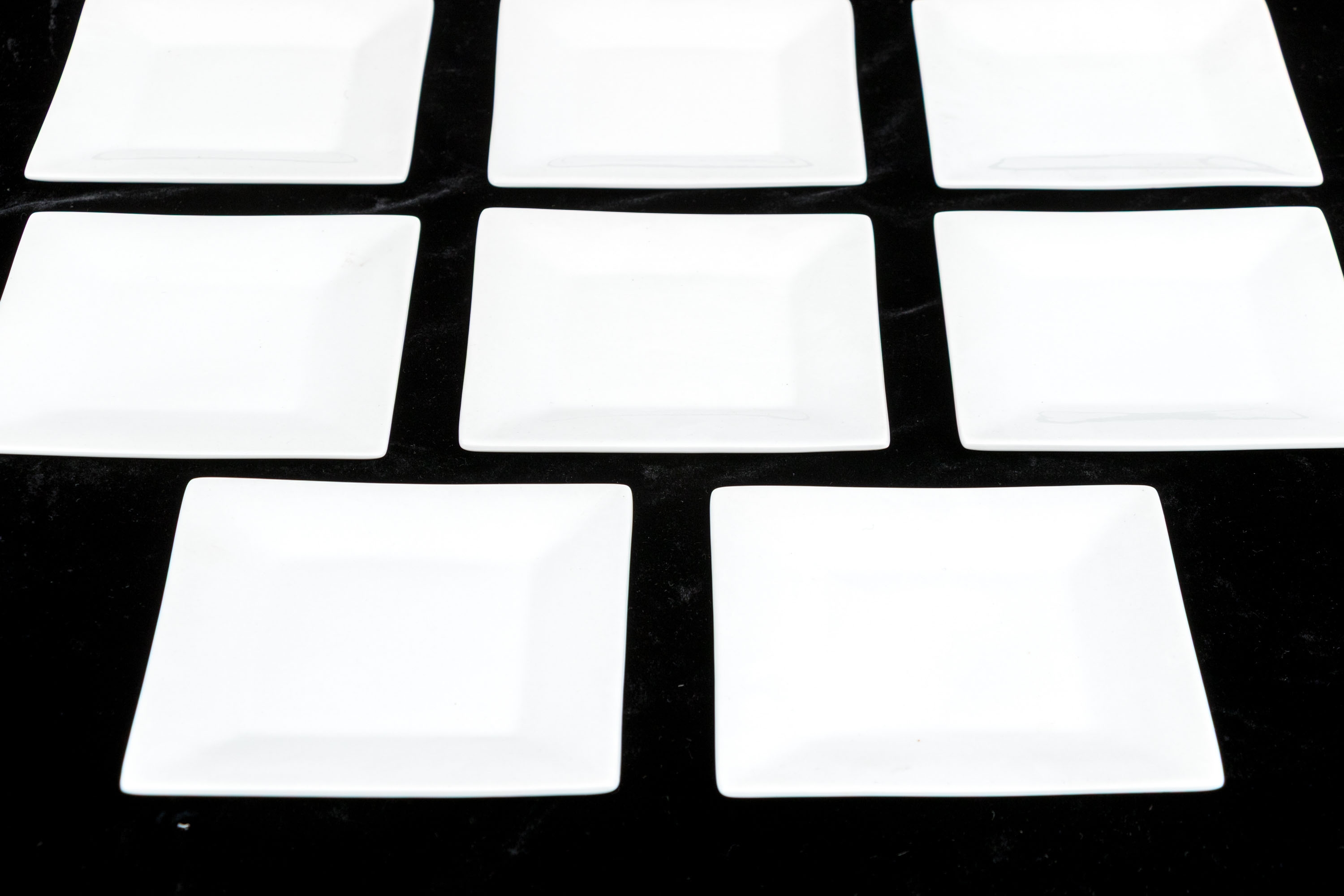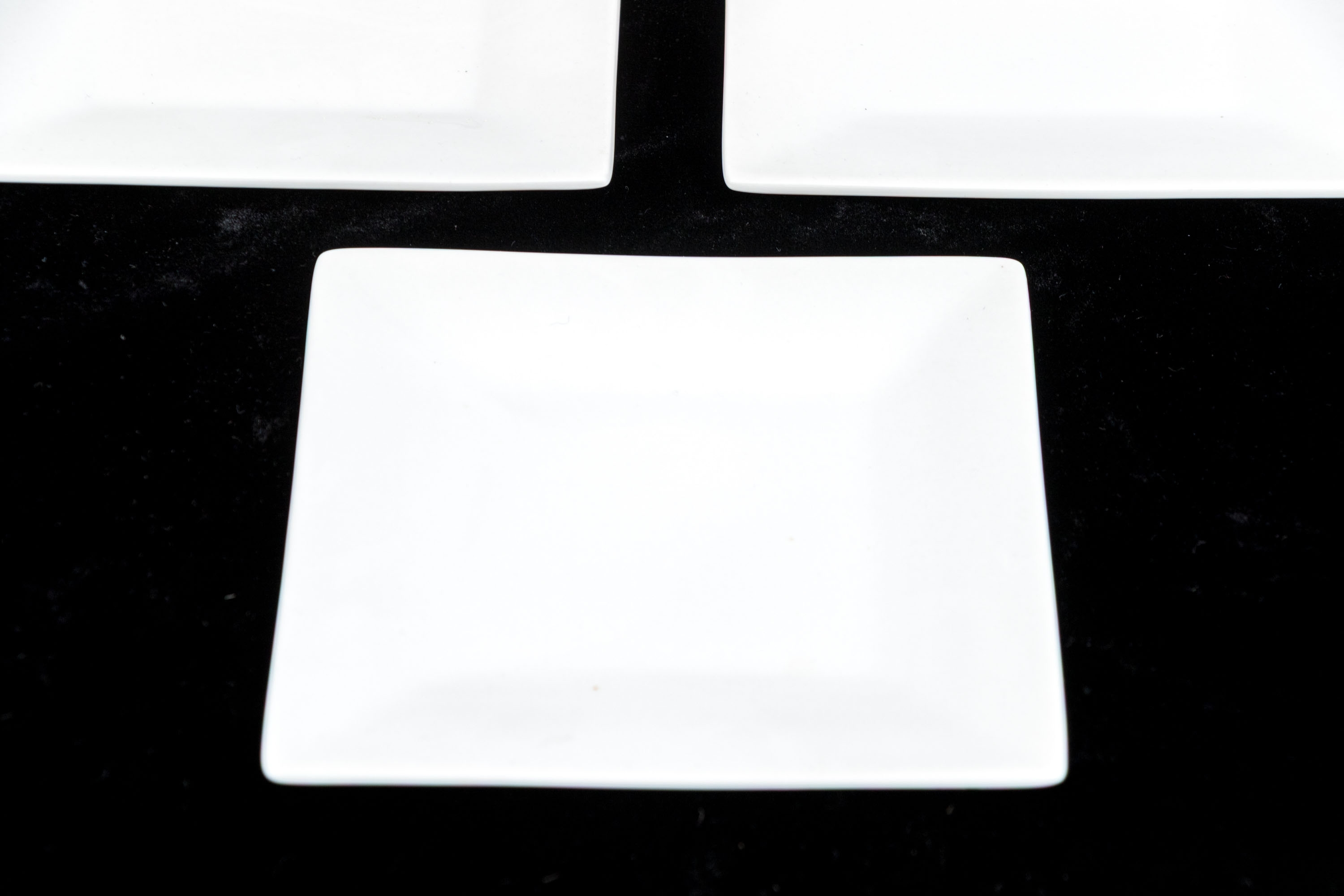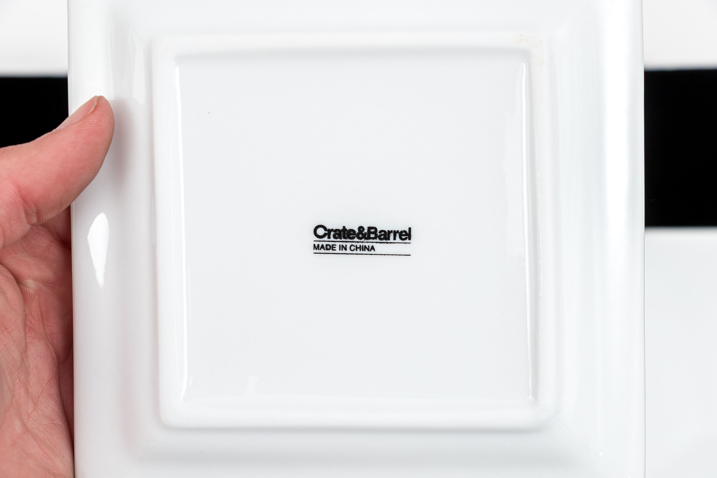 A wonderful set of contemporary Crate & Barrel ceramic bread and butter plates with sleek, square forms. Marked underfoot.