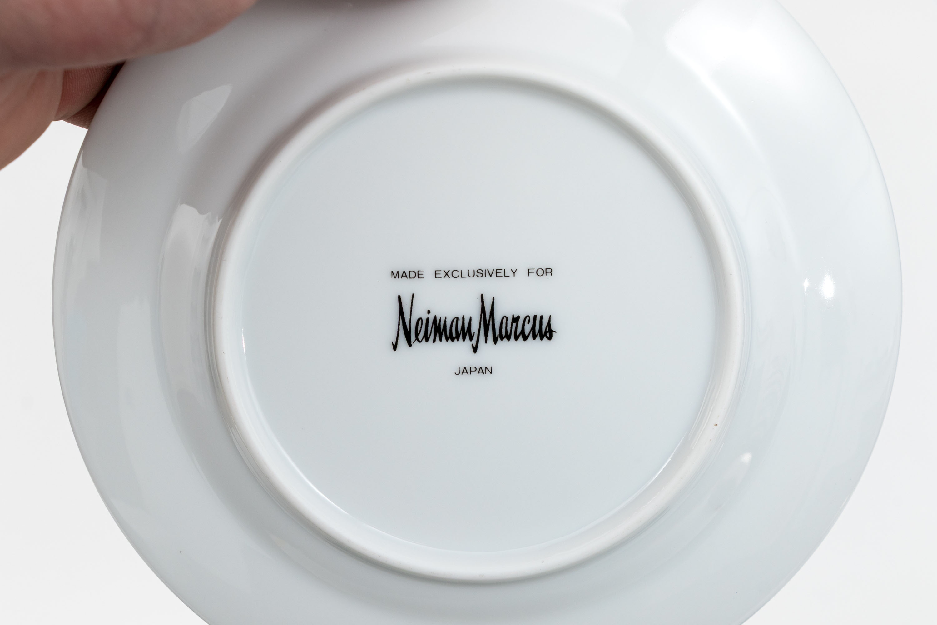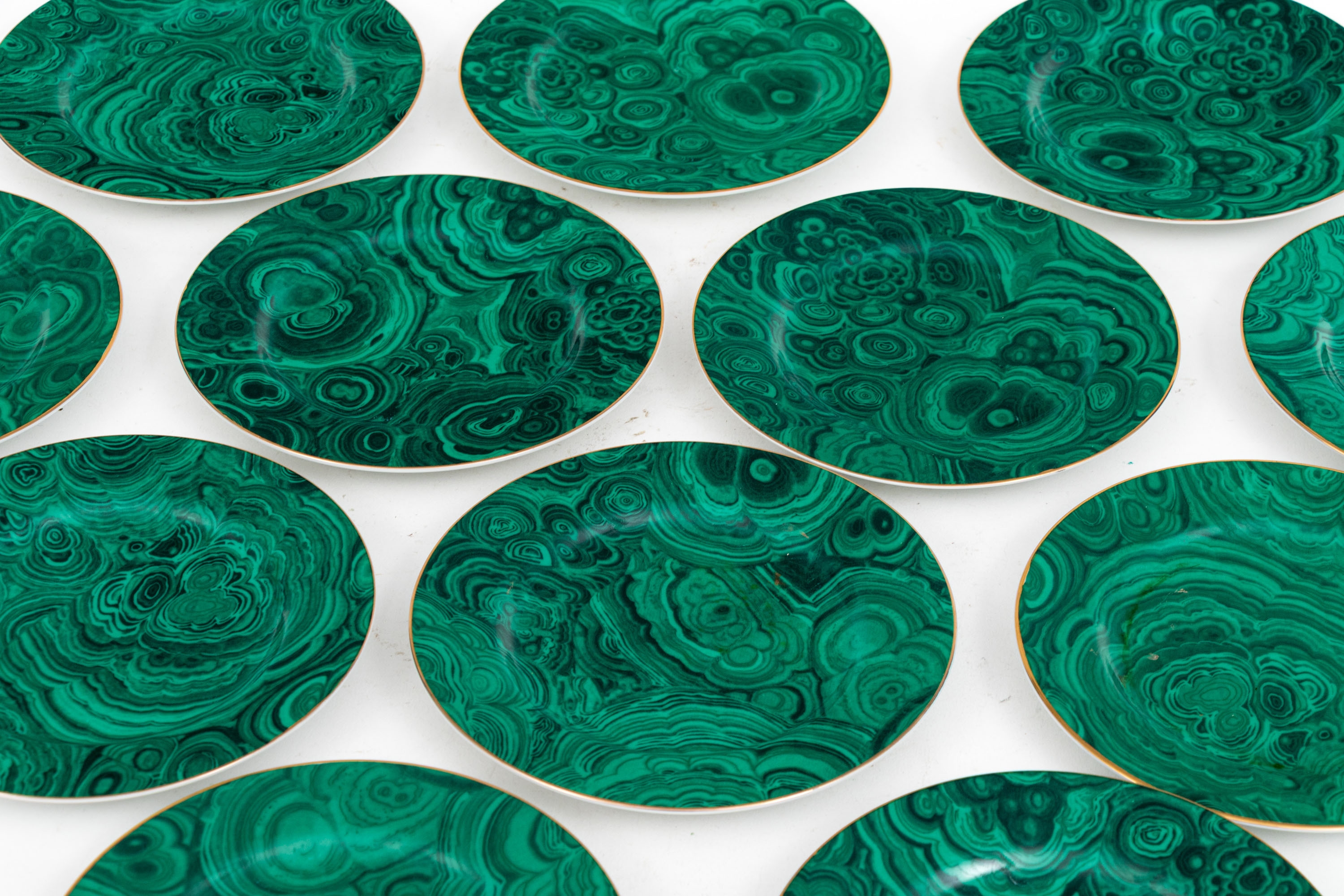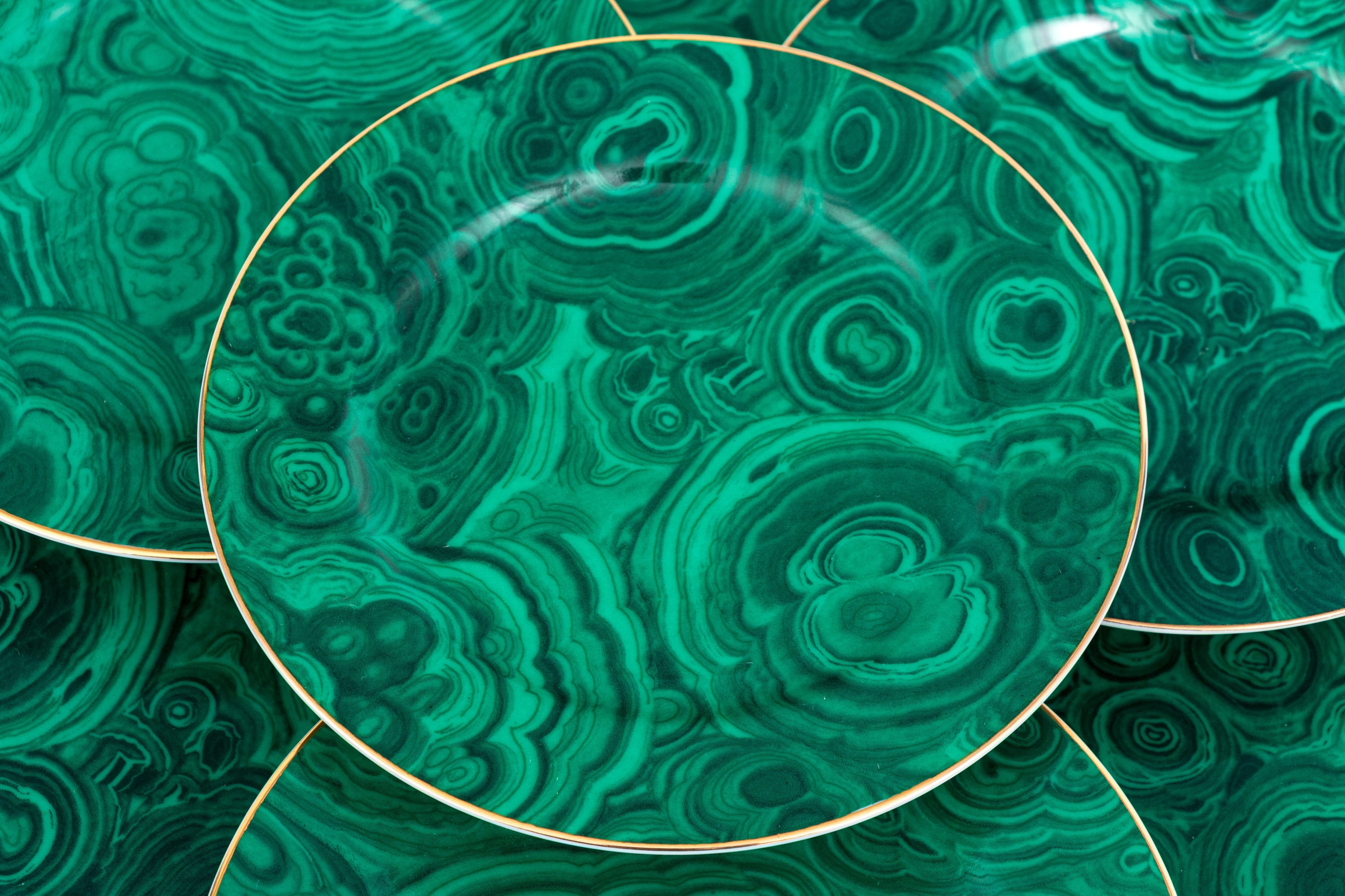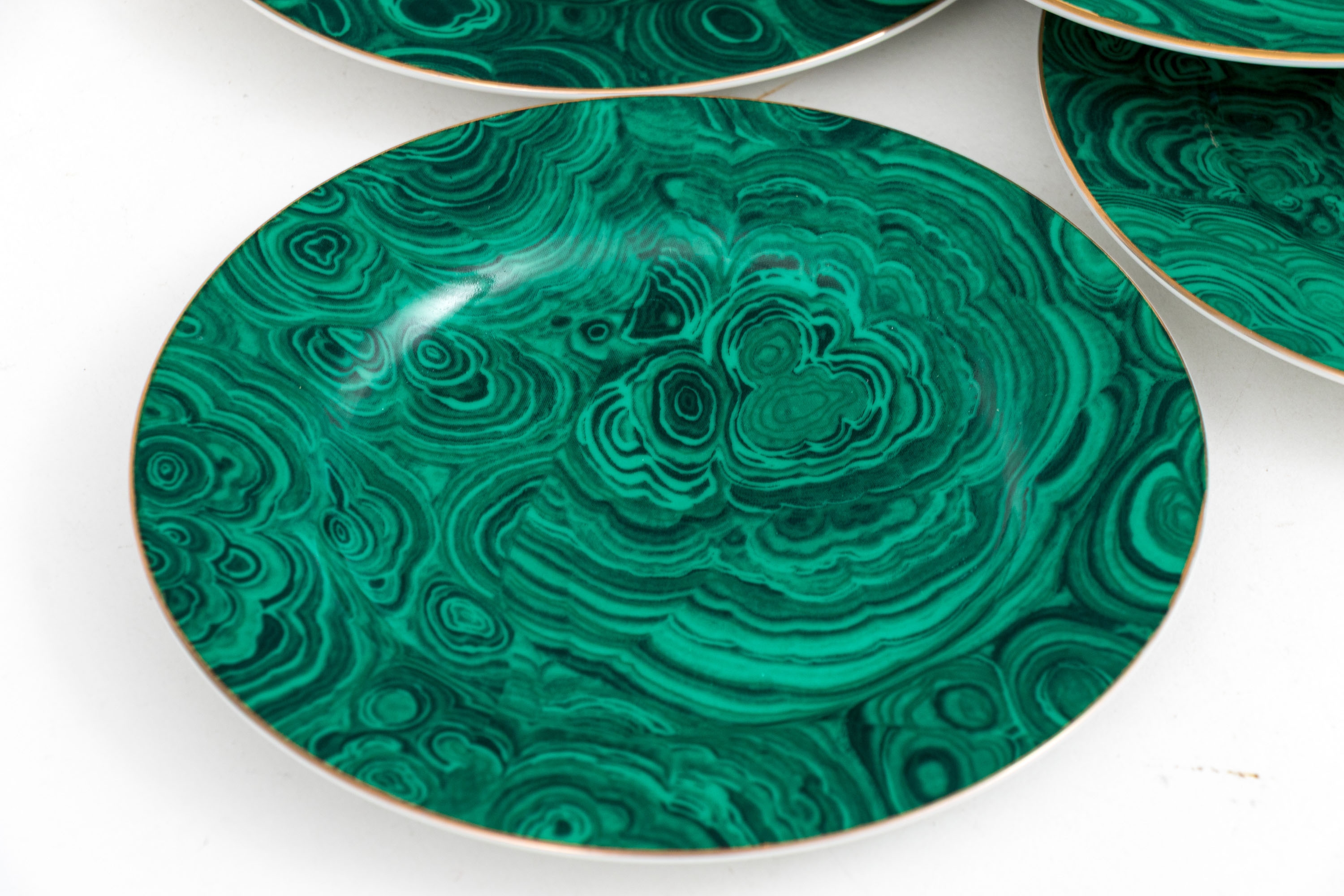 A stylish set of twelve Neiman Marcus china bread and butter plates designed with narrow gilt rims and gorgeous green malachite patterns across the interiors. Marked underfoot.