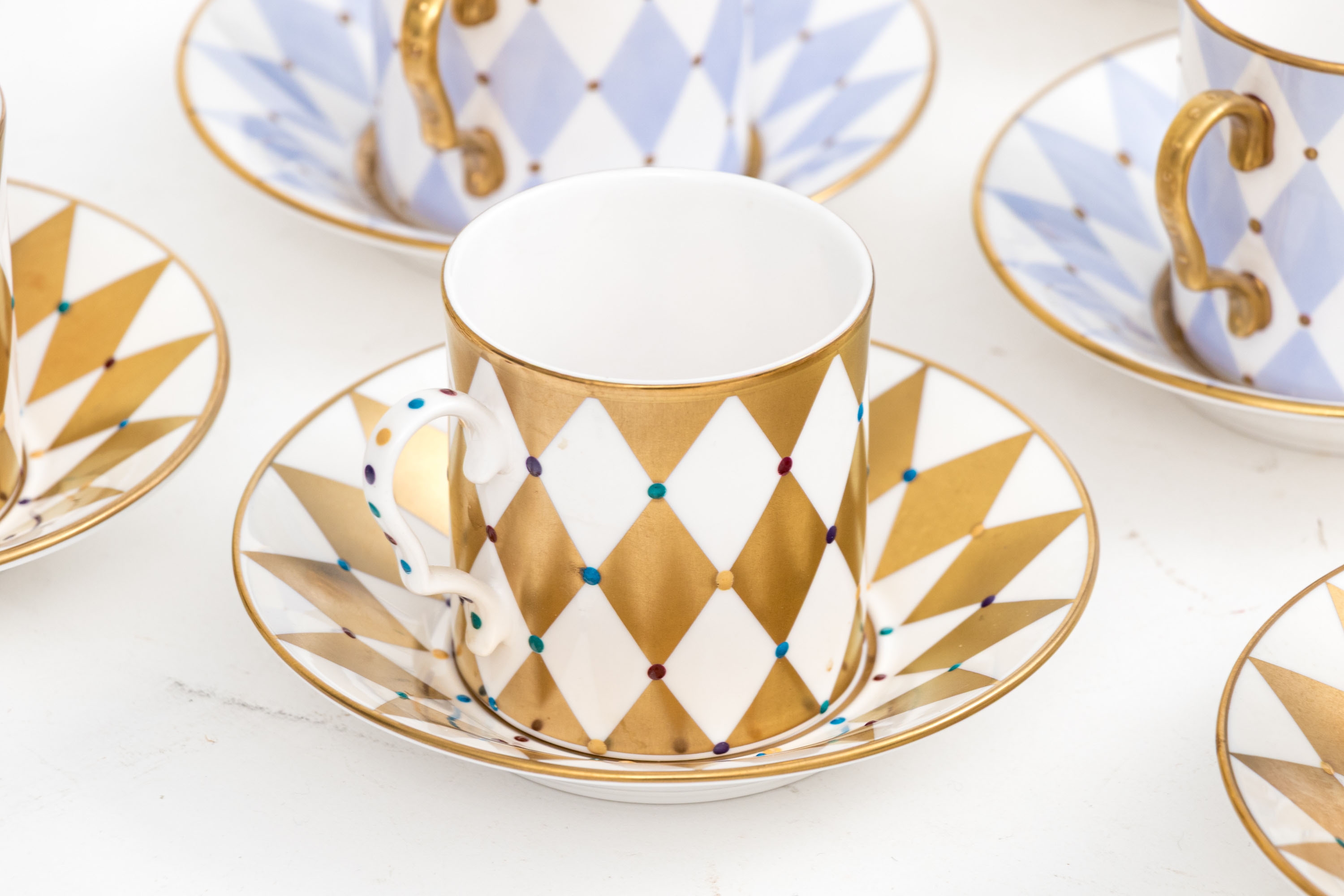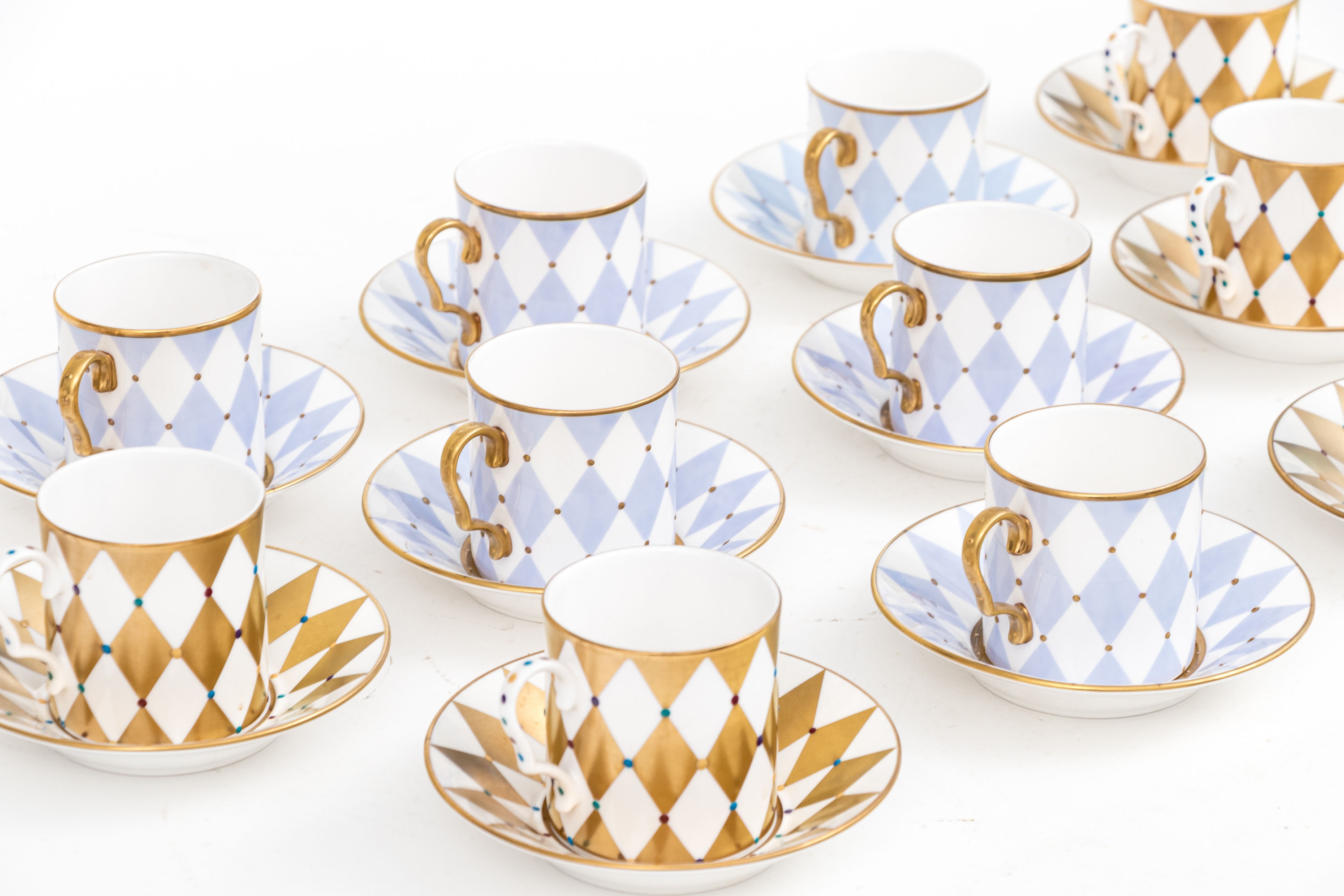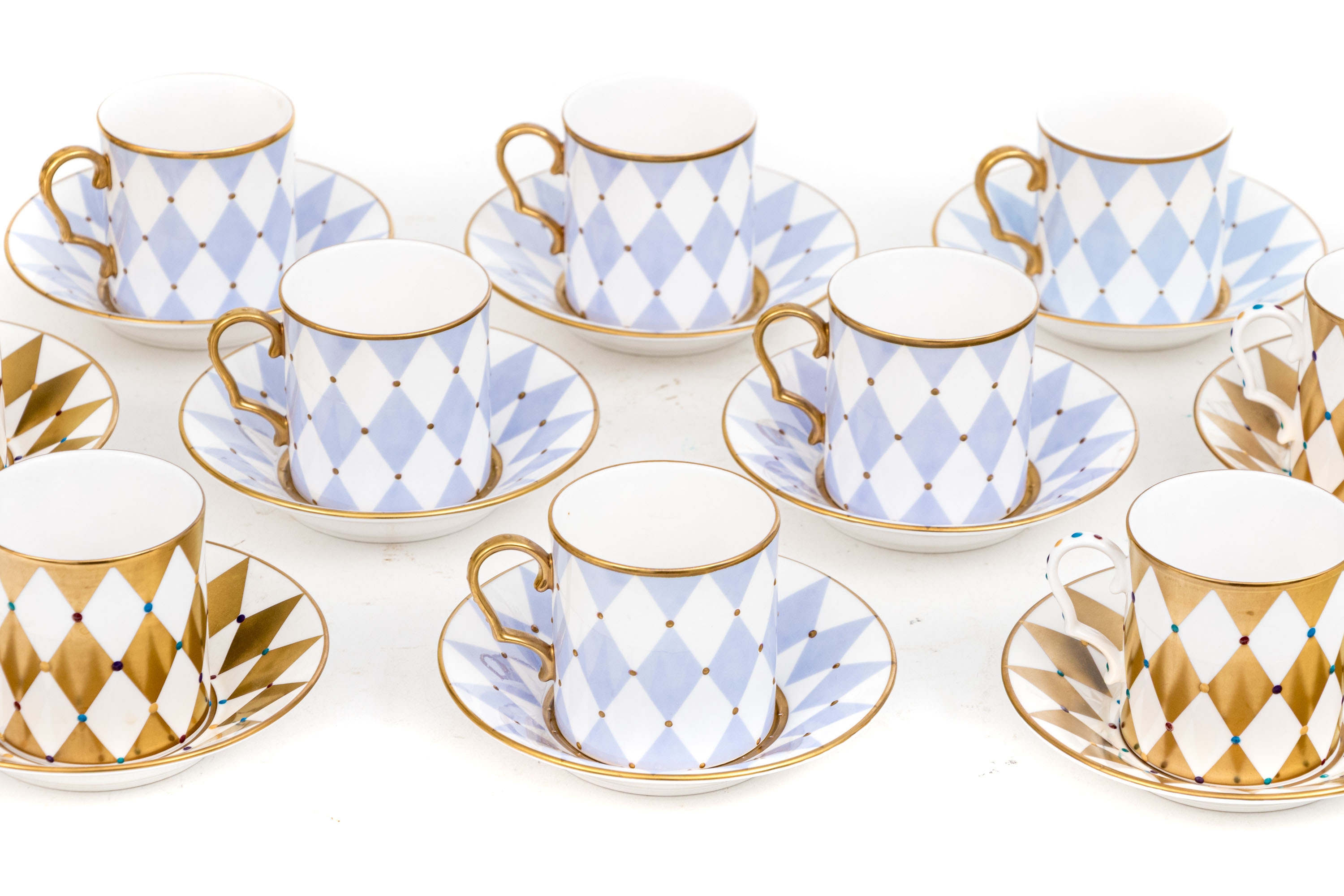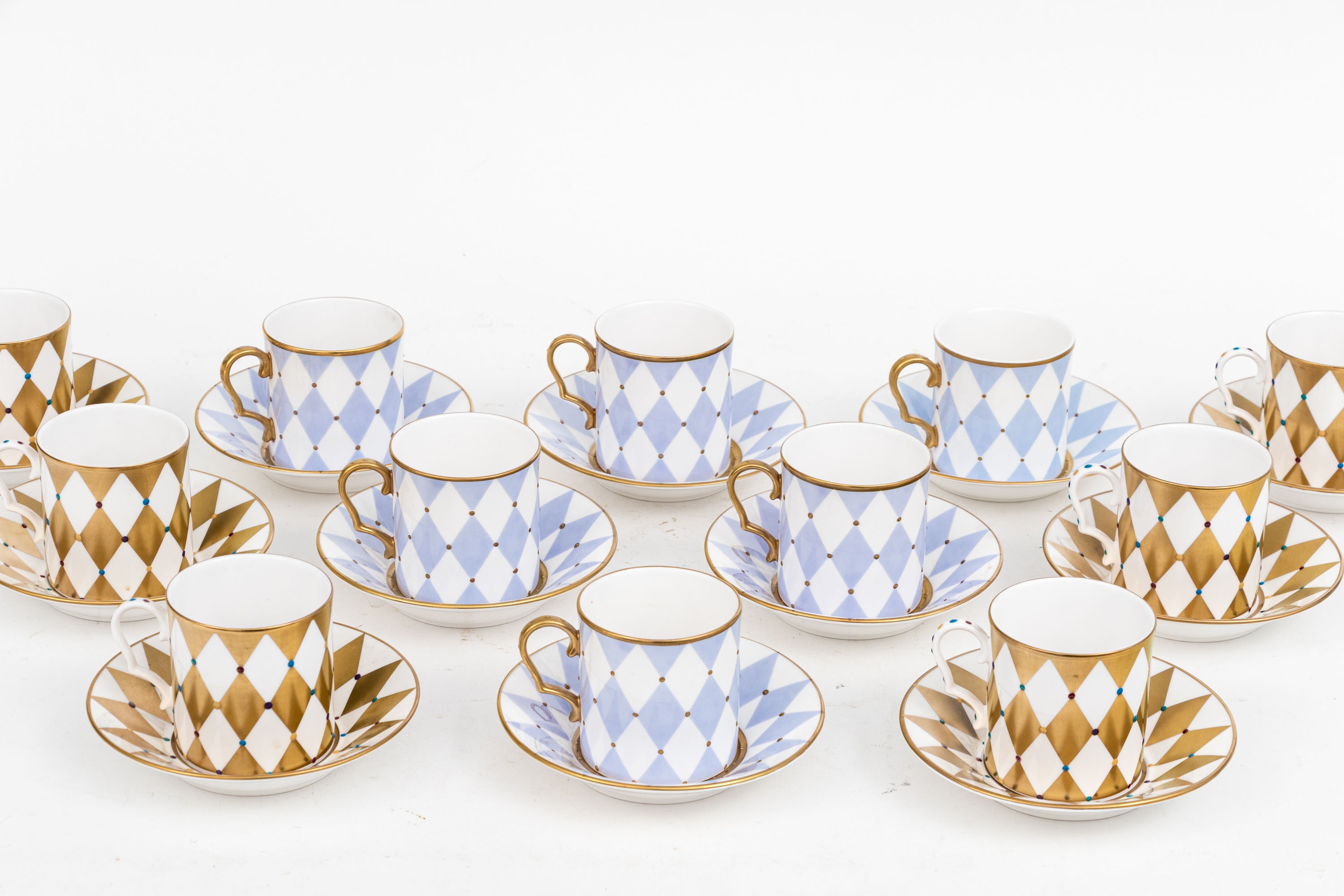 Comprised of 6 blue diamond pattern demitasse cups with 6 blue diamond pattern saucers, together with 6 gold diamond pattern cups and 6 gold diamond pattern saucers.