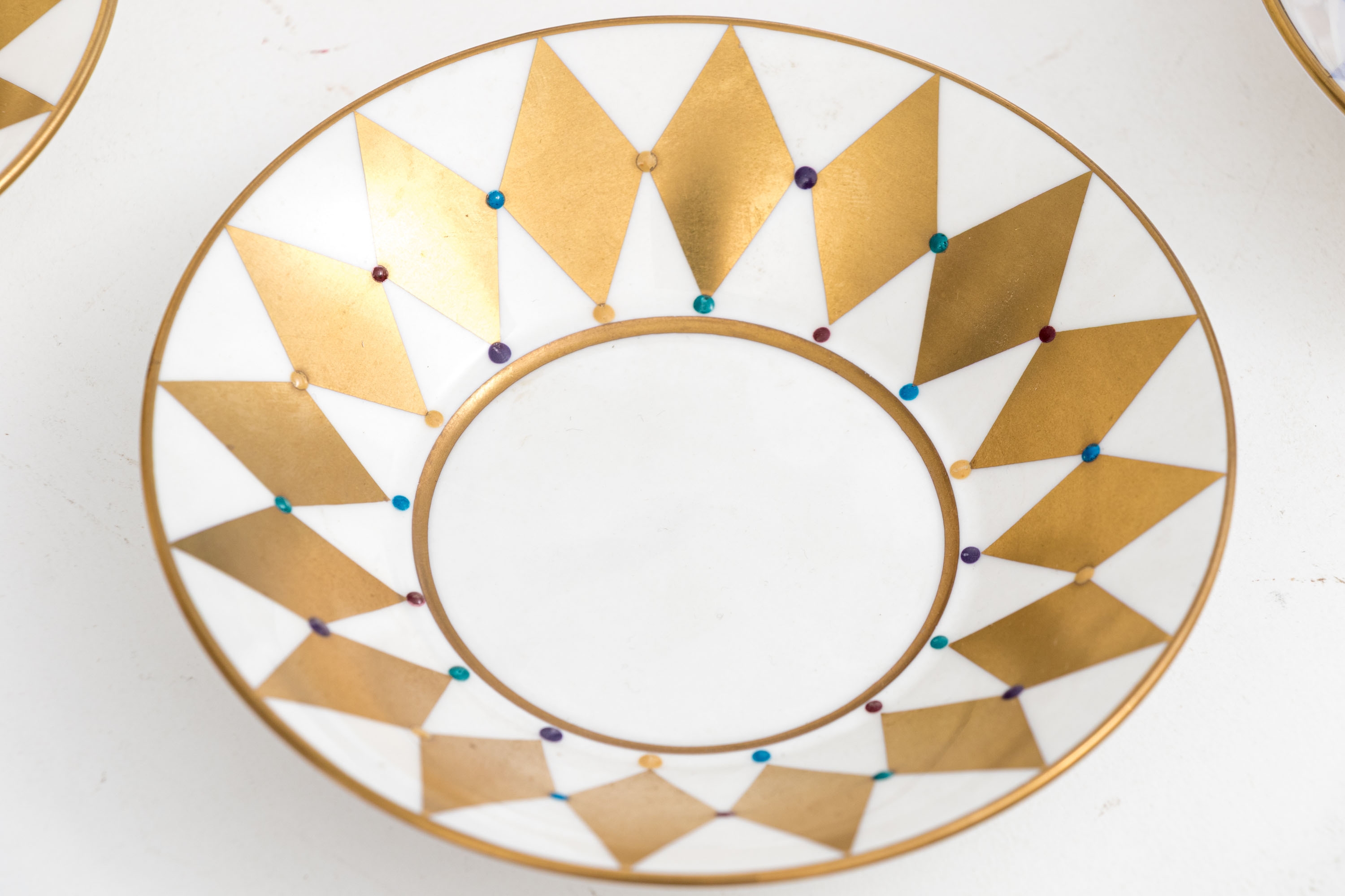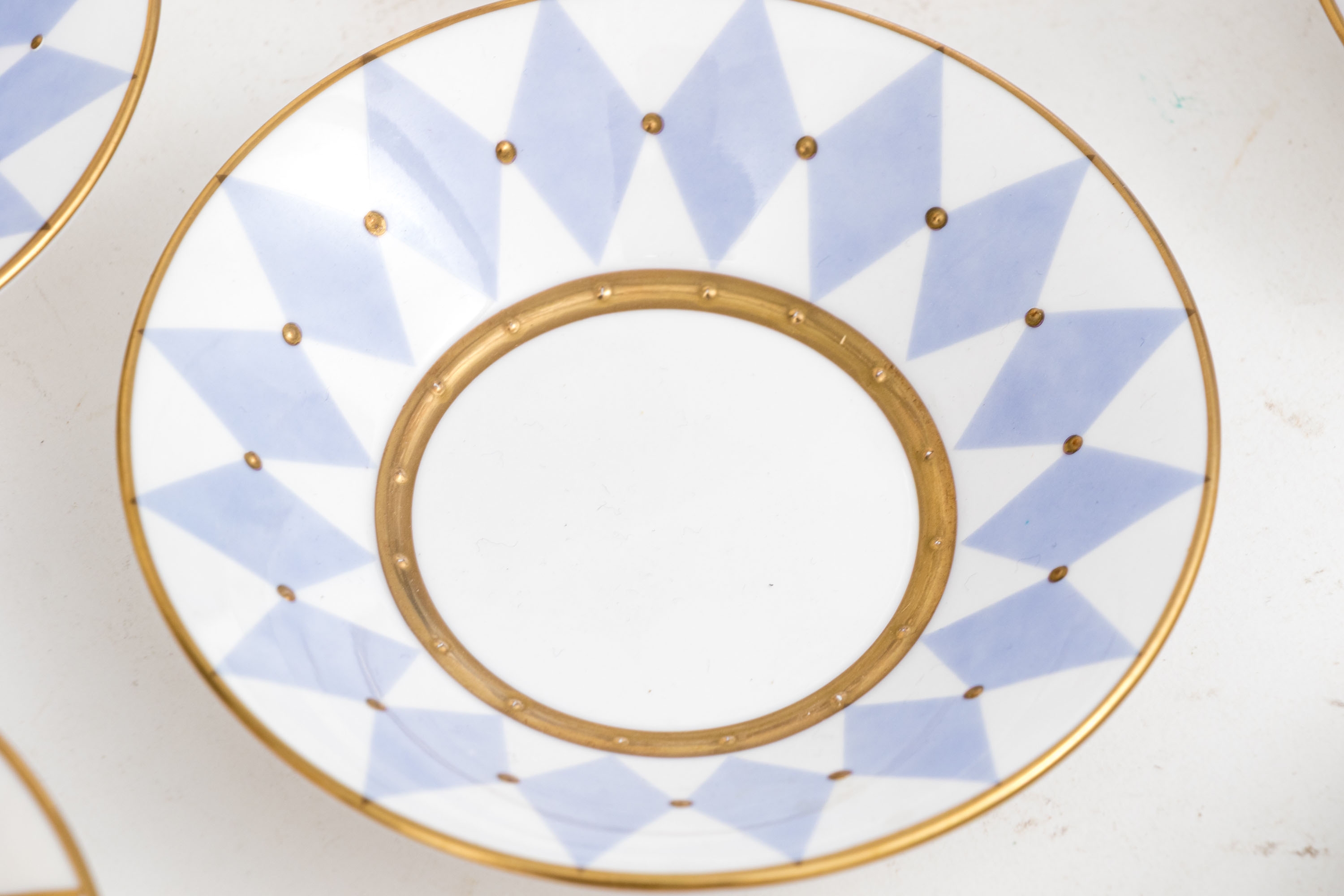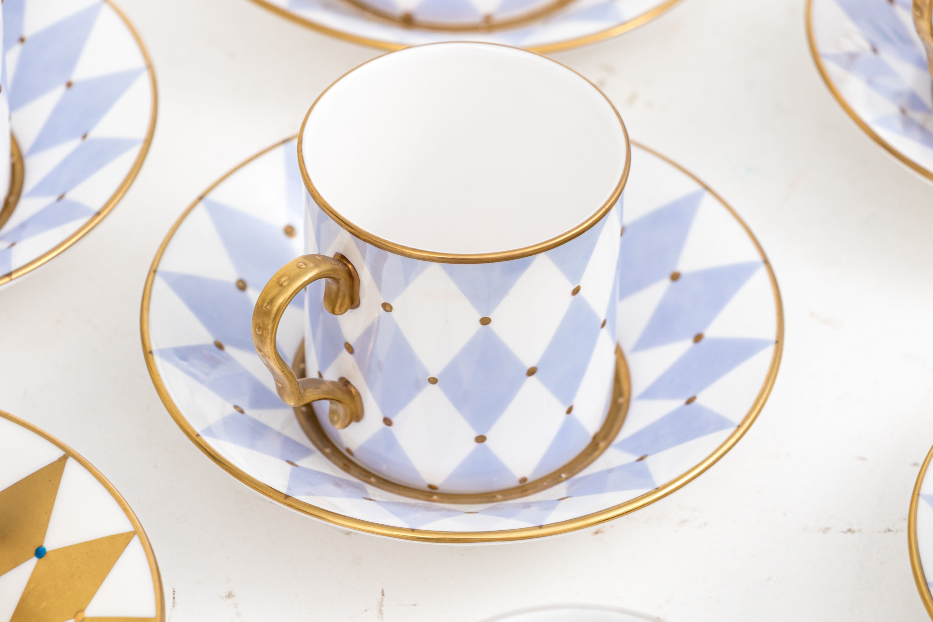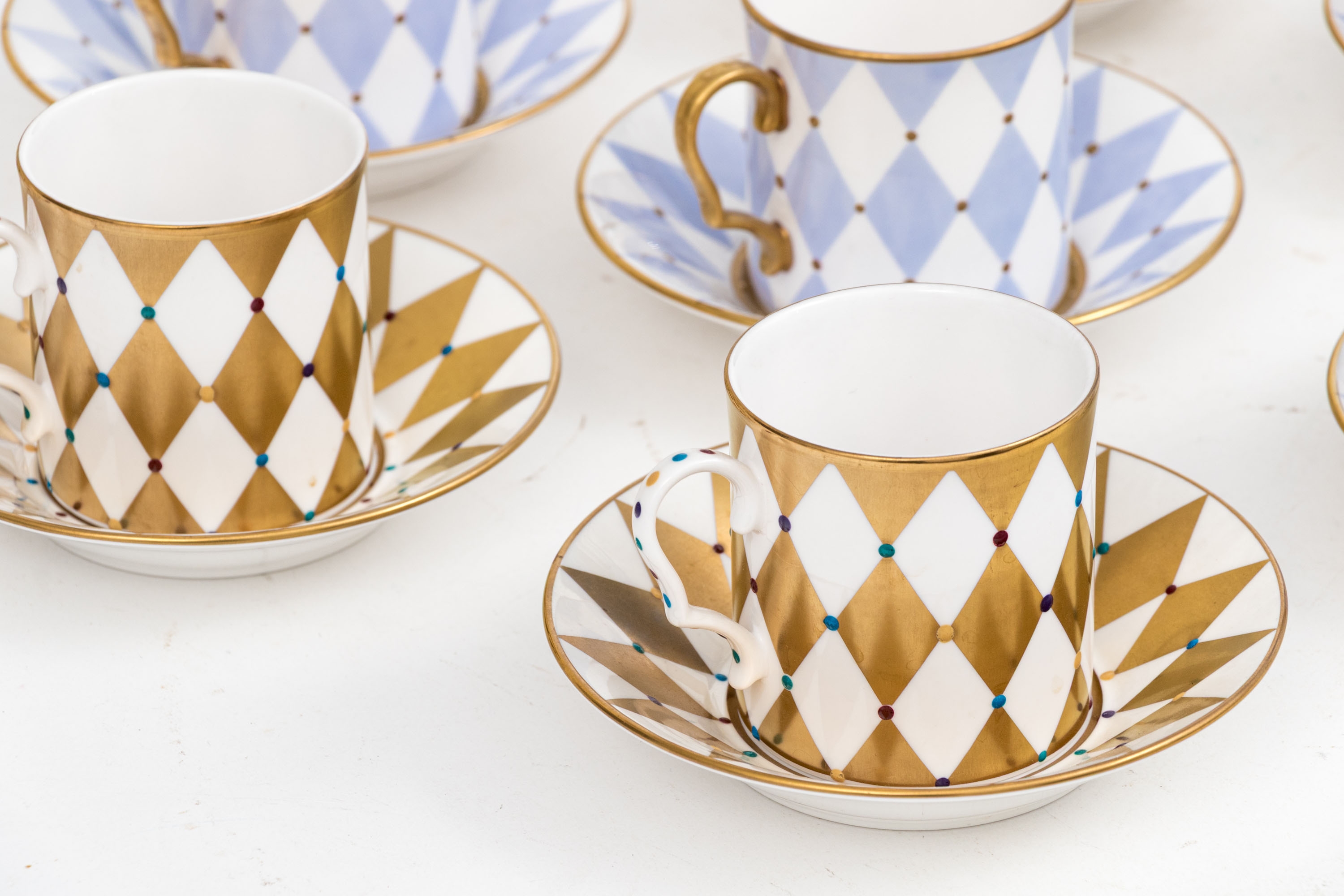 Comprised of 6 blue diamond pattern demitasse cups with 6 blue diamond pattern saucers, together with 6 gold diamond pattern cups and 6 gold diamond pattern saucers.