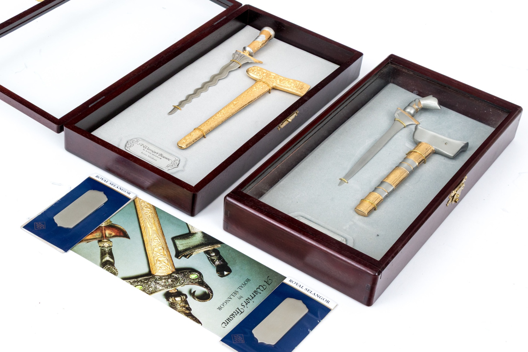 Each with axes and swords of highly ornate decoration. Each comes with custom wood framed and glass paneled display cases.