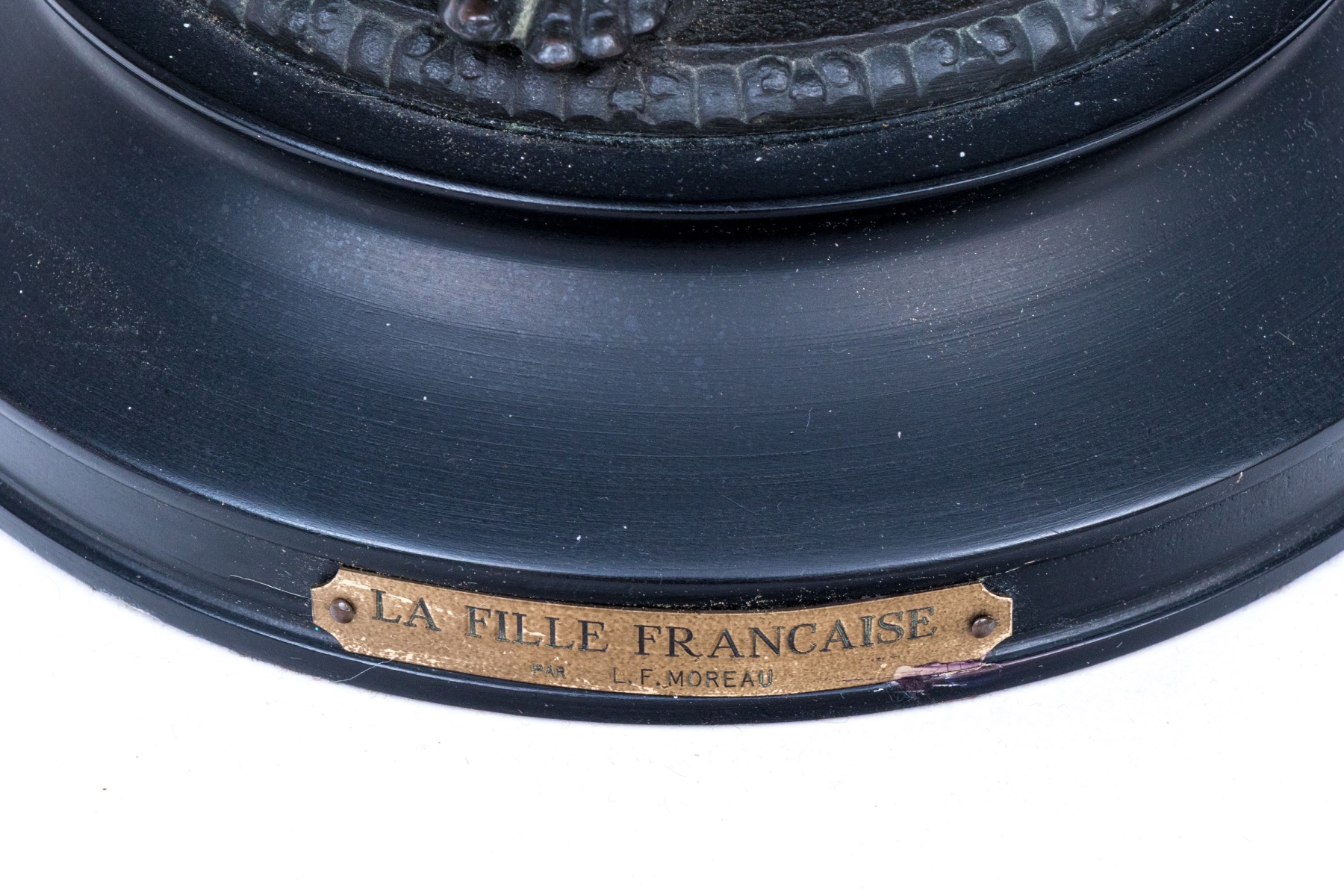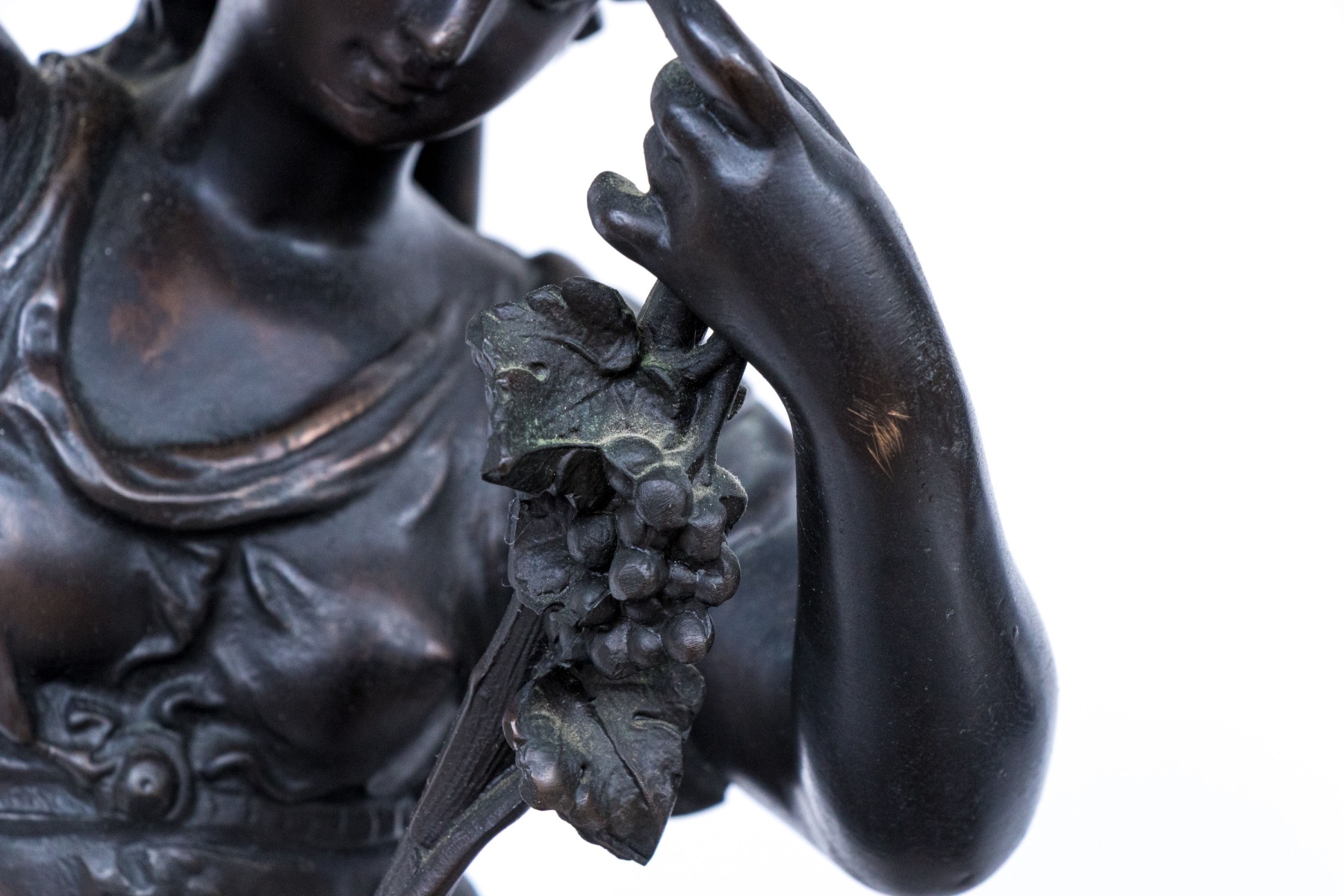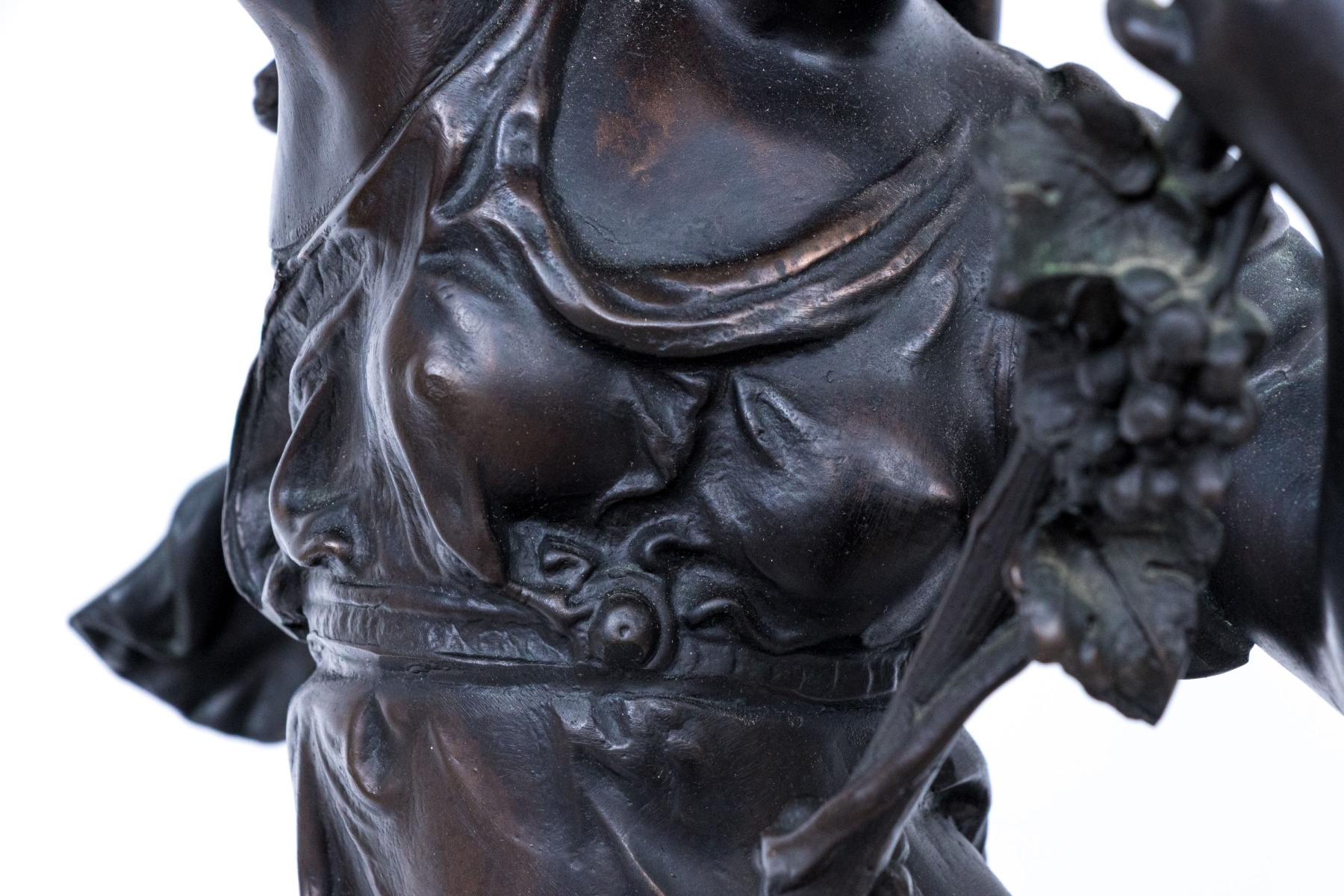 Each on circular black base affixed to the bronzed sculptures, each depicting females in dance like poses holding branches with berries. Surmounted by the light post with nozzle, harp and finials.