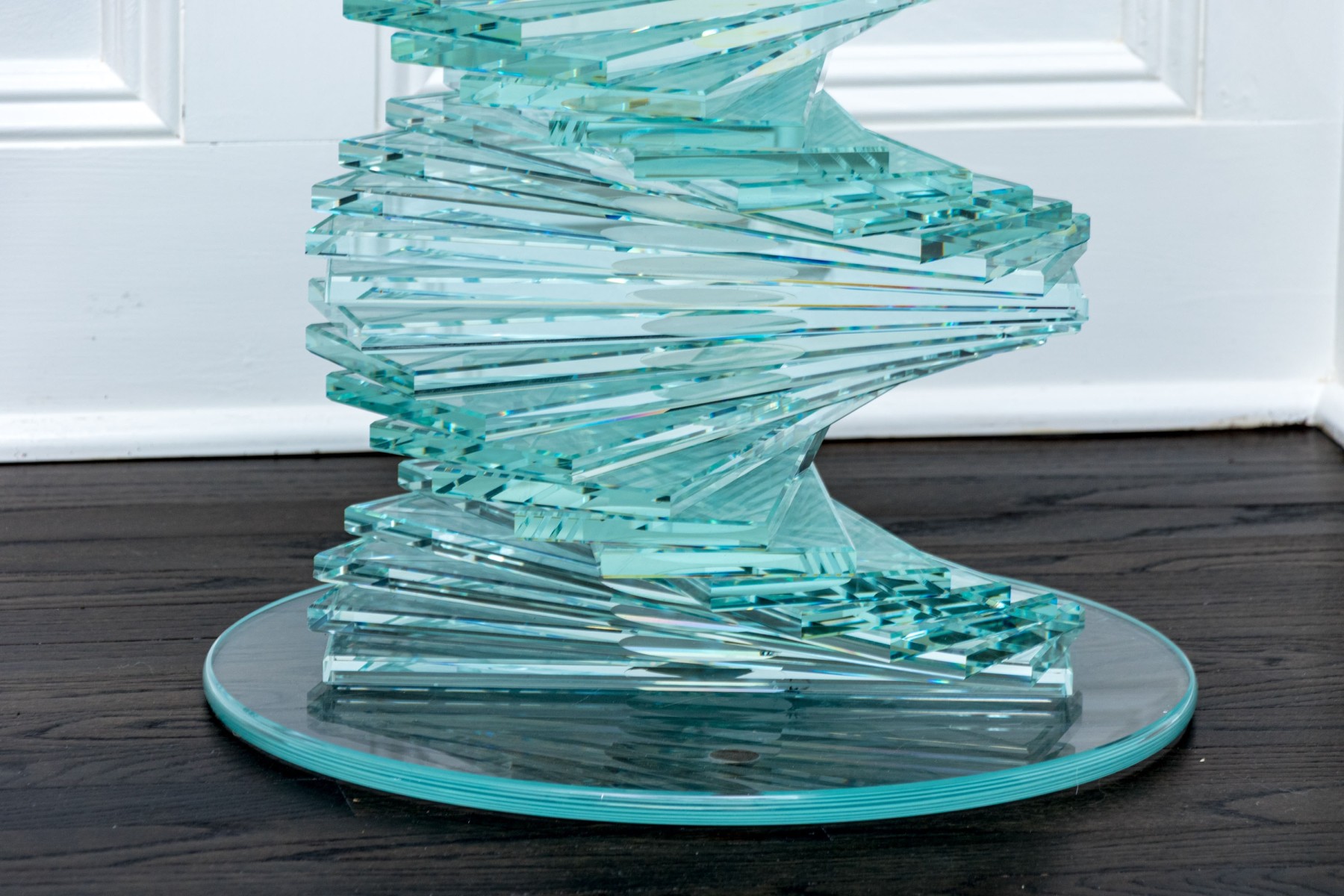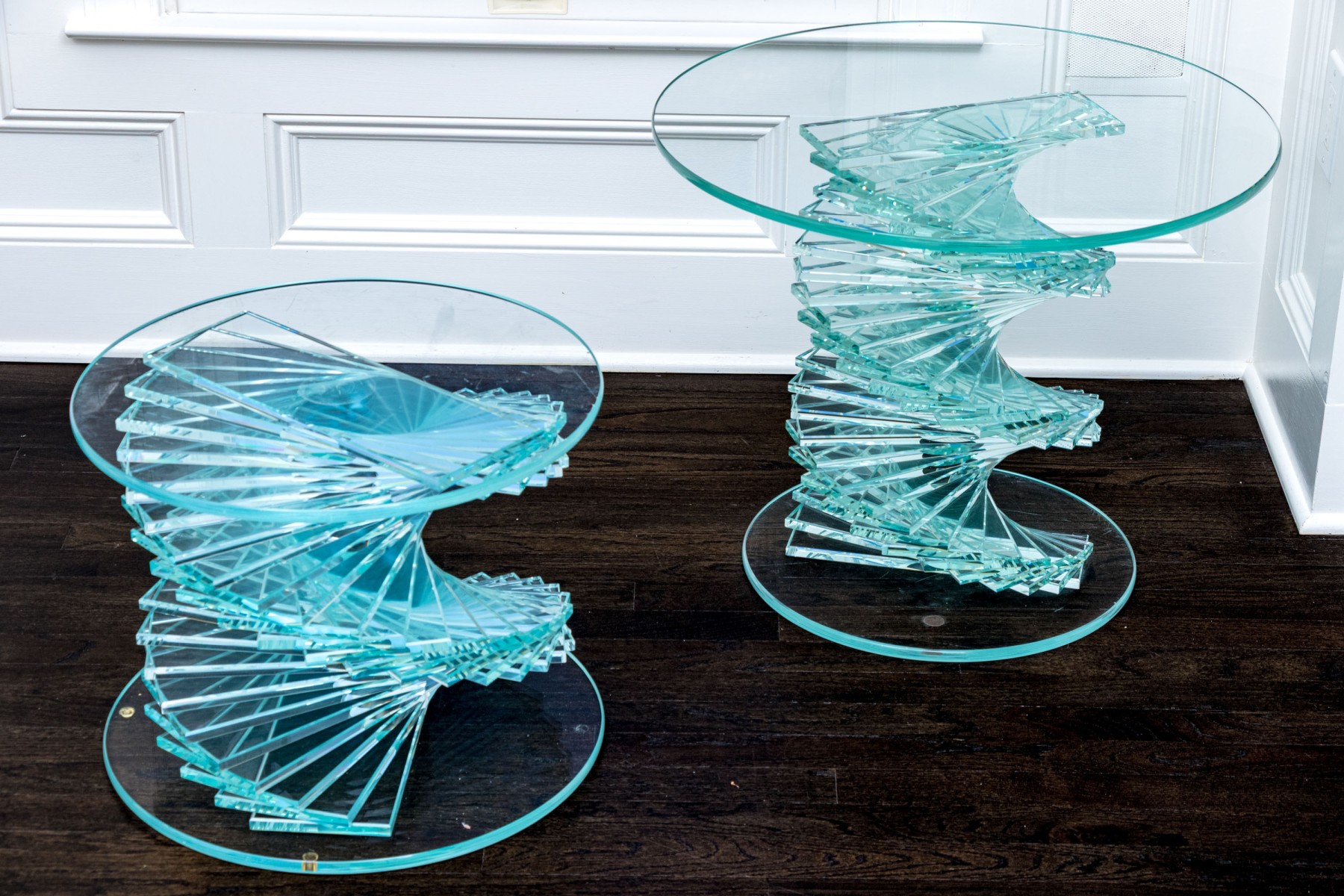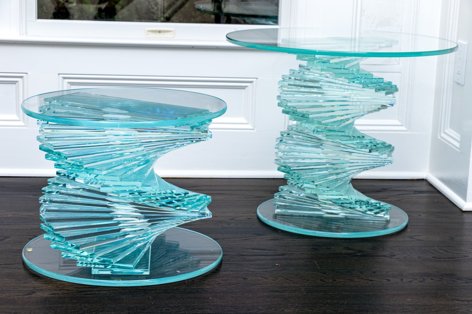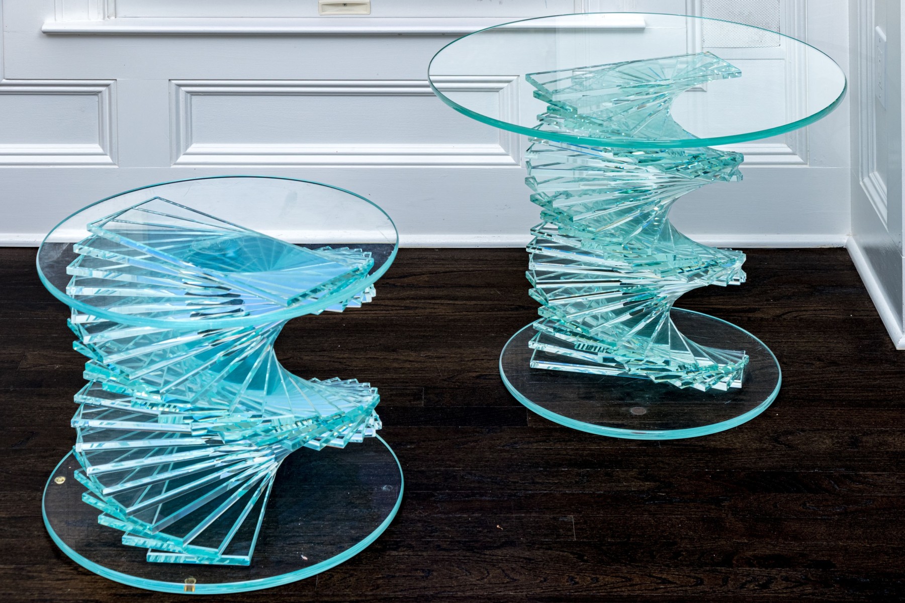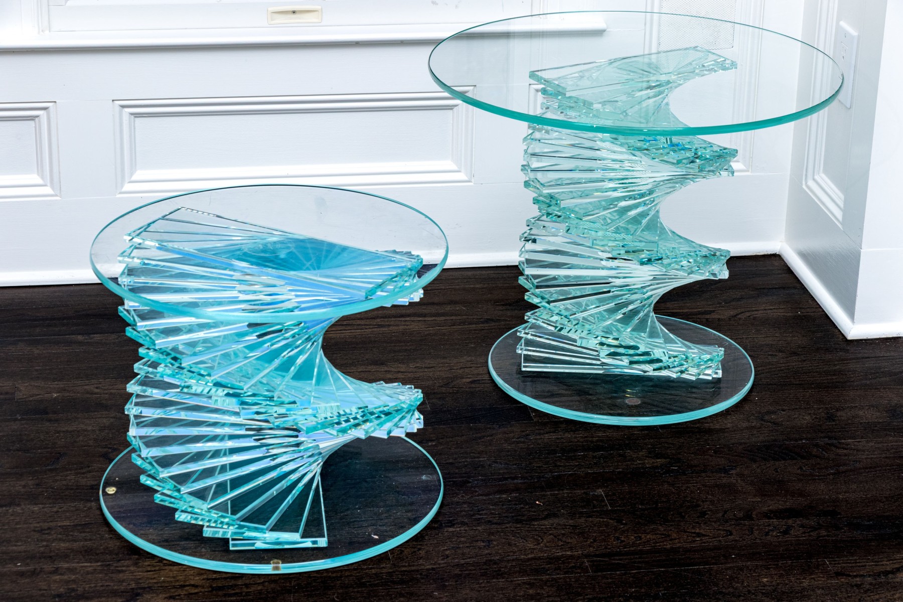 An exceptional pair of glass pedestals with a spiral staircase form pedestals on circular feet, finished with circular glass tops. One is larger and its glass top has been affixed to the pedestal while the smaller shorter table has loose top that can be removed.