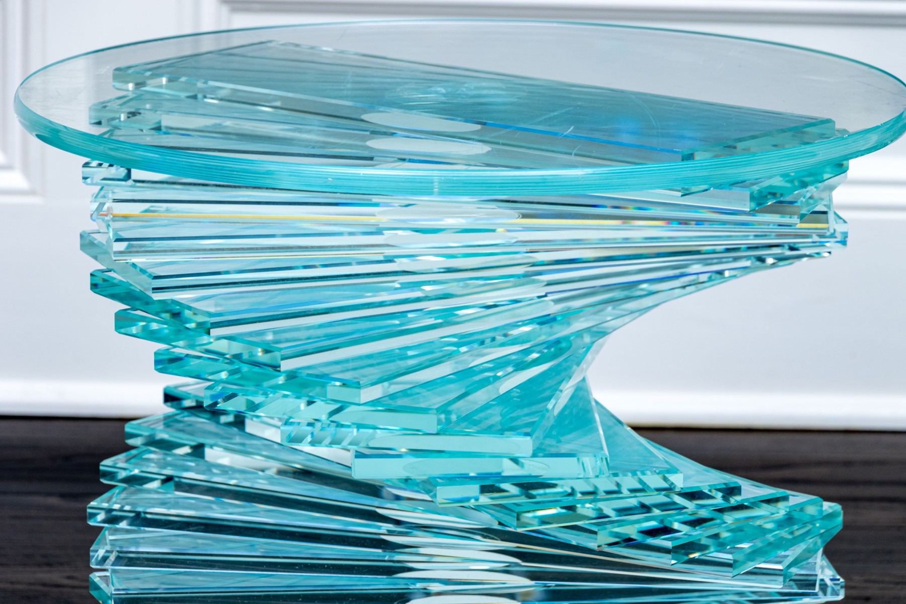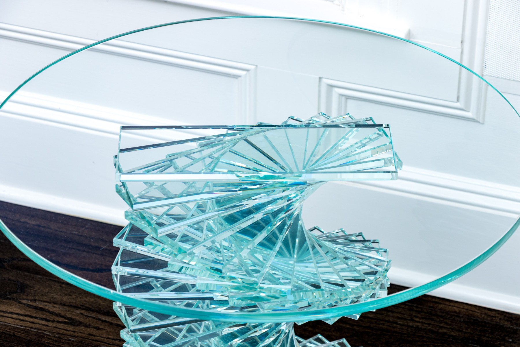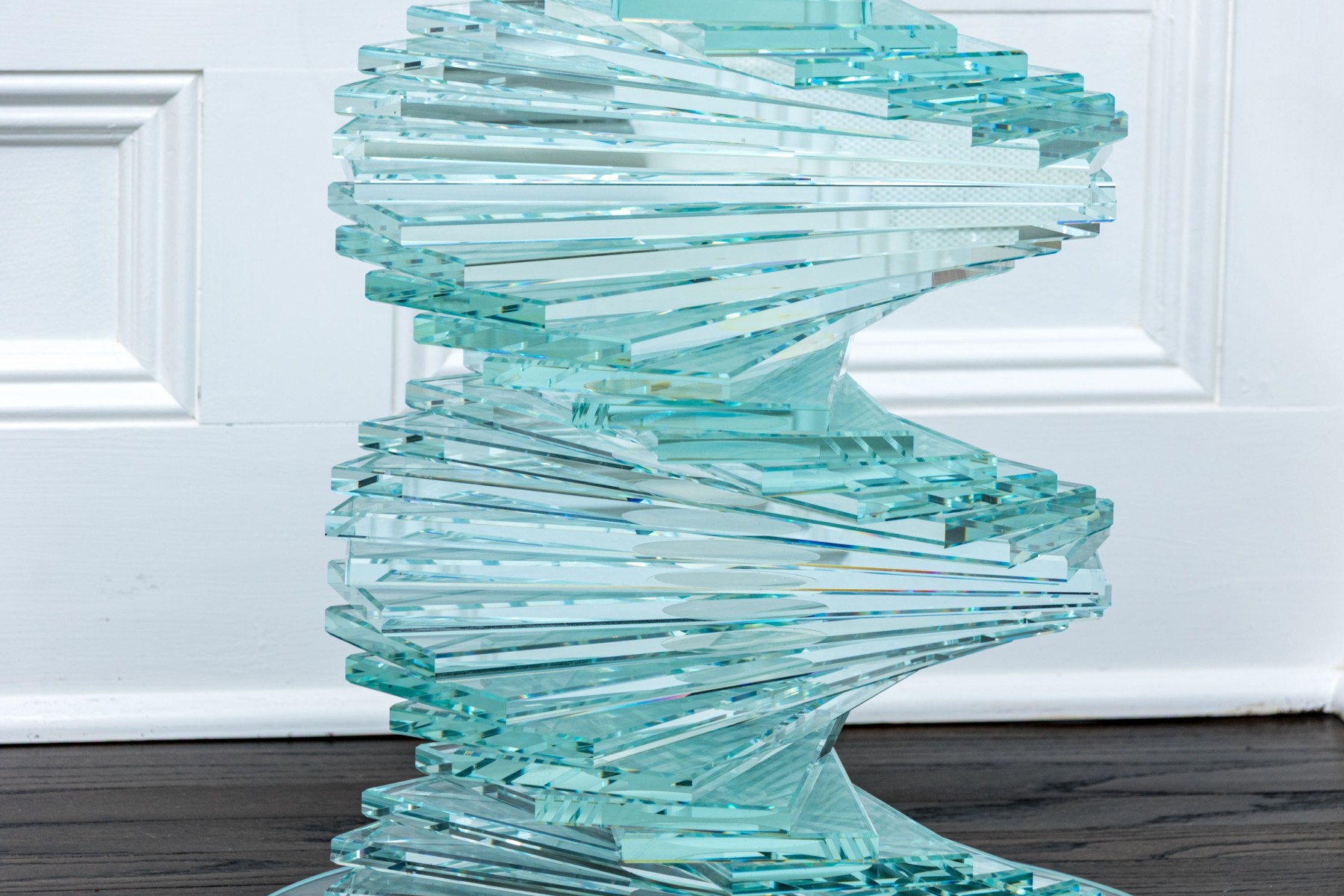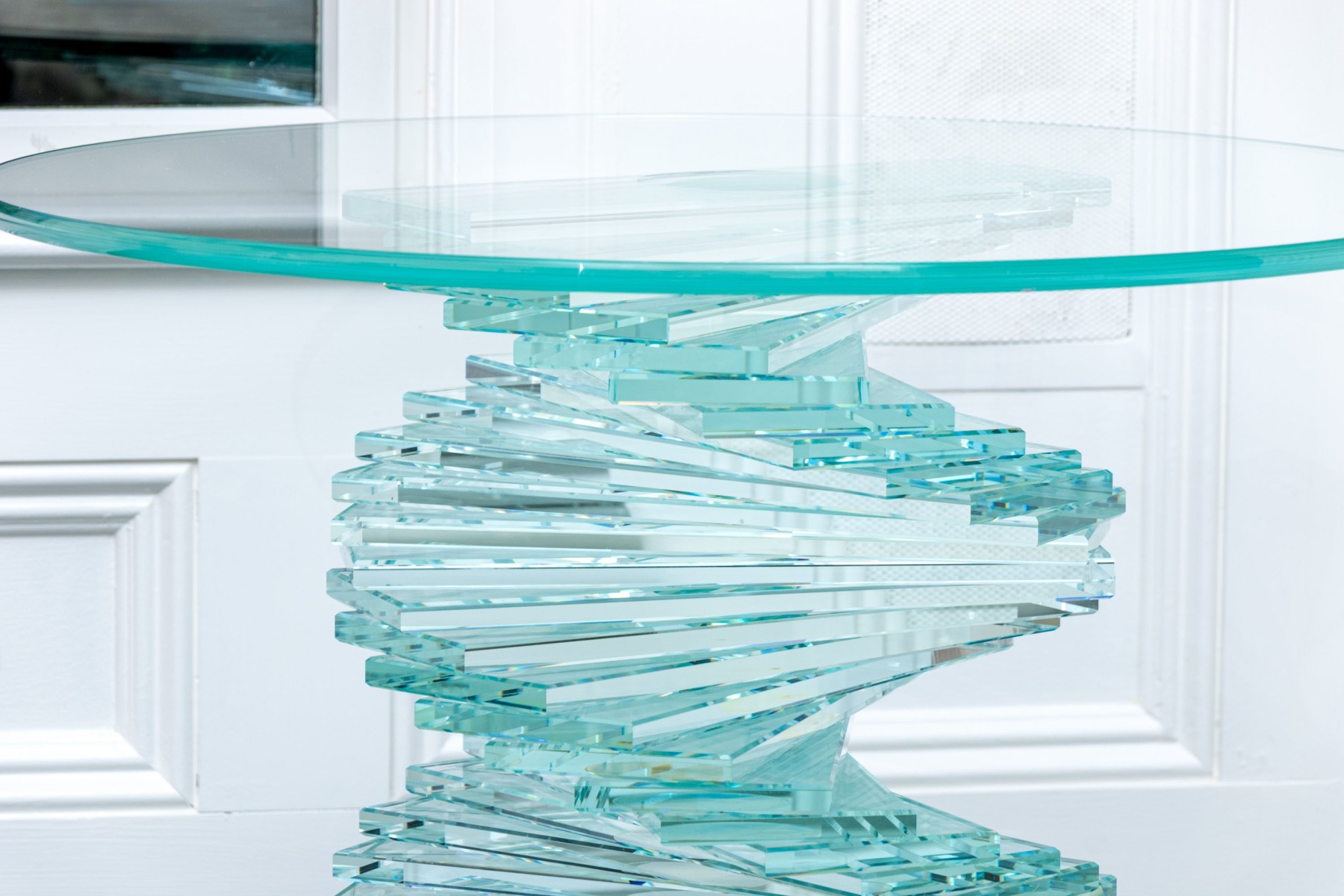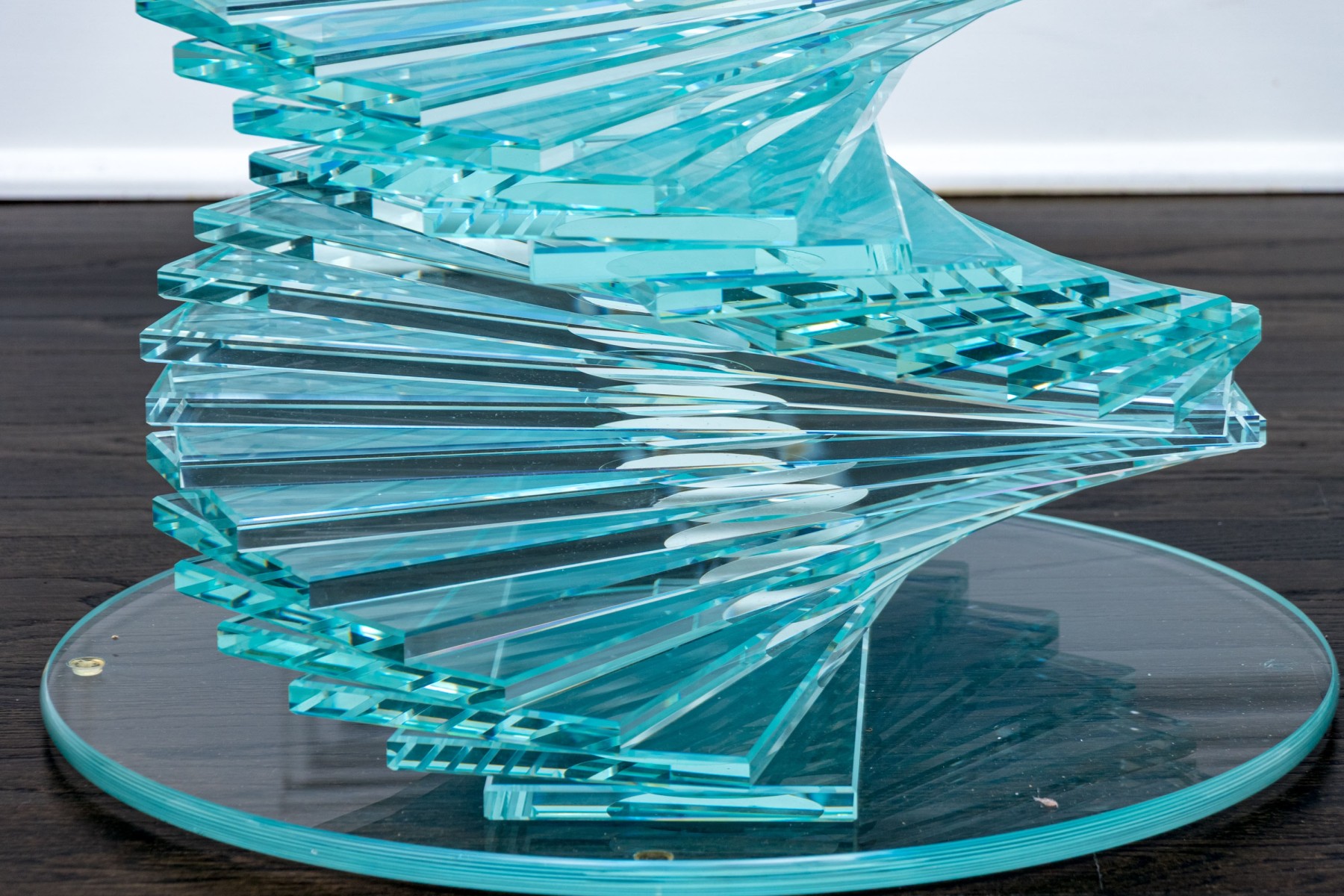 An exceptional pair of glass pedestals with a spiral staircase form pedestals on circular feet, finished with circular glass tops. One is larger and its glass top has been affixed to the pedestal while the smaller shorter table has loose top that can be removed.