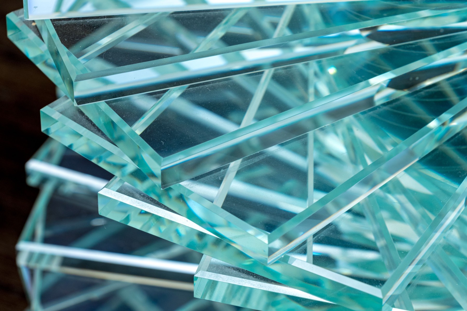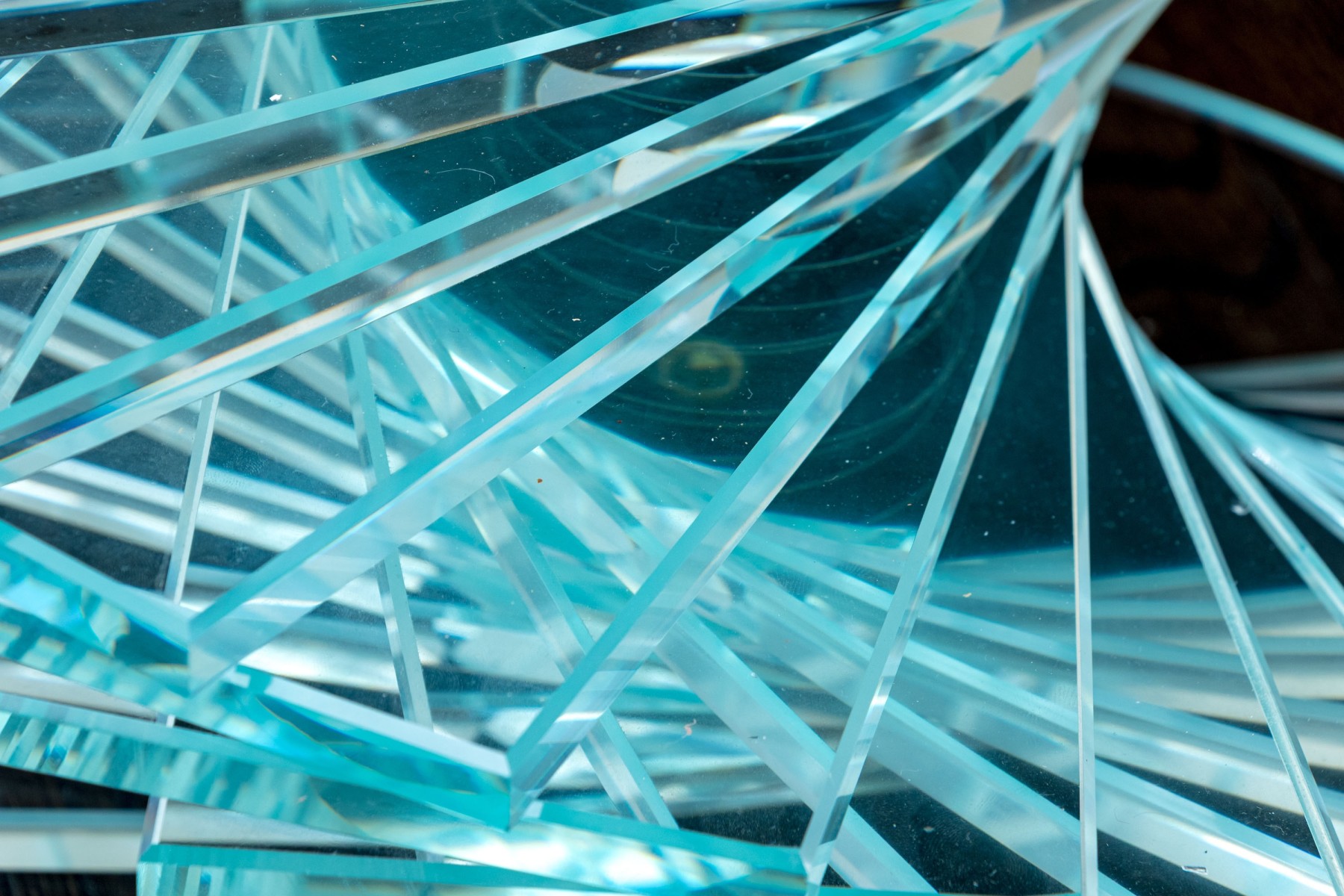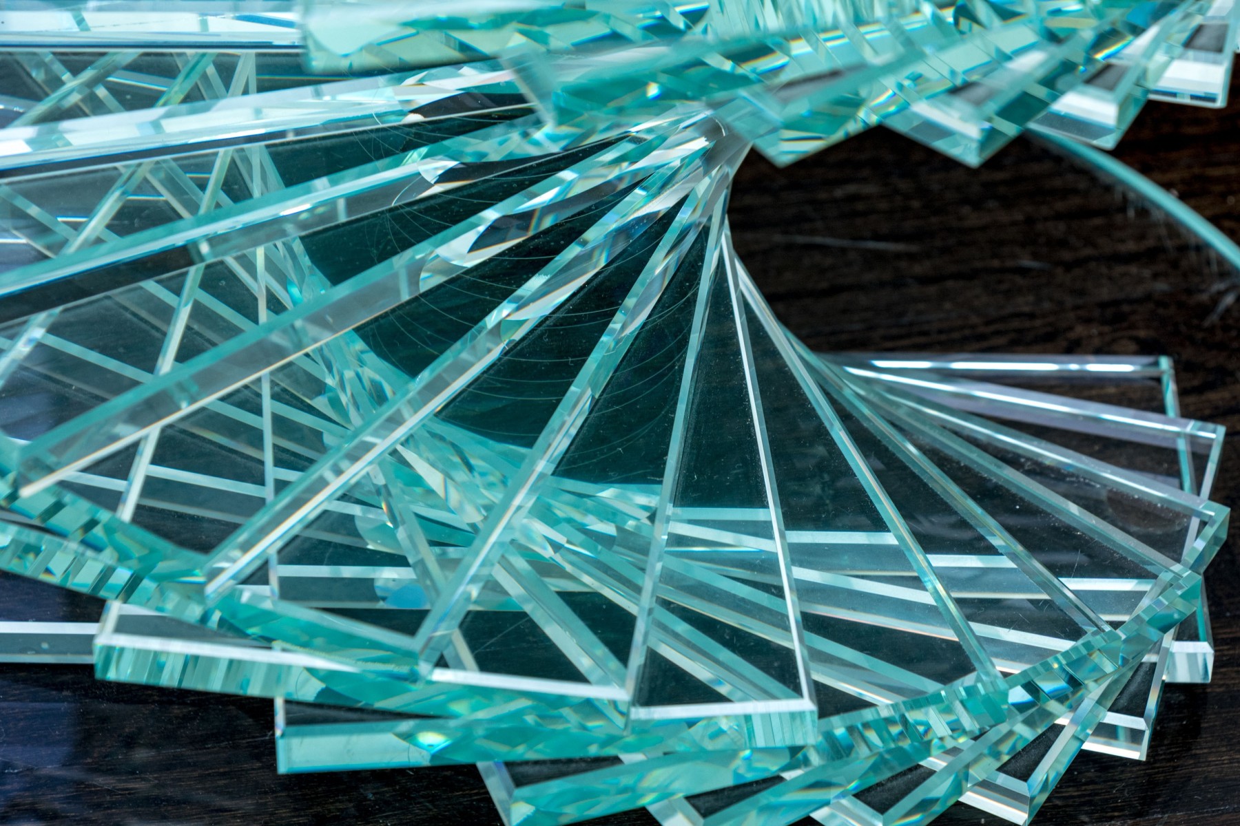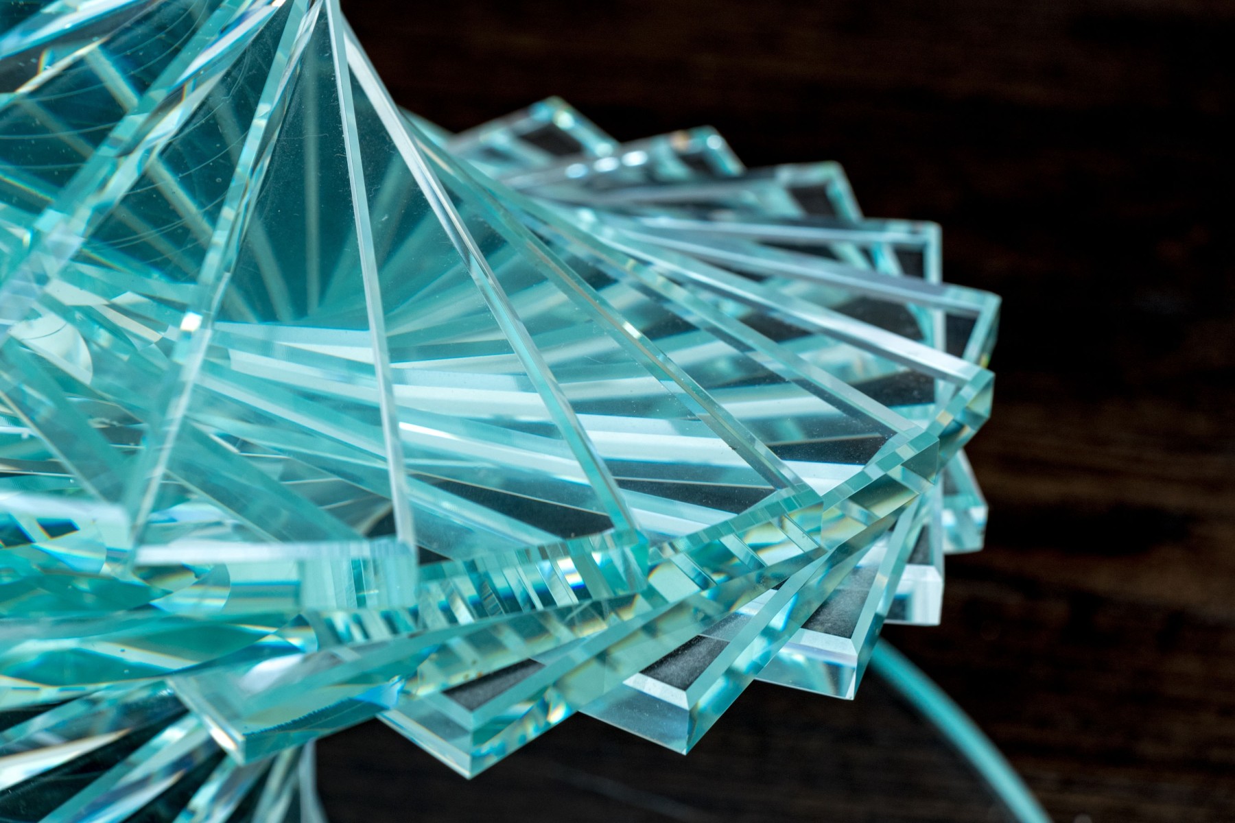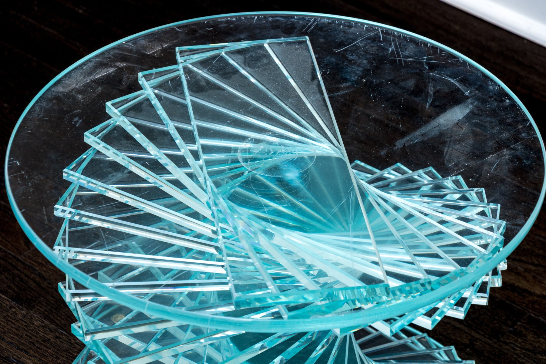 An exceptional pair of glass pedestals with a spiral staircase form pedestals on circular feet, finished with circular glass tops. One is larger and its glass top has been affixed to the pedestal while the smaller shorter table has loose top that can be removed.