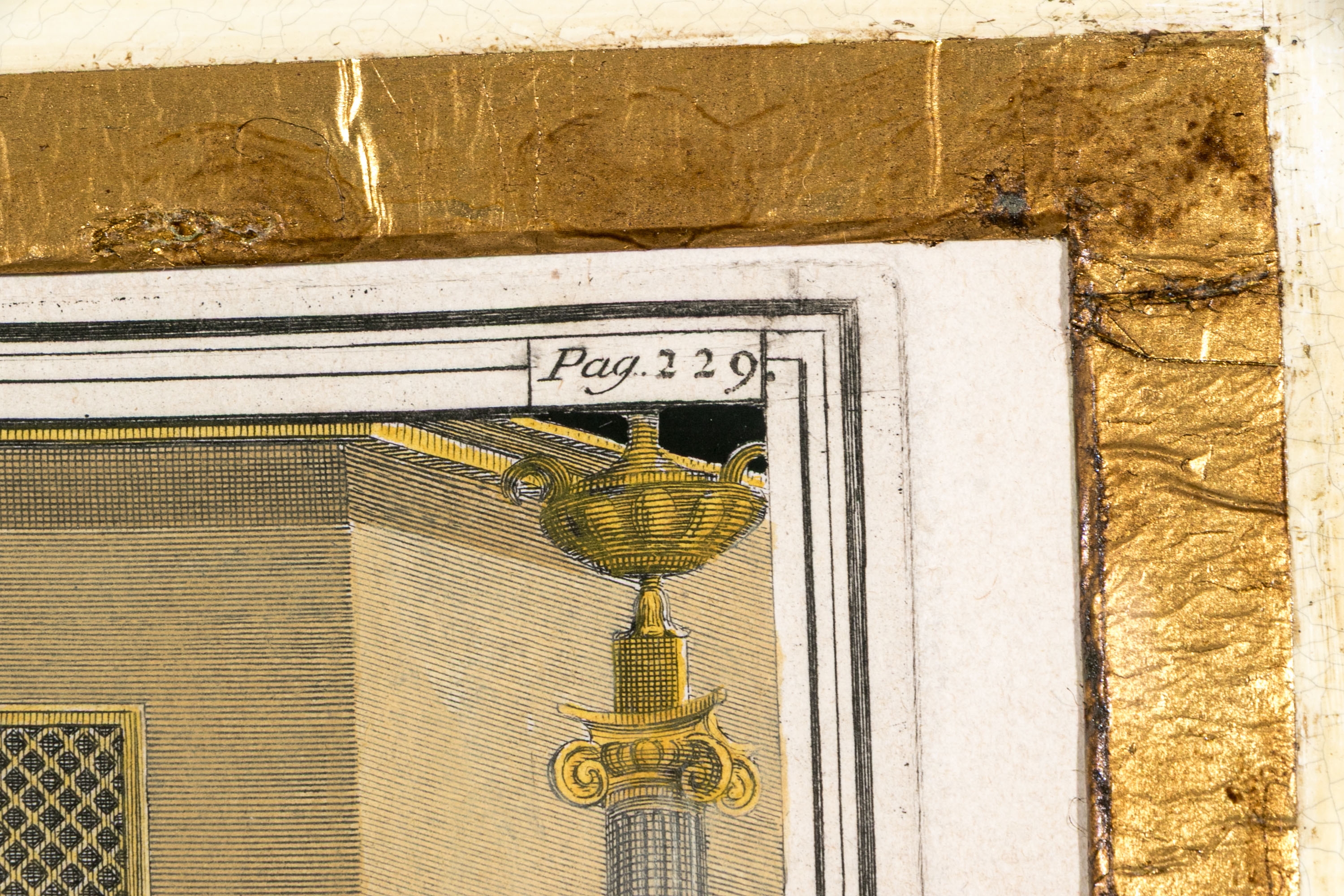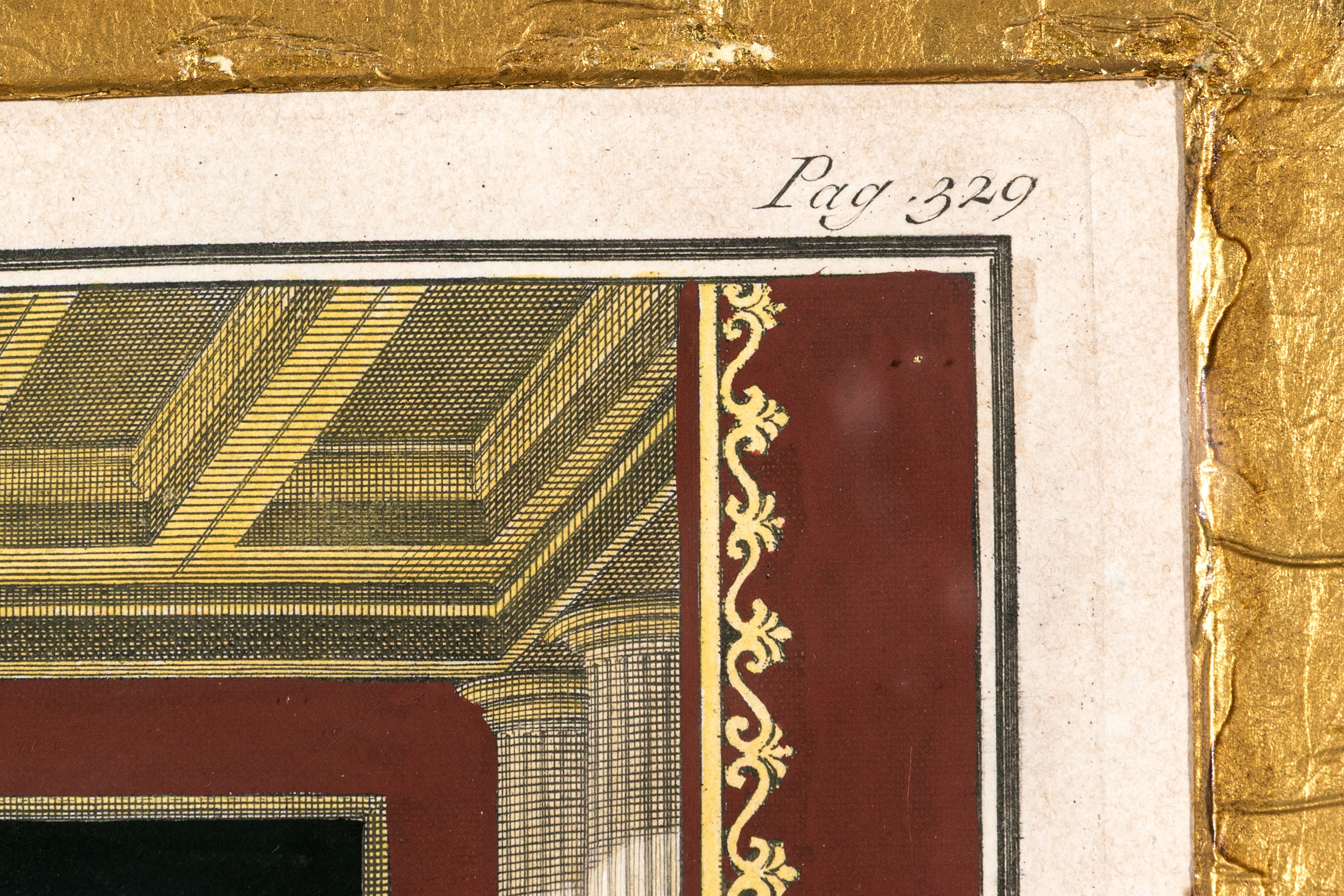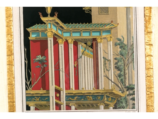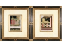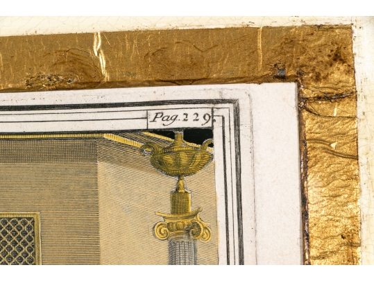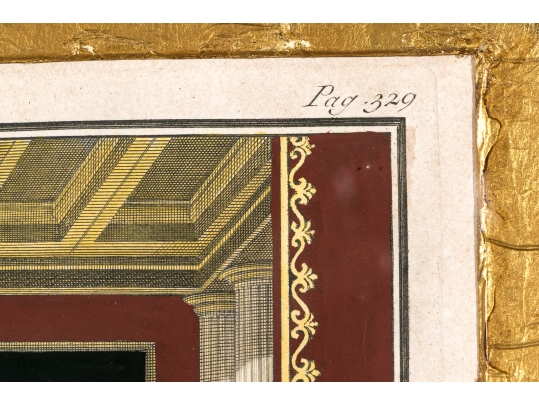 An exceptionally custom framed set of two hand-colored 18th C. engravings on paper. The hand-colored prints depict architectural interior and exterior settings. The two book plate prints include plates number Pag 229, and Pag 329.