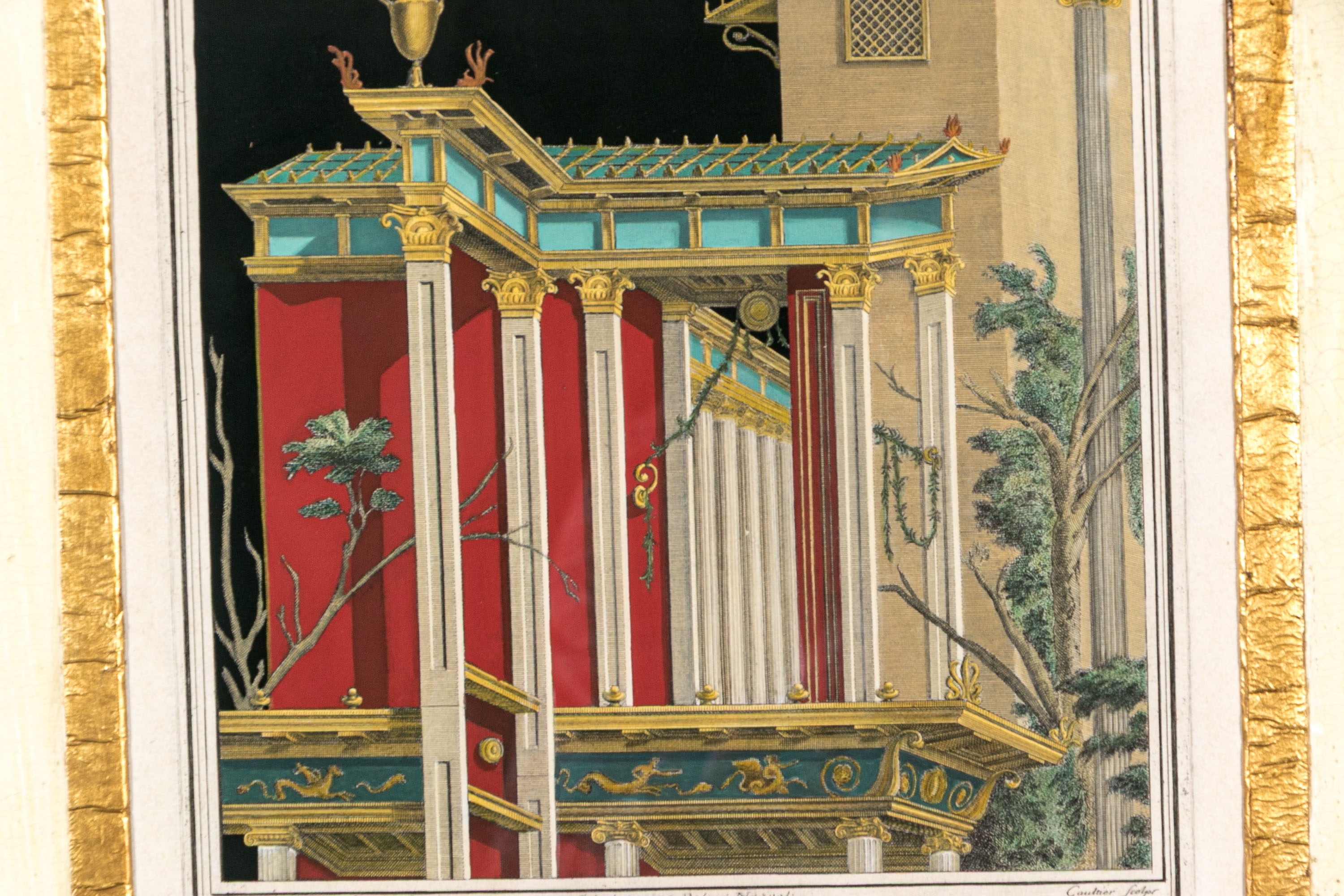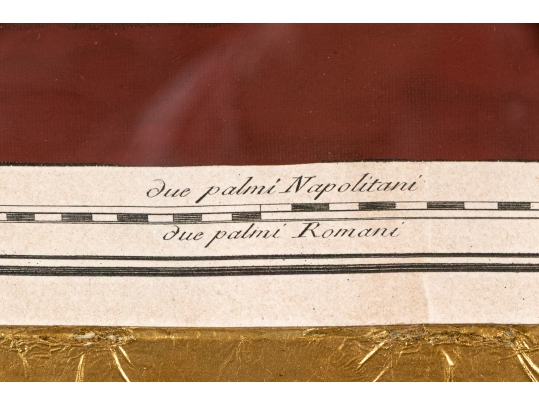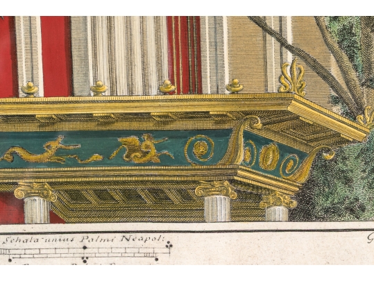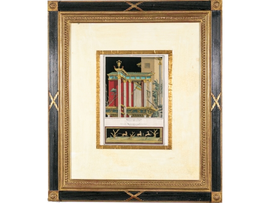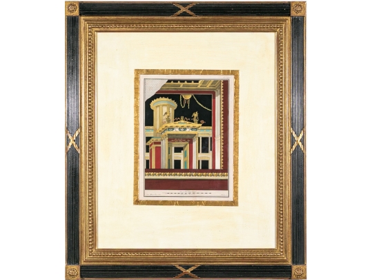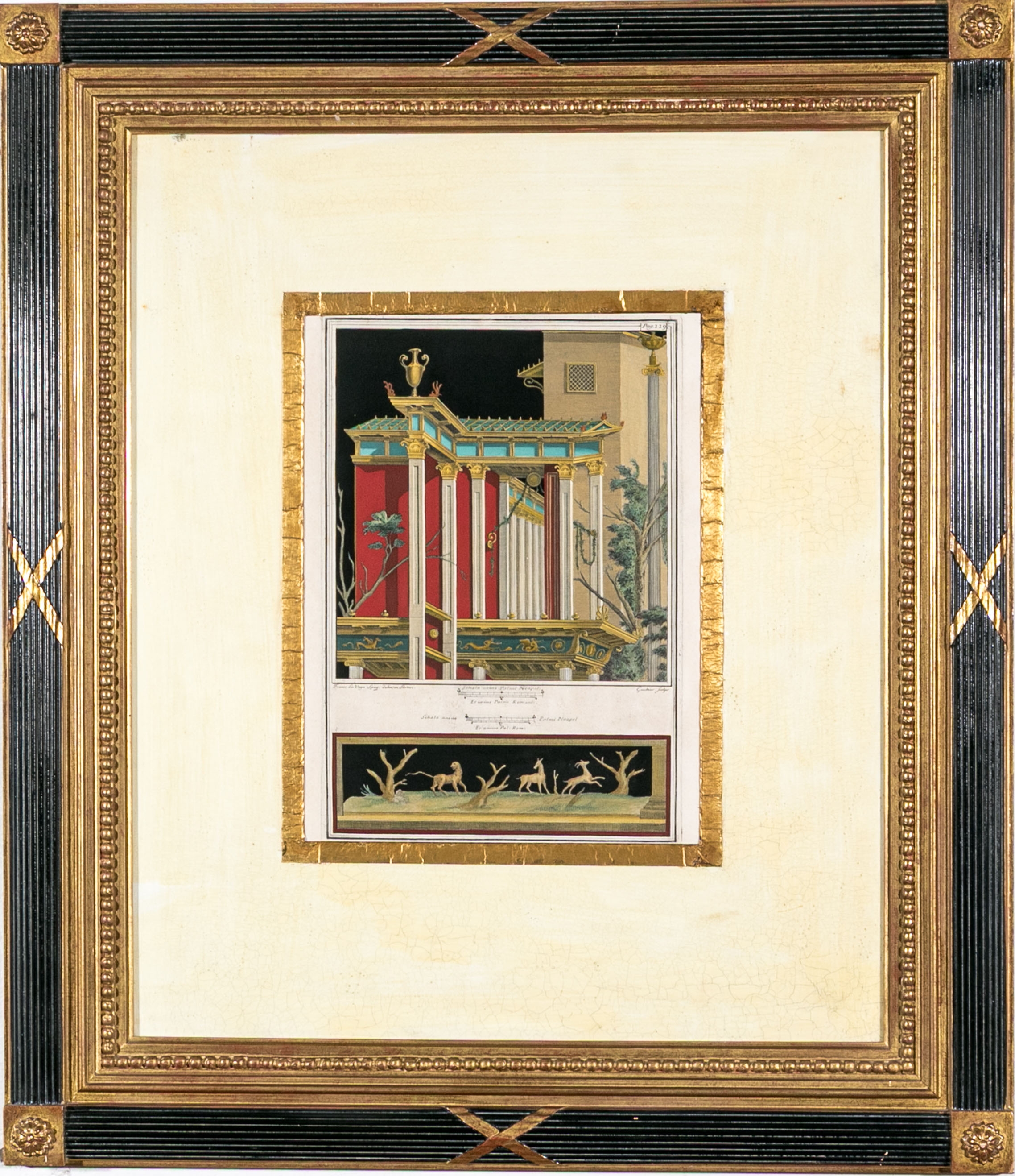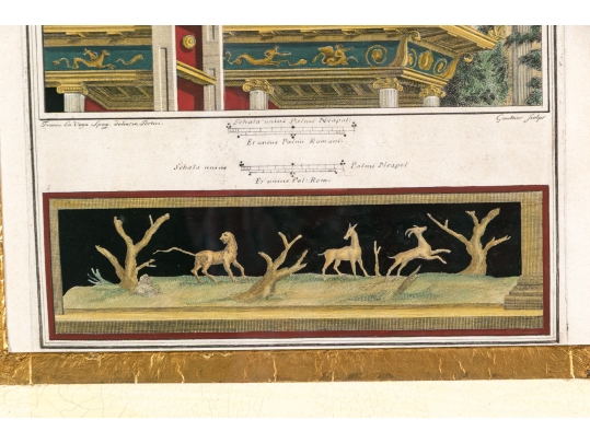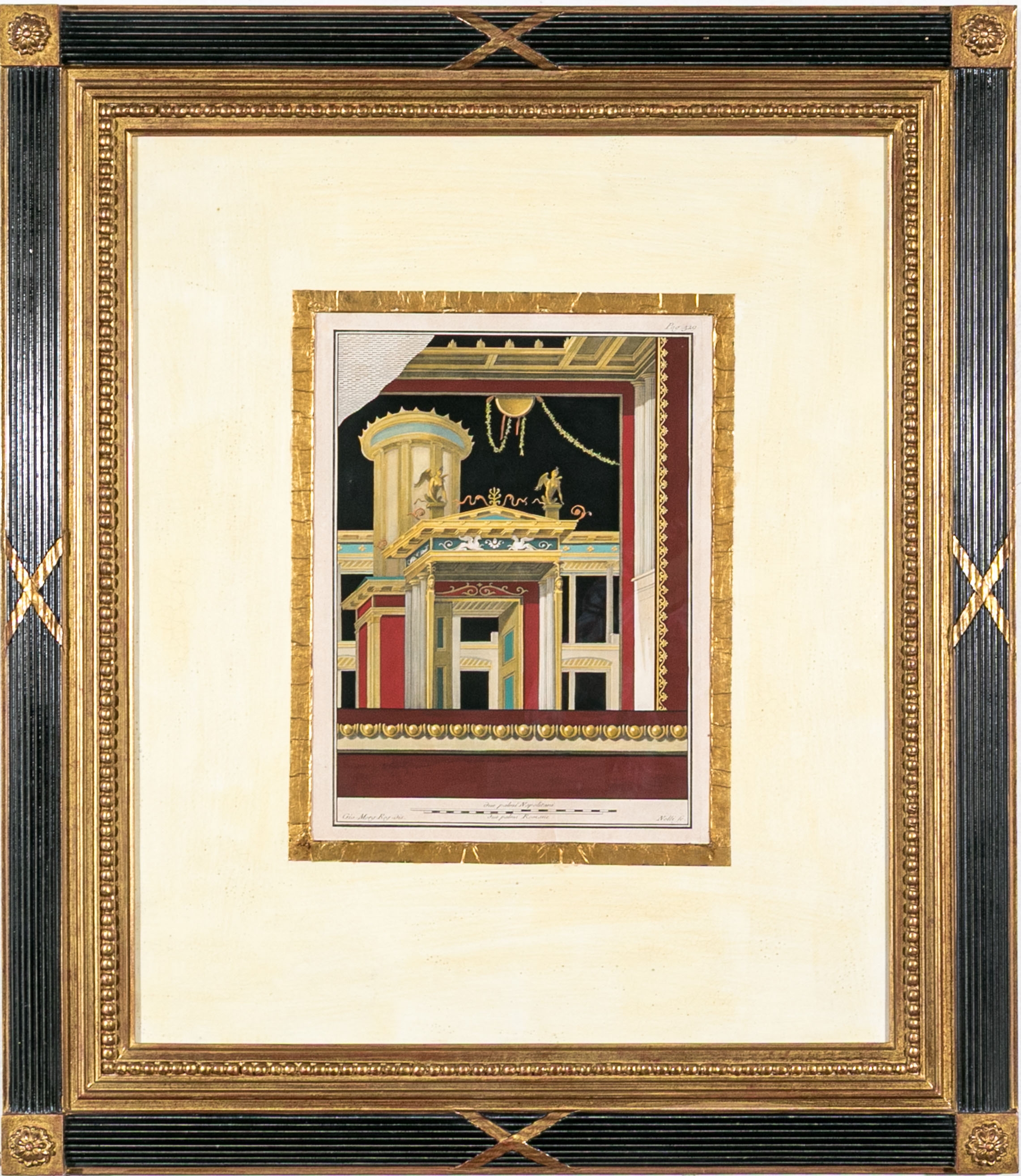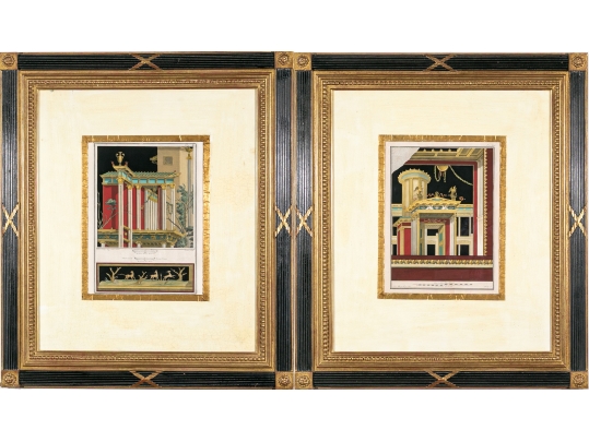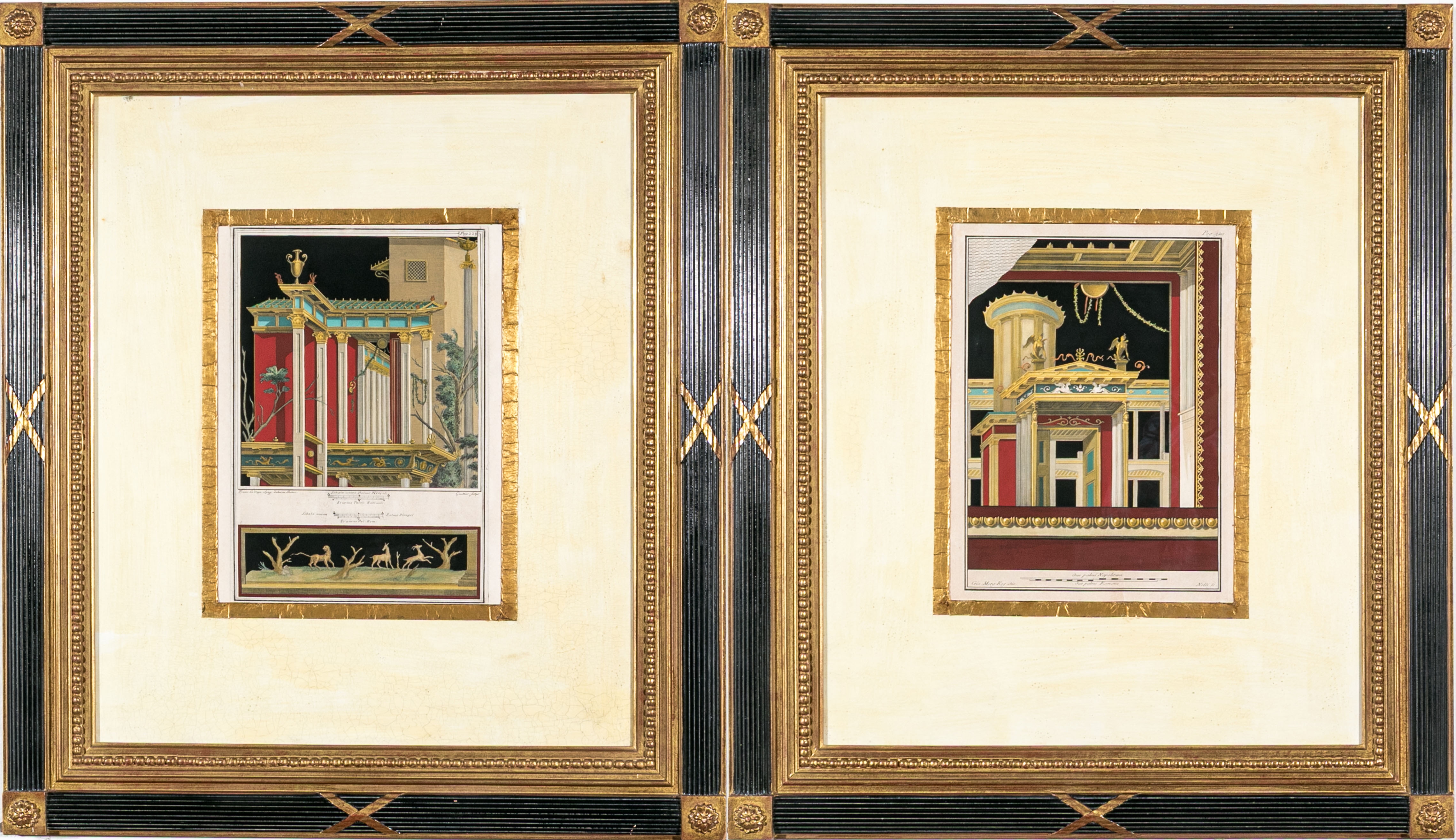 Each of the antique hand-colored engravings are exceptionally custom framed. presented with gold leaf borders surrounding the artwork, with hand-painted mats, in fabulously carved wood and gesso frames with gilt and ebonized finishes having neoclassical columns in ebonized finish with interior beaded and carved gilt finish. Additionally each corner of the frame with gilt finish and carved medallions seen in relief.