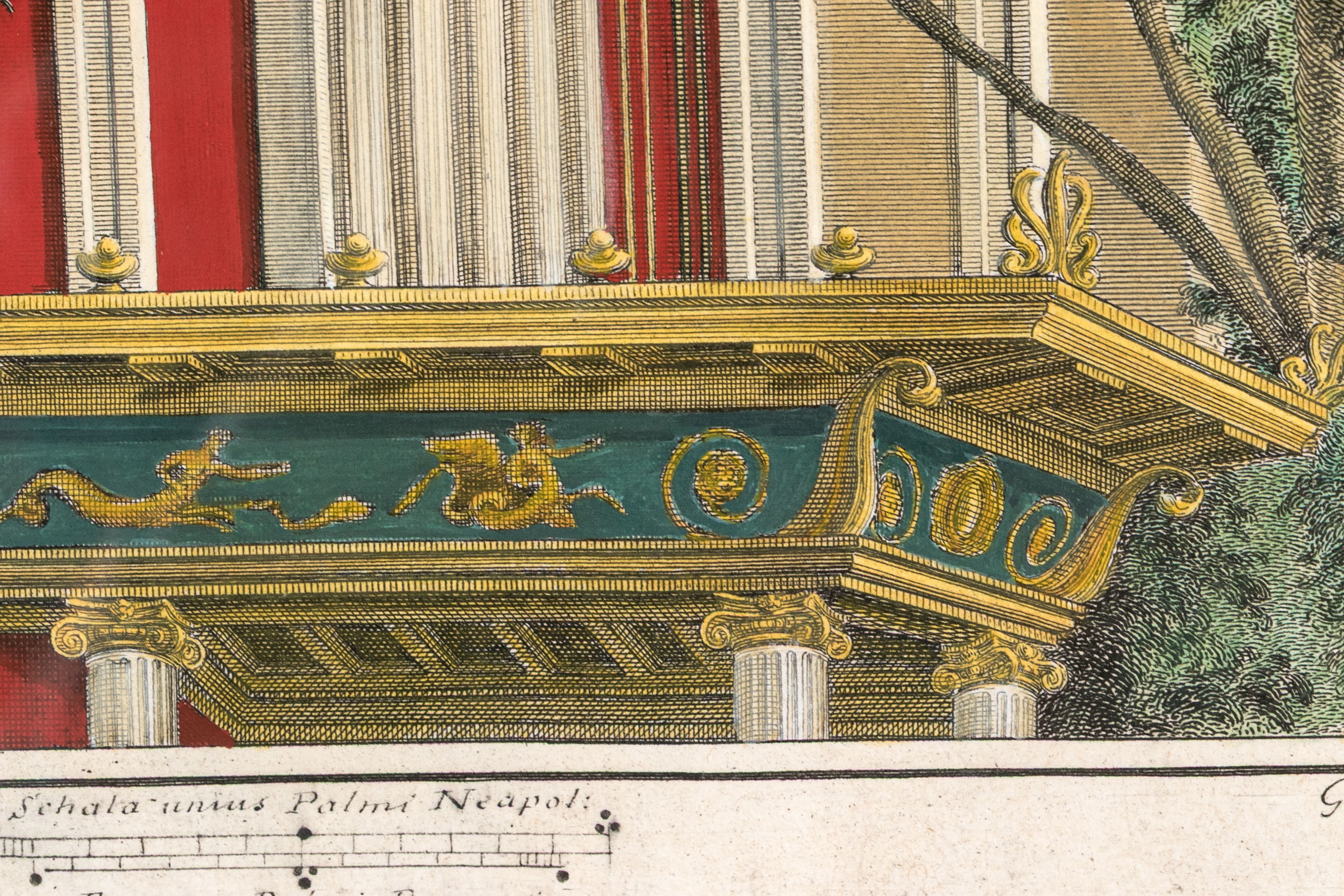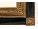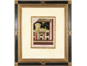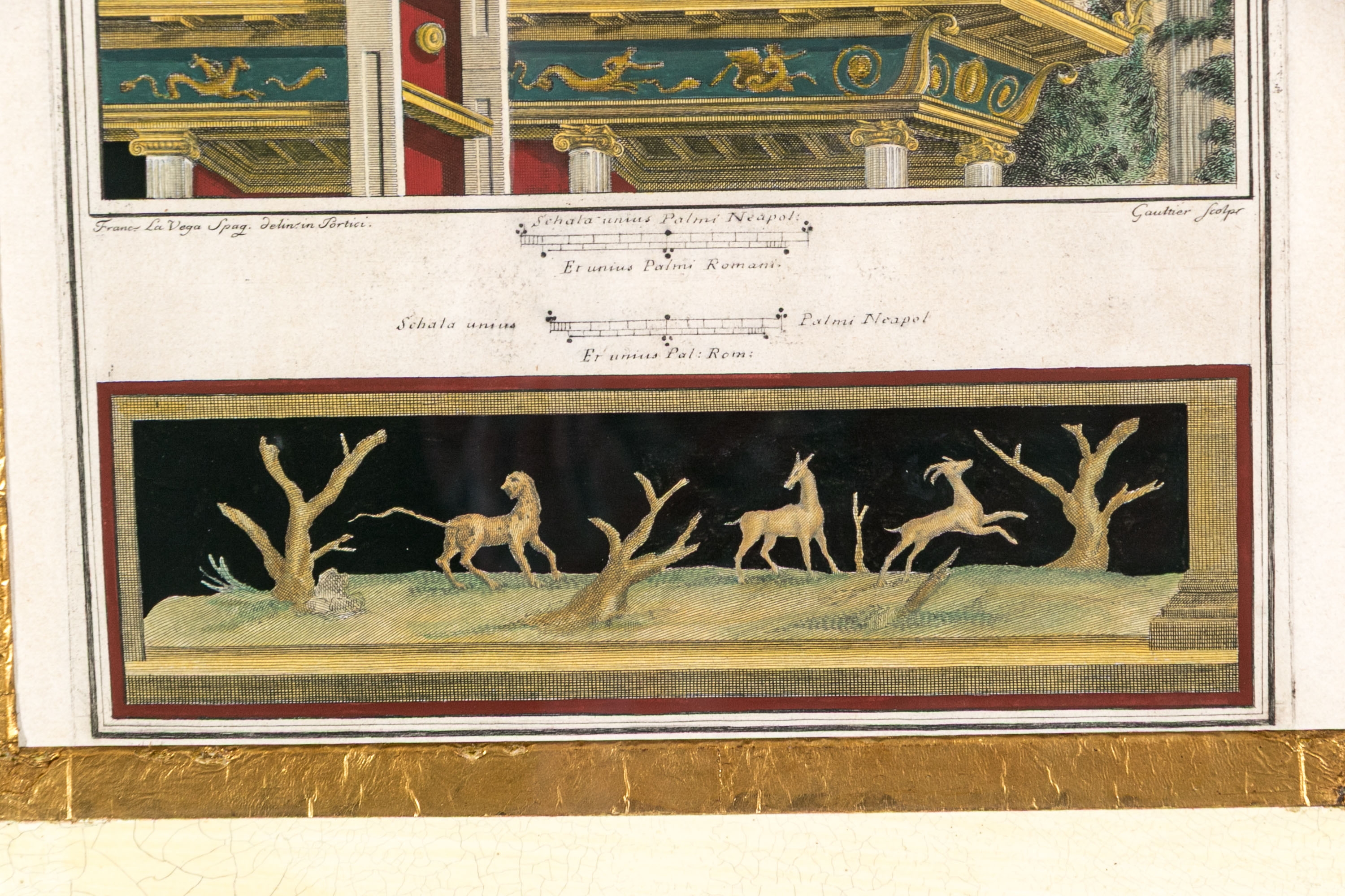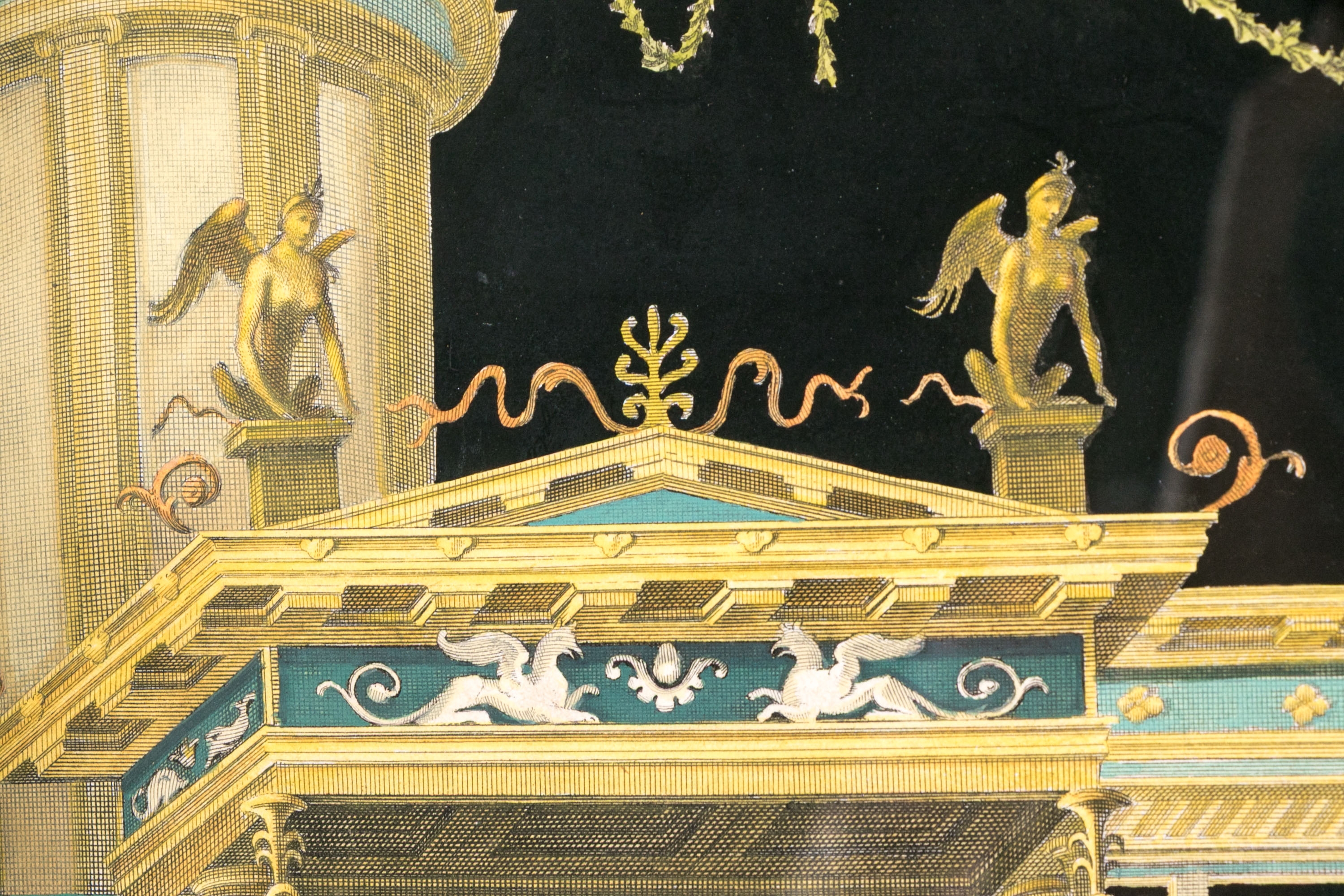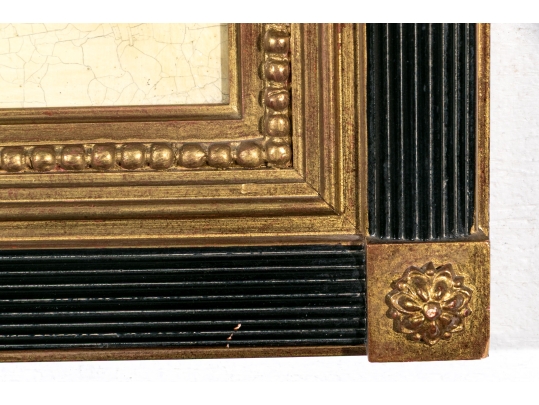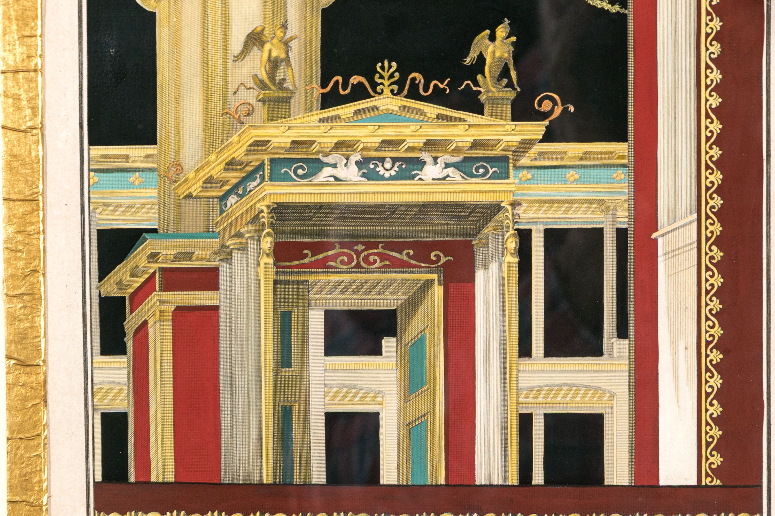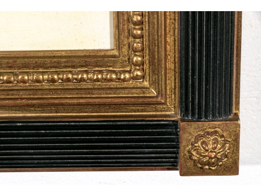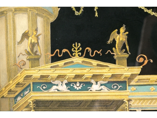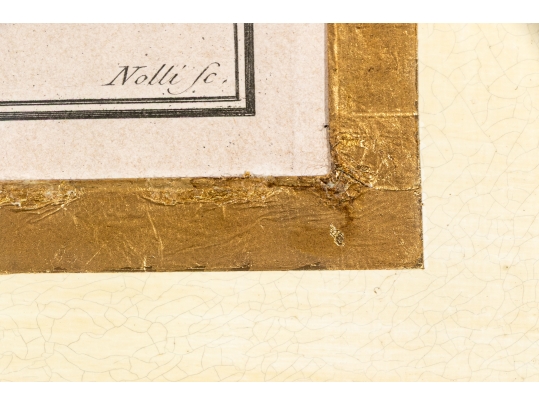 Each of the antique hand-colored engravings are exceptionally custom framed. presented with gold leaf borders surrounding the artwork, with hand-painted mats, in fabulously carved wood and gesso frames with gilt and ebonized finishes having neoclassical columns in ebonized finish with interior beaded and carved gilt finish. Additionally each corner of the frame with gilt finish and carved medallions seen in relief.