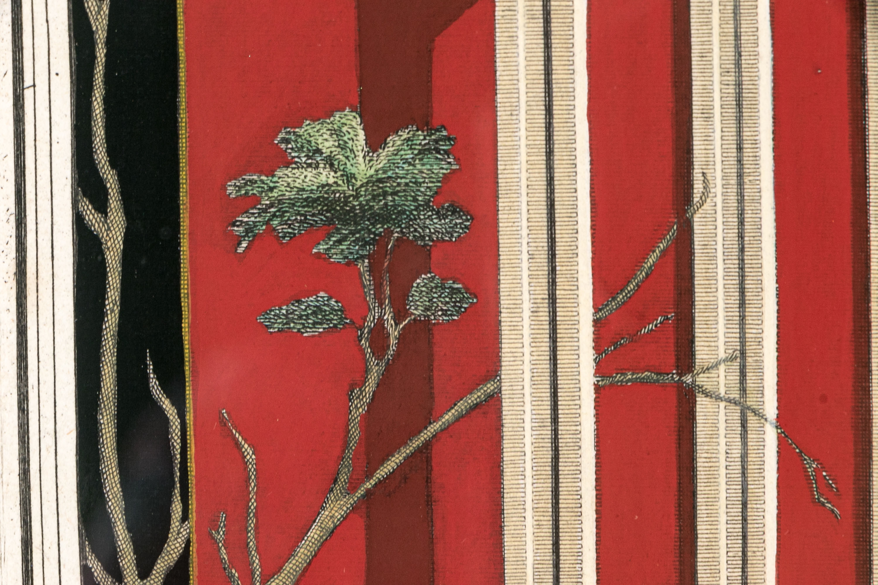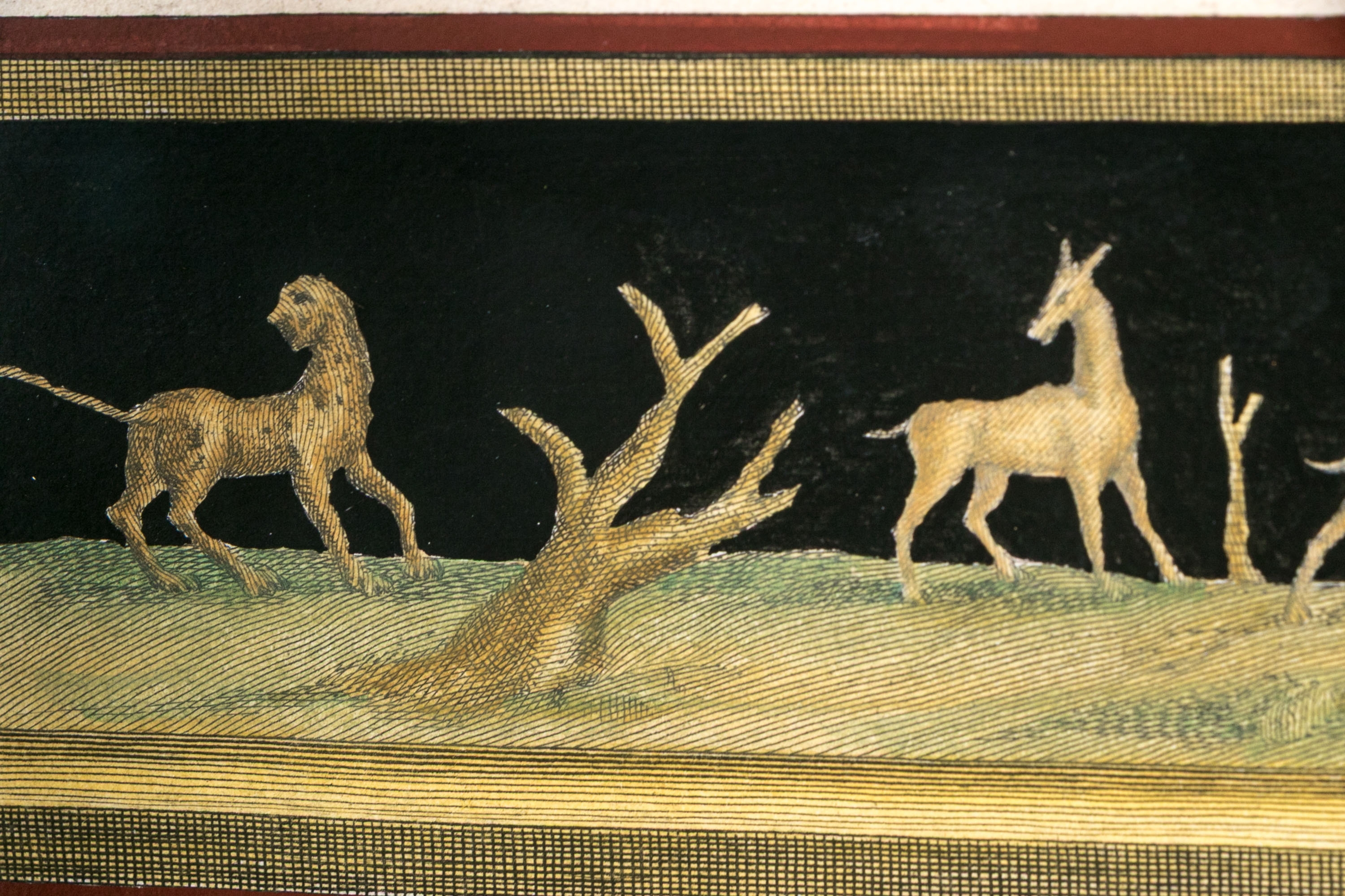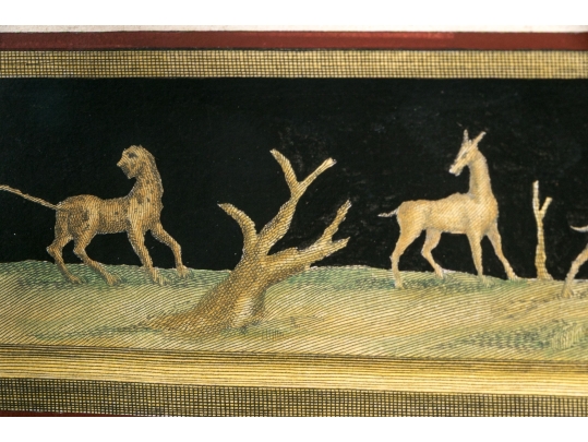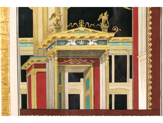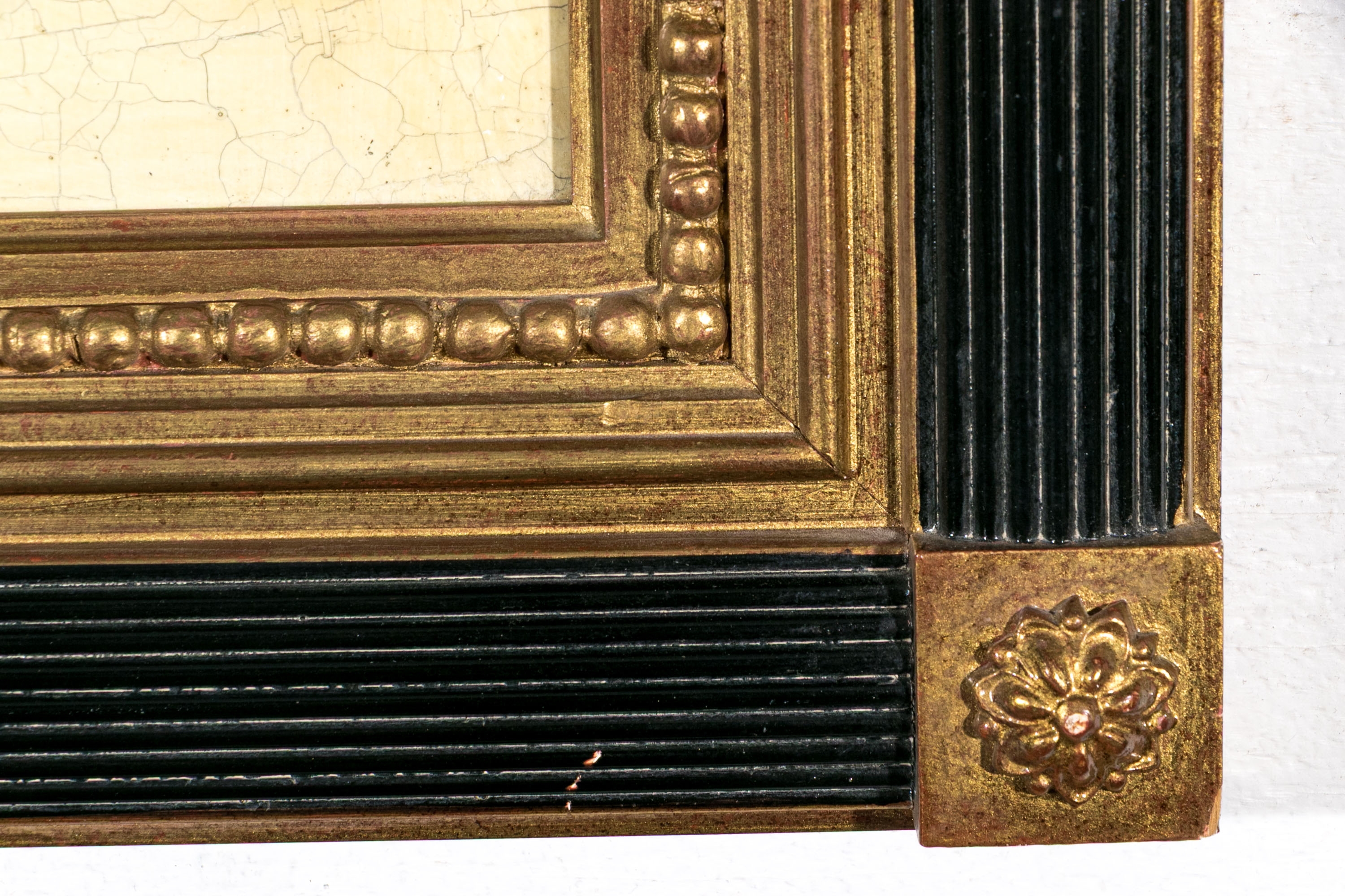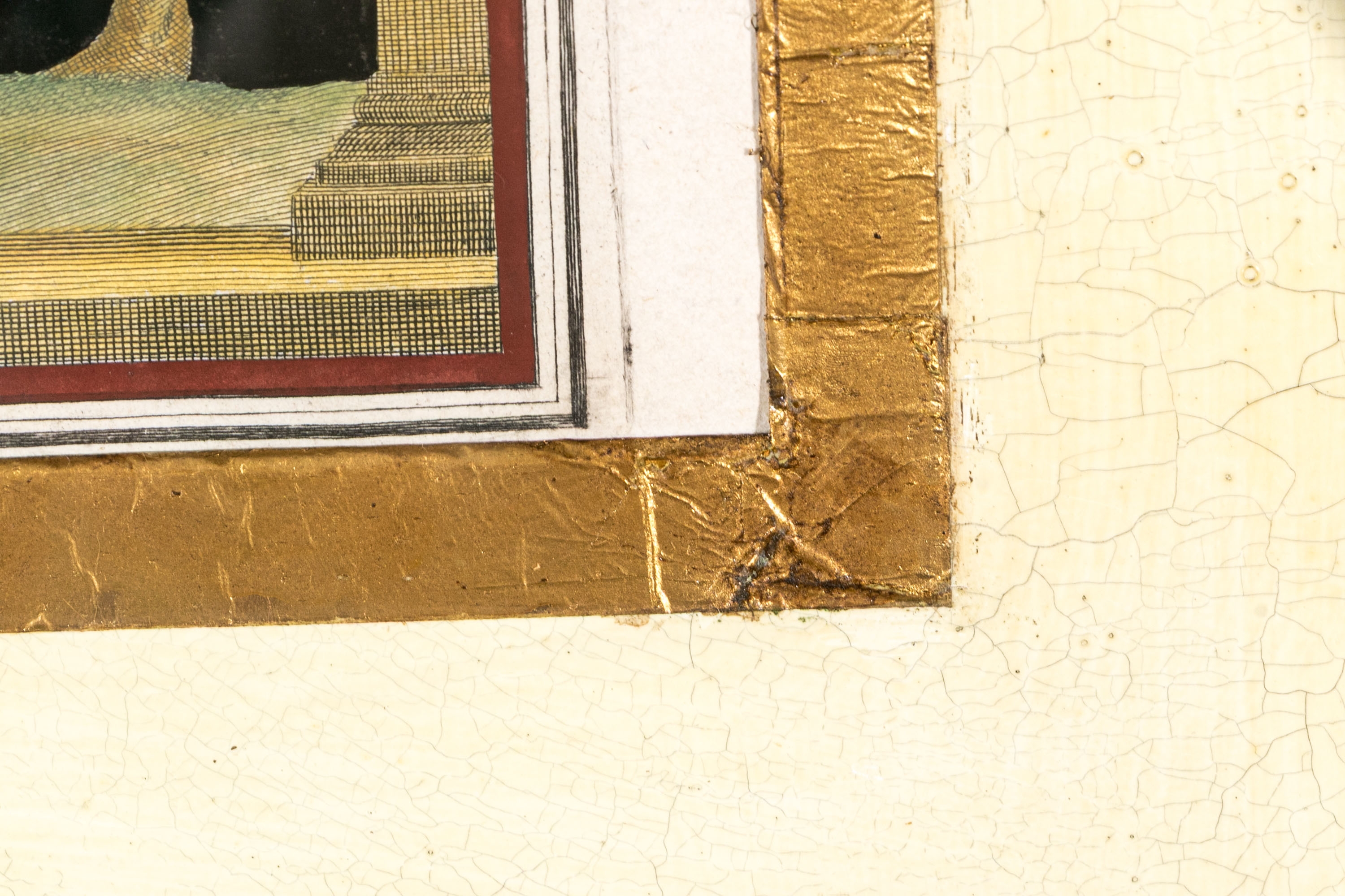 Each of the antique hand-colored engravings are exceptionally custom framed. presented with gold leaf borders surrounding the artwork, with hand-painted mats, in fabulously carved wood and gesso frames with gilt and ebonized finishes having neoclassical columns in ebonized finish with interior beaded and carved gilt finish. Additionally each corner of the frame with gilt finish and carved medallions seen in relief.
