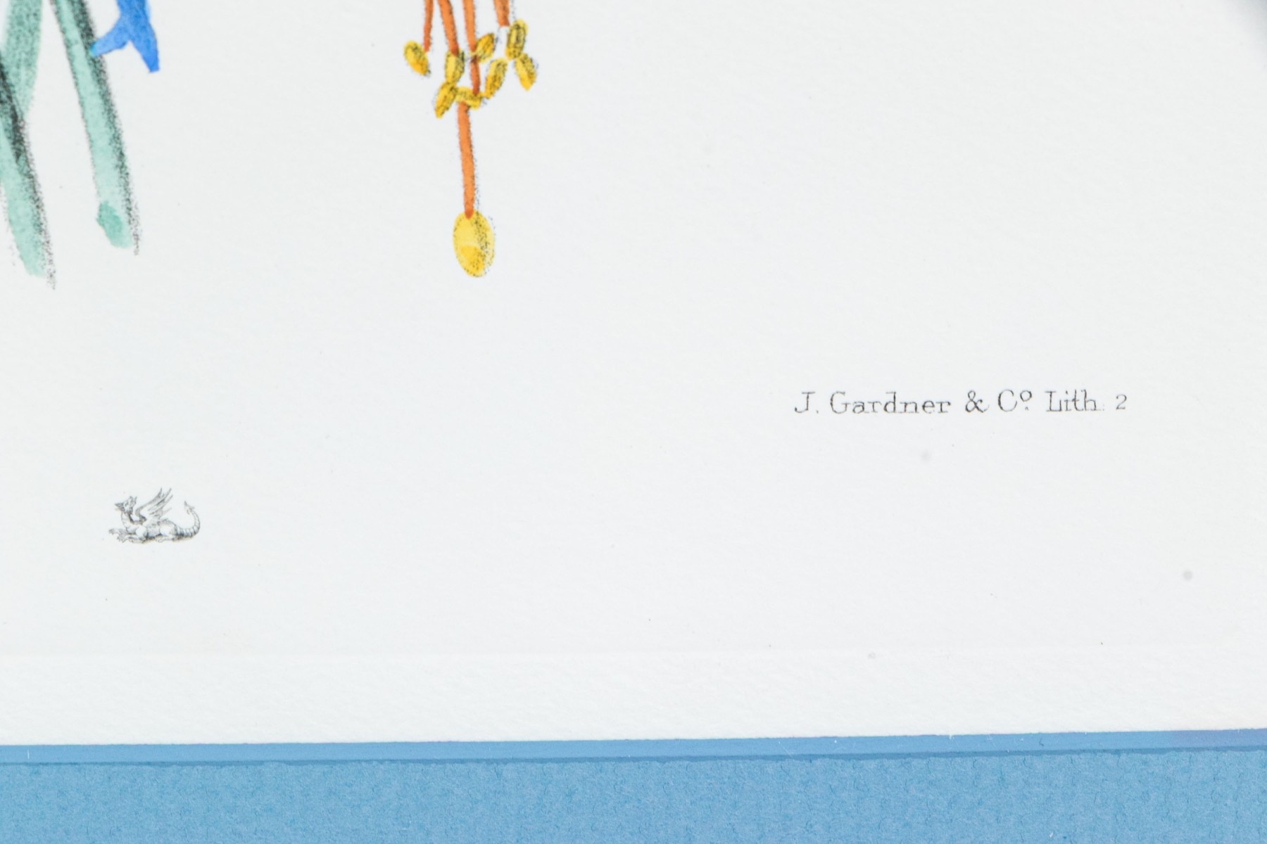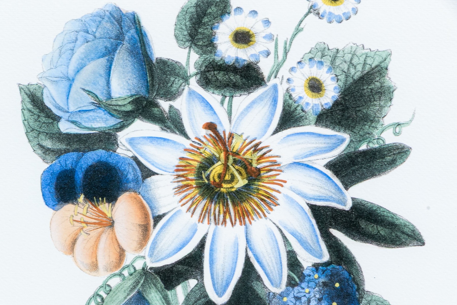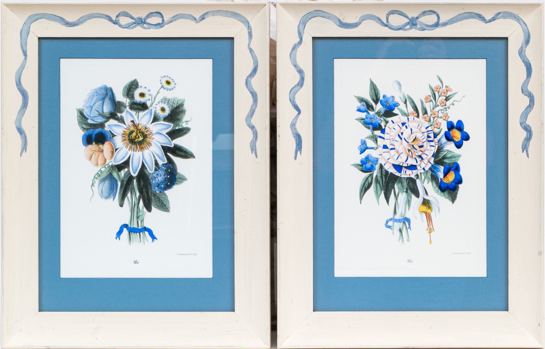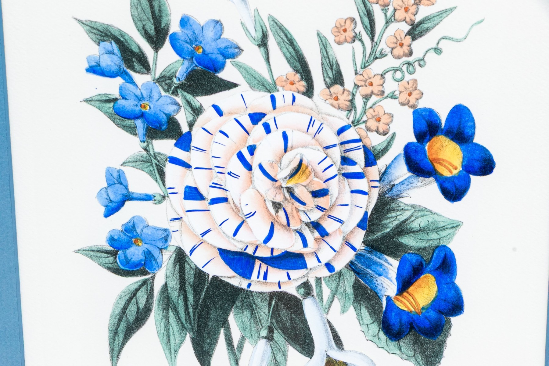 A delightful duo of lithographs produced by J. Gardner & Co. as seen in "Peachy's Royal Guide to Wax Flower Modelling" by Emma Peachey, 1851, hand-colored in alternative blue colorways. The prints depict lush bouquets of flowers in blue, yellow, and orange with deep green leaves, tied with blue ribbons at the stems and standing against white grounds.