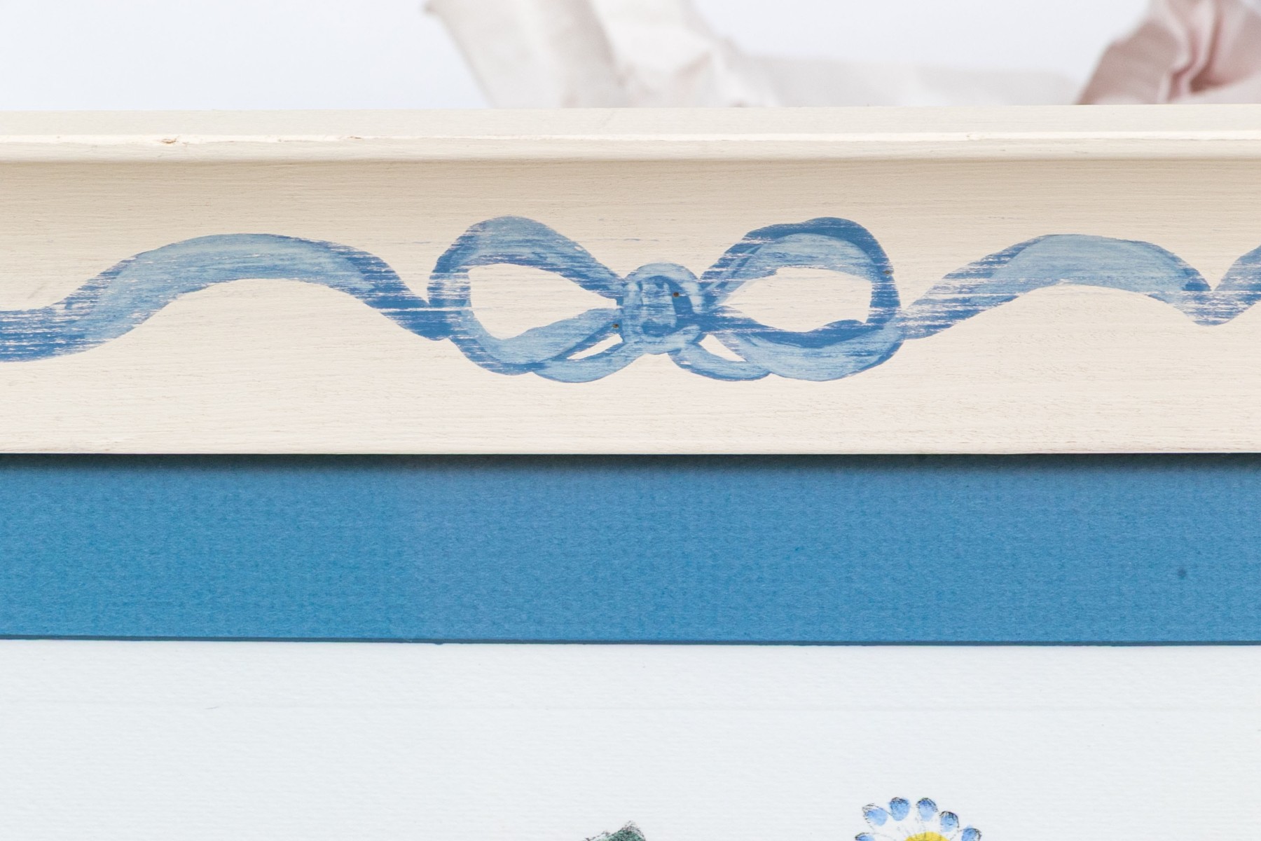 Displayed with blue mats and a custom painted frame with blue ribbons on a white ground complementing the bouquets perfectly.