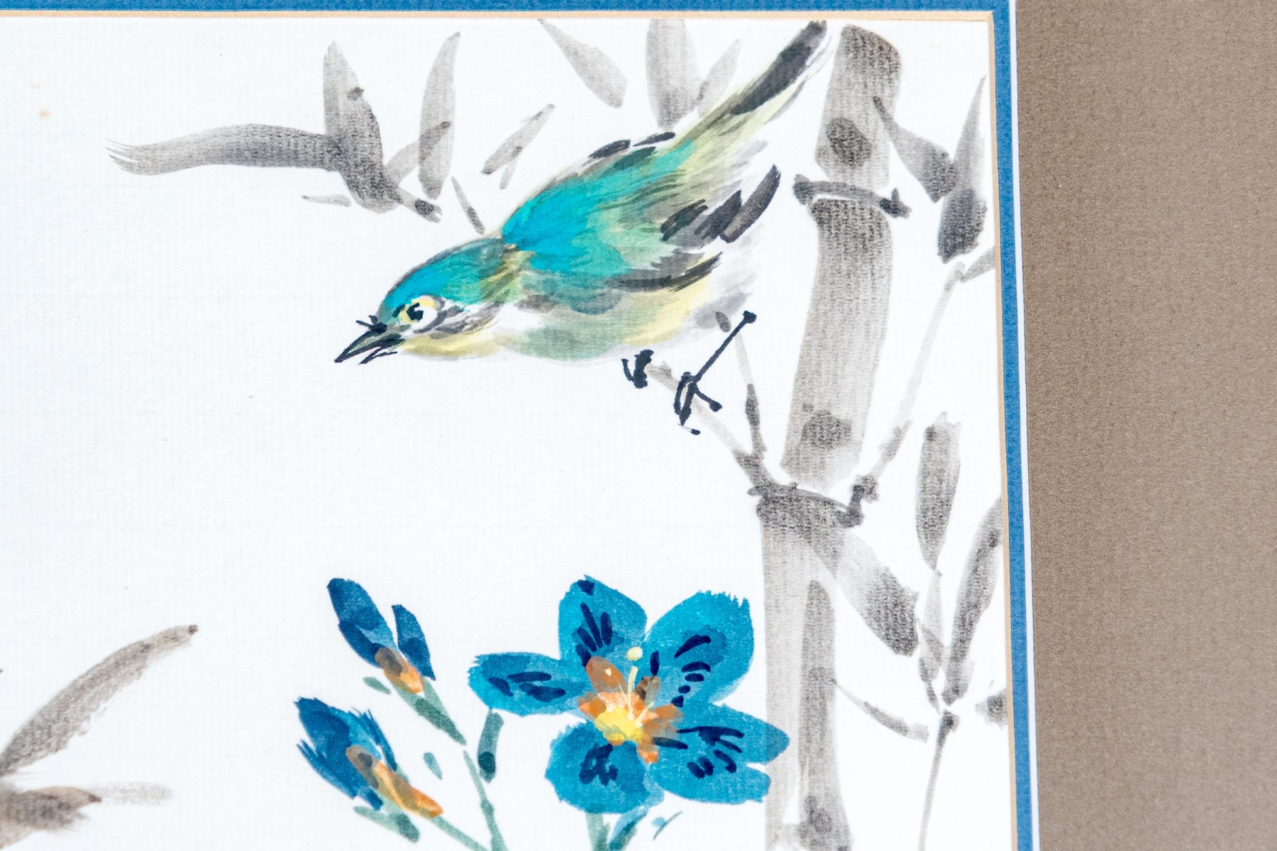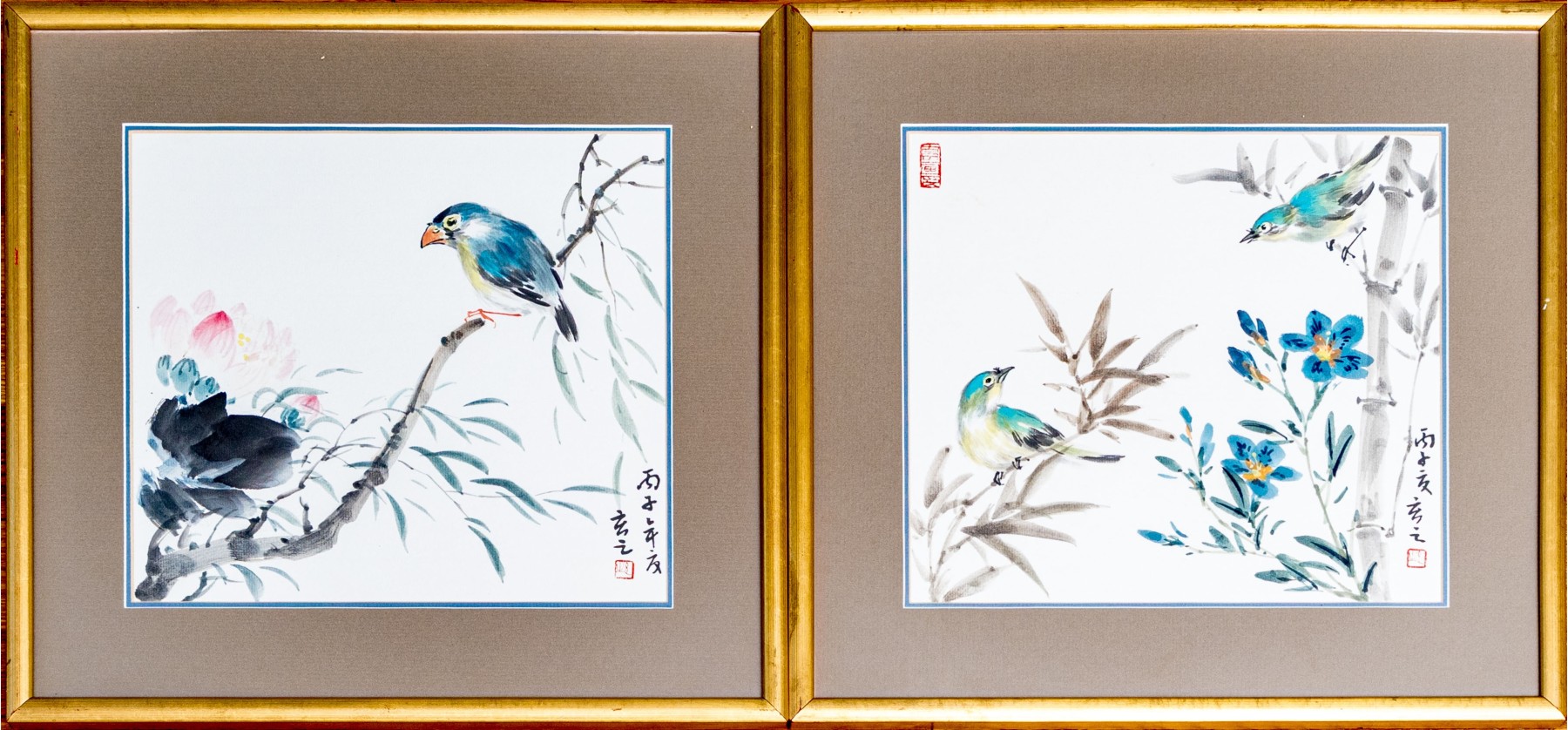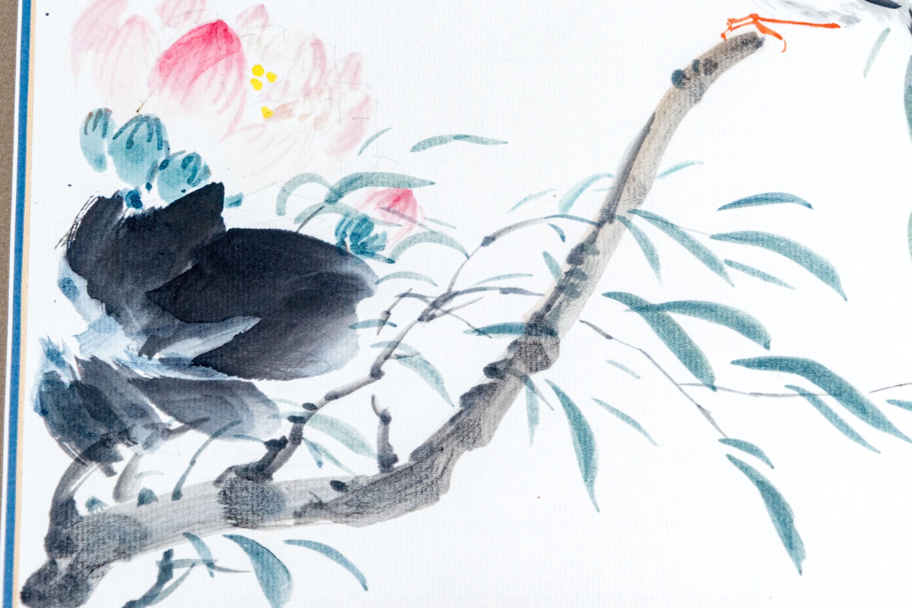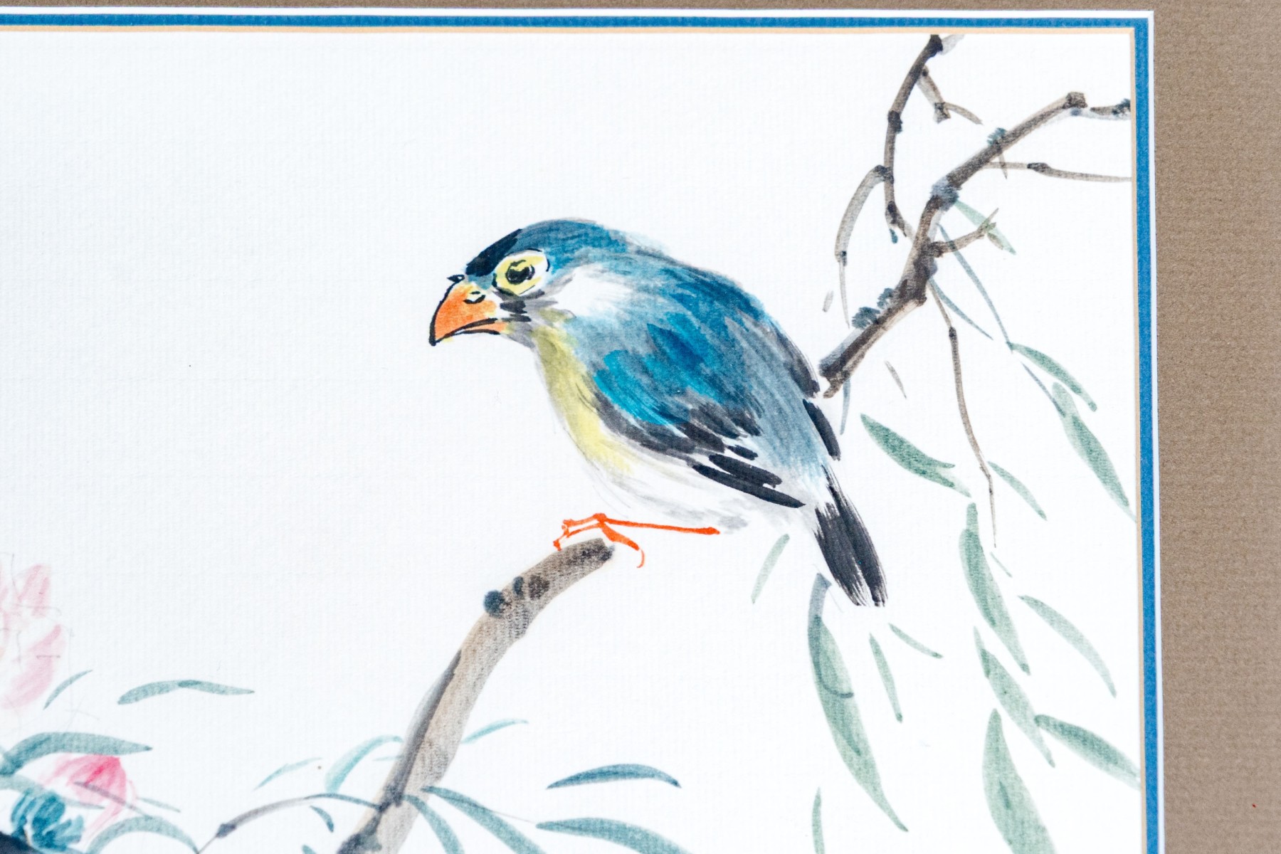 A fine duo of Japanese paintings on paper depicting birds on branches. Both with red seal ink marks and black calligraphy. Both are presented matted and framed and glazed.