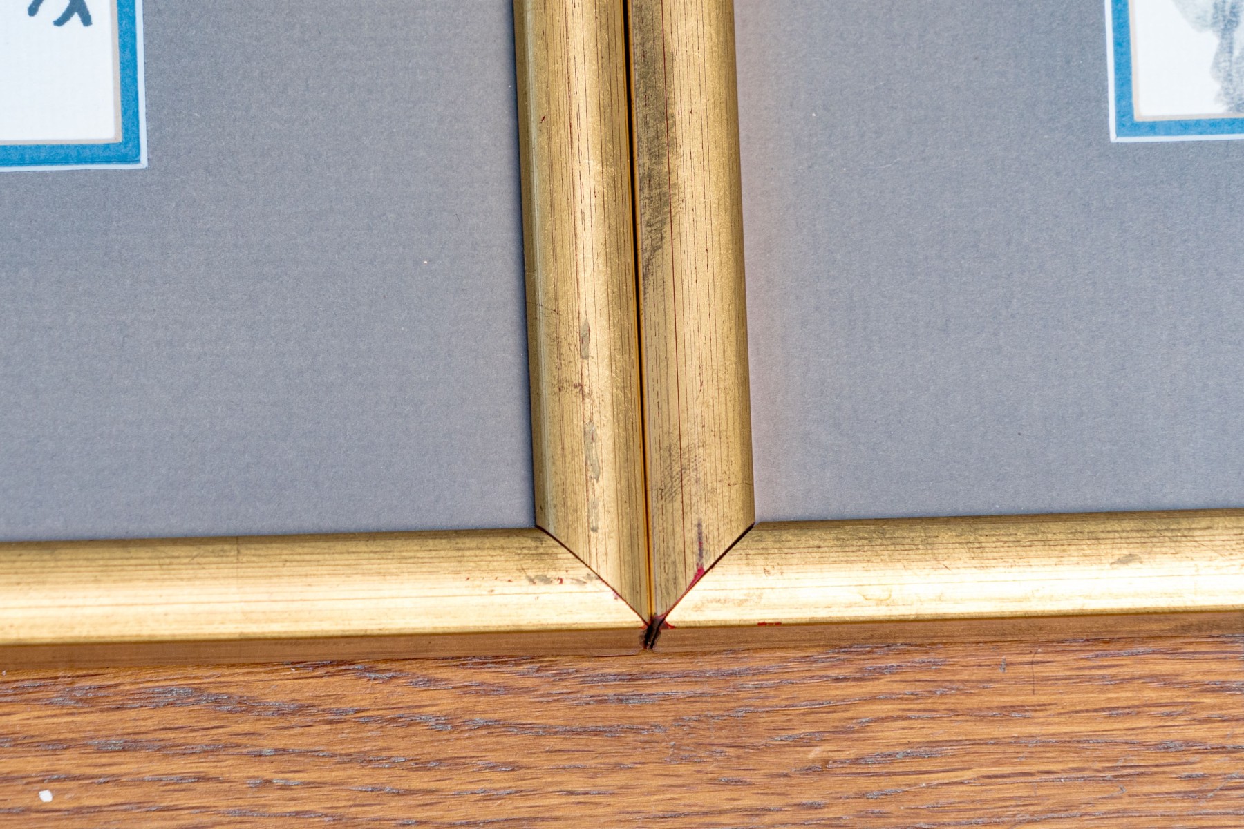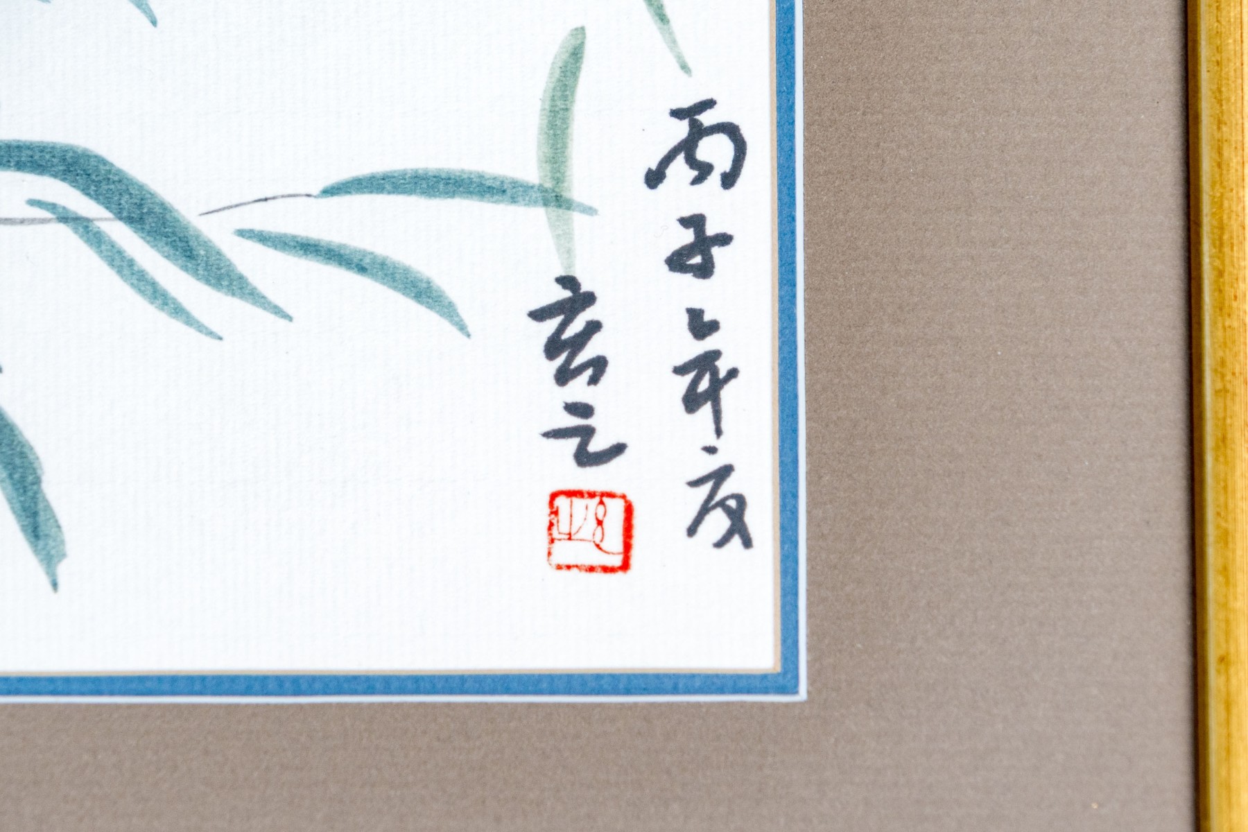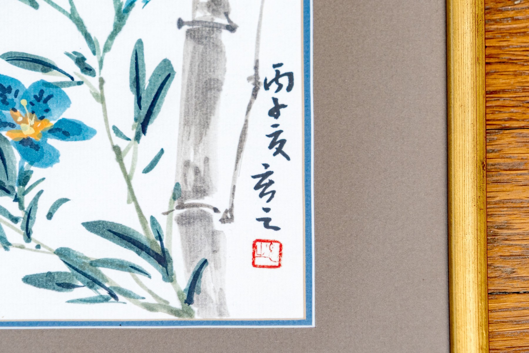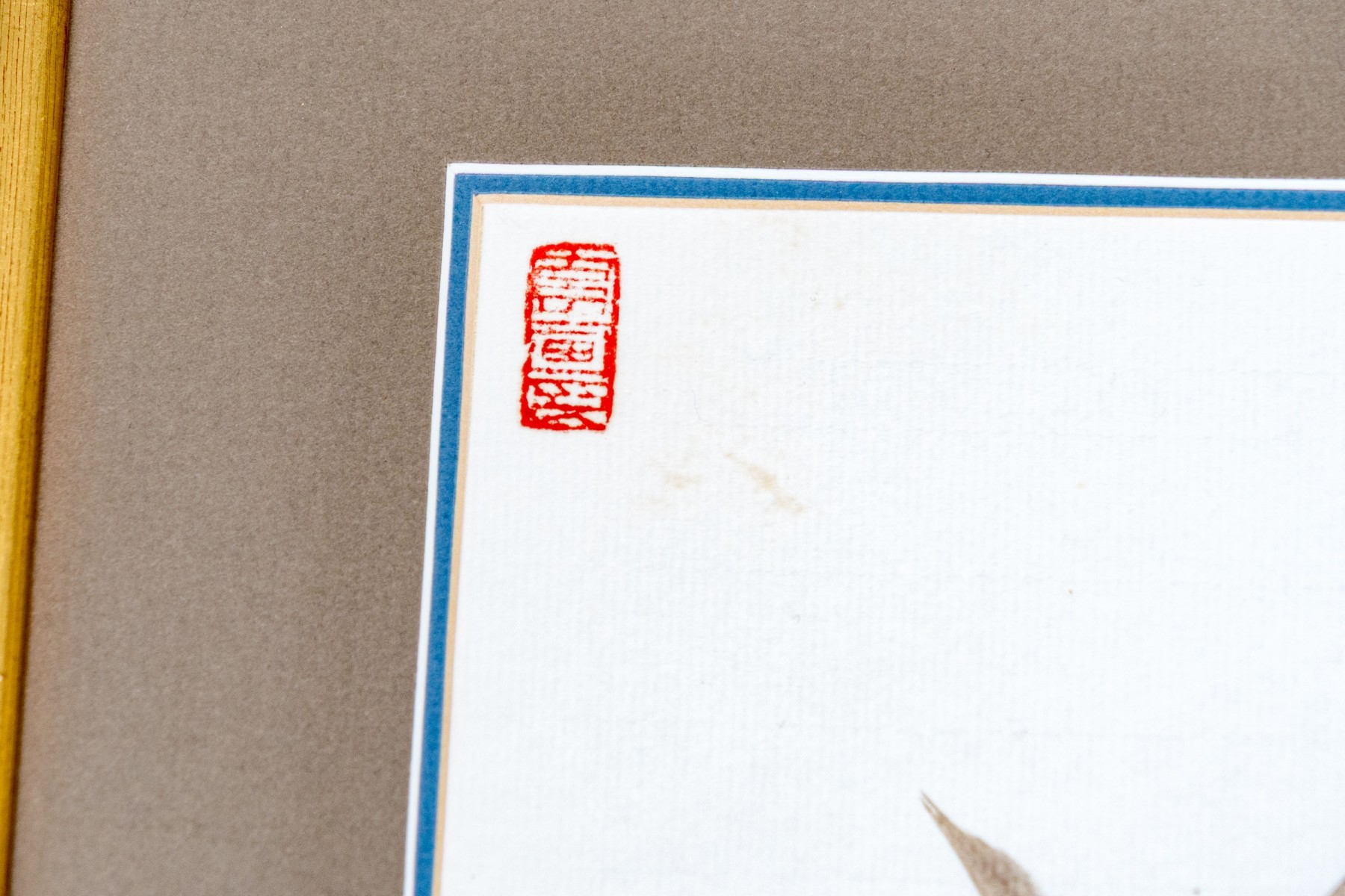 A fine duo of Japanese paintings on paper depicting birds on branches. Both with red seal ink marks and black calligraphy. Both are presented matted and framed and glazed.
